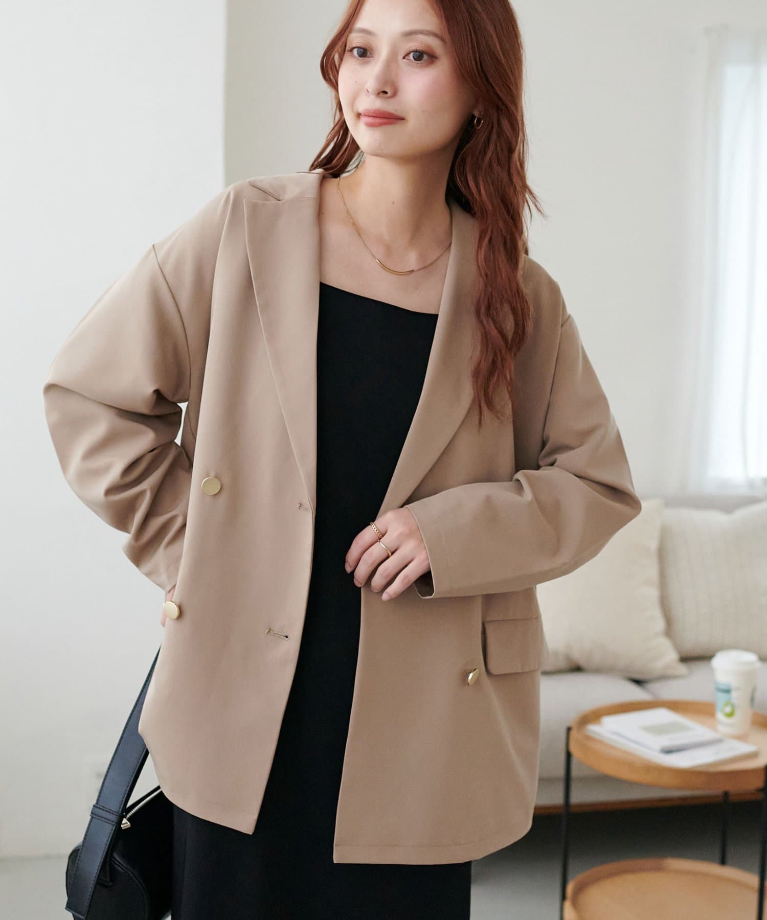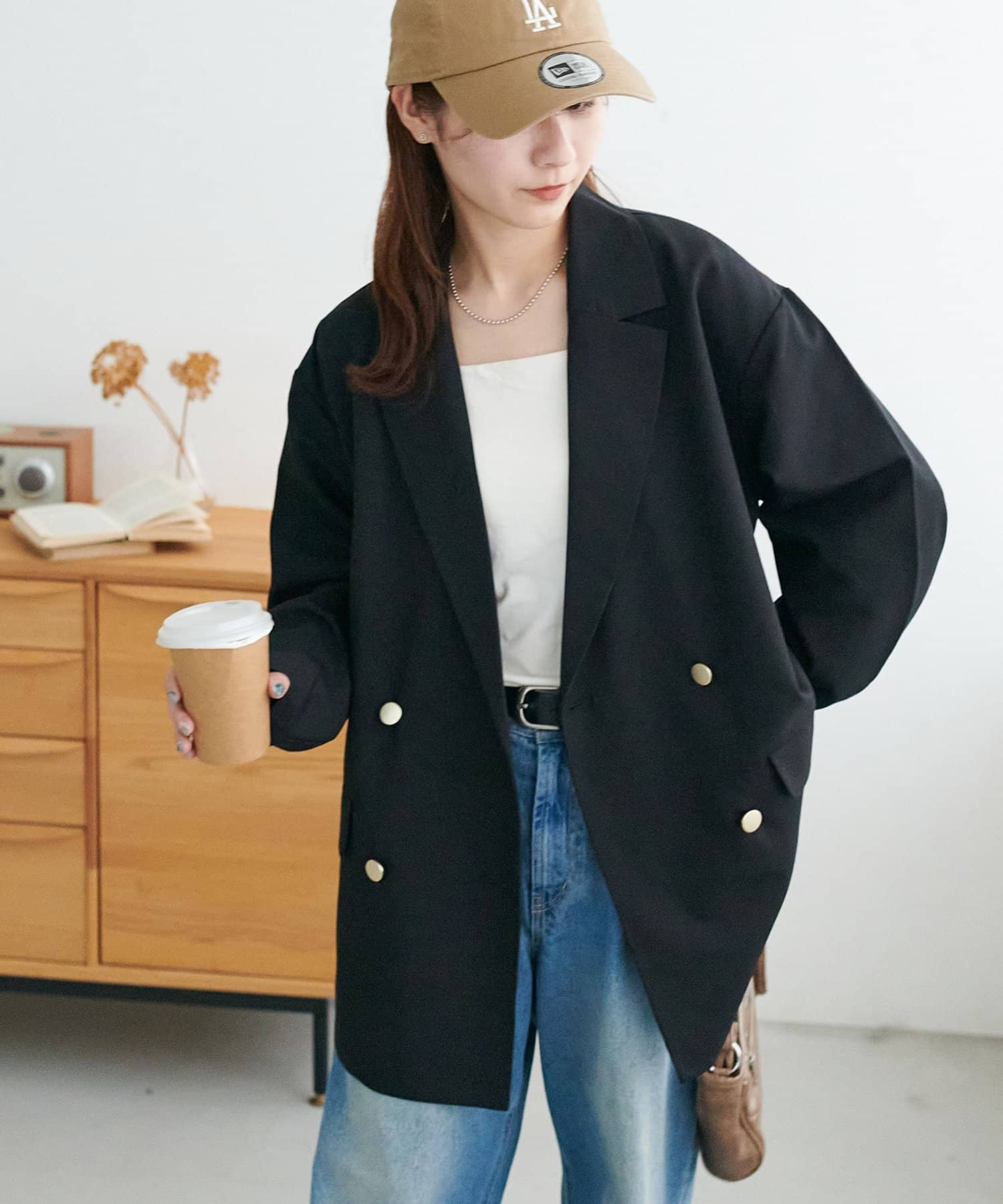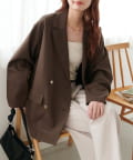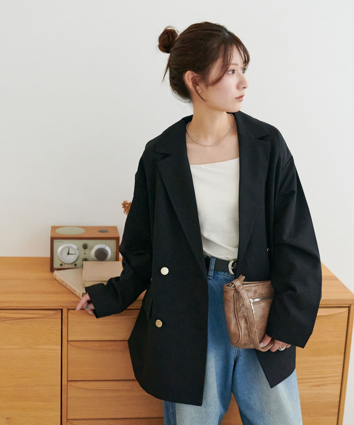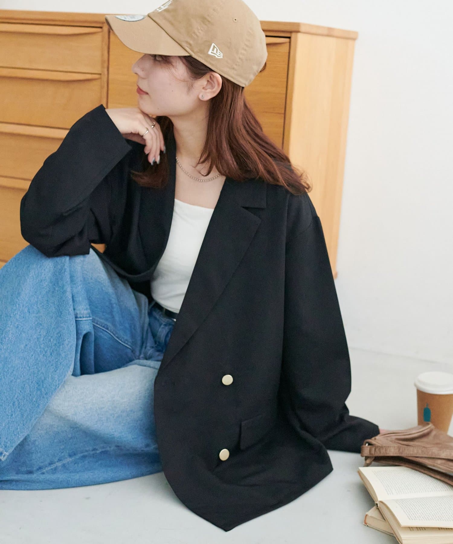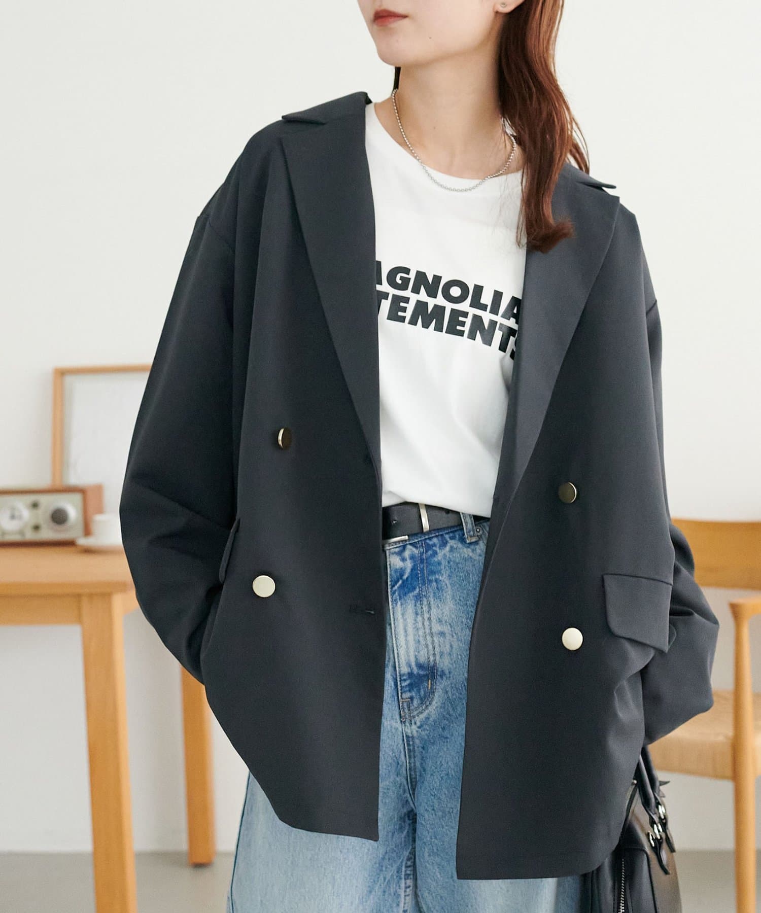 ゆったりとしたシルエットと、金ボタンがアクセントになったテーラードジャケット。