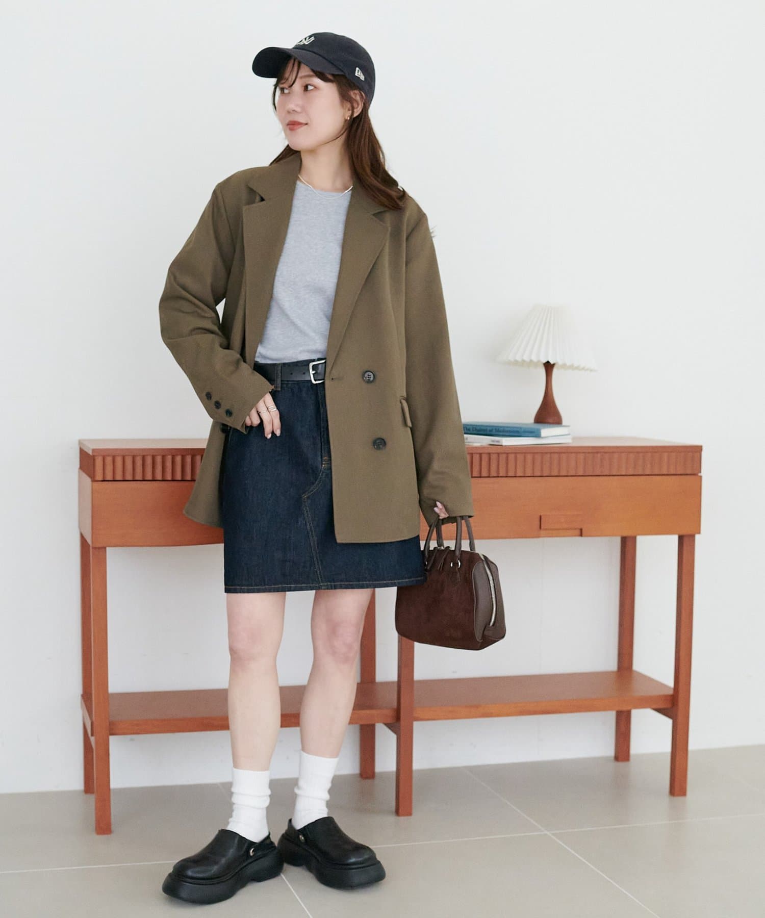 シンプルなデザインなのでデザイン性のあるブラウスやシャツをレイヤードした着こなしもおすすめです!