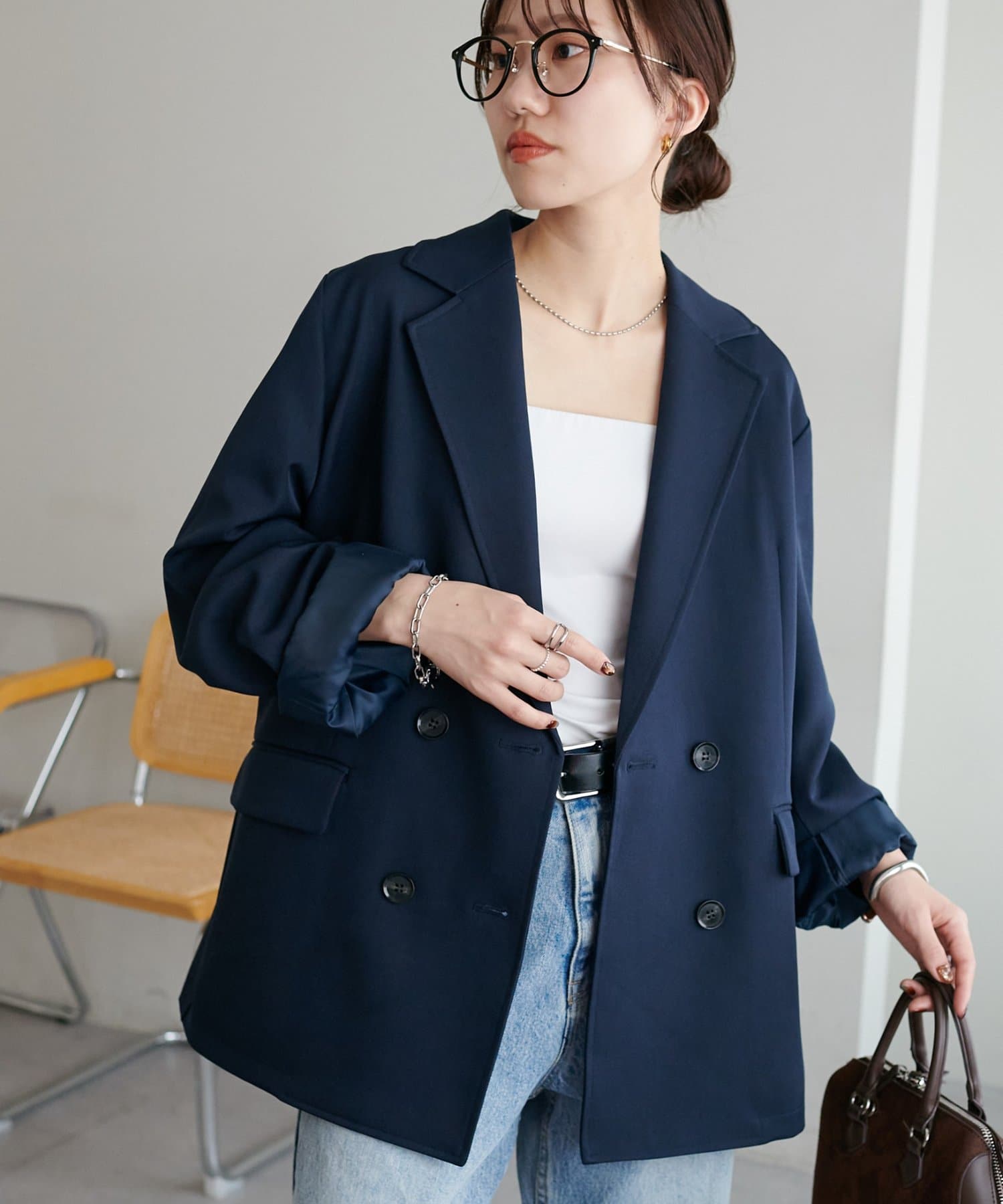 シンプルながらも存在感のあるWブレスト仕様のテーラードジャケット。
