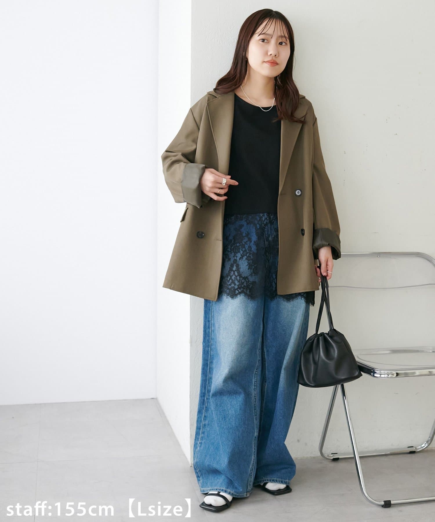 162cmスタッフ(Lサイズ着用):お尻がすっぽりと隠れる丈感で、気になる体型がカバーできるのもおすすめです!