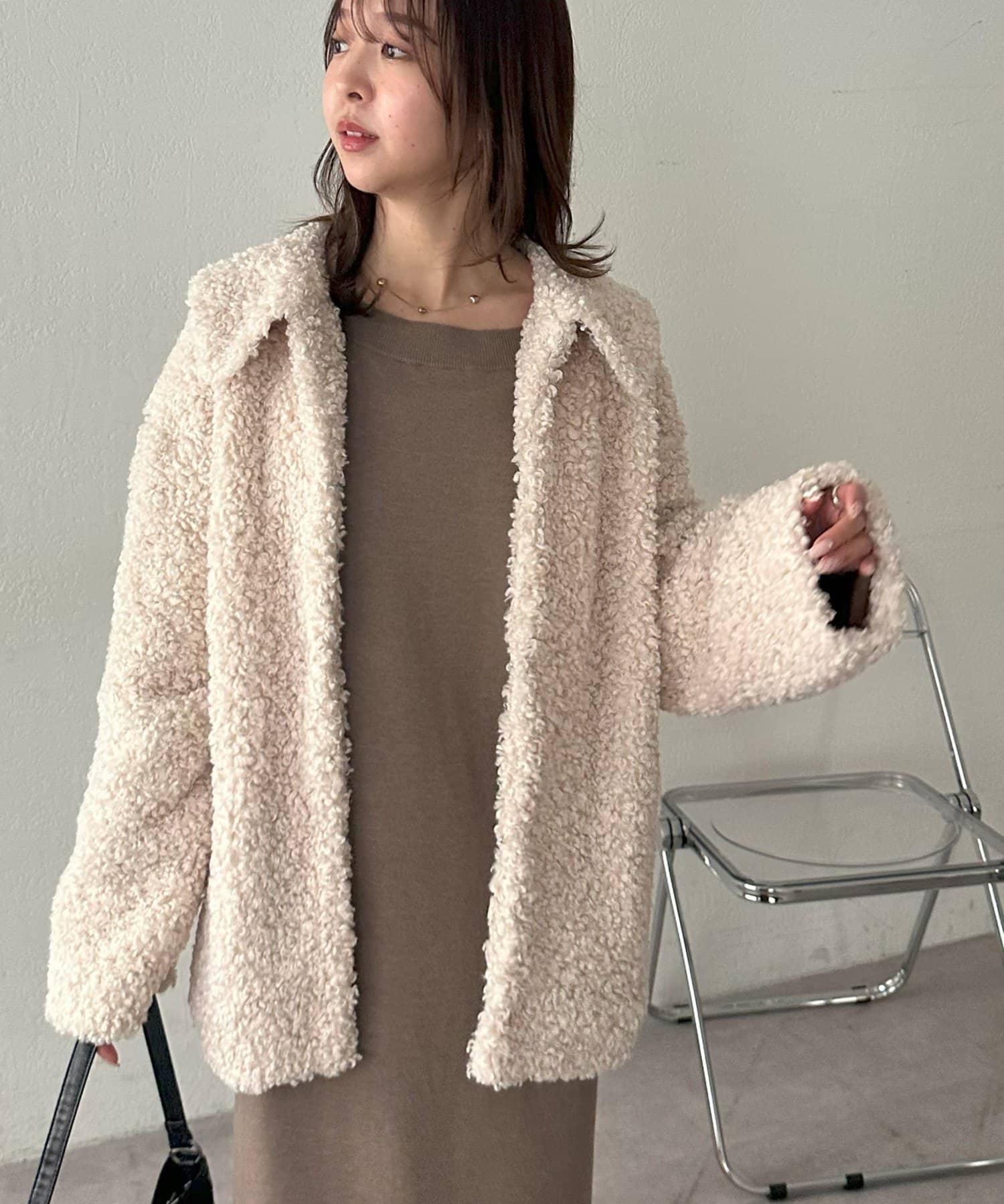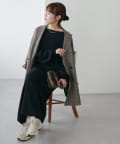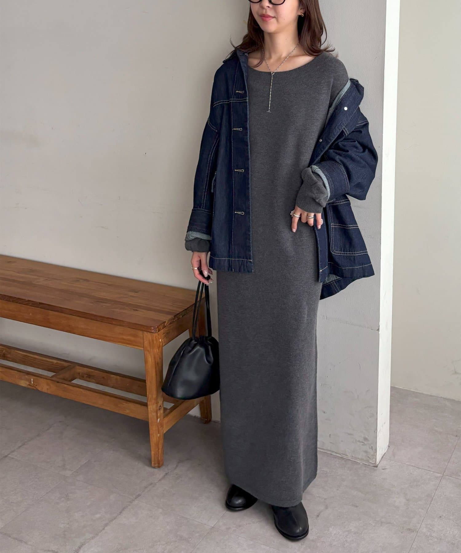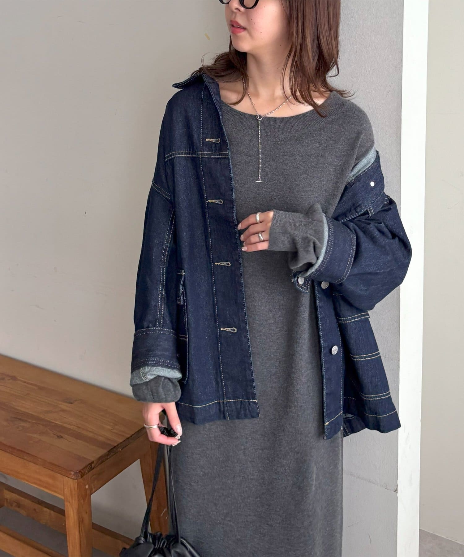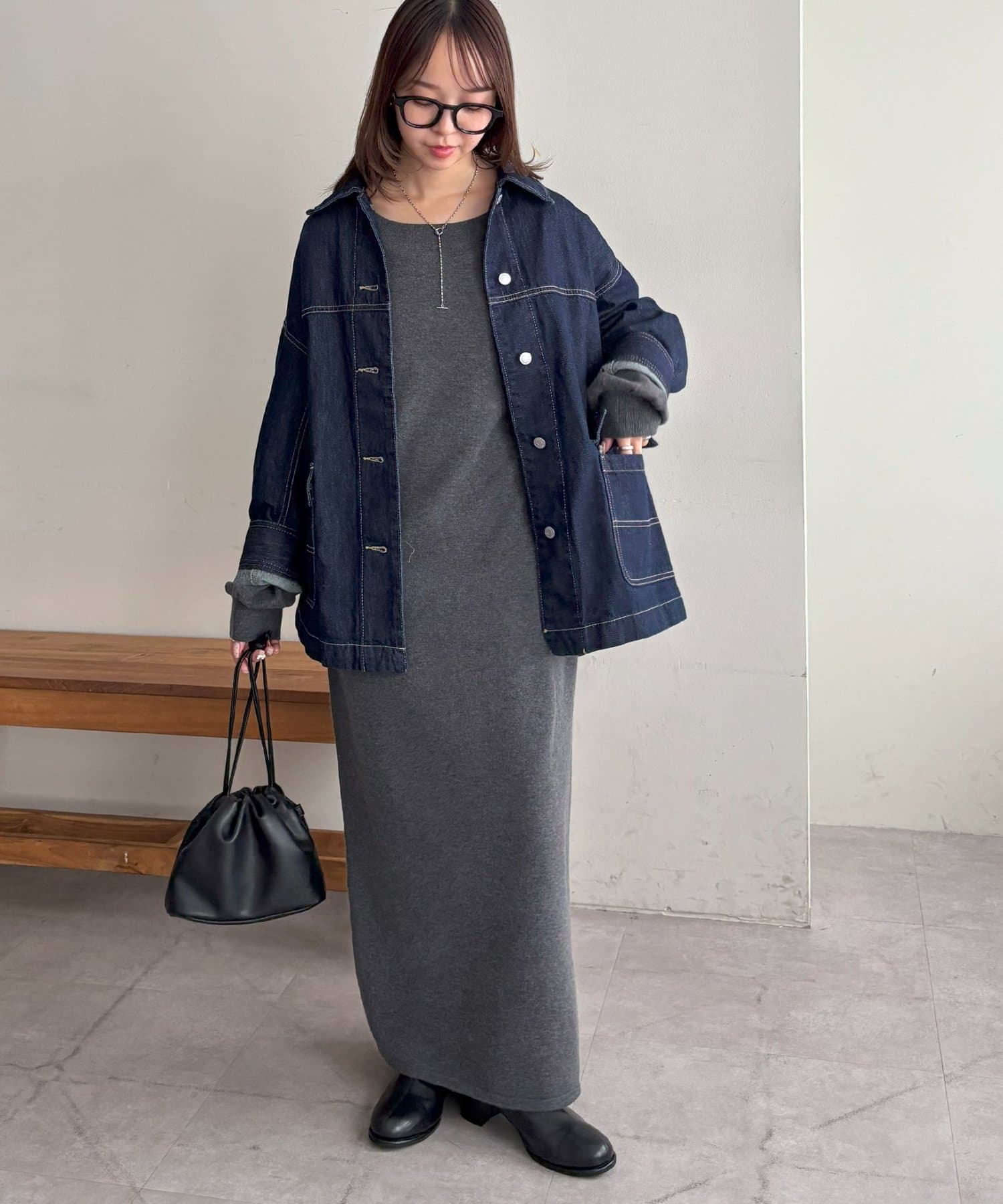 160cmスタッフ(Fサイズ着用):ロング丈ですが重たすぎず、一枚でコーデがキマるので楽ちんです。デニムパンツとのレイヤードスタイルもおすすめ◎