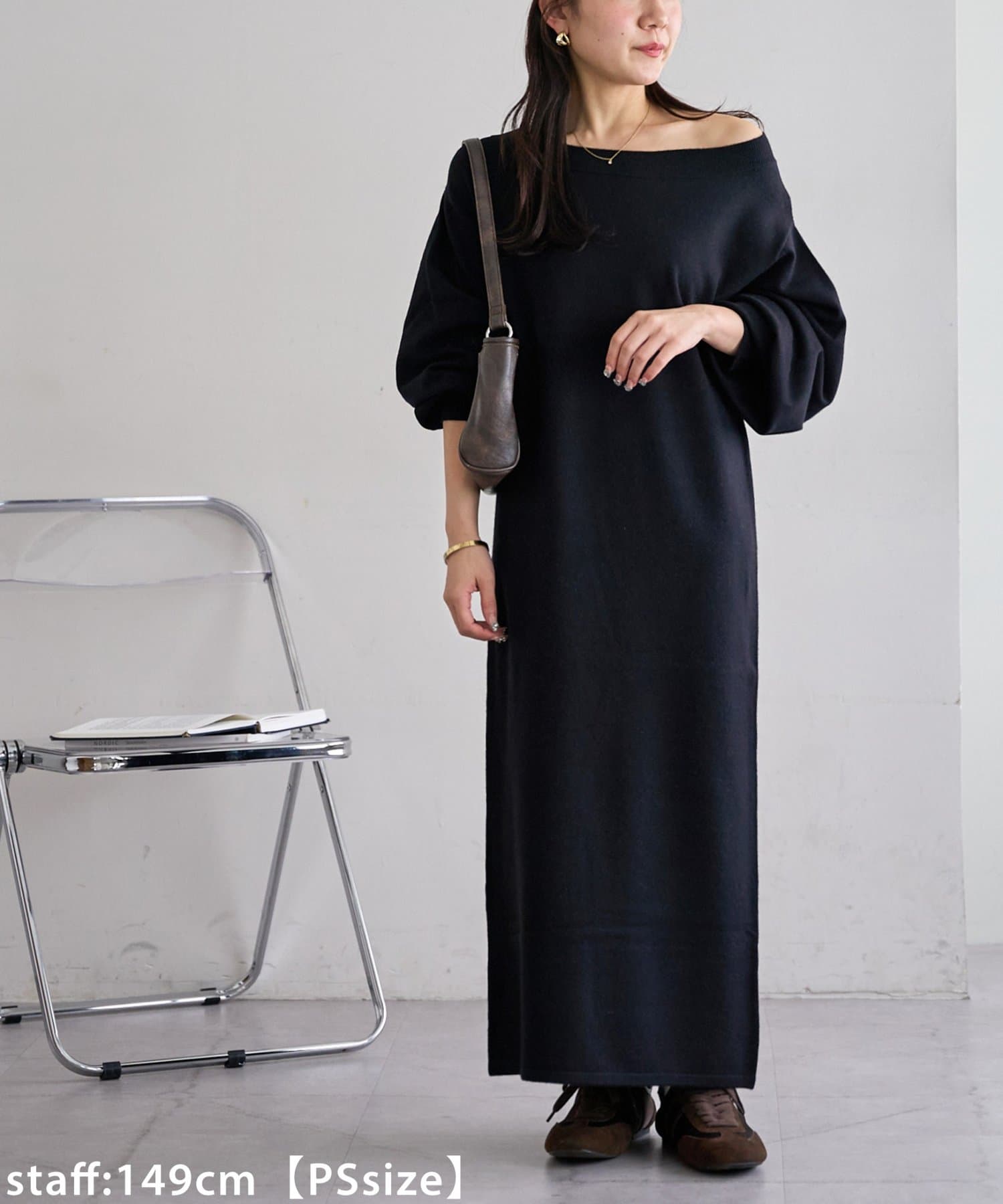 149cmスタッフ(PSサイズ着用):ワンピースは着丈が長いものが多いですが、低身長サイズがあるので安心です!