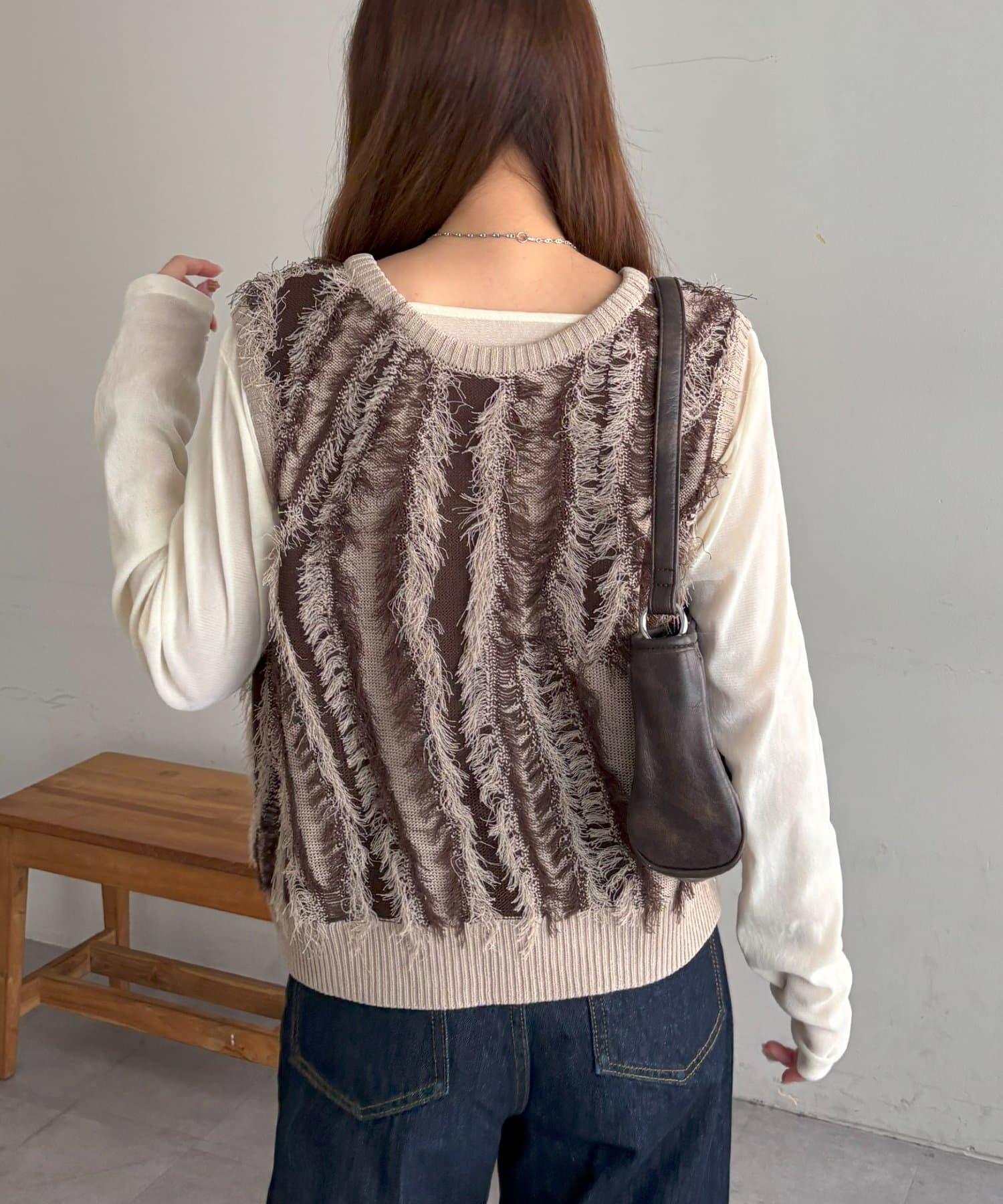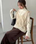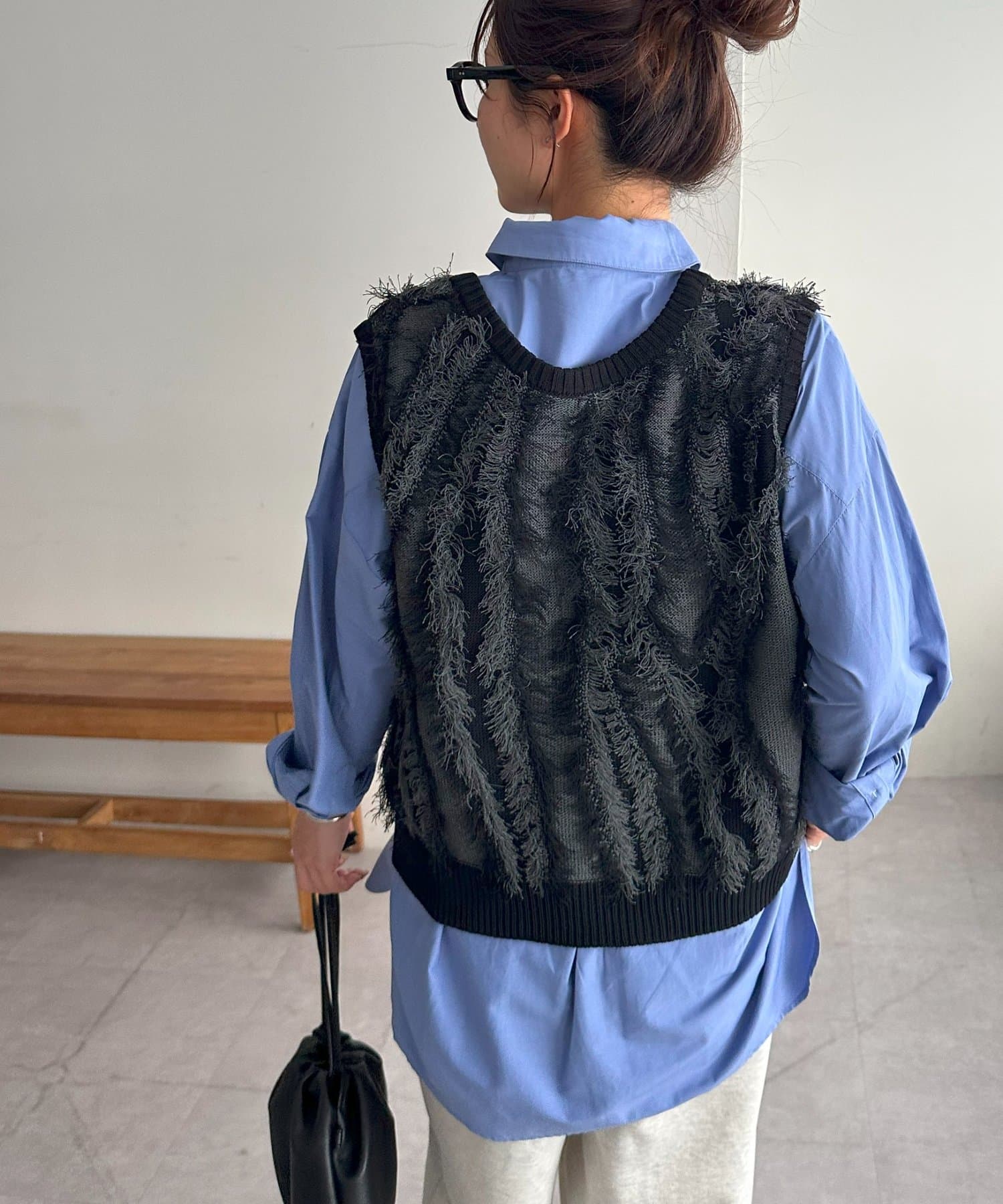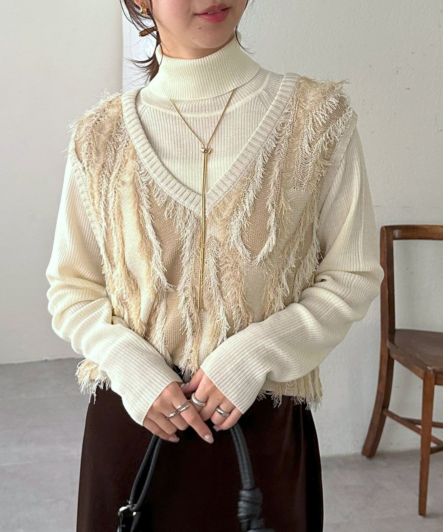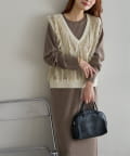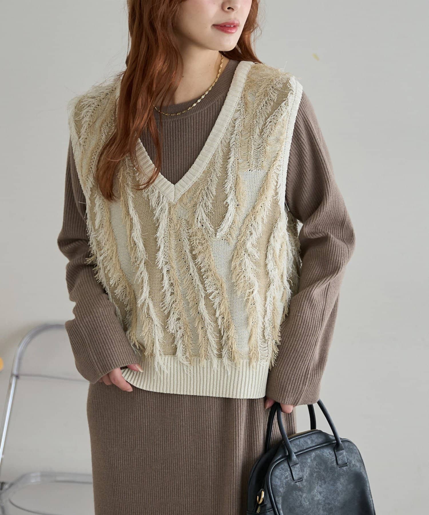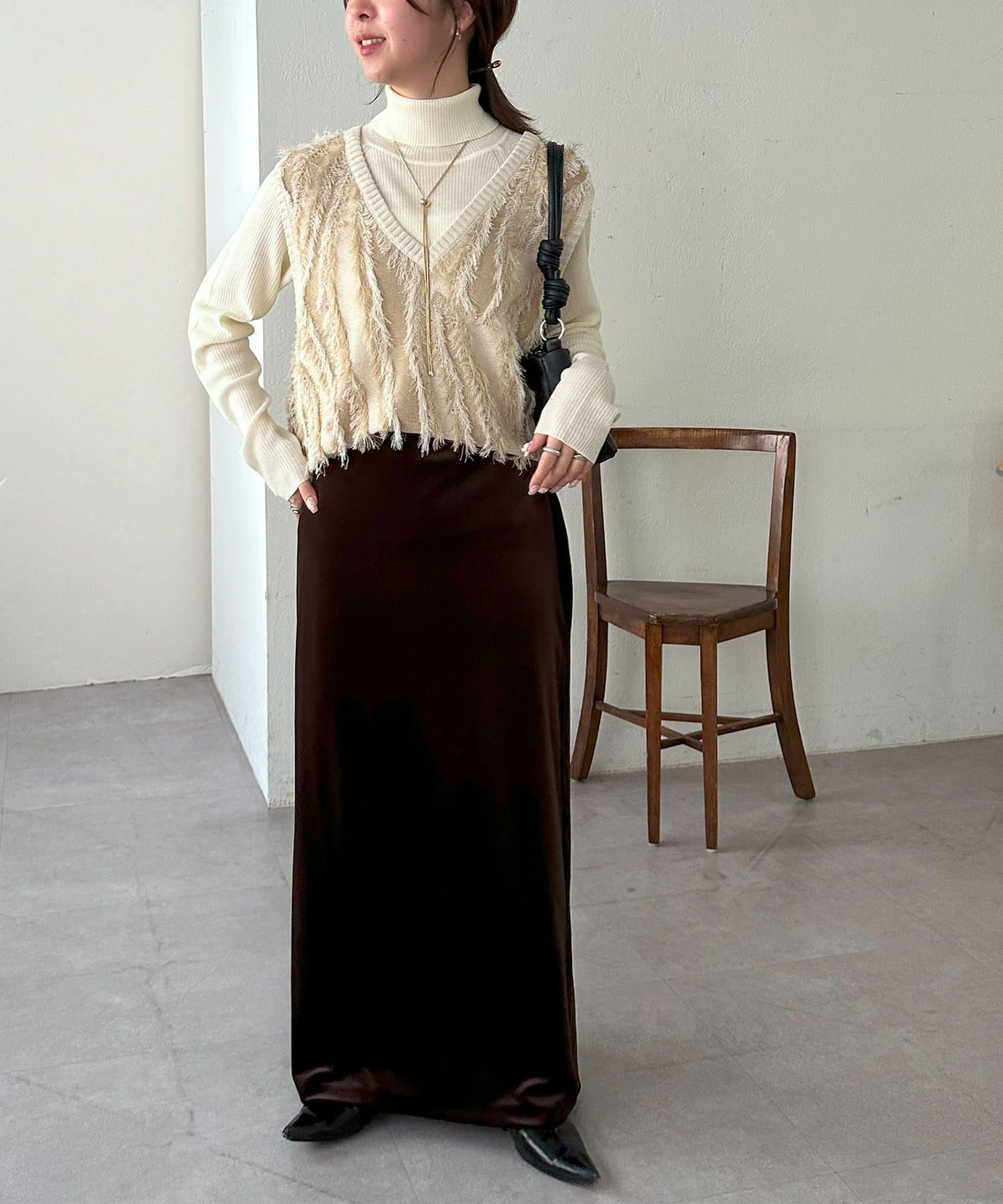 ベストはvネックなので、レイヤードしても顔回りがスッキリとした印象になりメリハリが出ます○
