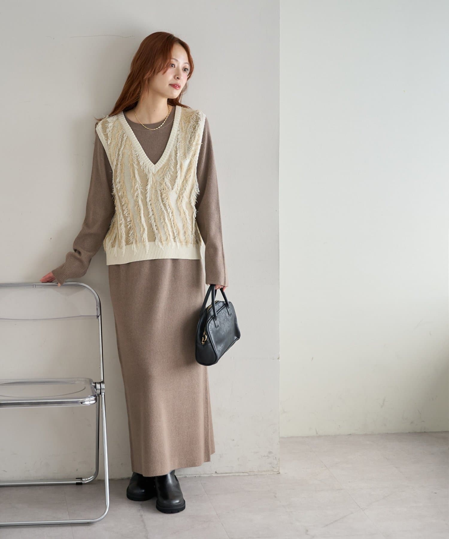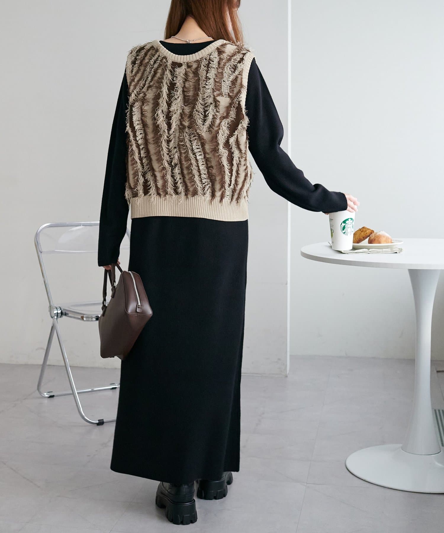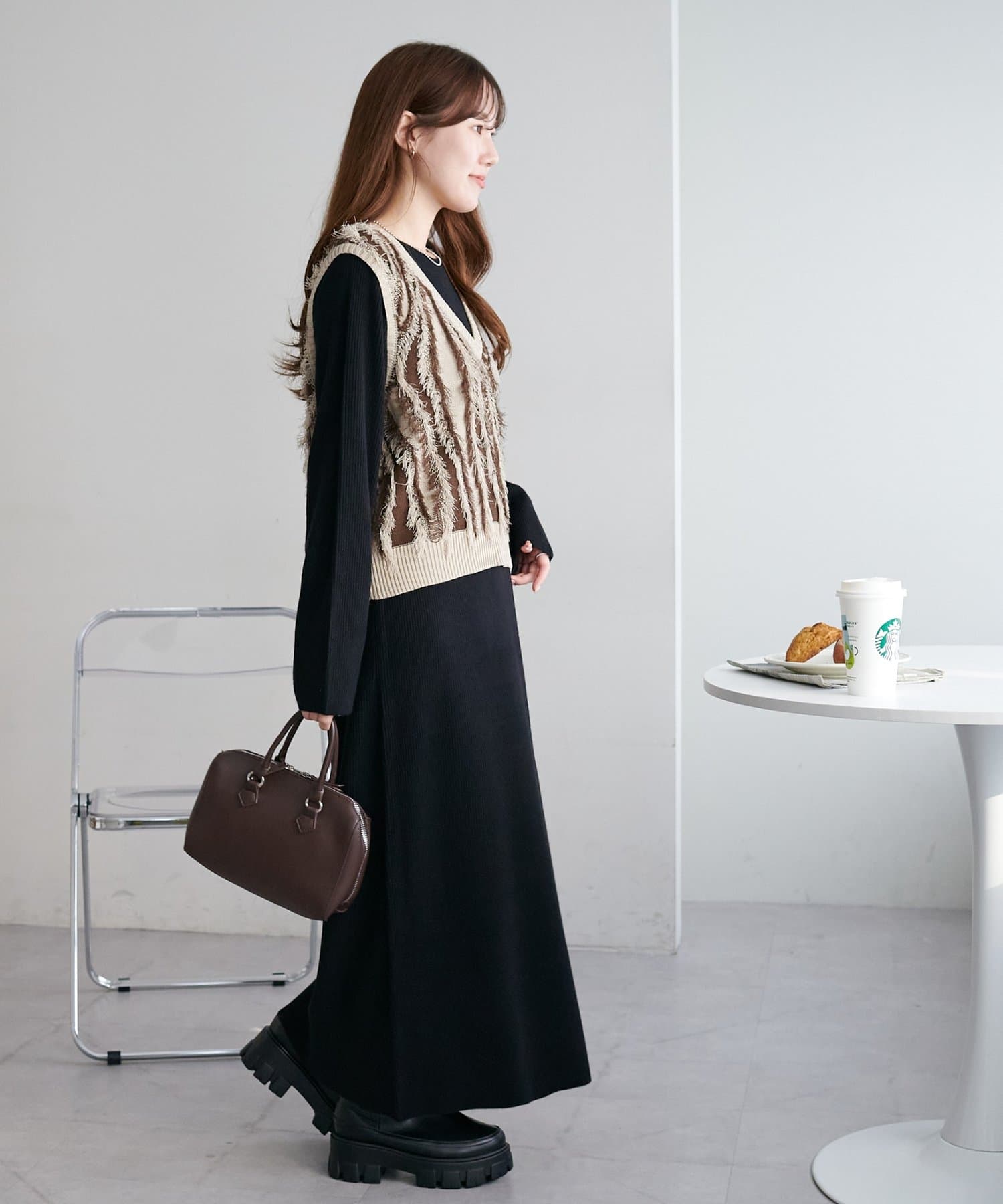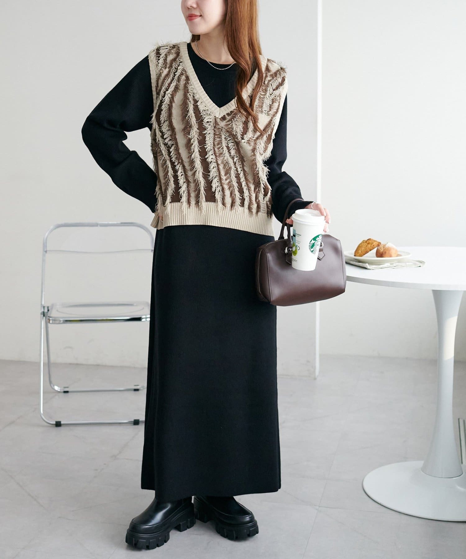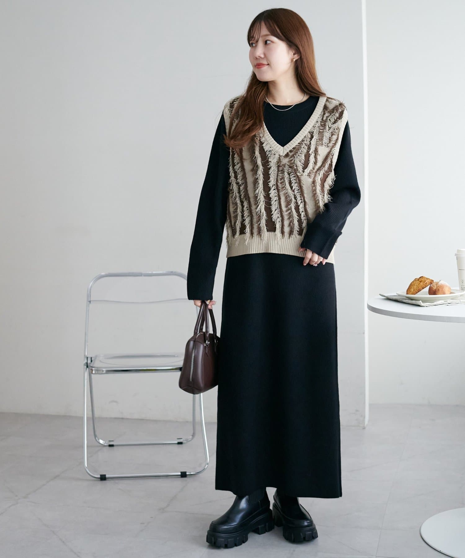 シンプルなニットワンピースに、目を惹く柄がポイントのベストがセットになったワンピース。