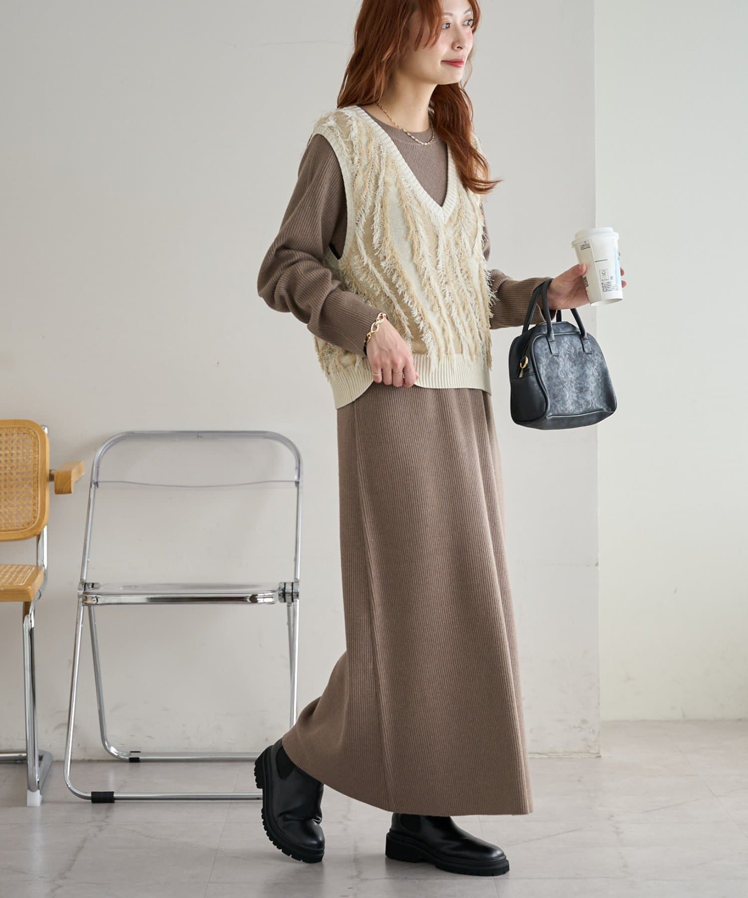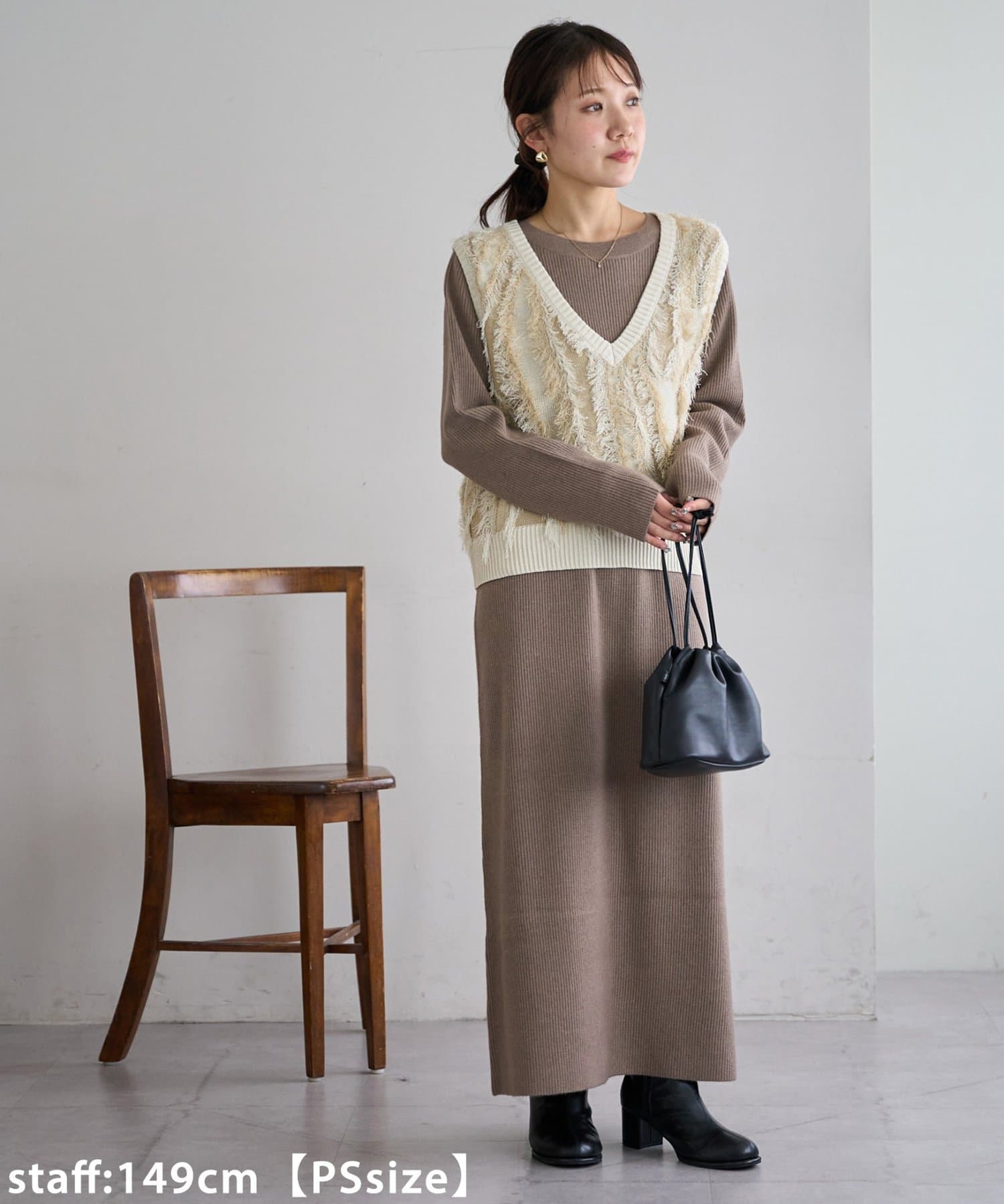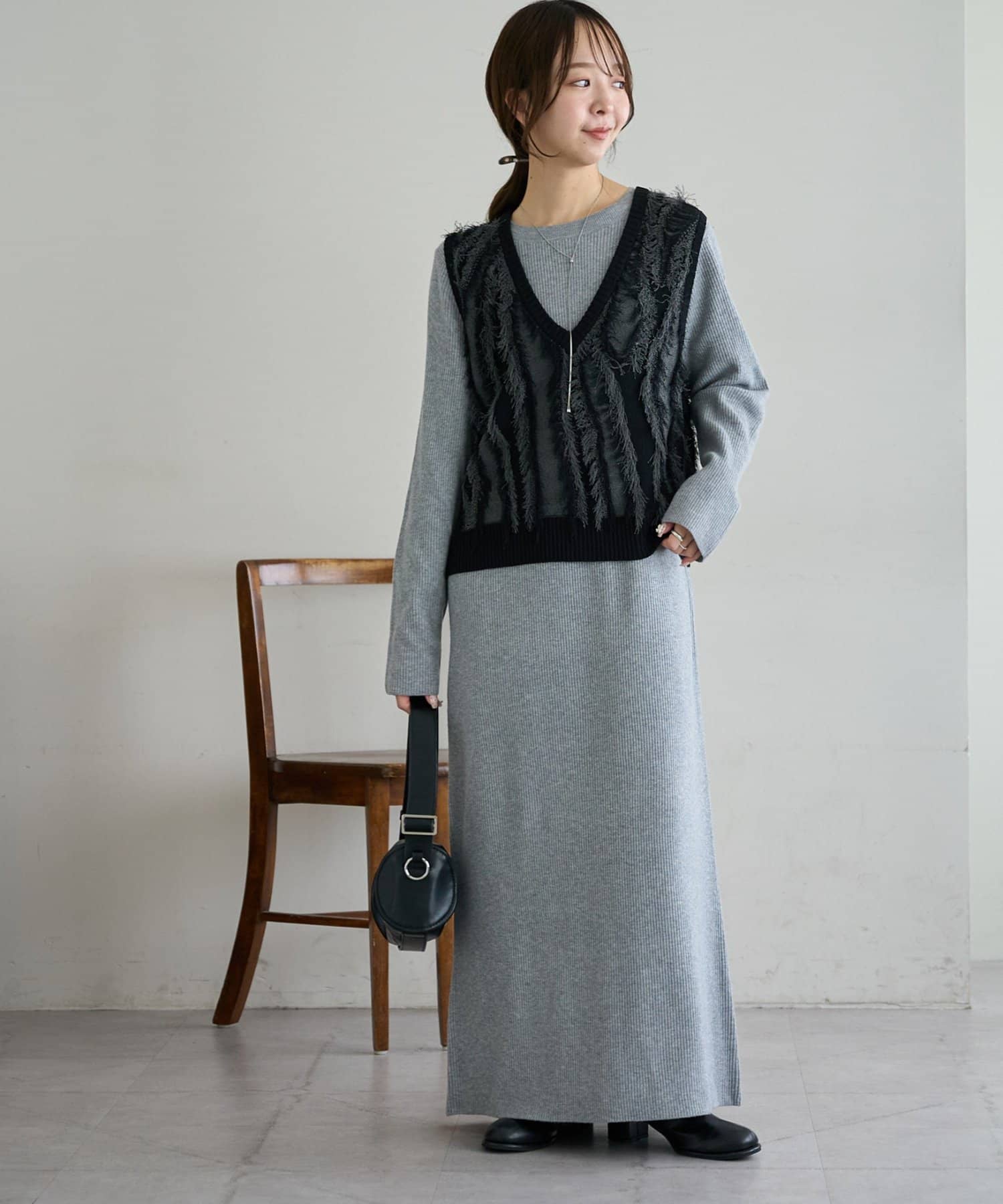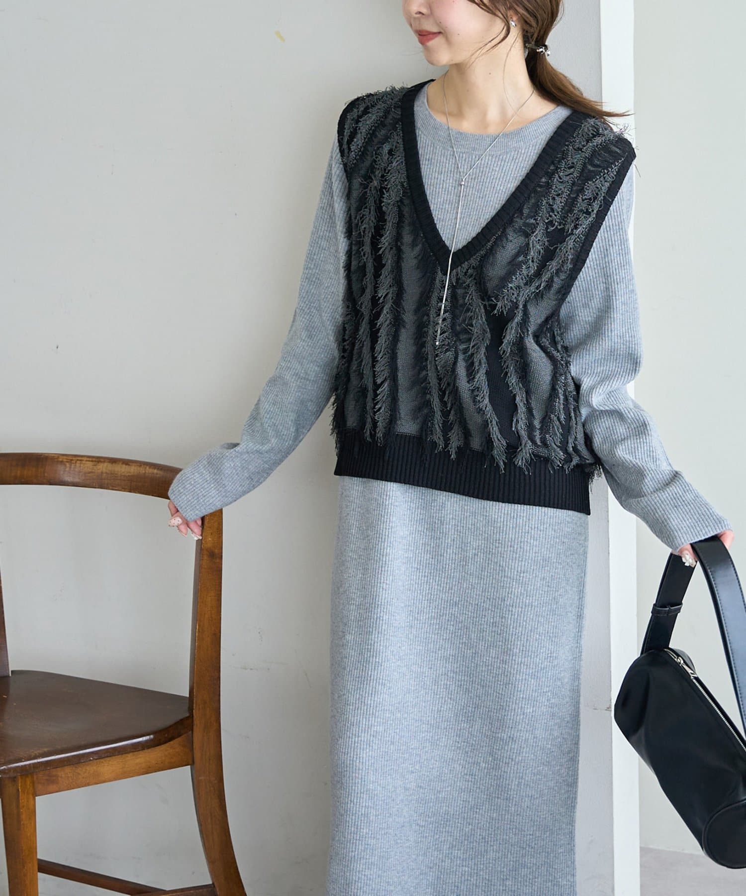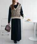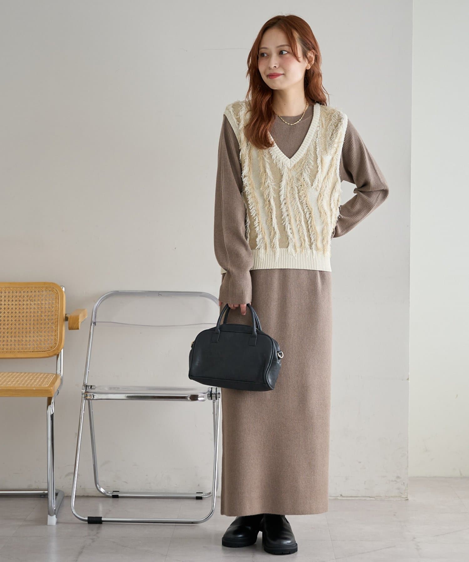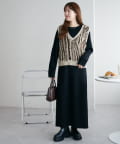 シンプルなニットワンピースに、目を惹く柄がポイントのベストがセットになったワンピース。