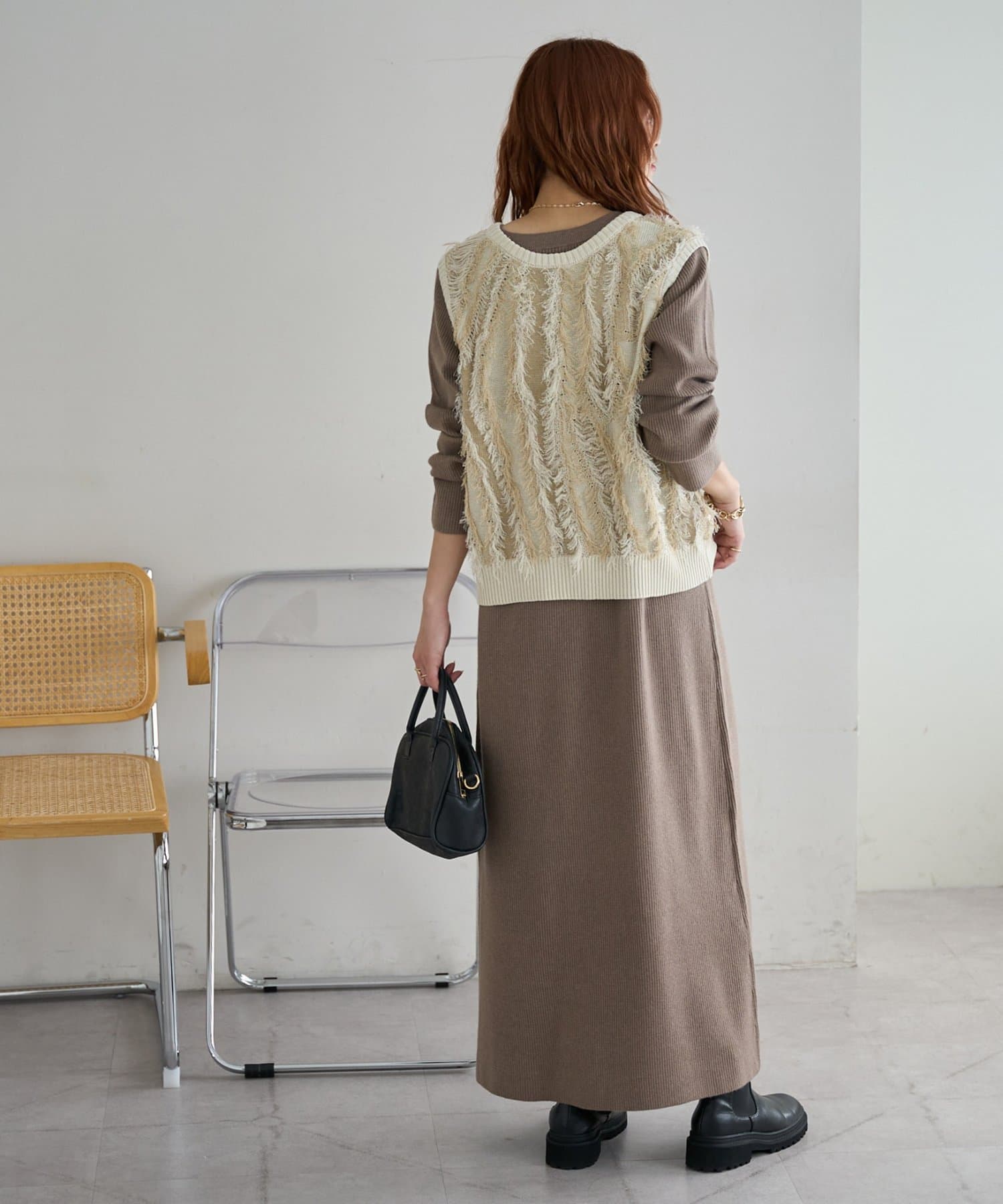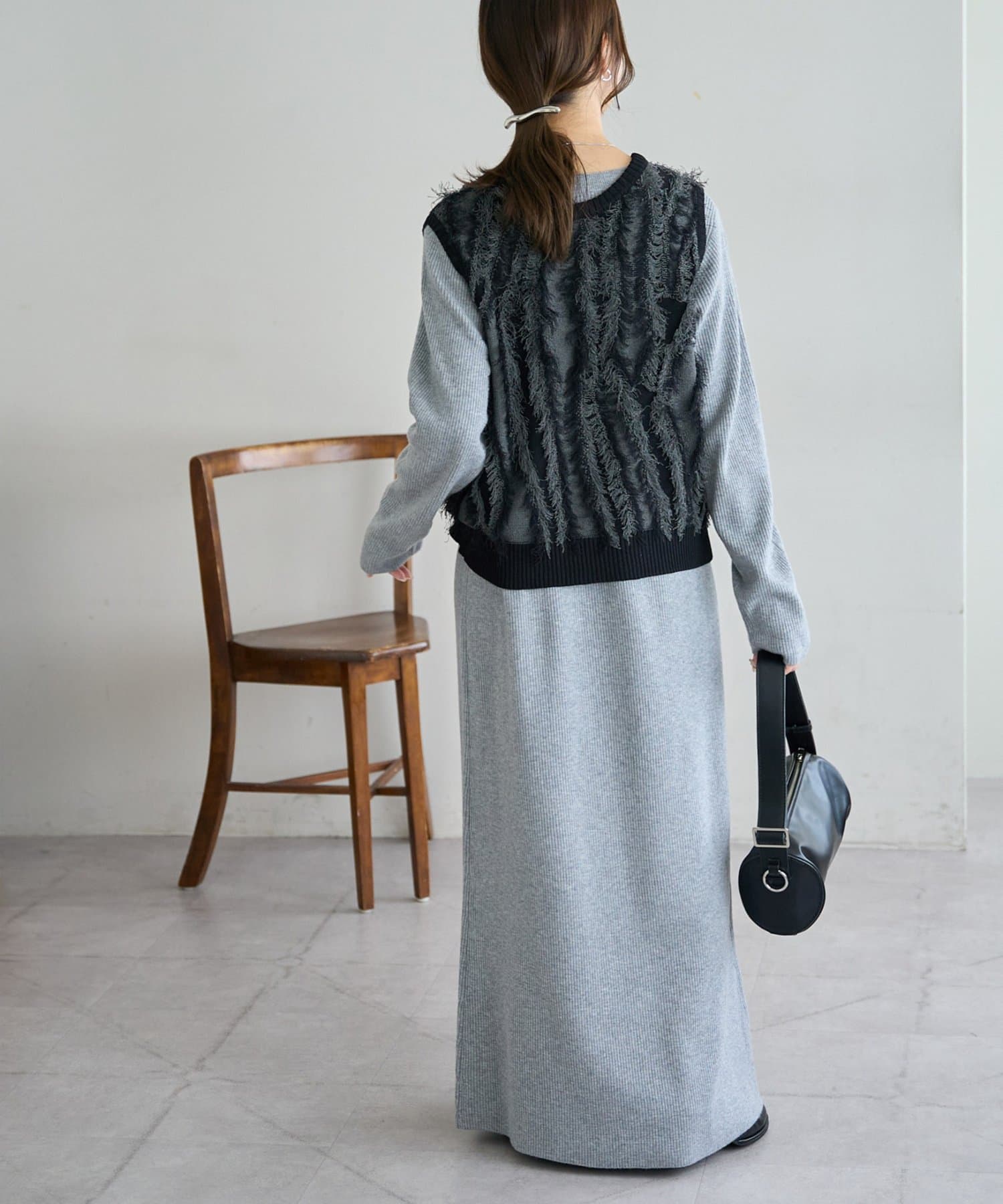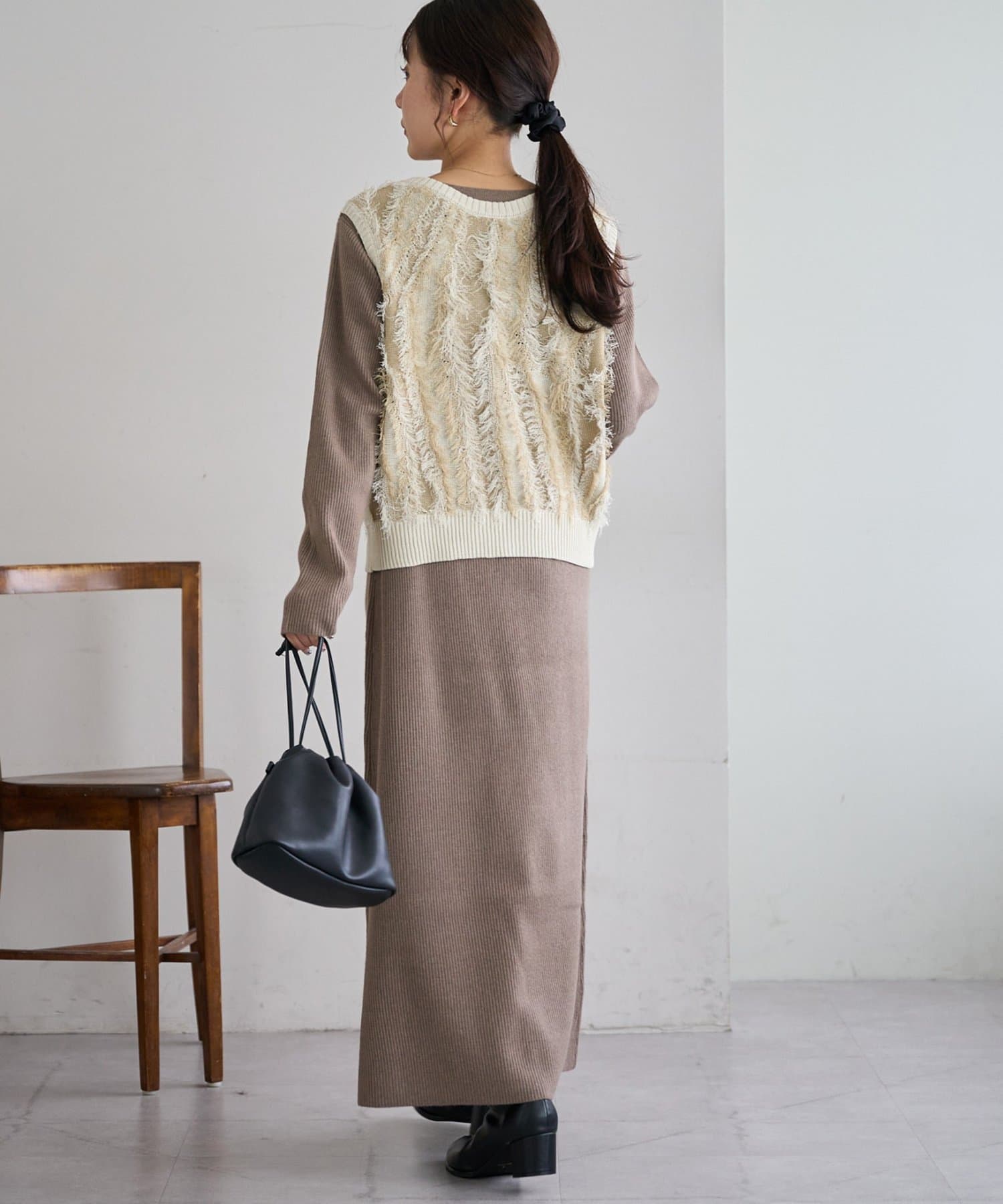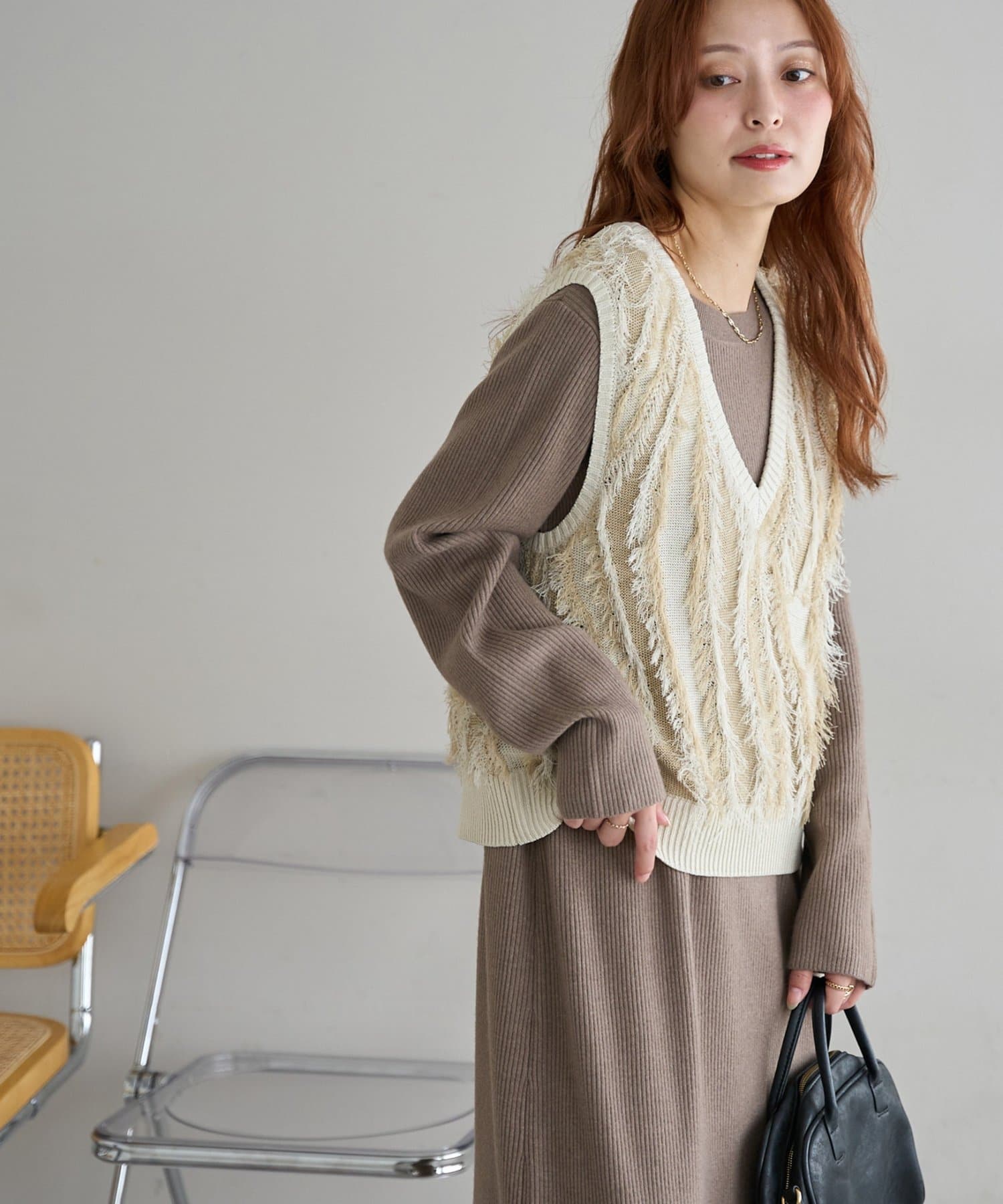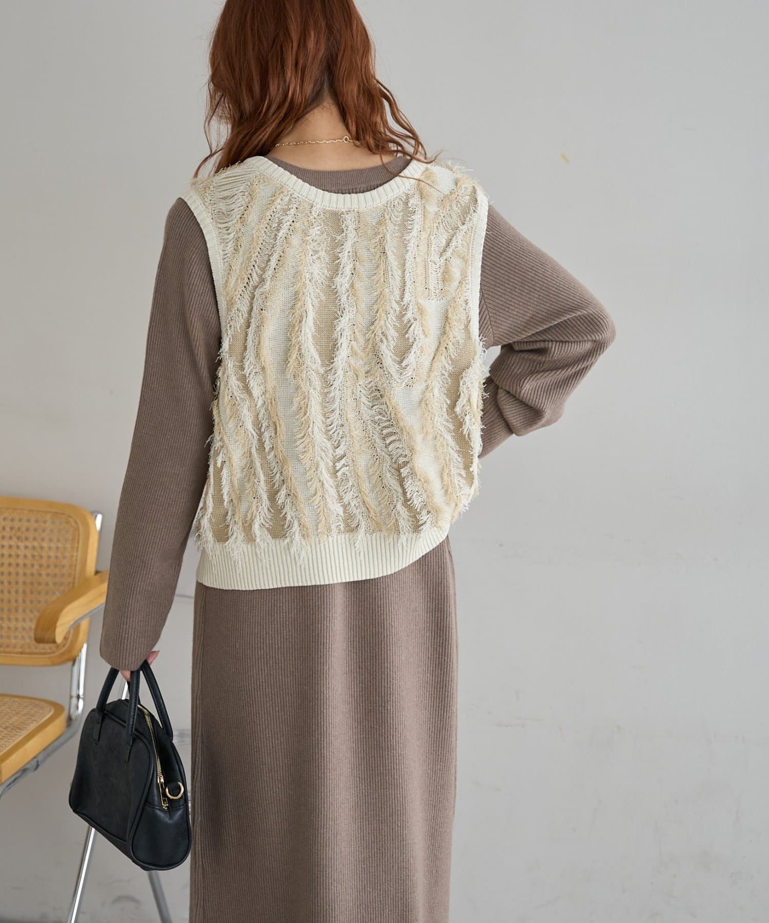 シンプルなニットワンピースに、目を惹く柄がポイントのベストがセットになったワンピース。