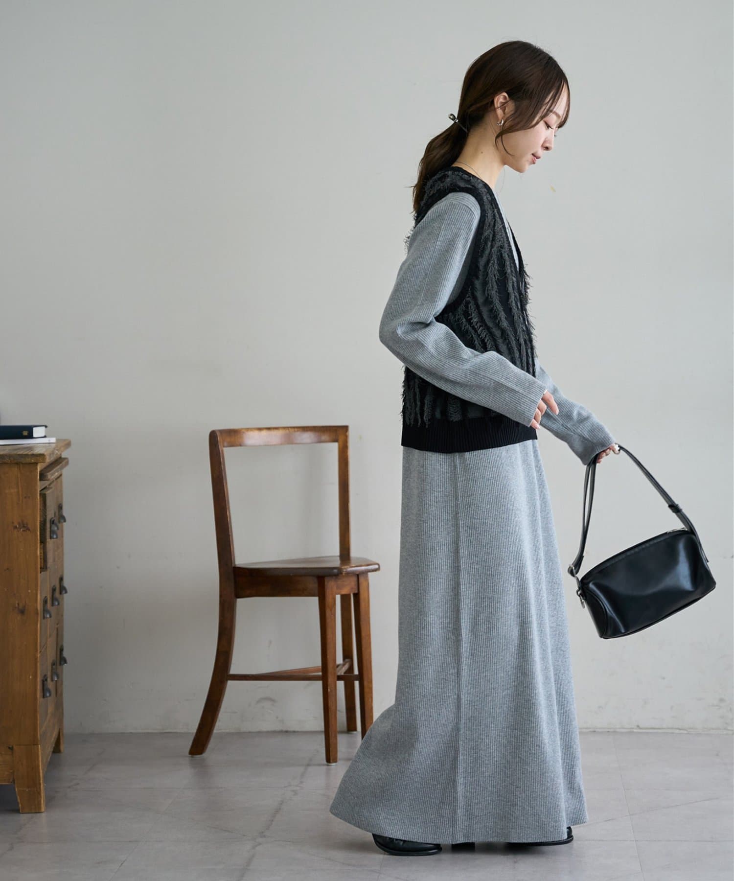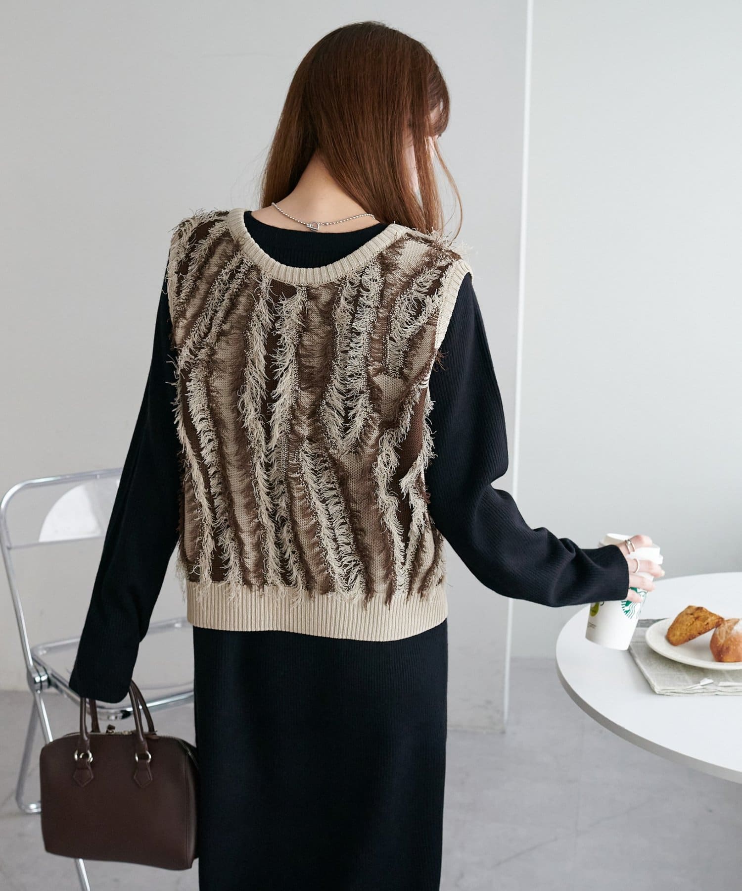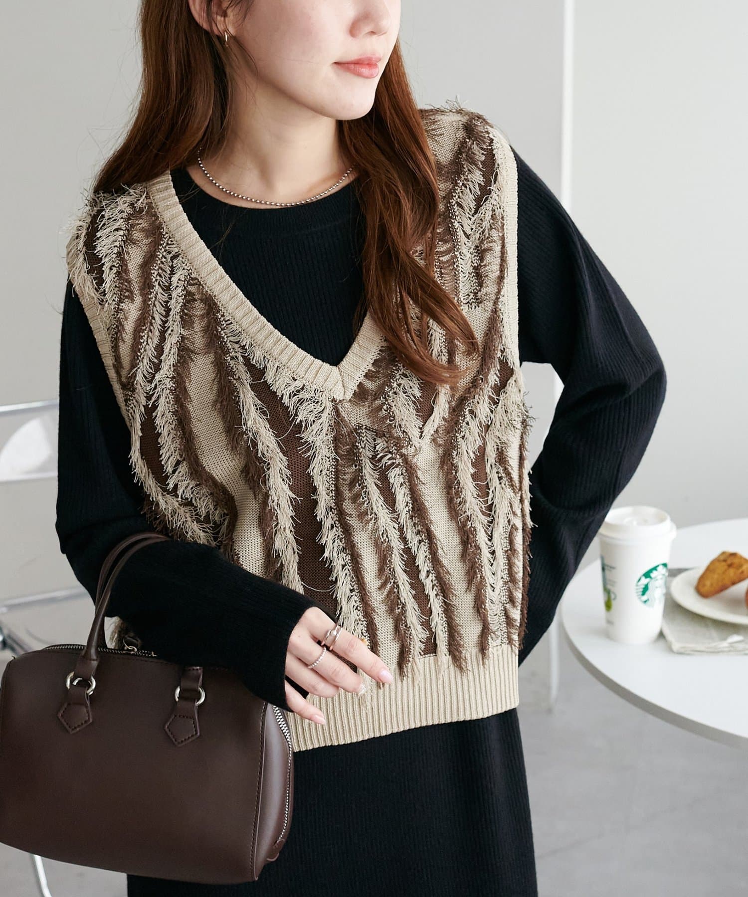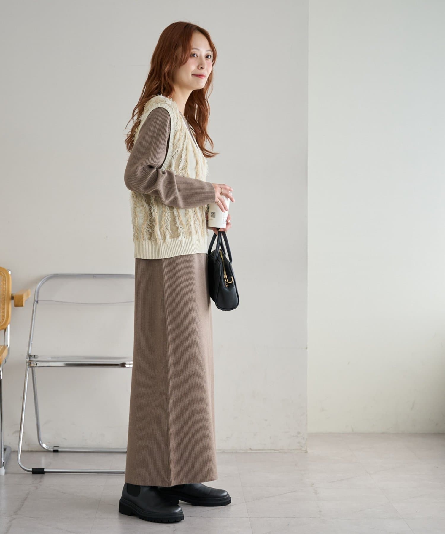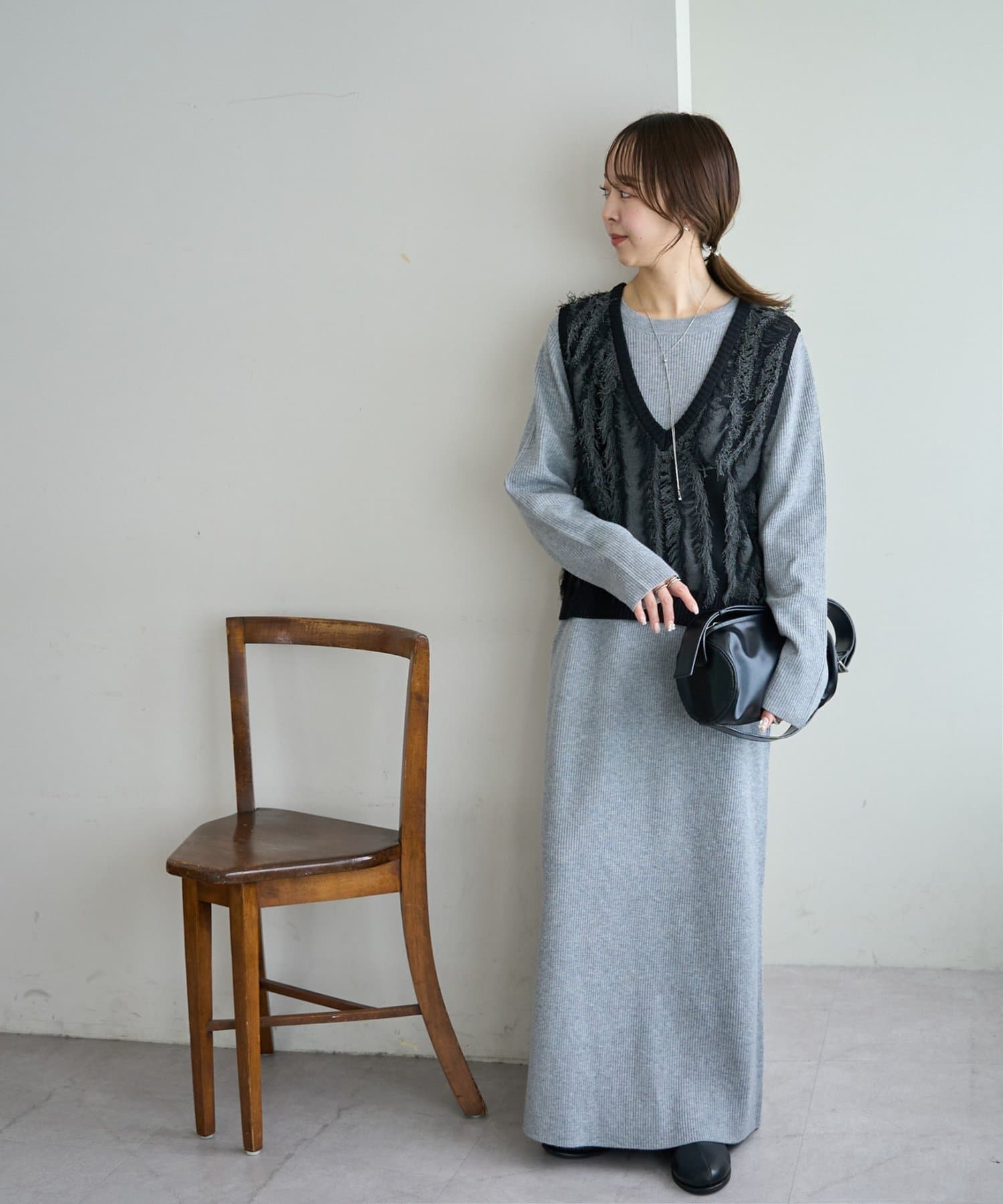 シンプルなニットワンピースに、目を惹く柄がポイントのベストがセットになったワンピース。