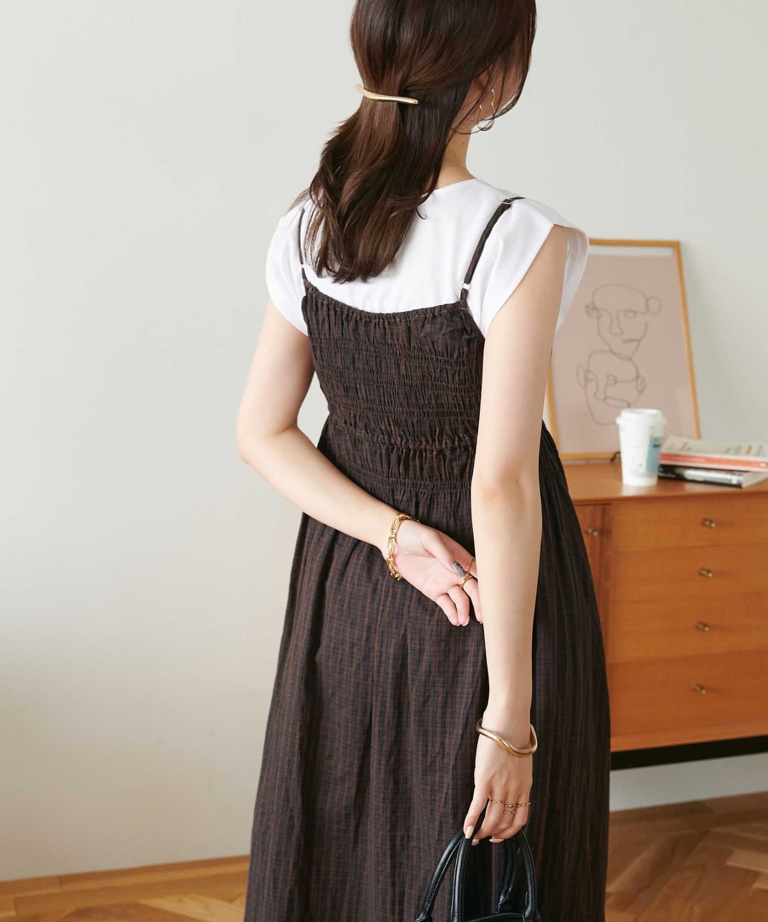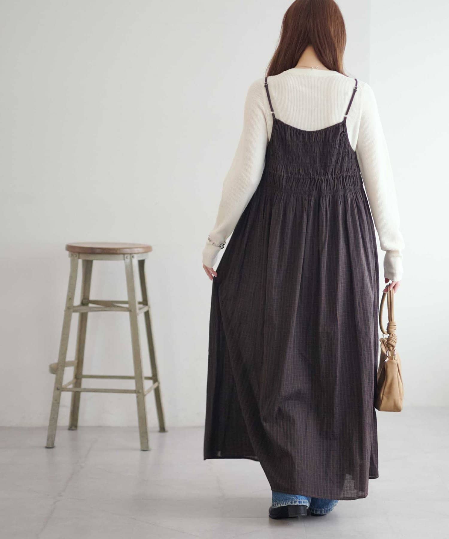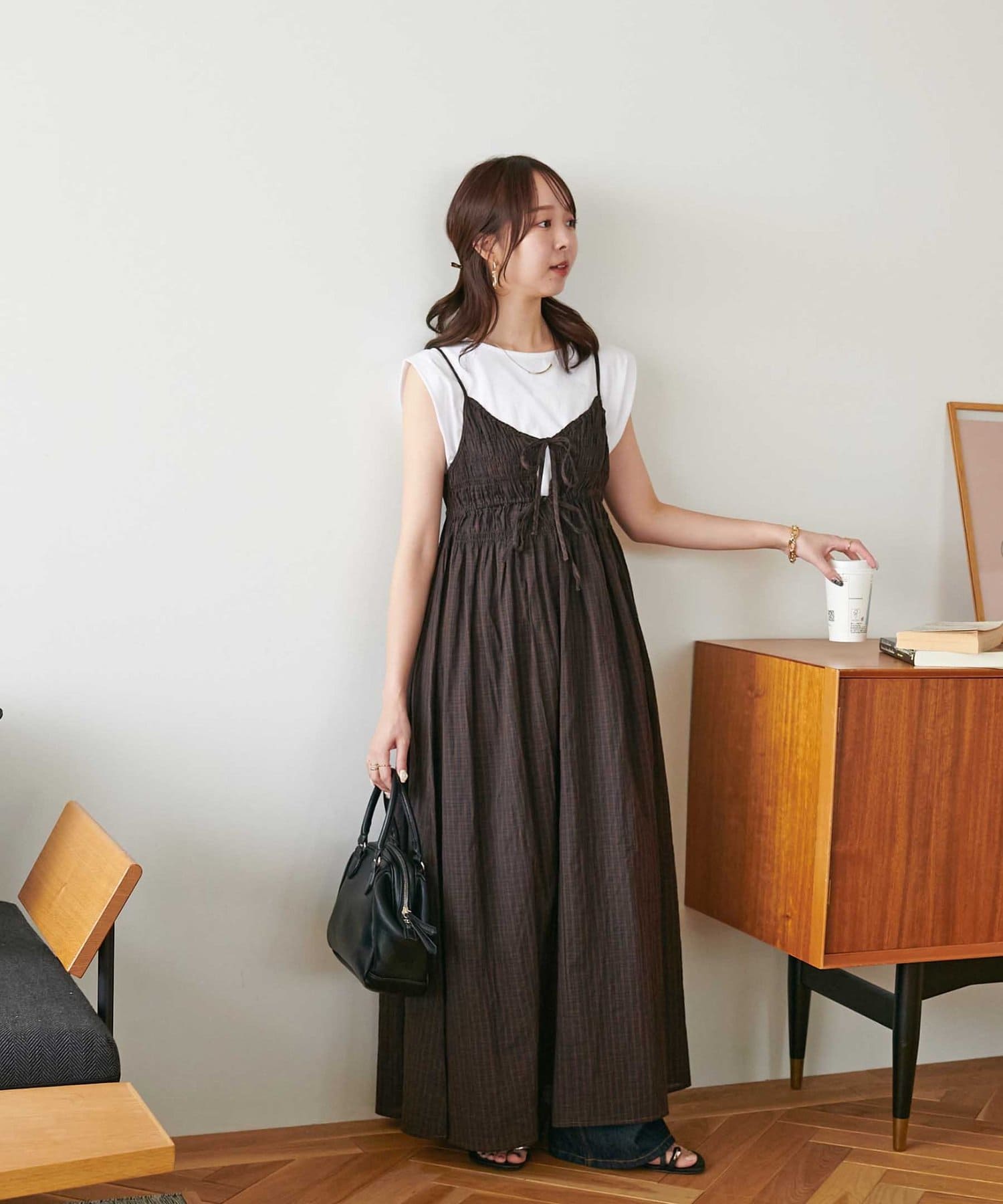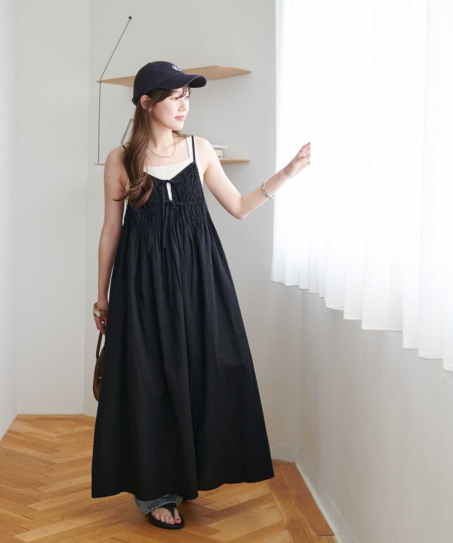 胸元にたっぷりと入ったシャーリングが印象的なキャミワンピース