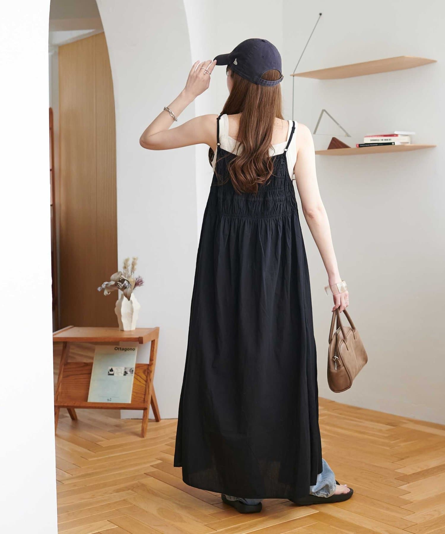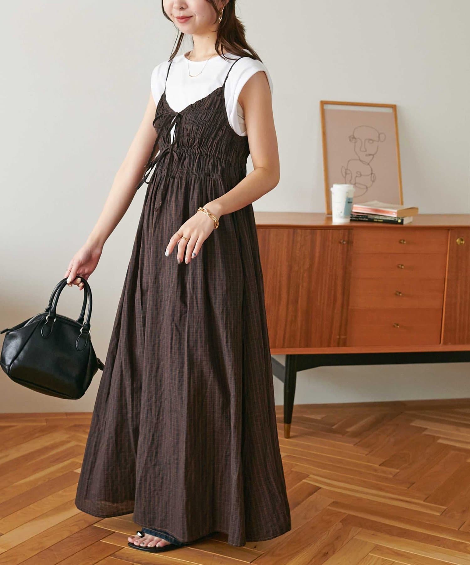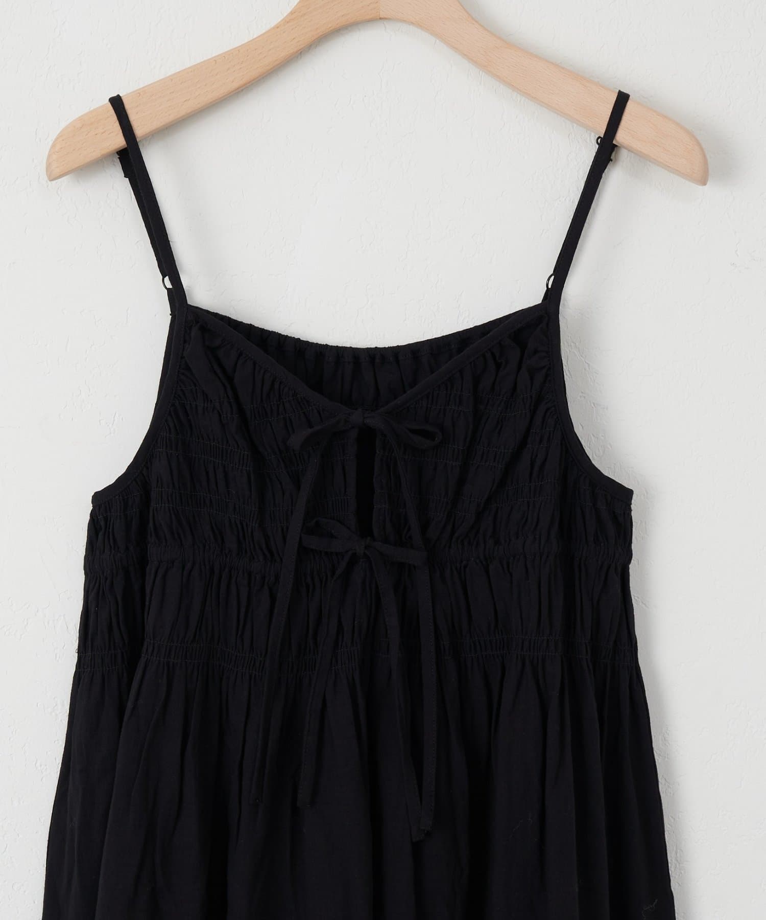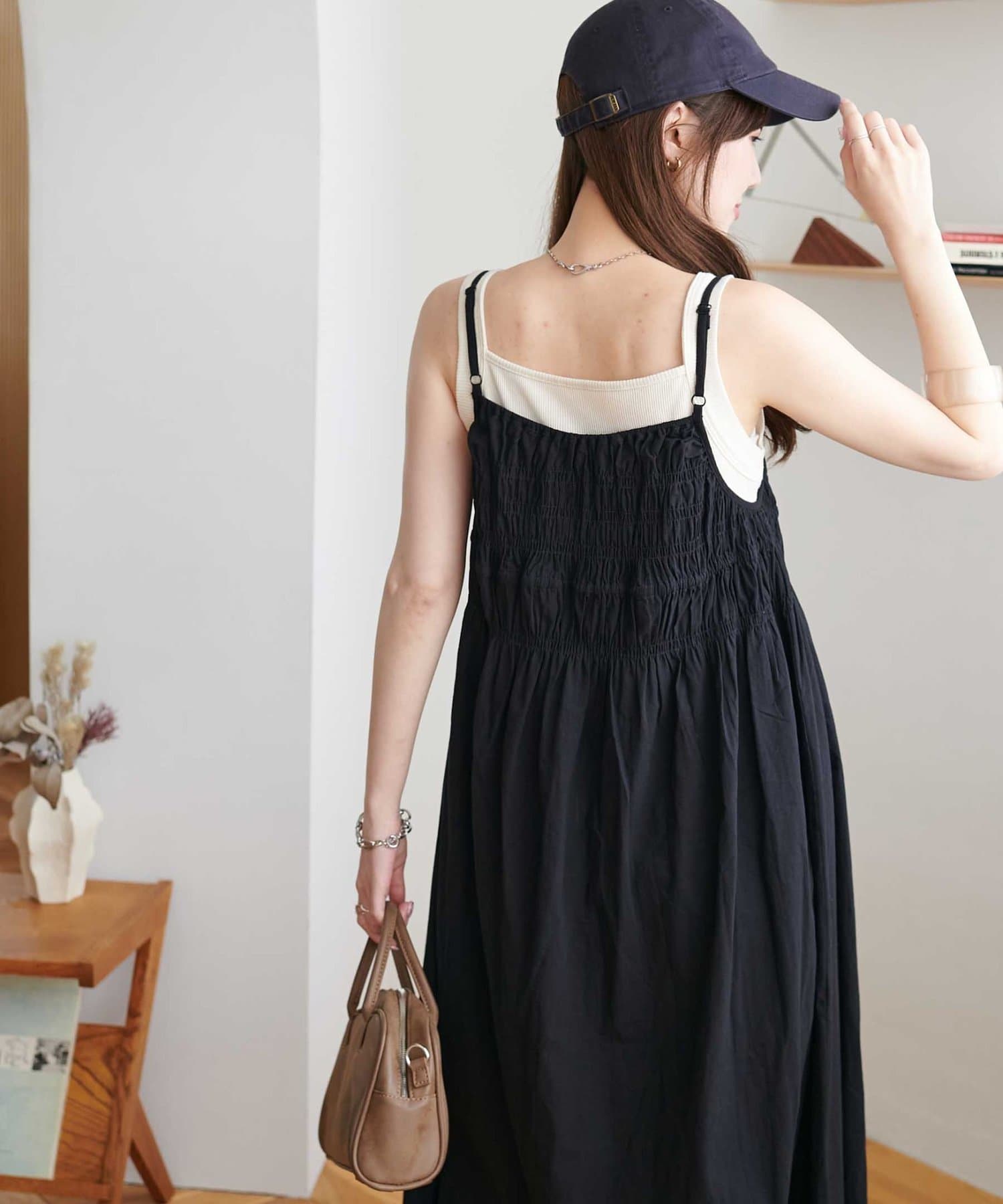 胸元にたっぷりと入ったシャーリングが印象的なキャミワンピース