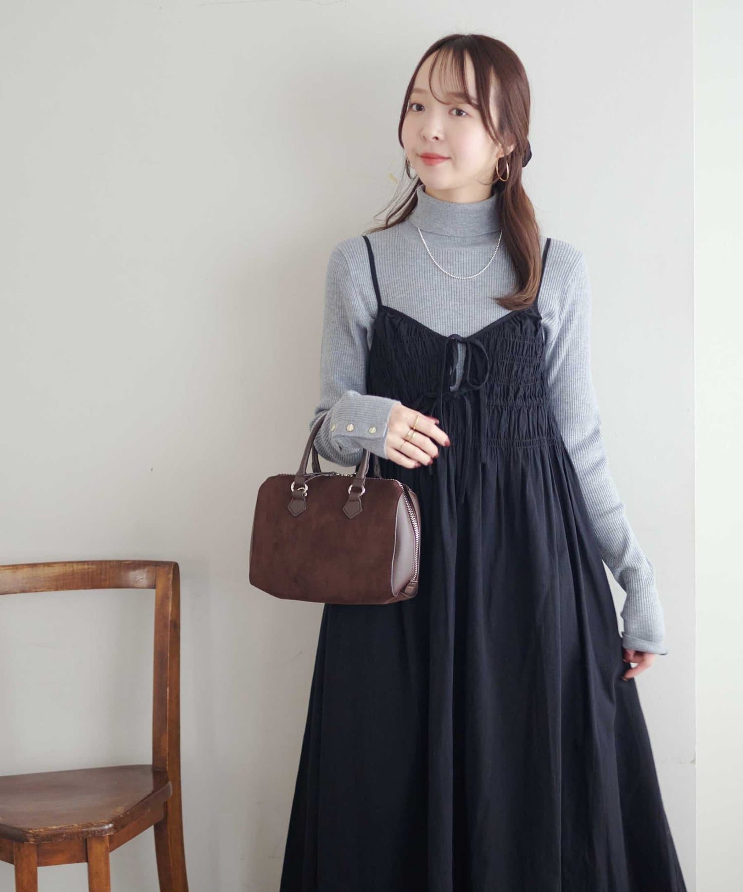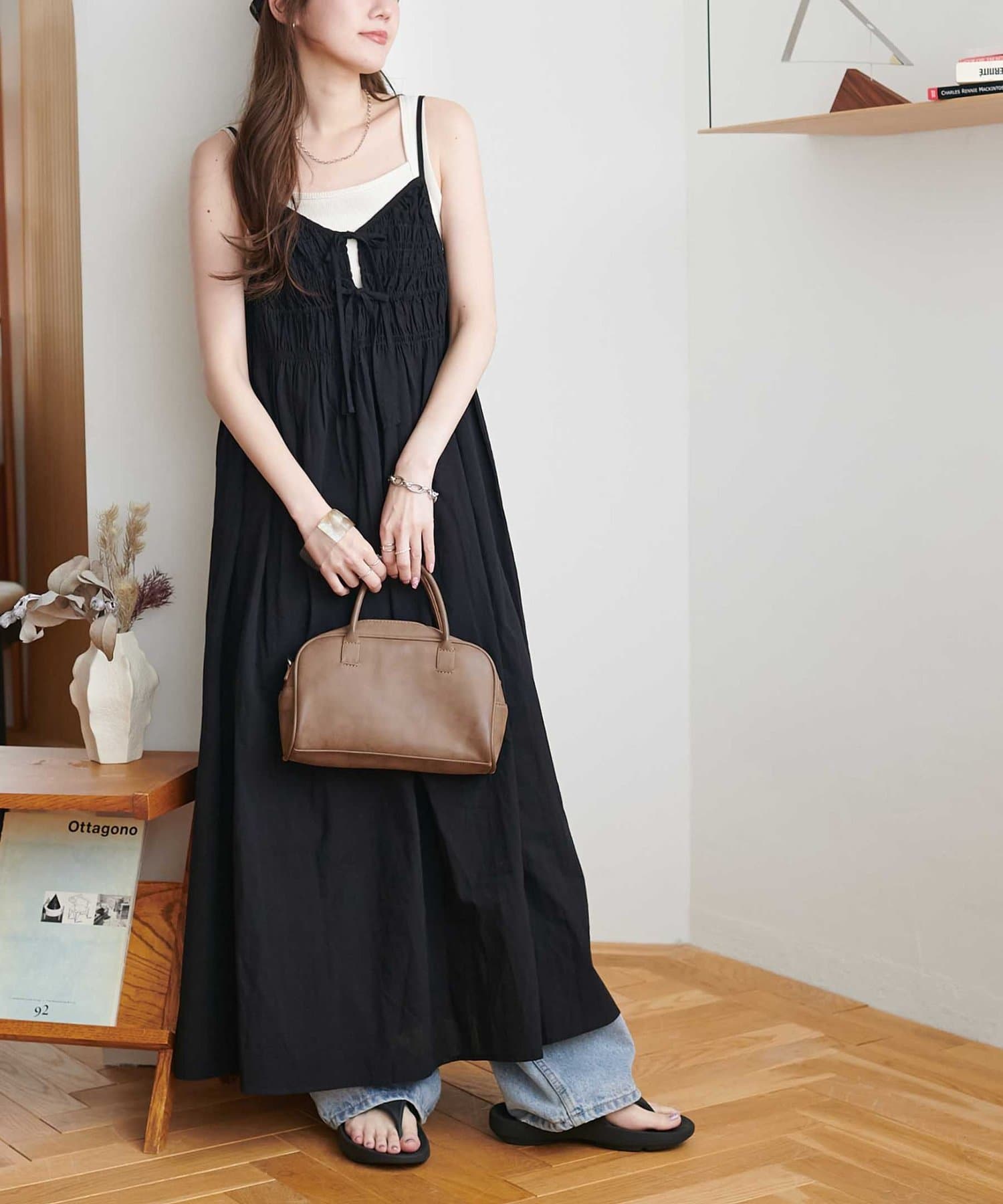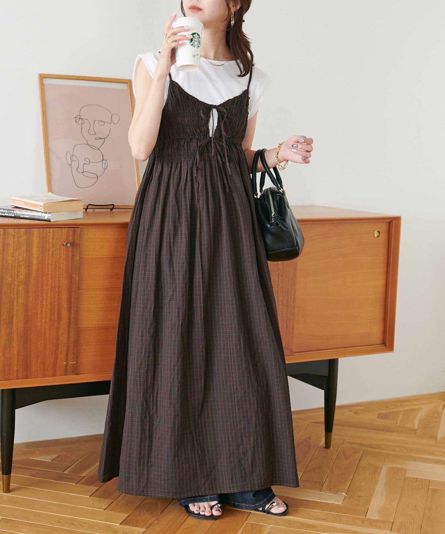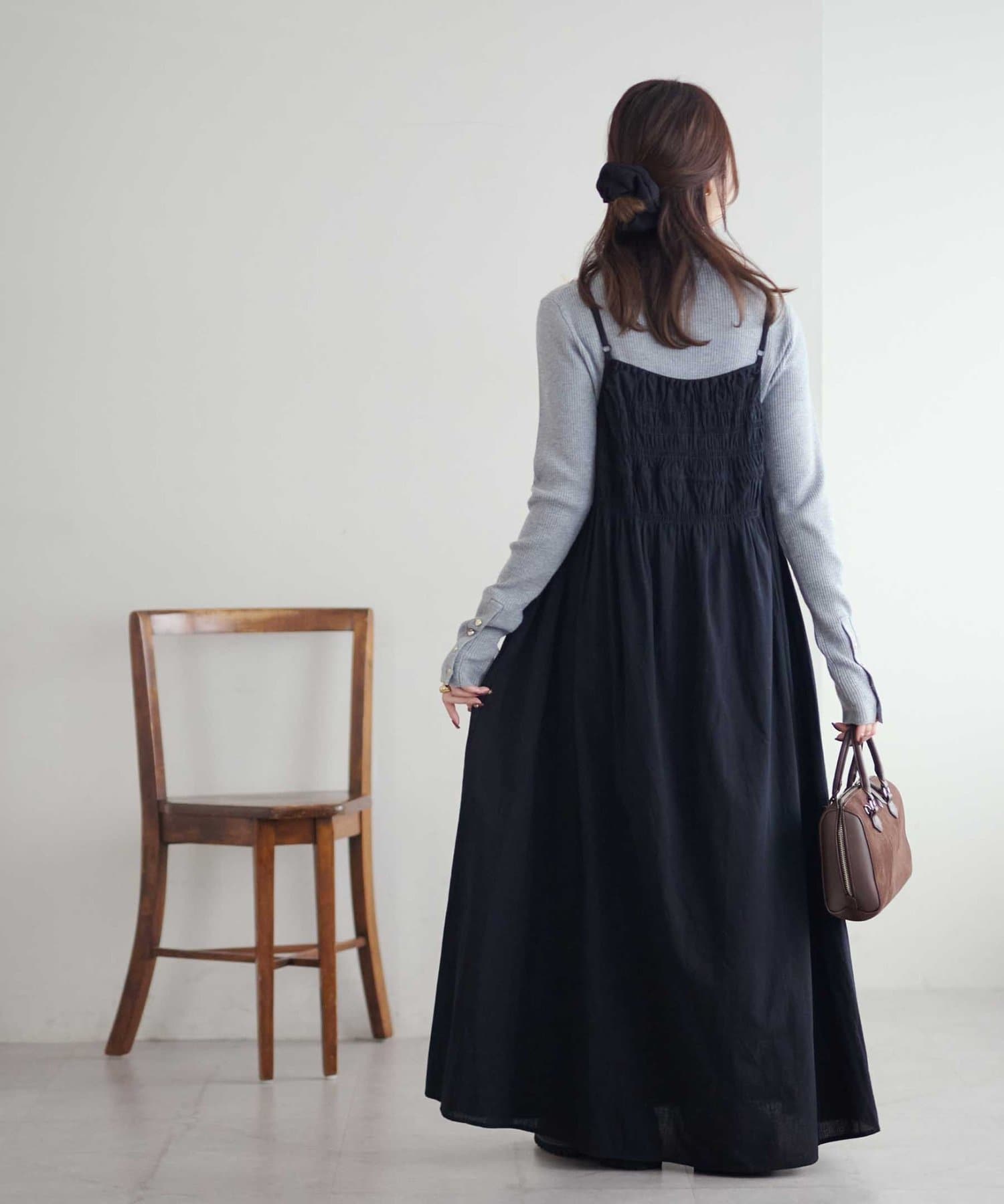 胸元にたっぷりと入ったシャーリングが印象的なキャミワンピース