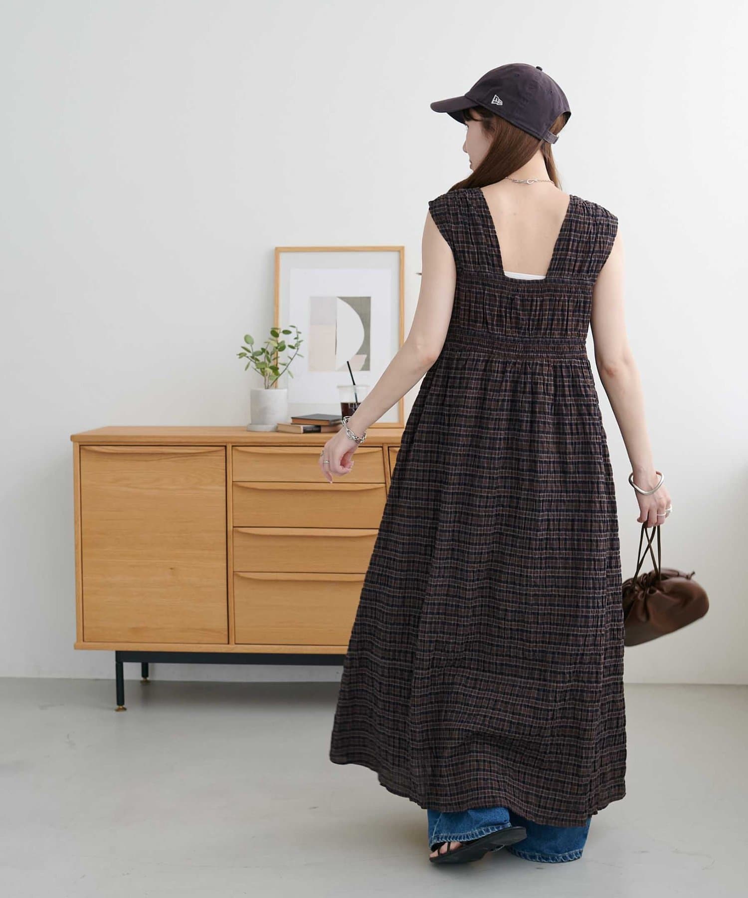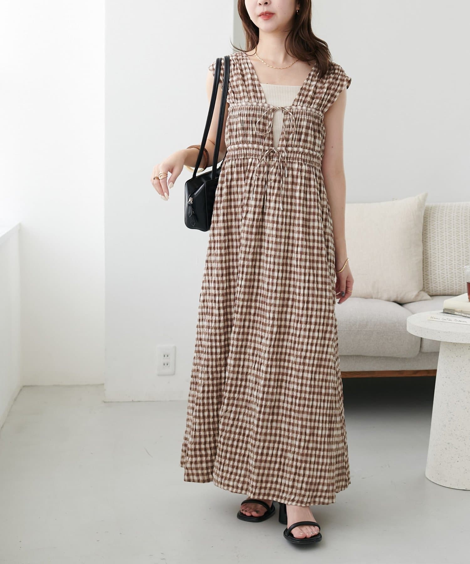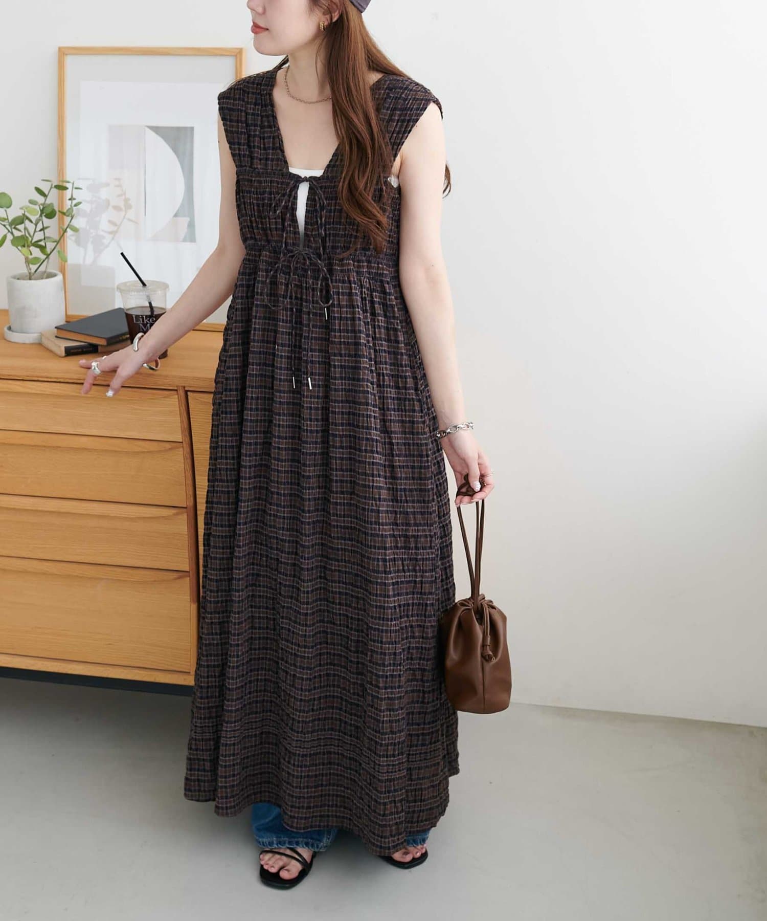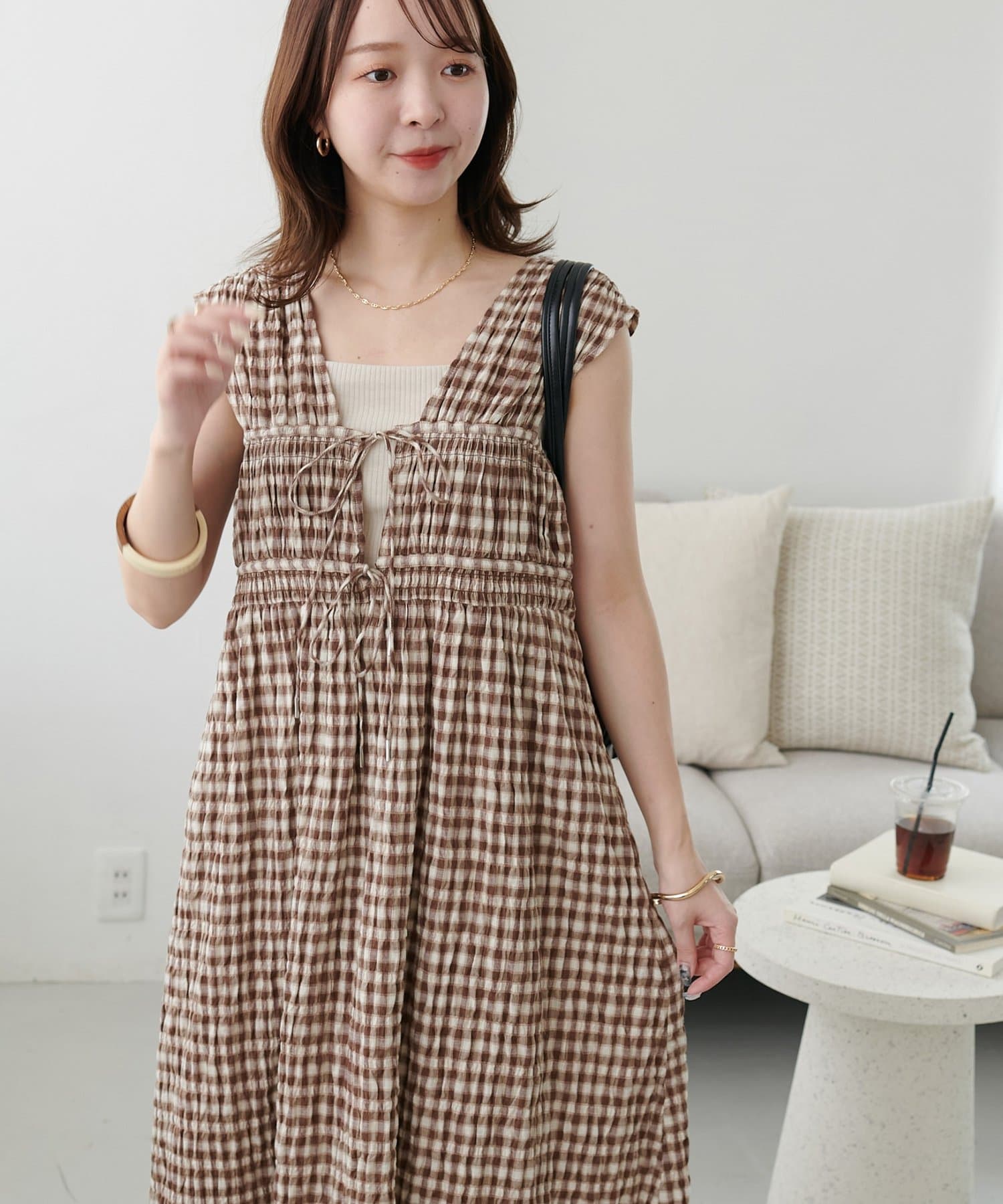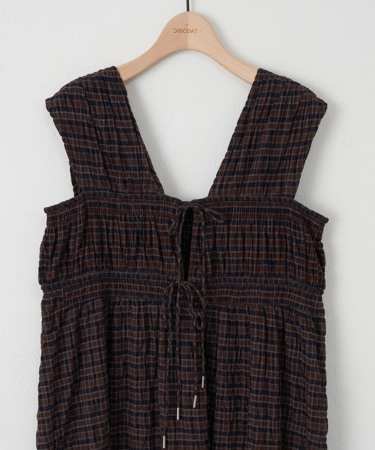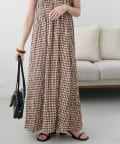 シャーリングチェックノースリワンピース