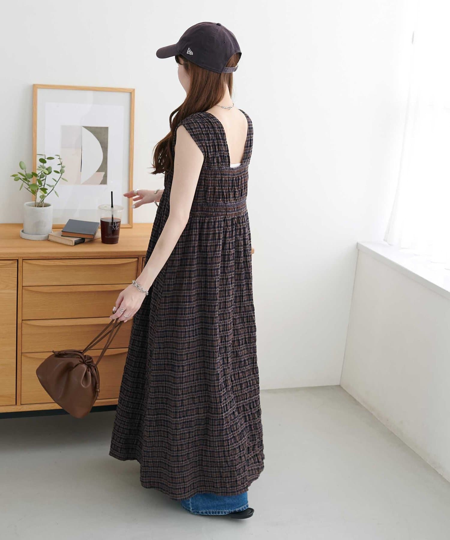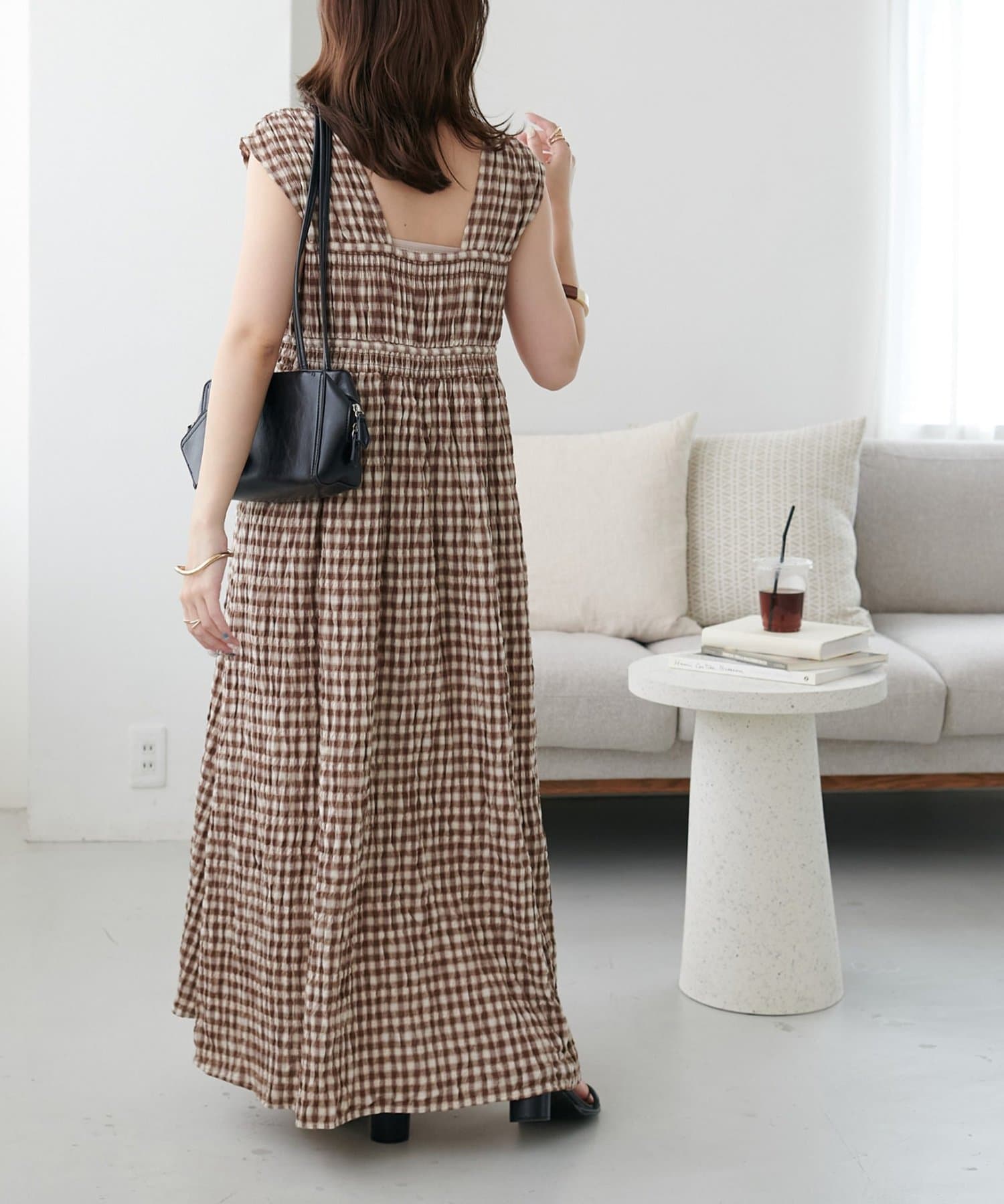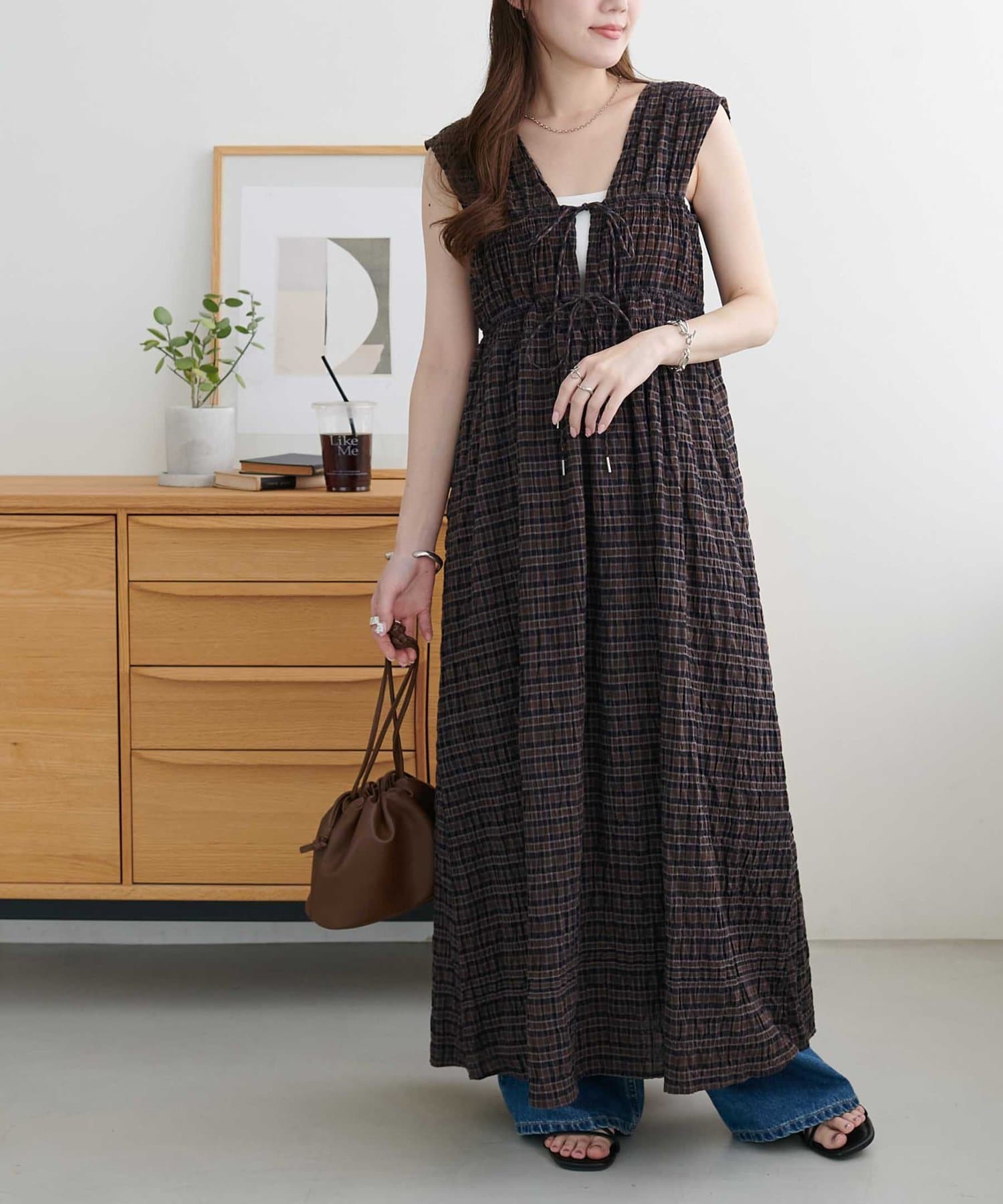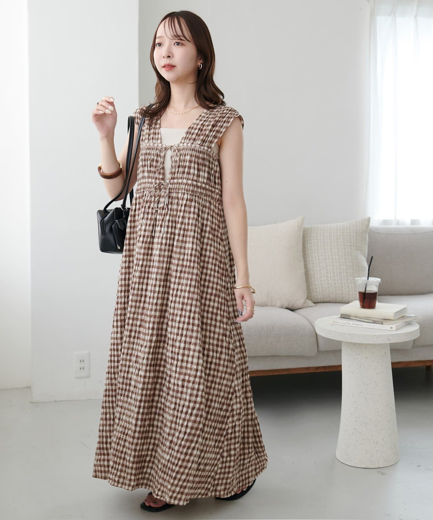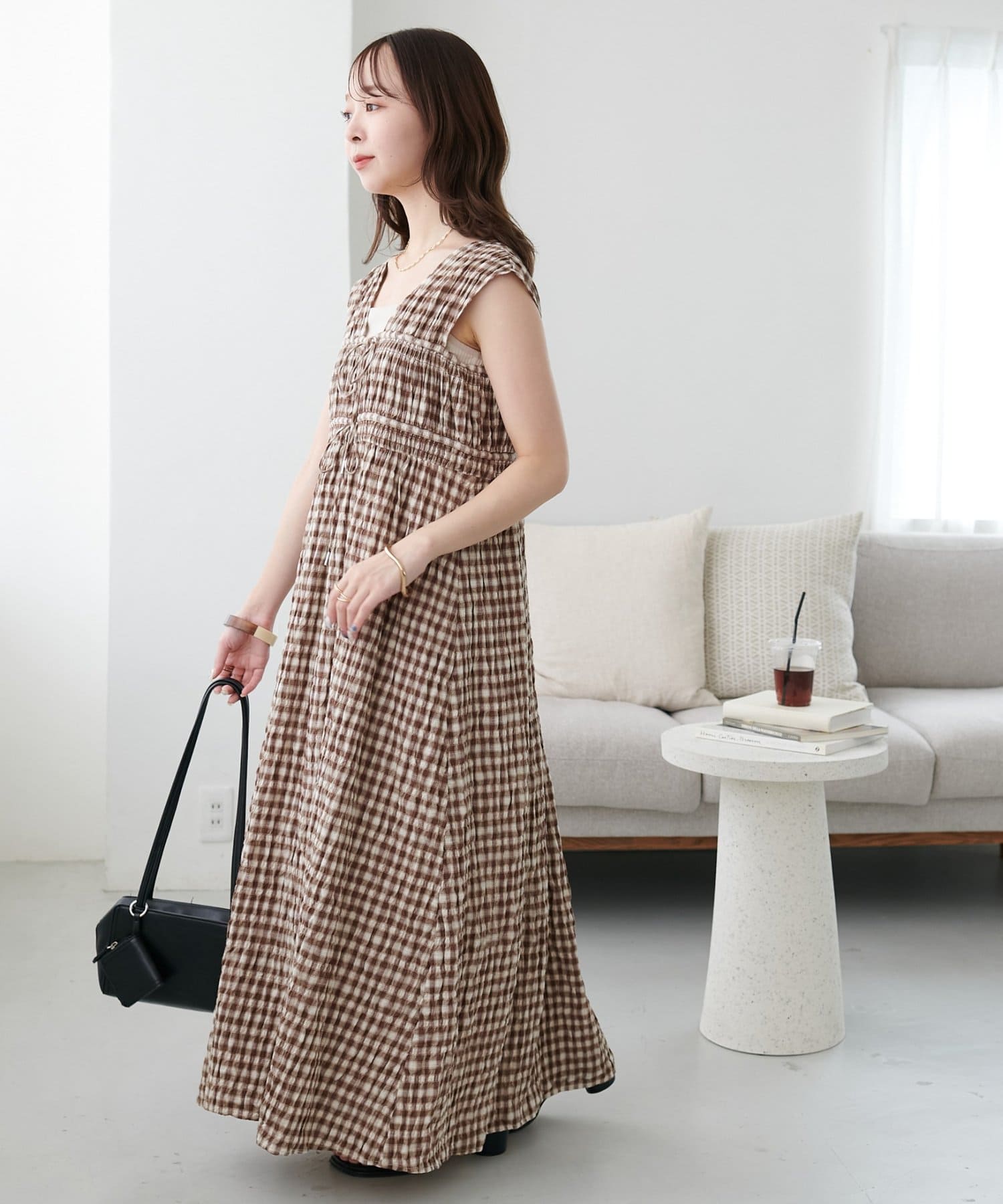 シャーリングチェックノースリワンピース