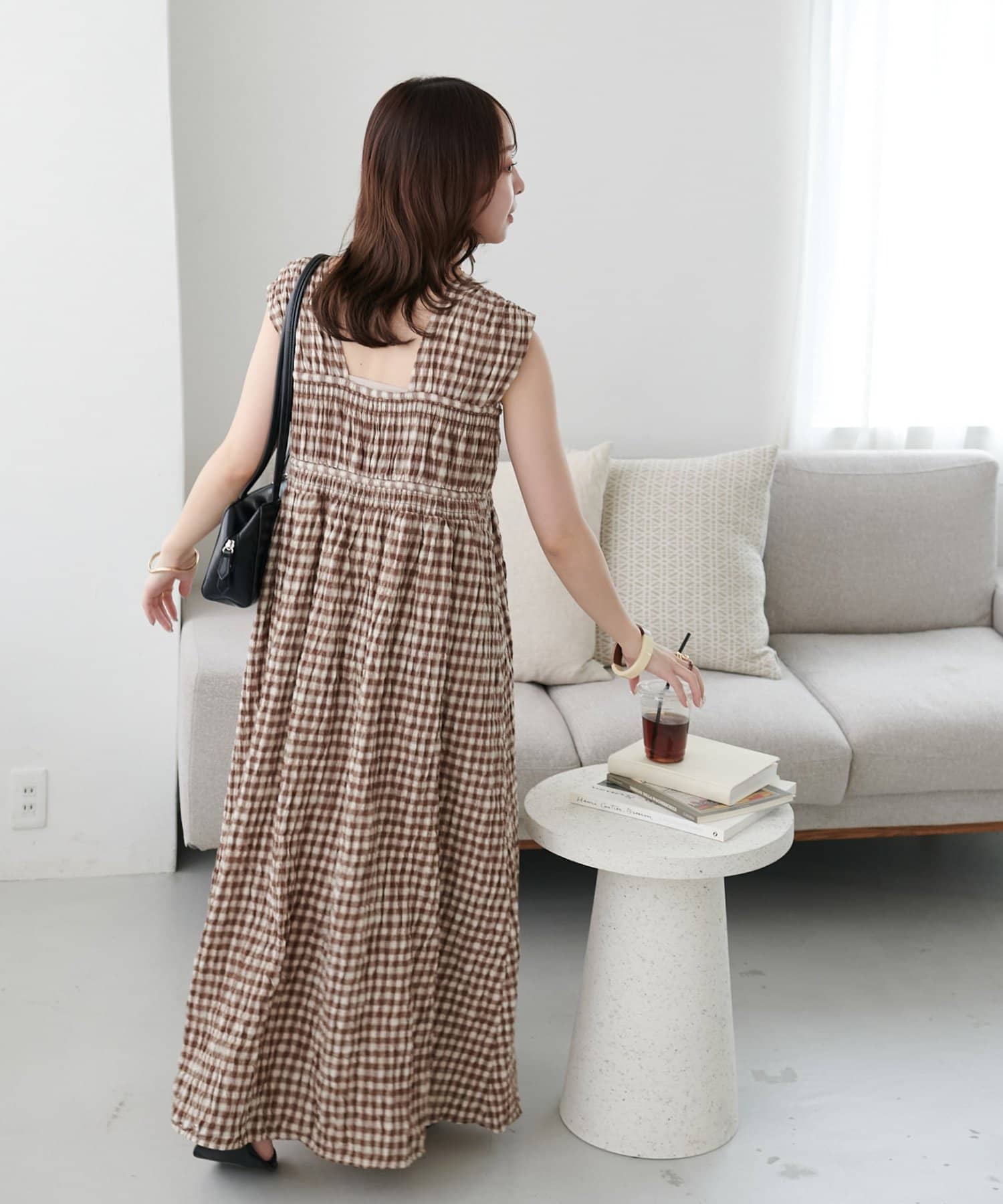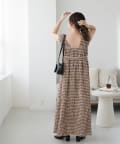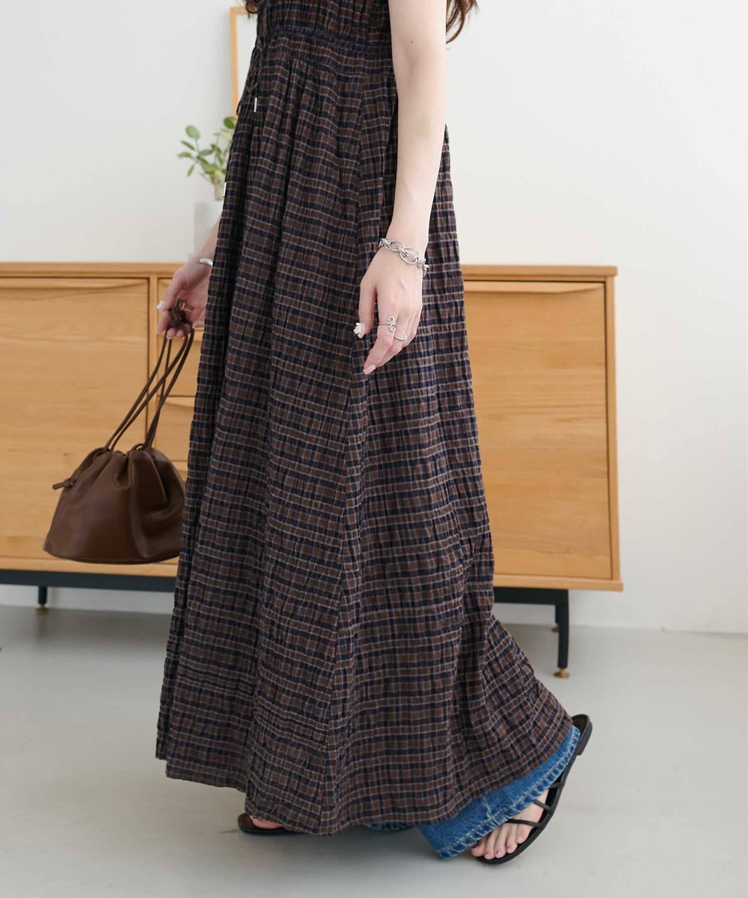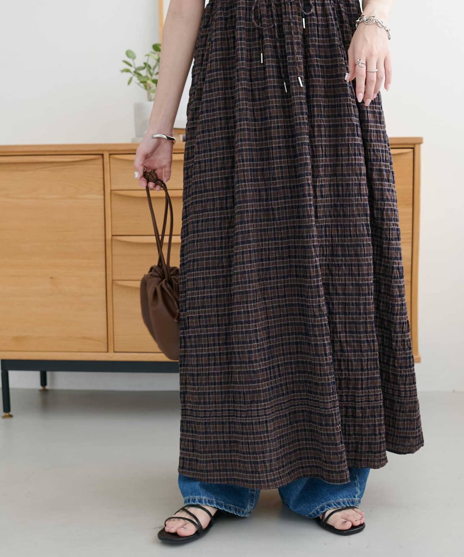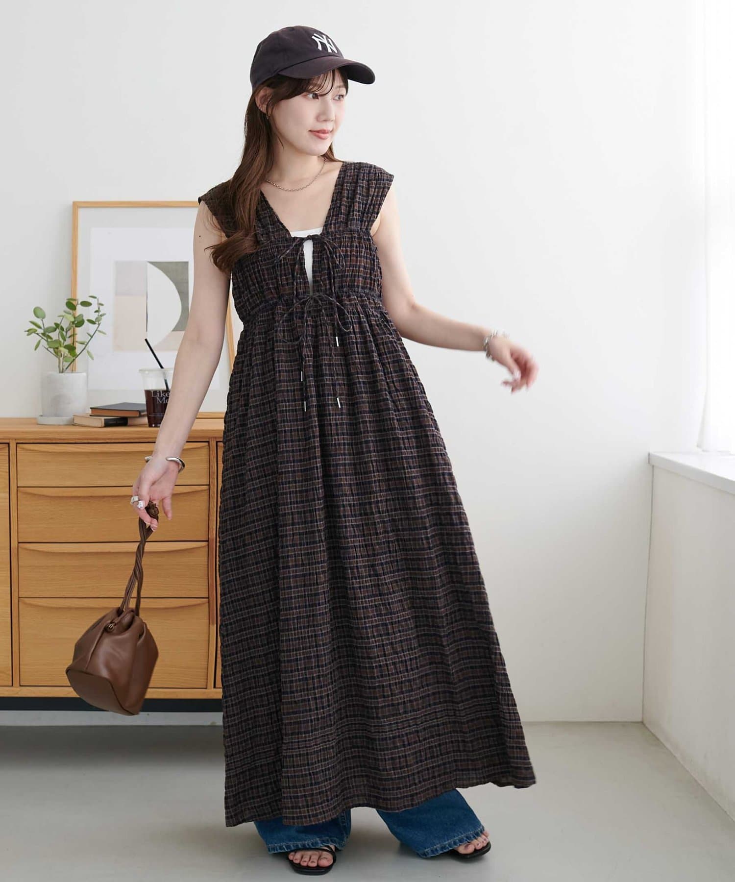 シャーリングチェックノースリワンピース