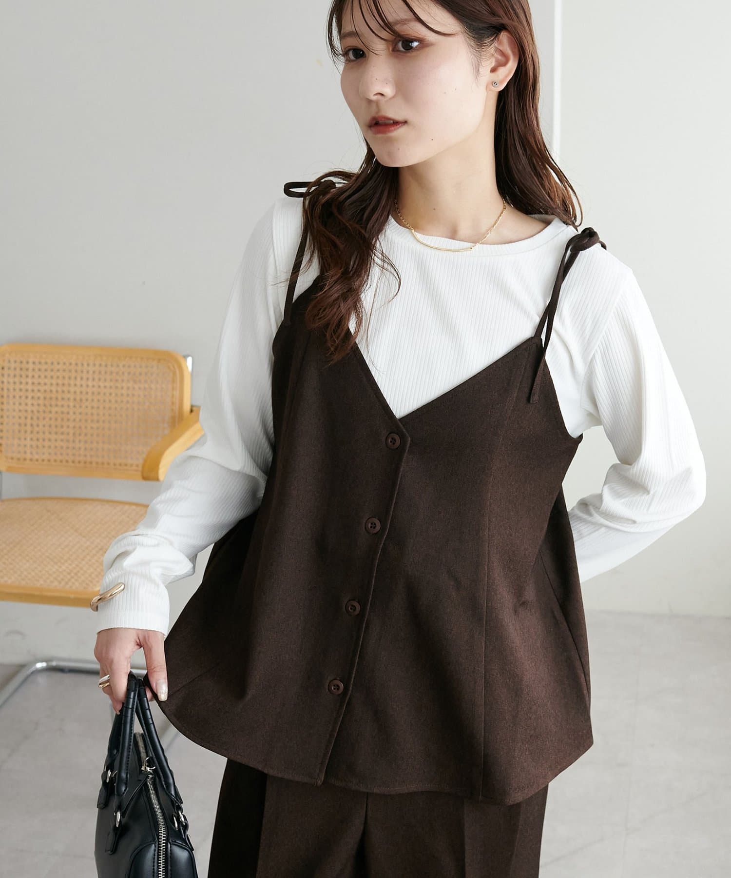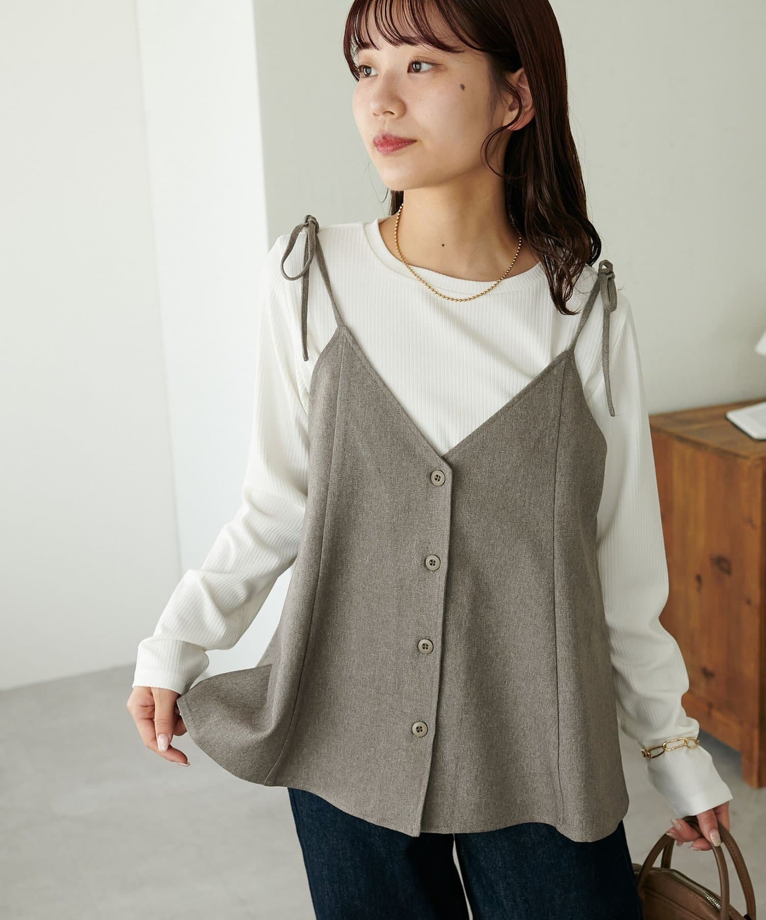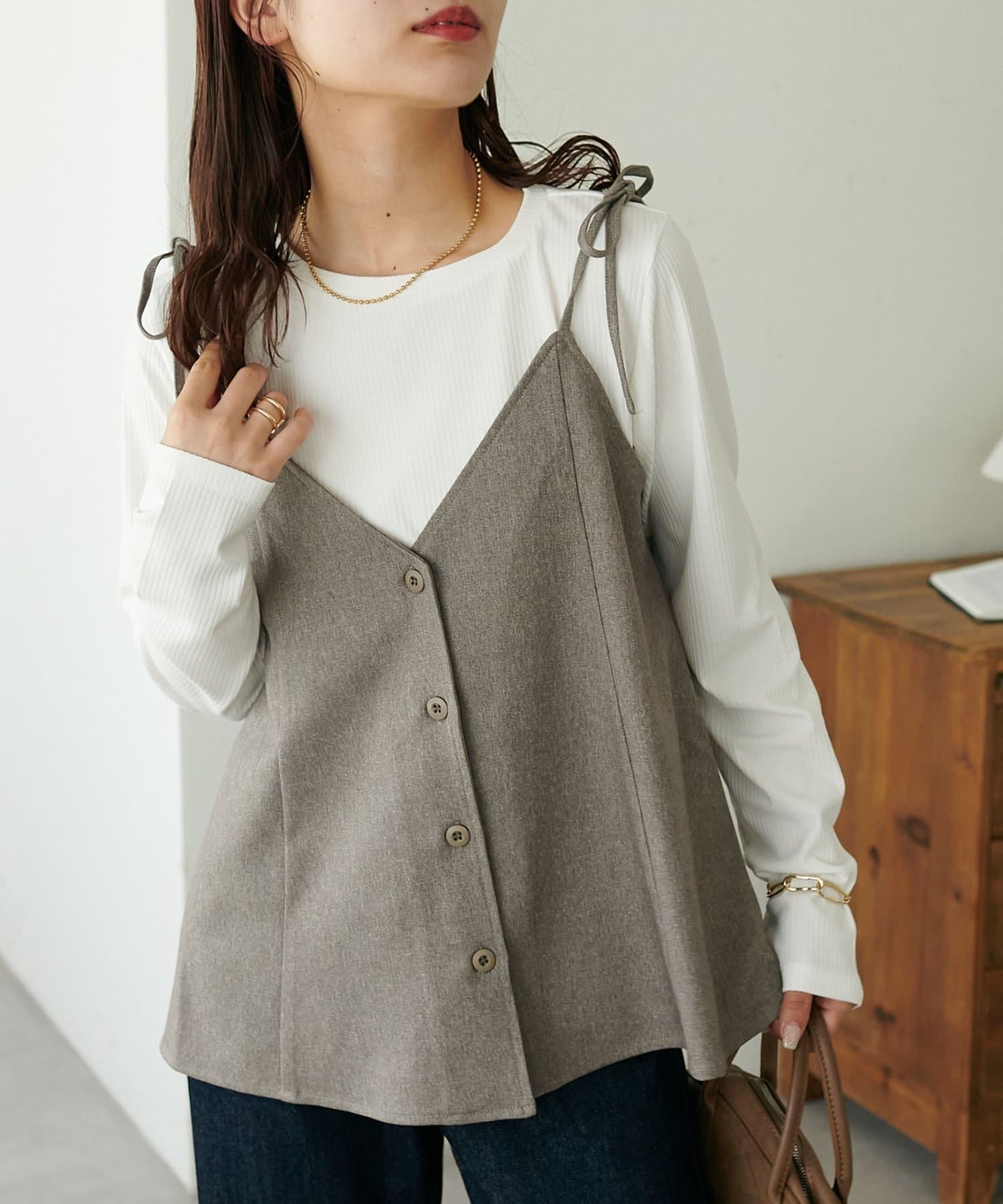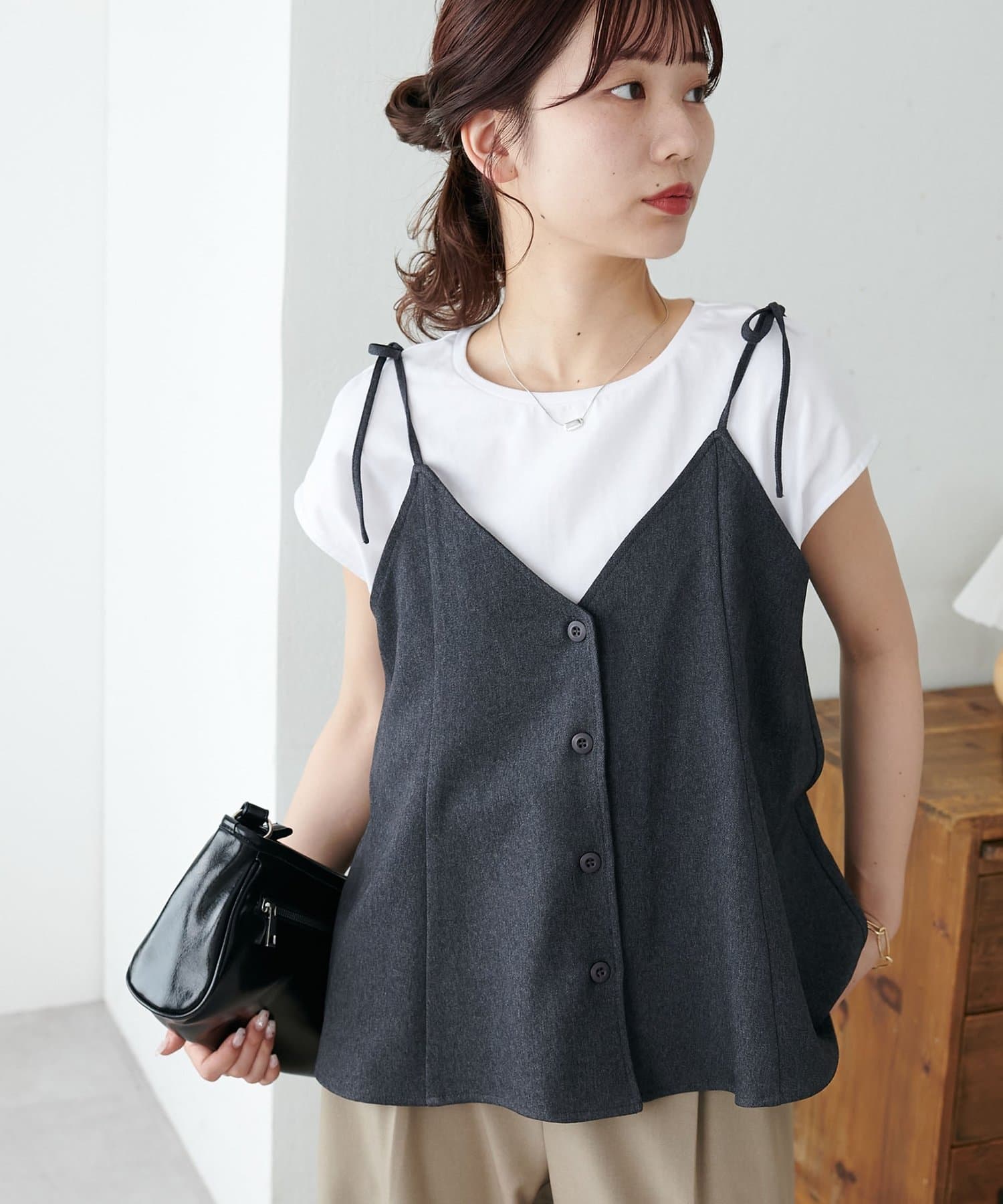 Vネックにフロントボタン、そしてリボン結びできる肩紐がポイントのビスチェは、レイヤードのアクセントに最適。