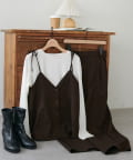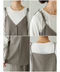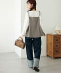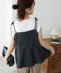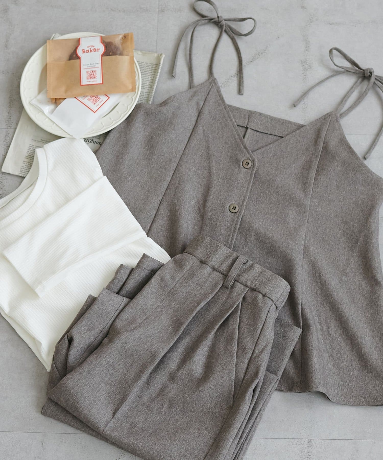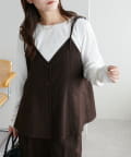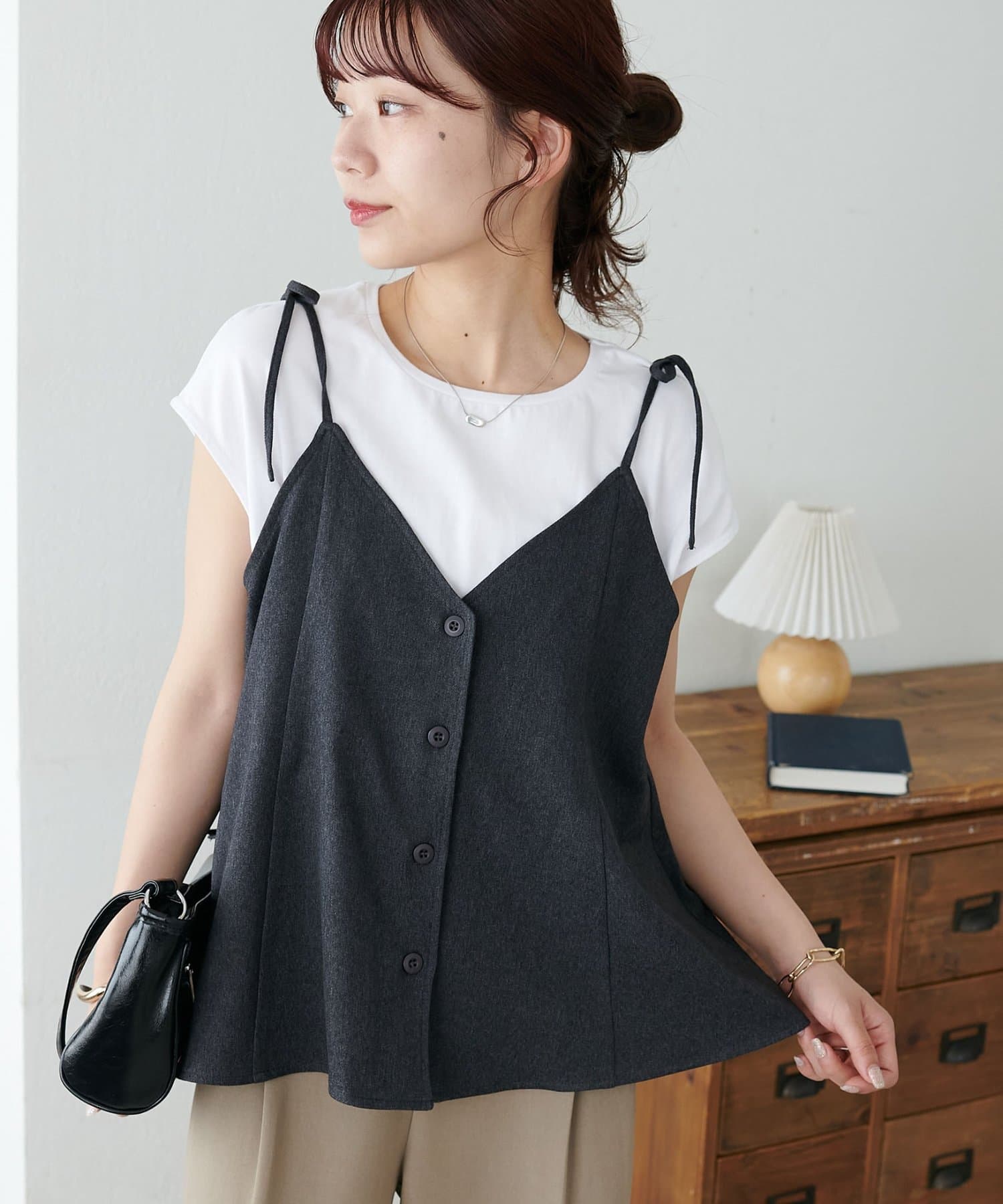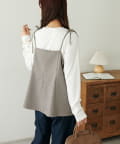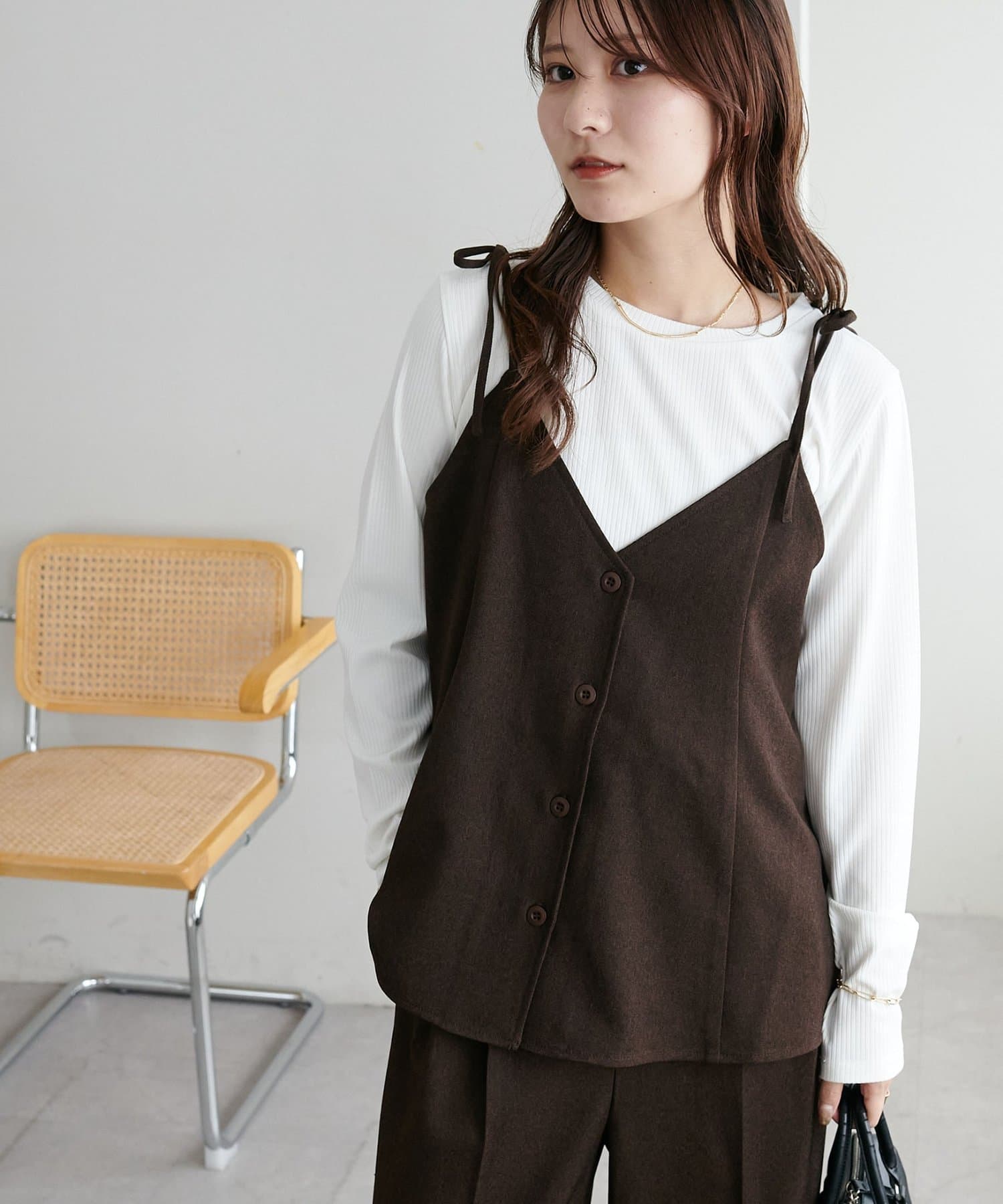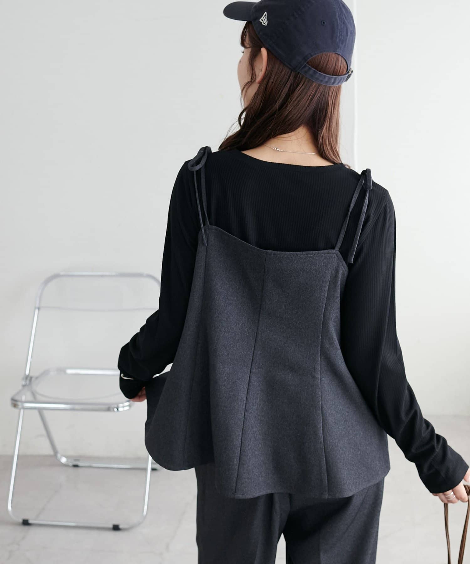 Vネックにフロントボタン、そしてリボン結びできる肩紐がポイントのビスチェは、レイヤードのアクセントに最適。