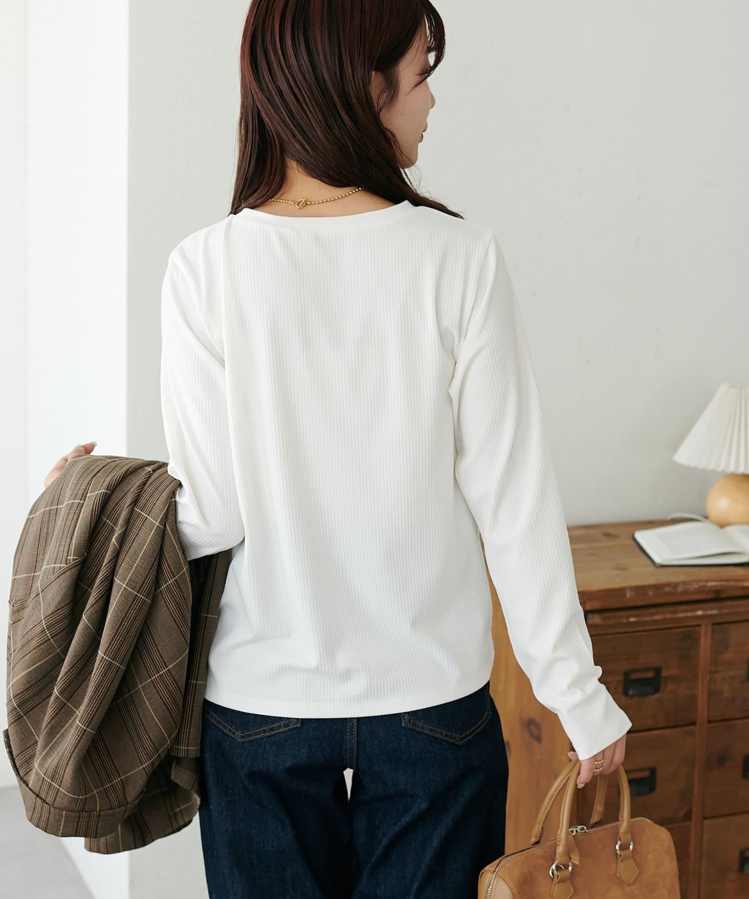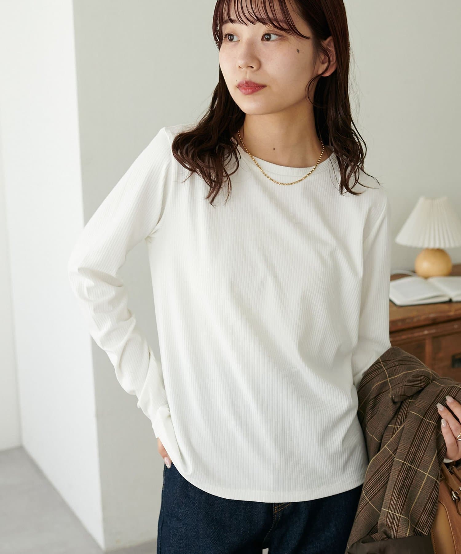 柔らかく伸びの良いリブ素材で仕上げたロンTは、肌当たりが優しく、ストレスフリーな着用感。