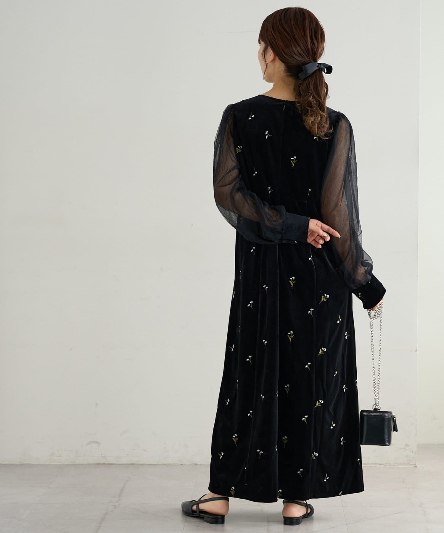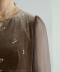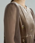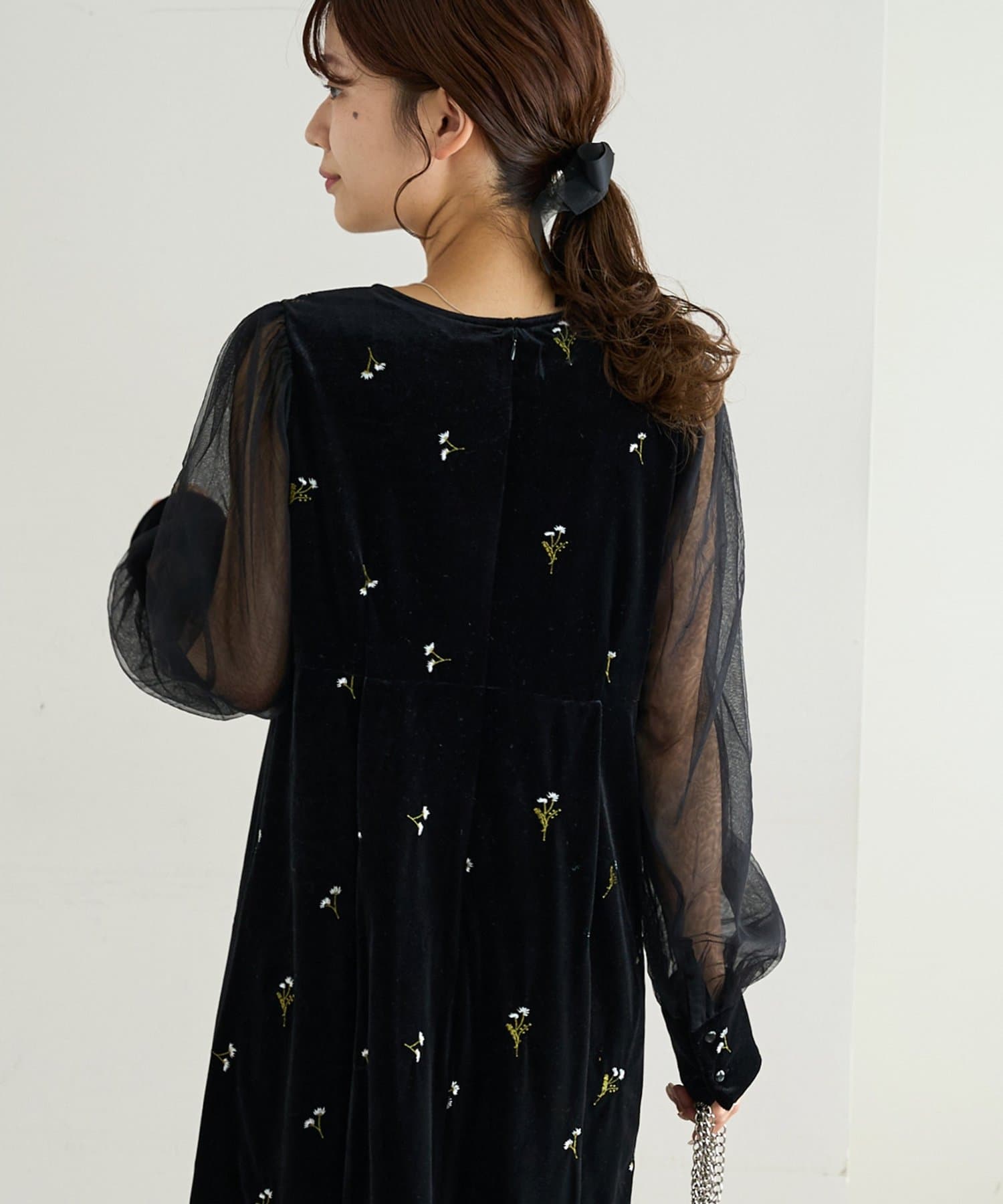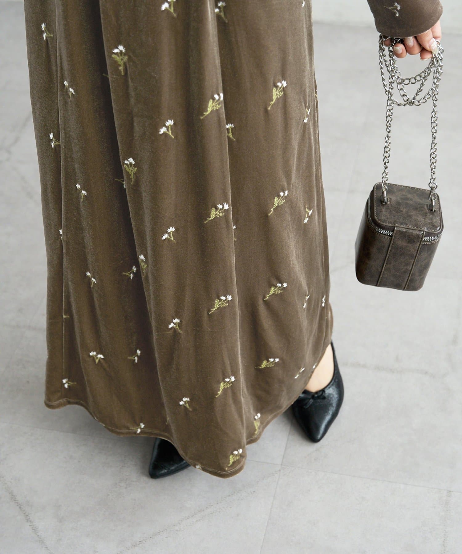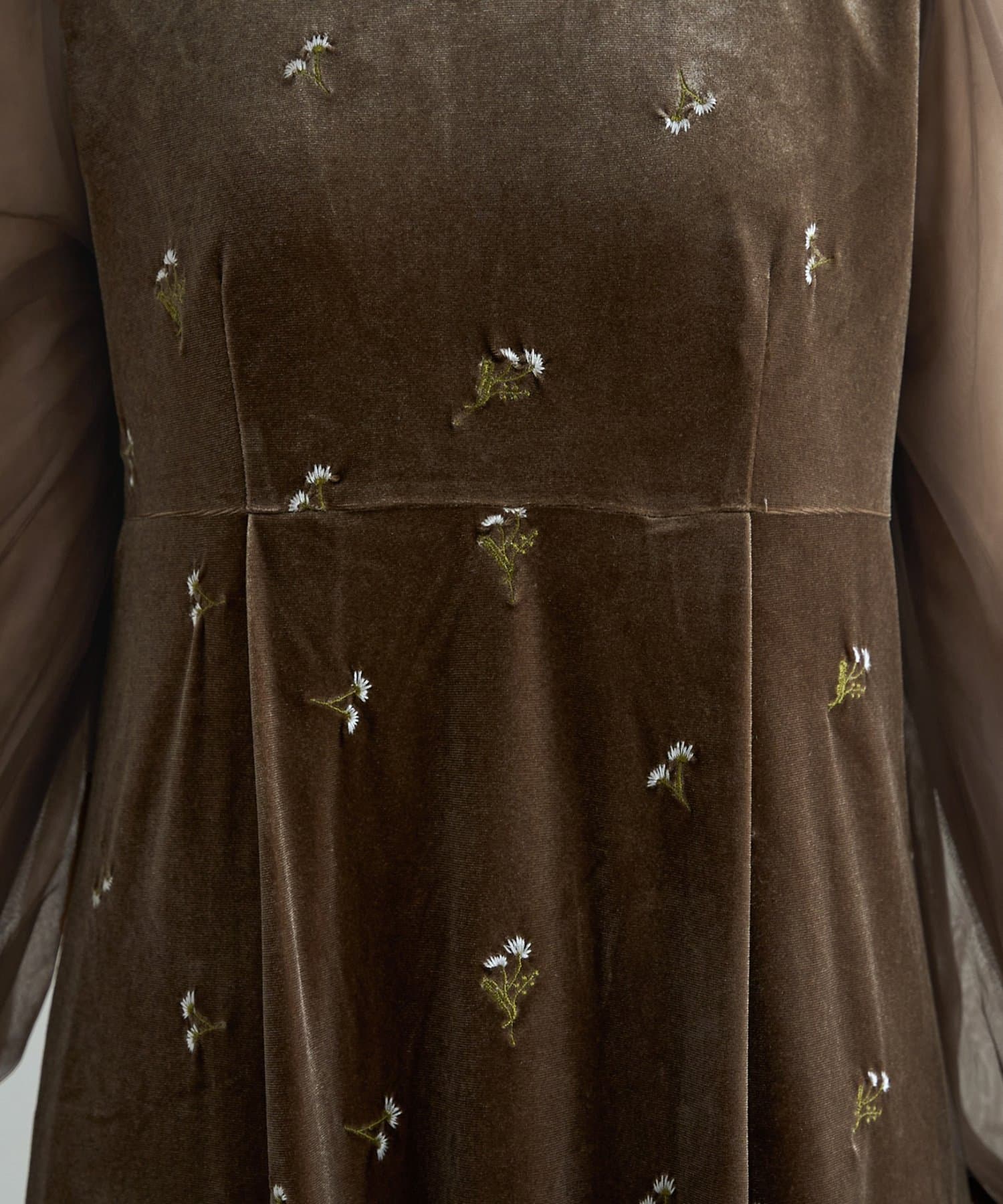 光沢感のあるベロア素材に小花柄の刺繍を施した上品な一着。