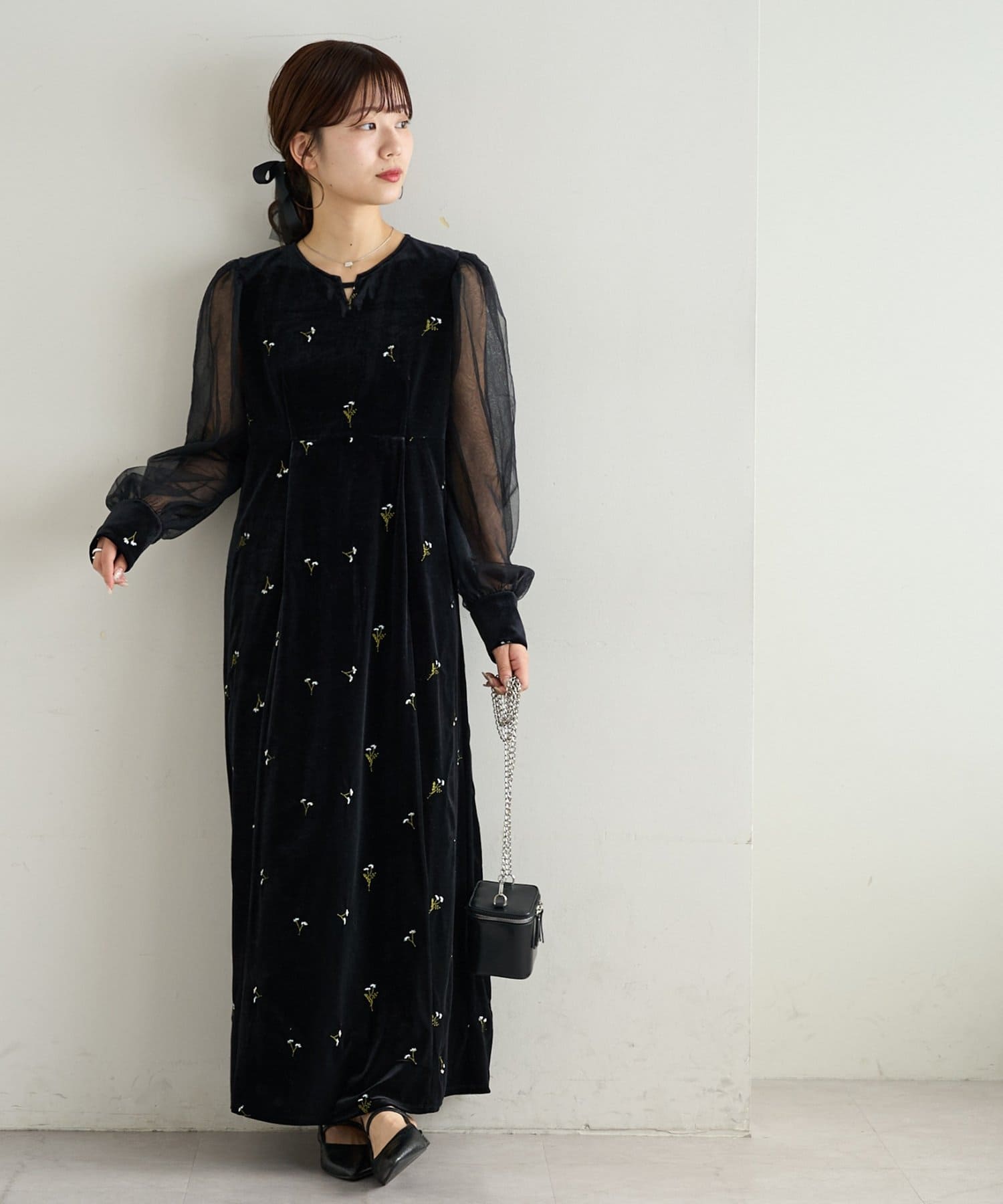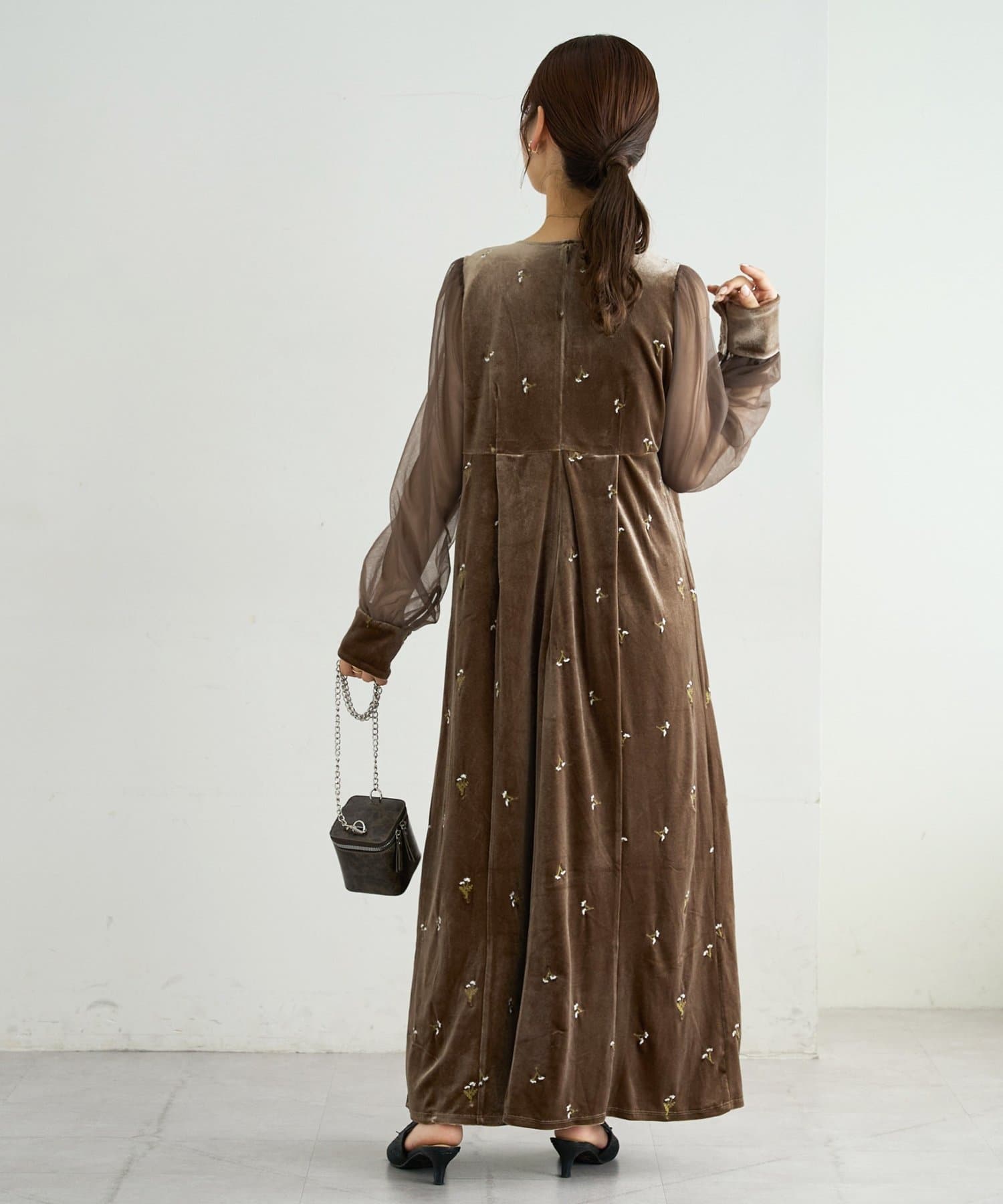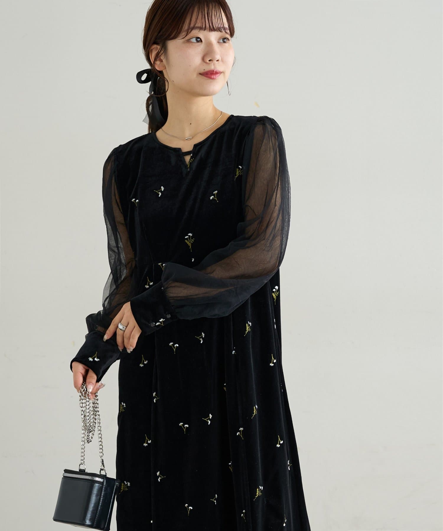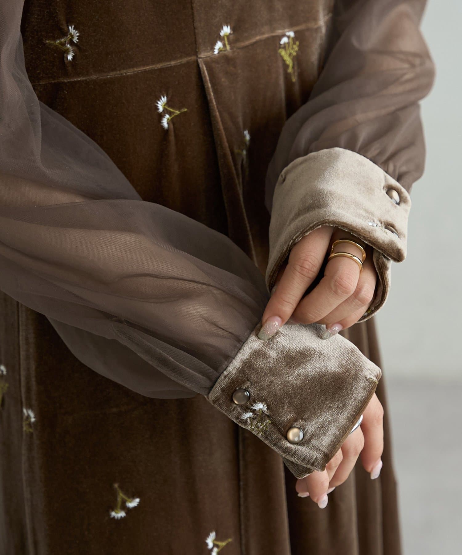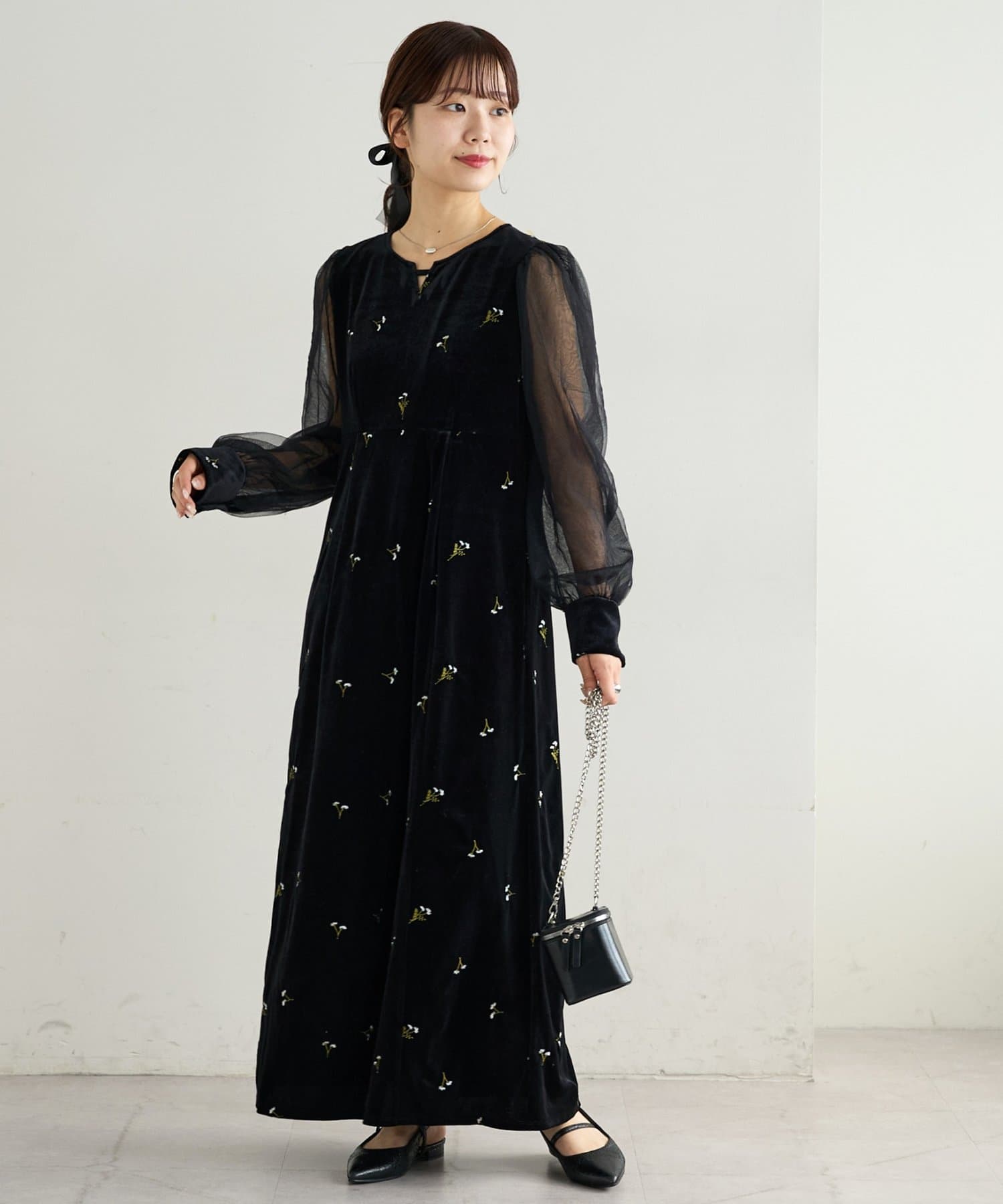 光沢感のあるベロア素材に小花柄の刺繍を施した上品な一着。