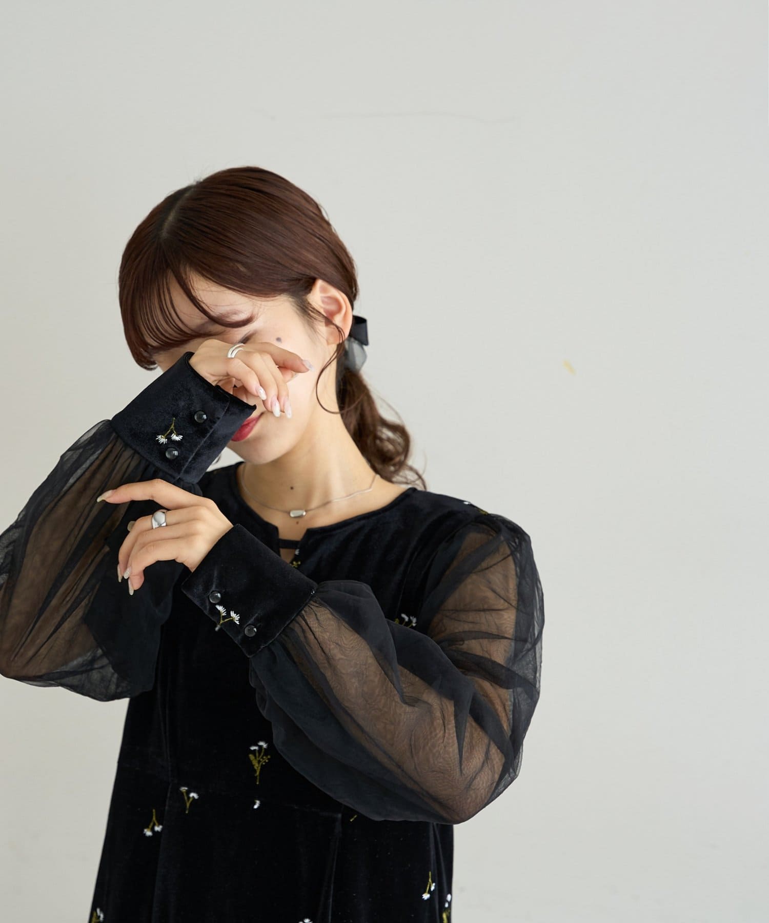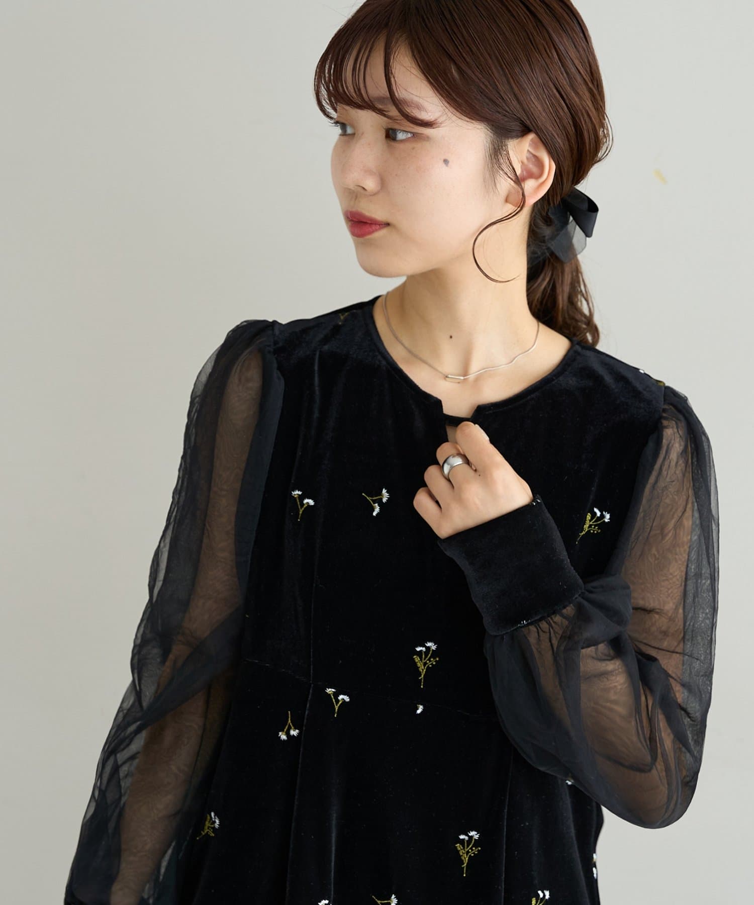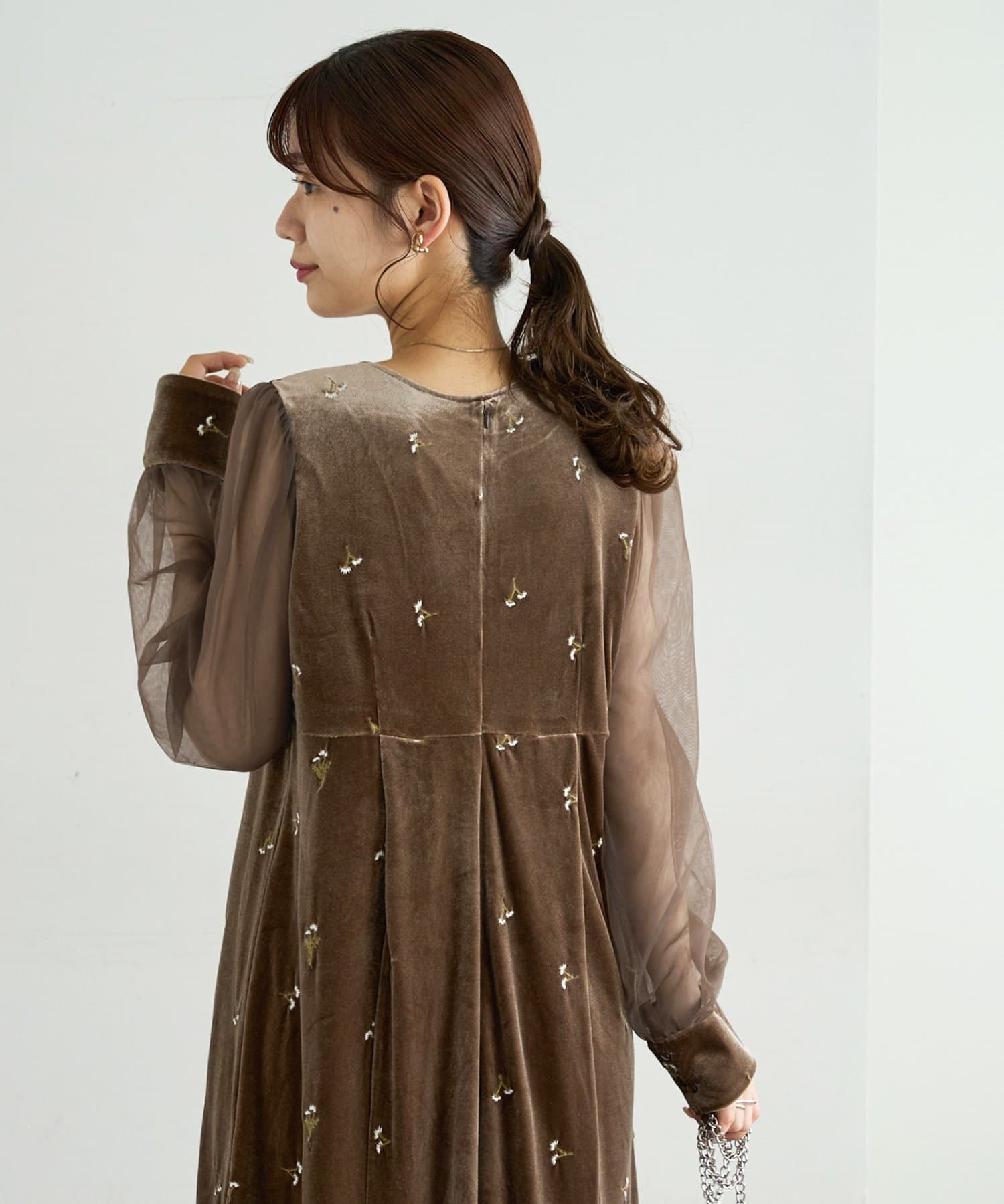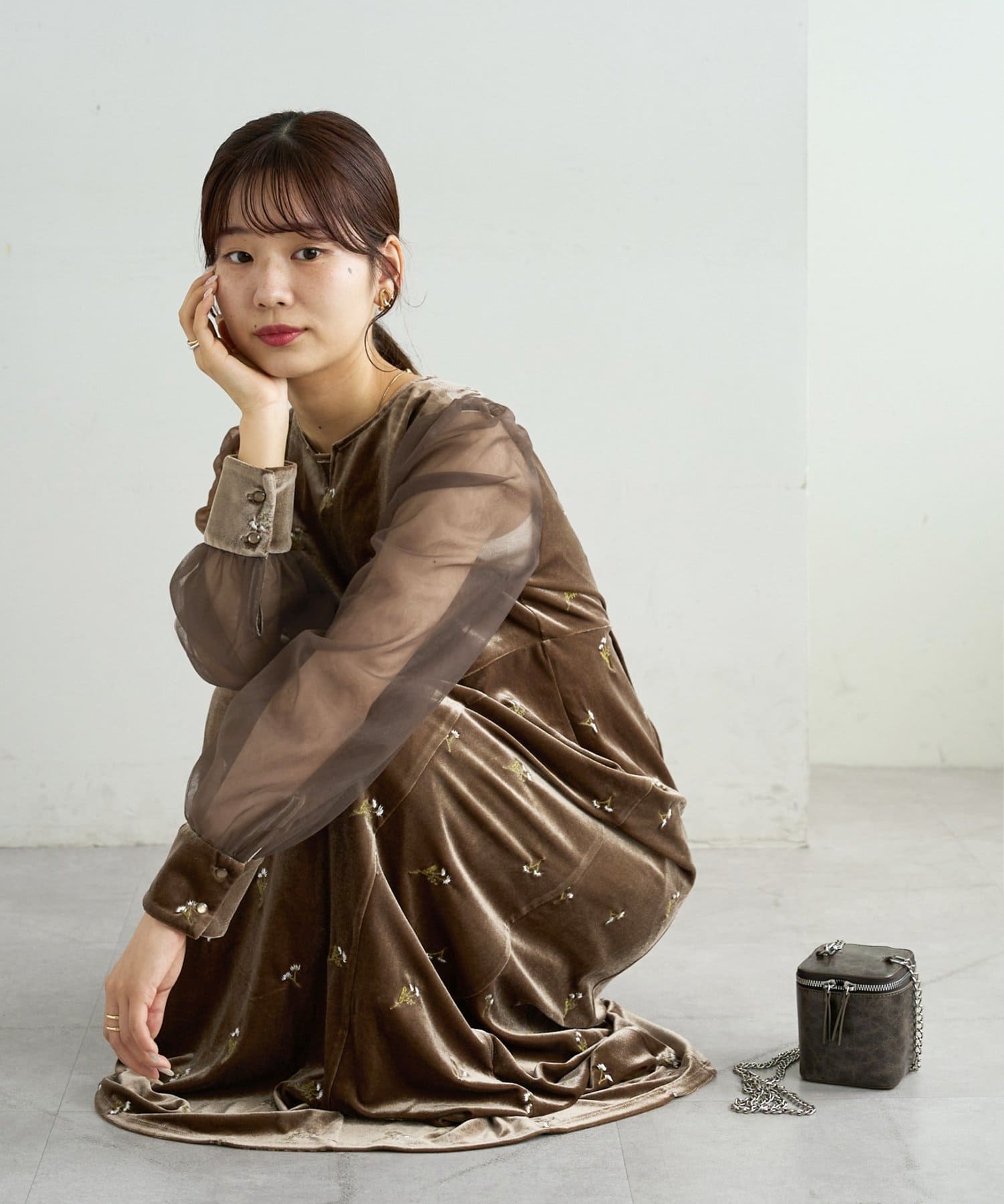 光沢感のあるベロア素材に小花柄の刺繍を施した上品な一着。