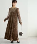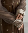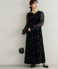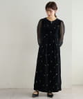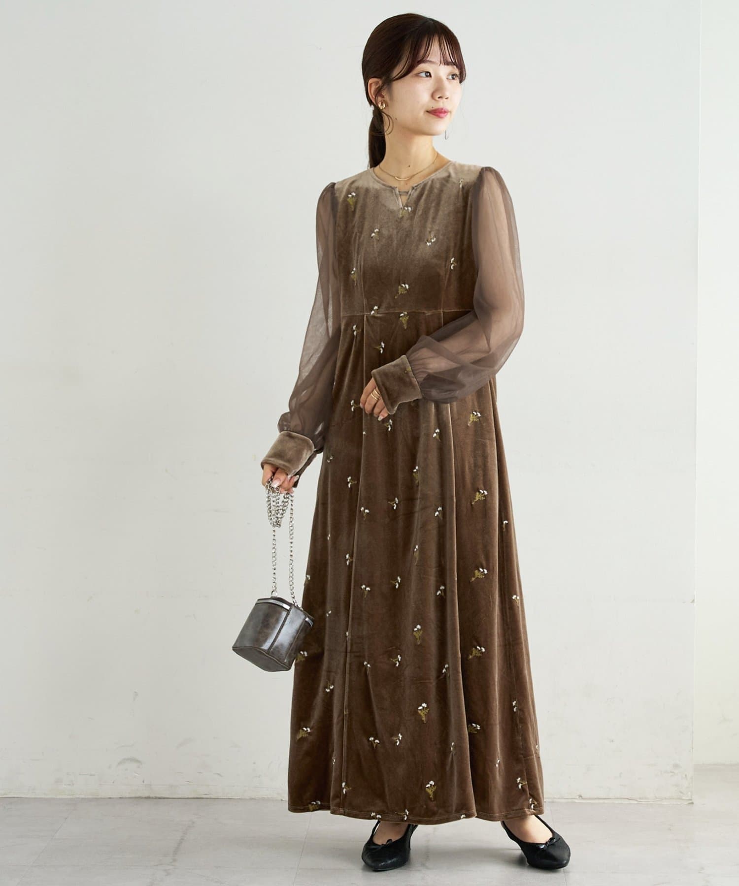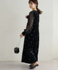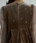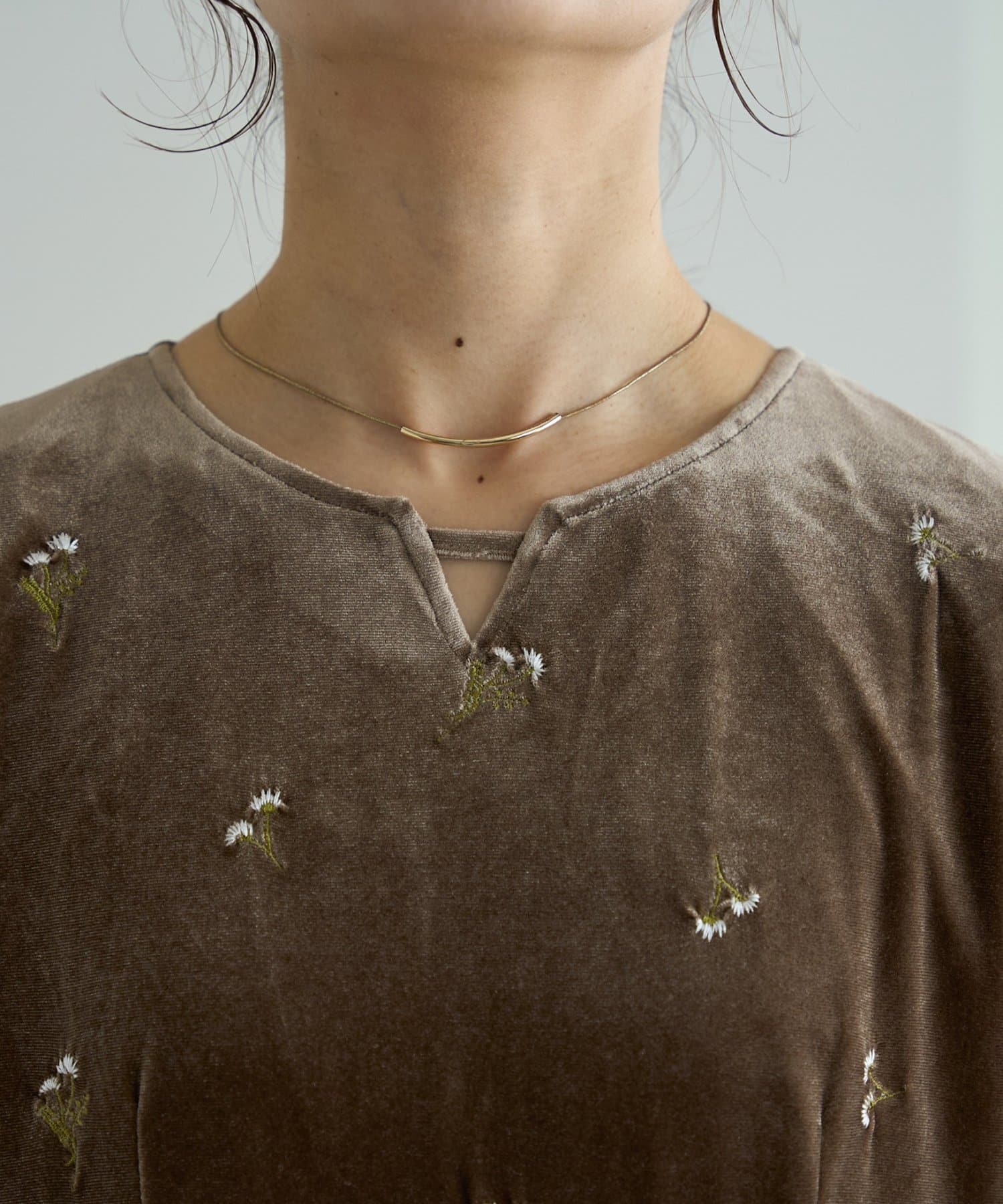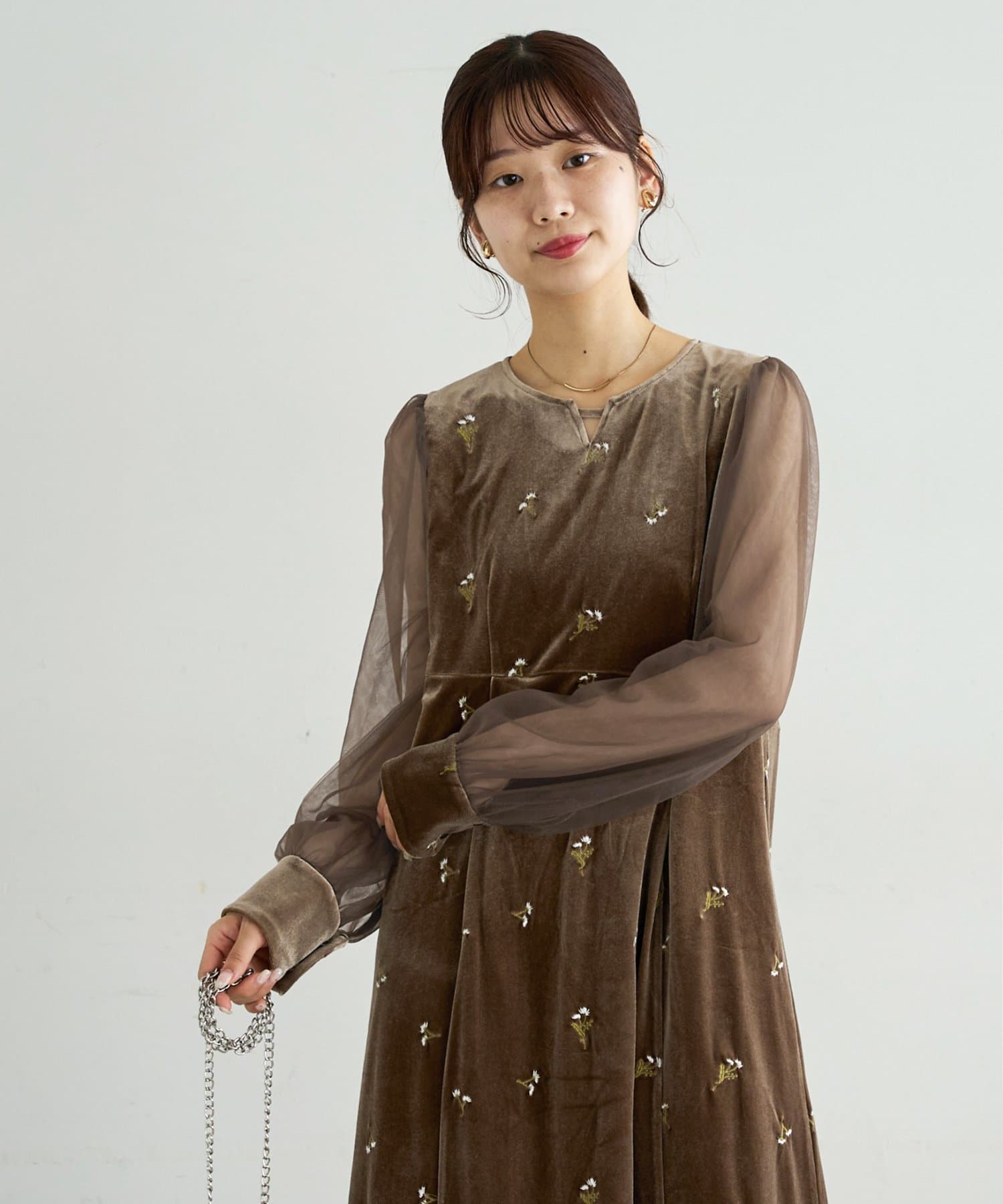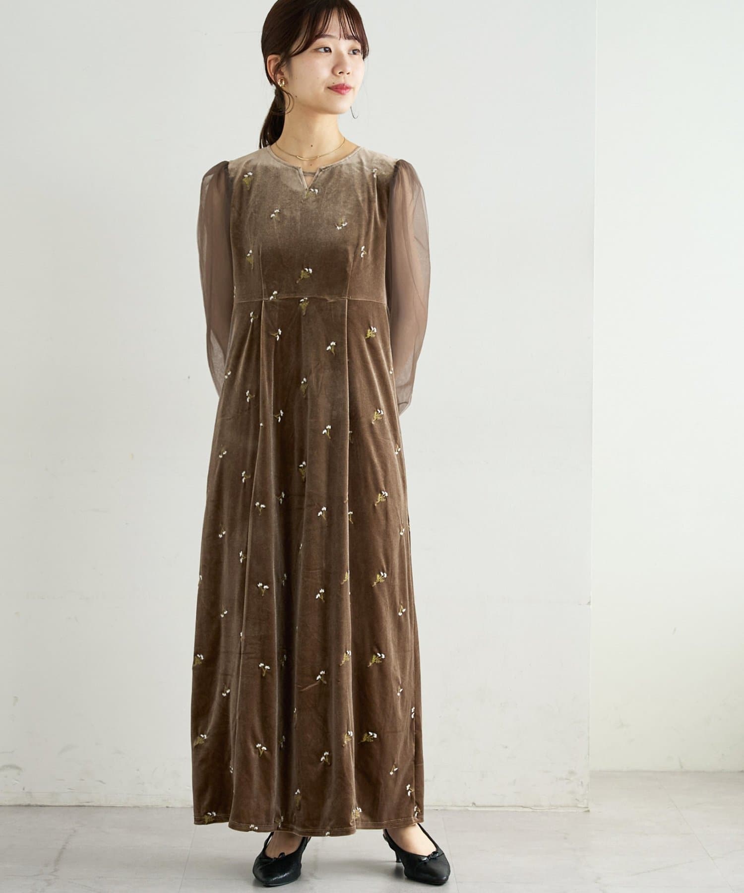 光沢感のあるベロア素材に小花柄の刺繍を施した上品な一着。