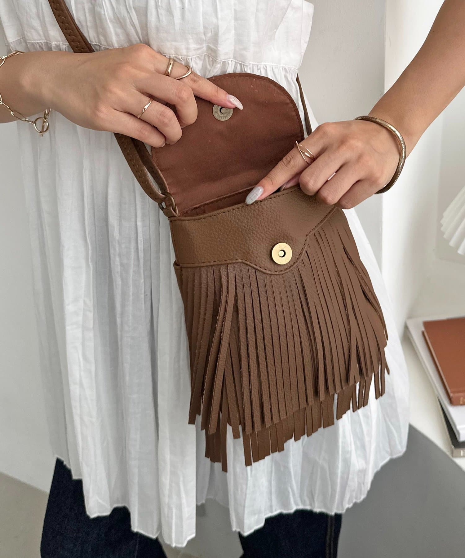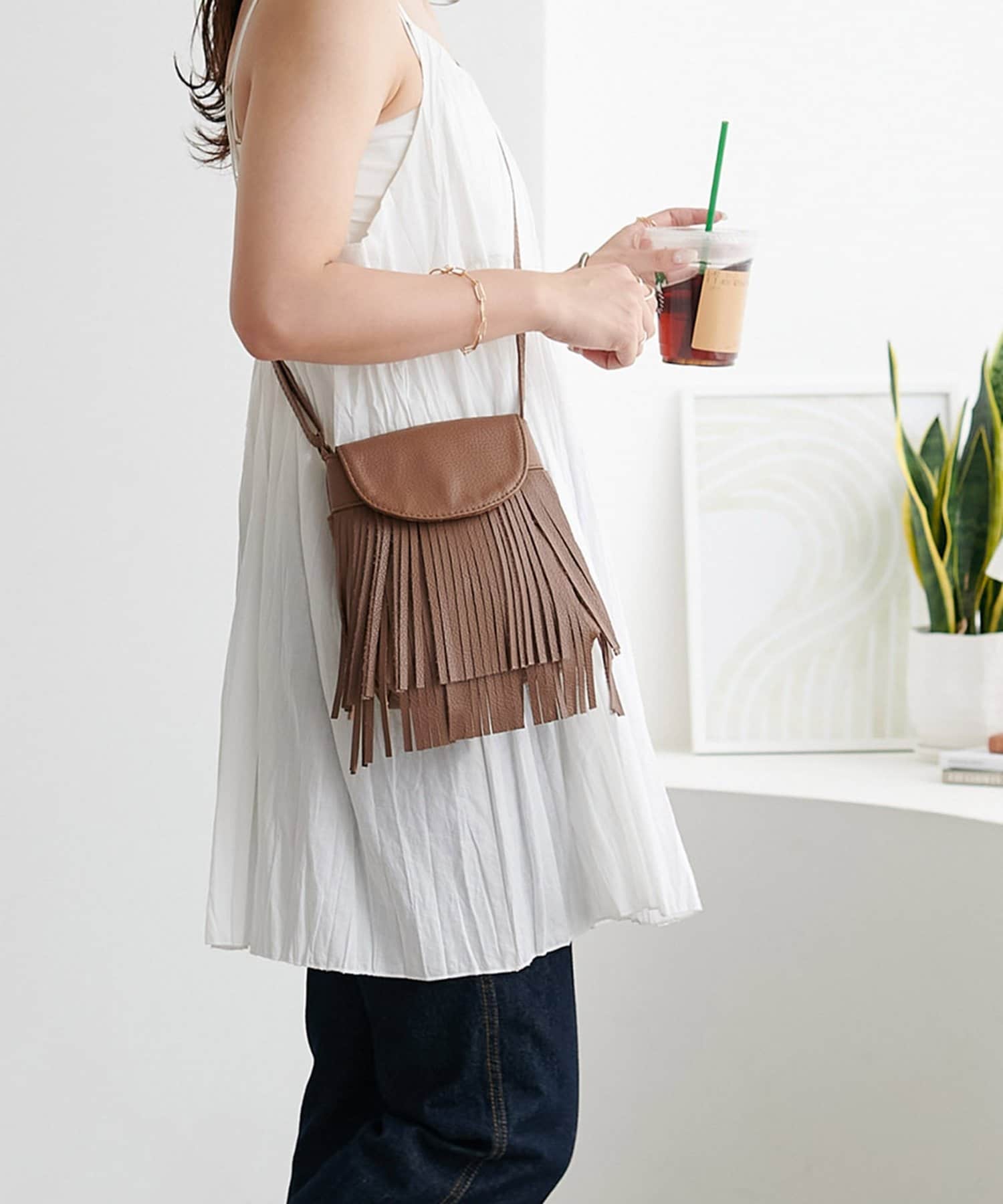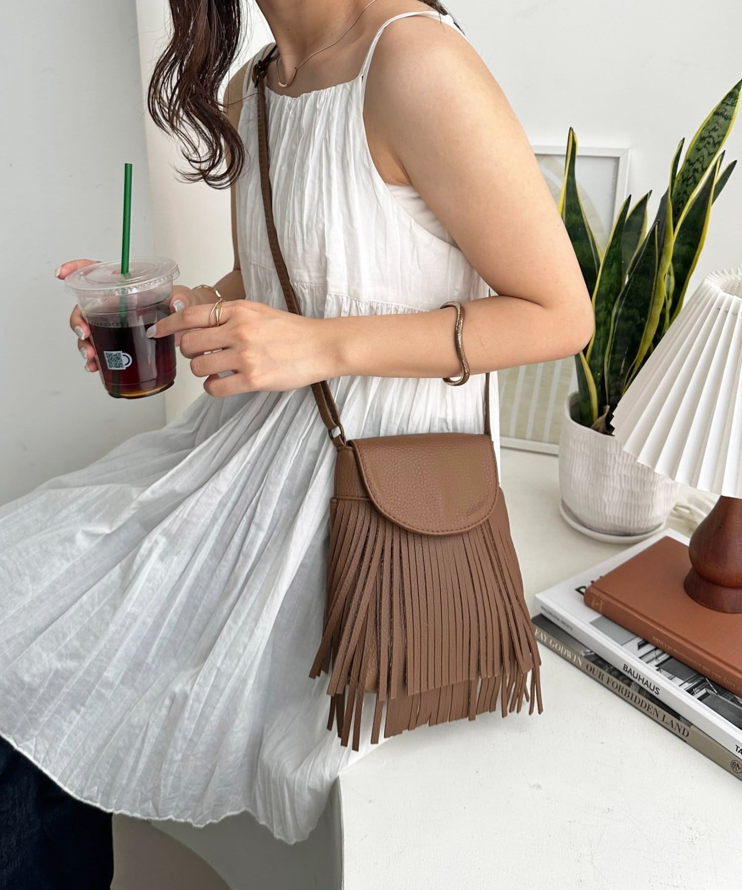 コーデのアクセントになる、存在感たっぷりのフリンジデザインが魅力のミニポシェット。動くたびに揺れるフリンジが抜け感を演出し、コーデにトレンド感をプラスしてくれます♪携帯や、財布など必要最低限の荷物が収まるコンパクトサイズで、身軽に過ごしたい日にもぴったり◎ショルダー紐の長さを調節して斜め掛けもでき、両手が空くのも嬉しいポイントです。