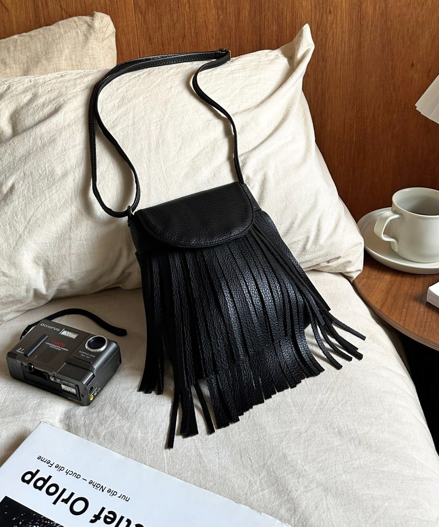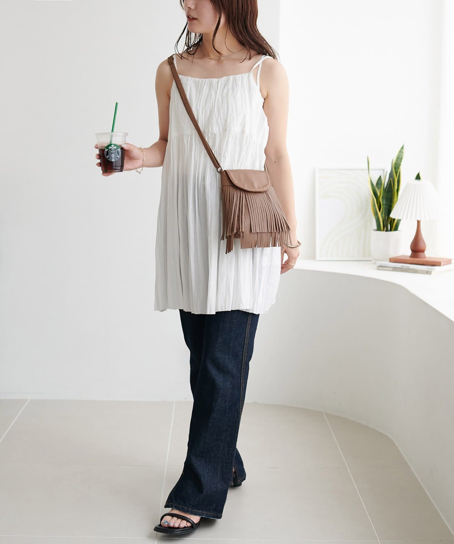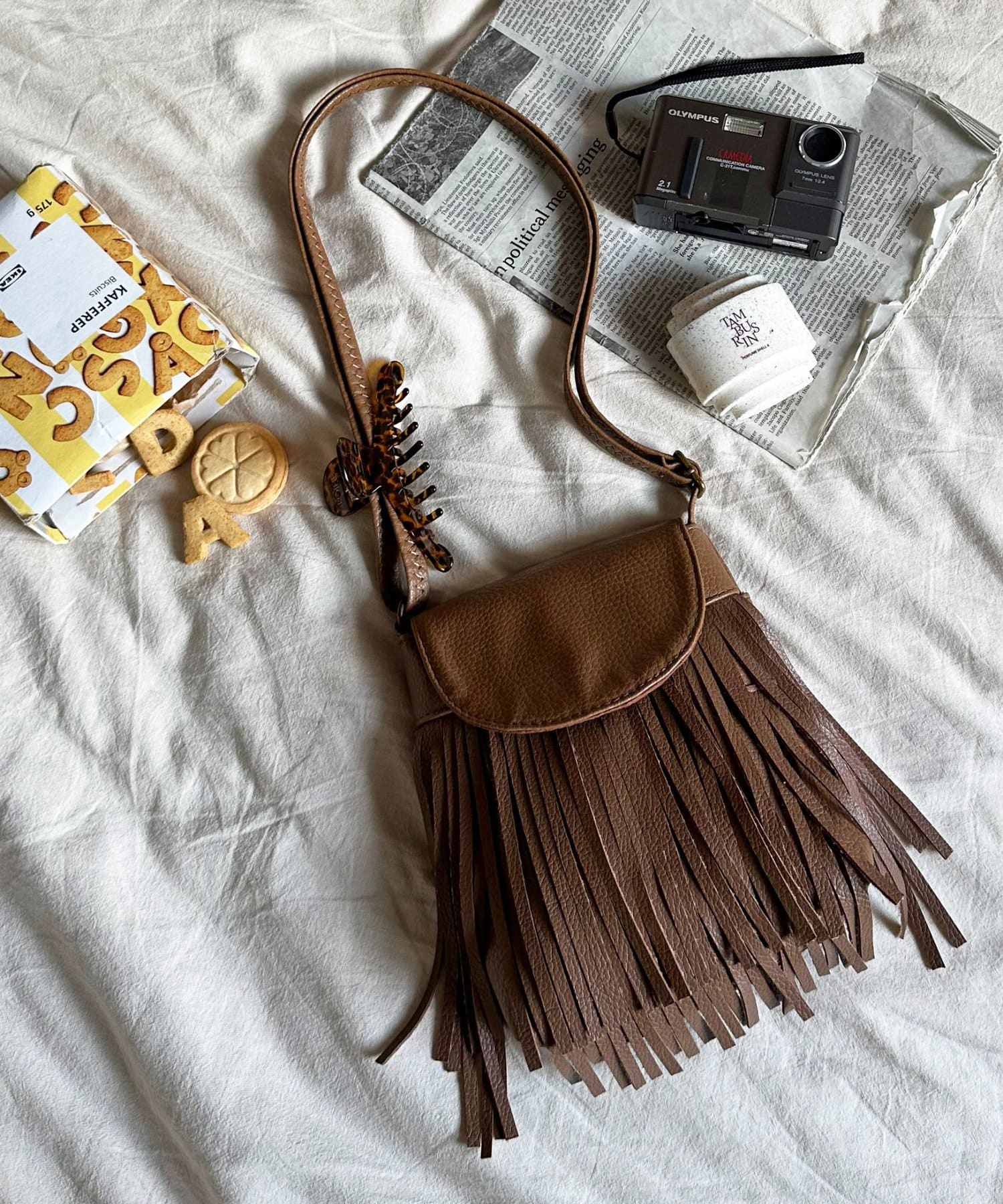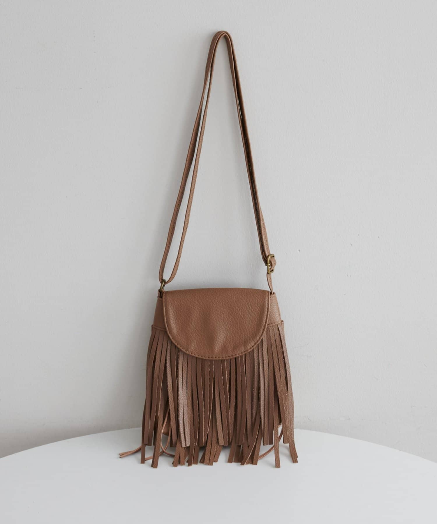 コーデのアクセントになる、存在感たっぷりのフリンジデザインが魅力のミニポシェット。動くたびに揺れるフリンジが抜け感を演出し、コーデにトレンド感をプラスしてくれます♪携帯や、財布など必要最低限の荷物が収まるコンパクトサイズで、身軽に過ごしたい日にもぴったり◎ショルダー紐の長さを調節して斜め掛けもでき、両手が空くのも嬉しいポイントです。