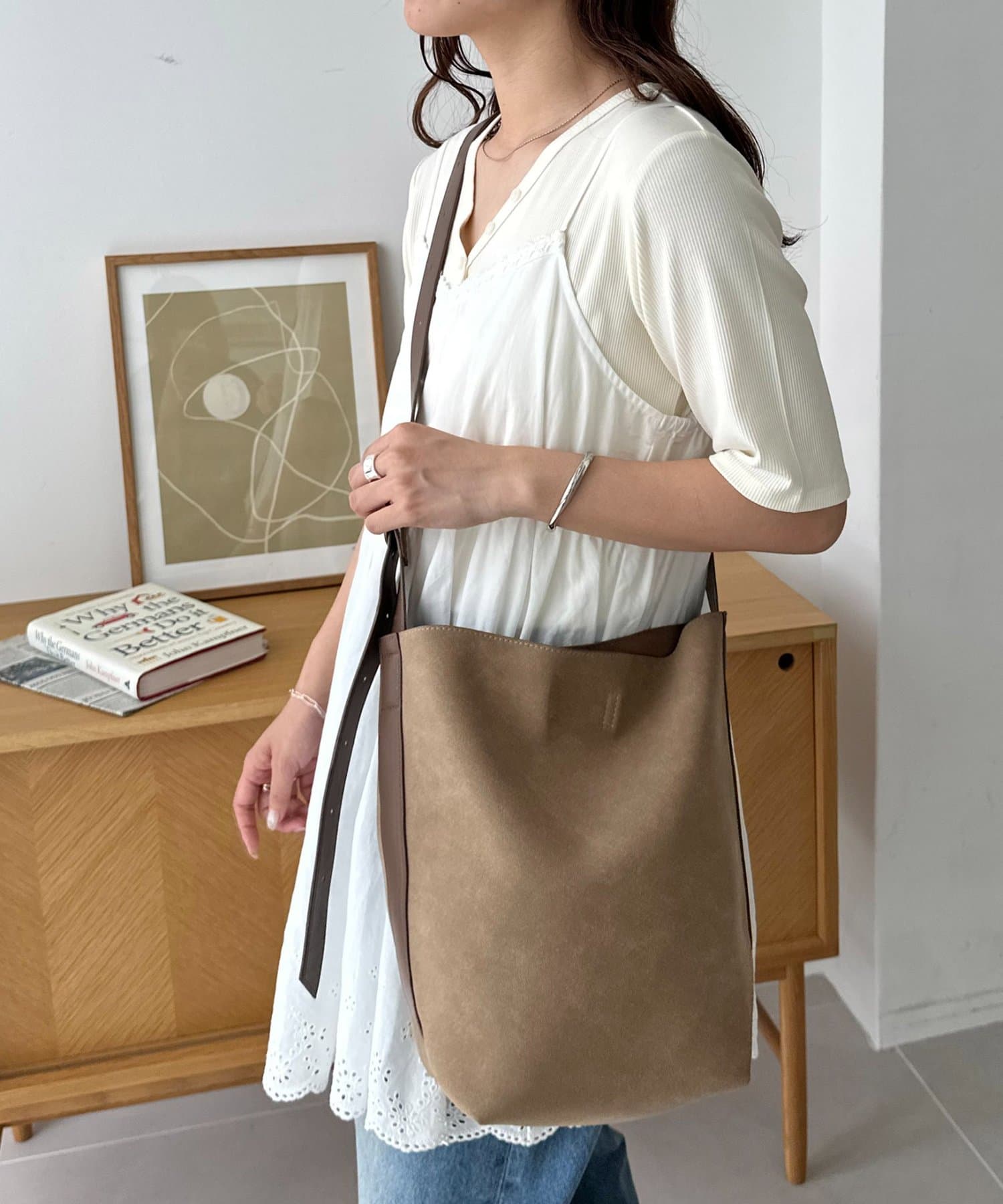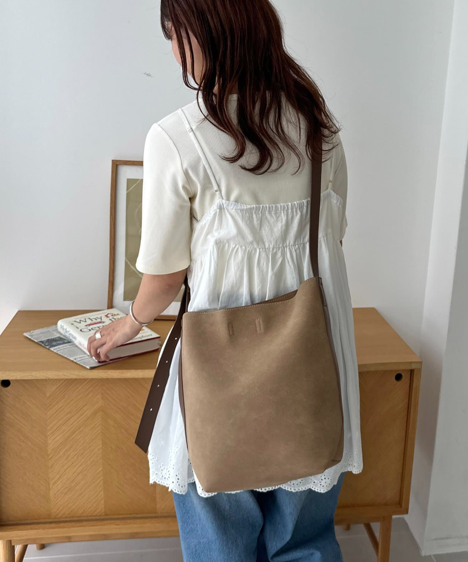 シンプルなデザインながら、手に馴染むような質感と立体的なフォルムでこなれた印象に♩しっかりとしたマチ付きで、見た目以上の収納力も嬉しいポイント◎ショルダー紐は長さ調節が可能なので、肩掛けも斜め掛けもできる2WAY仕様になっています。デイリー使いからお出かけスタイルまで、幅広く活躍する万能アイテムです。