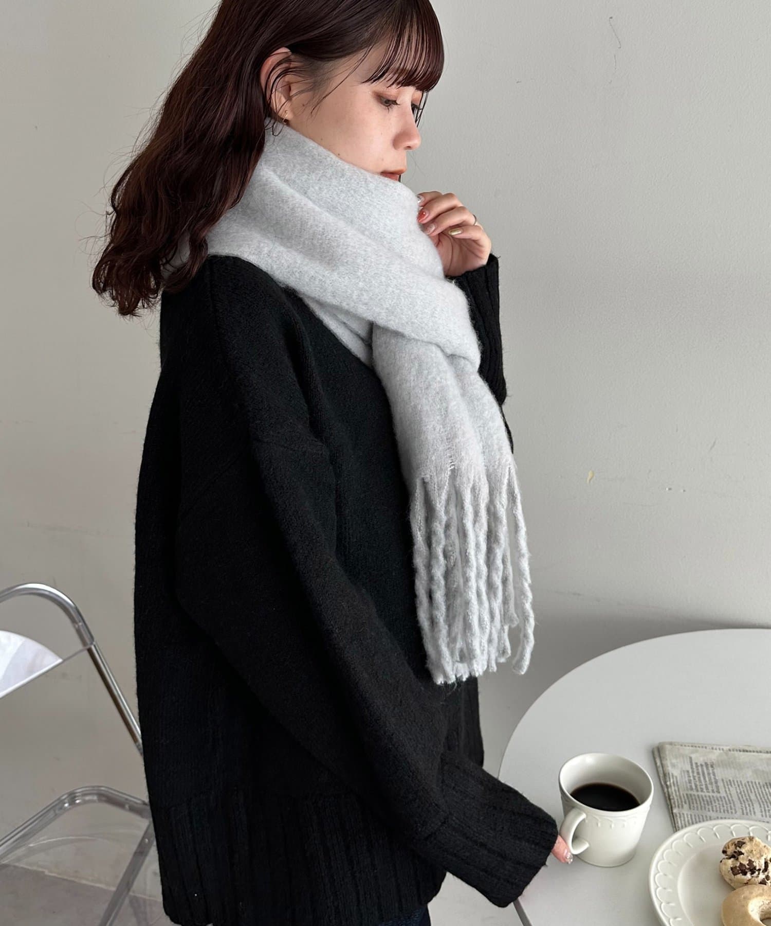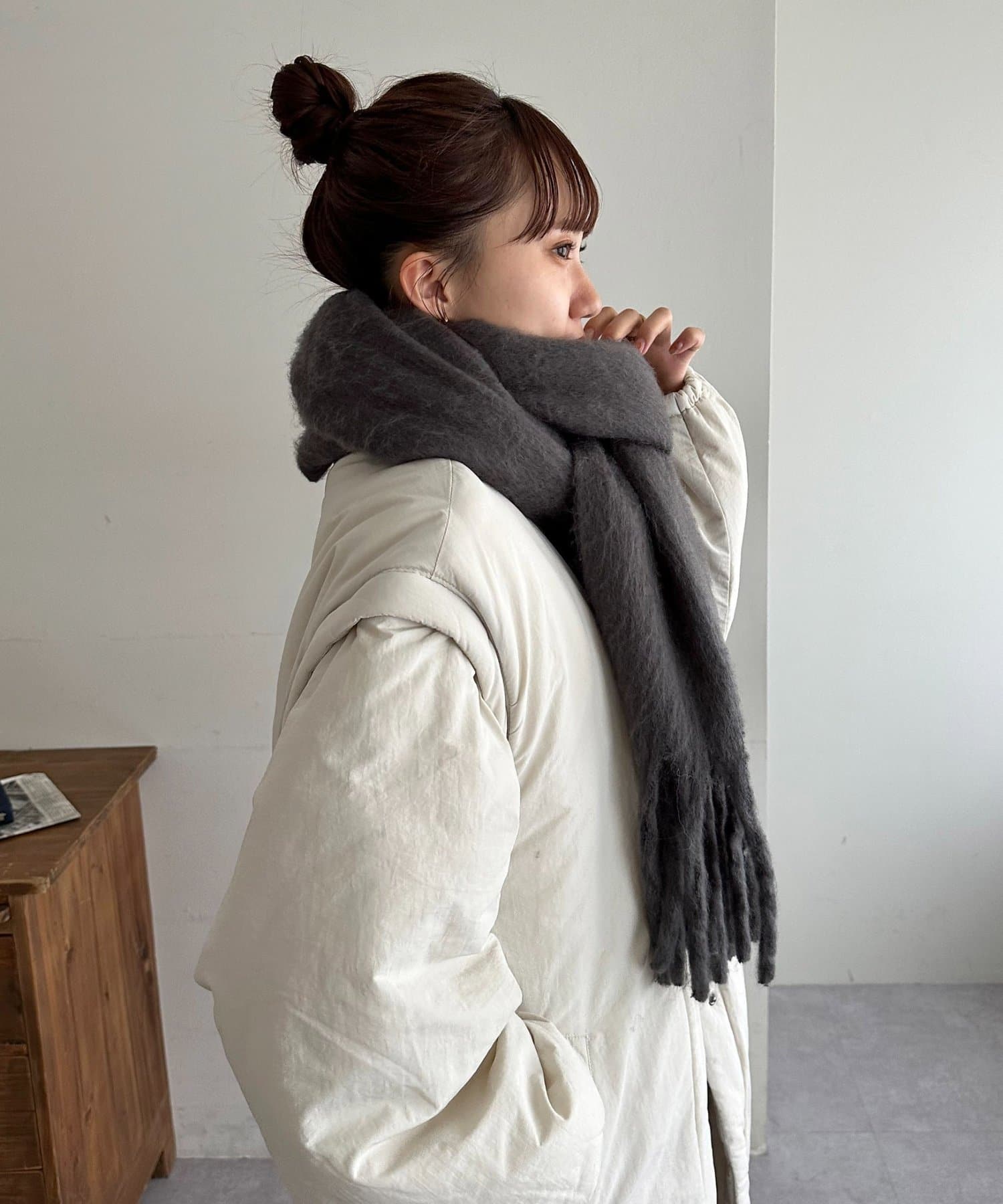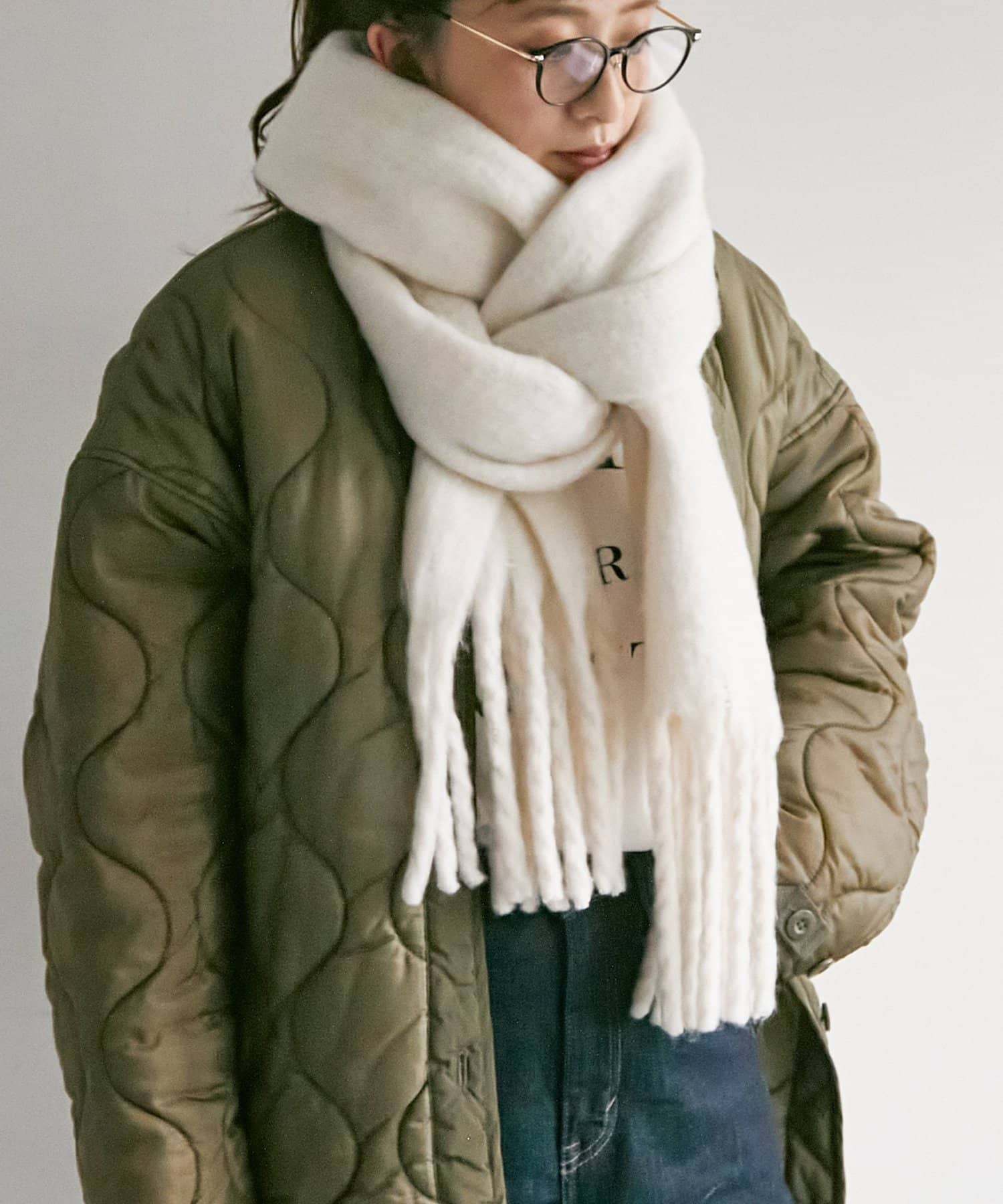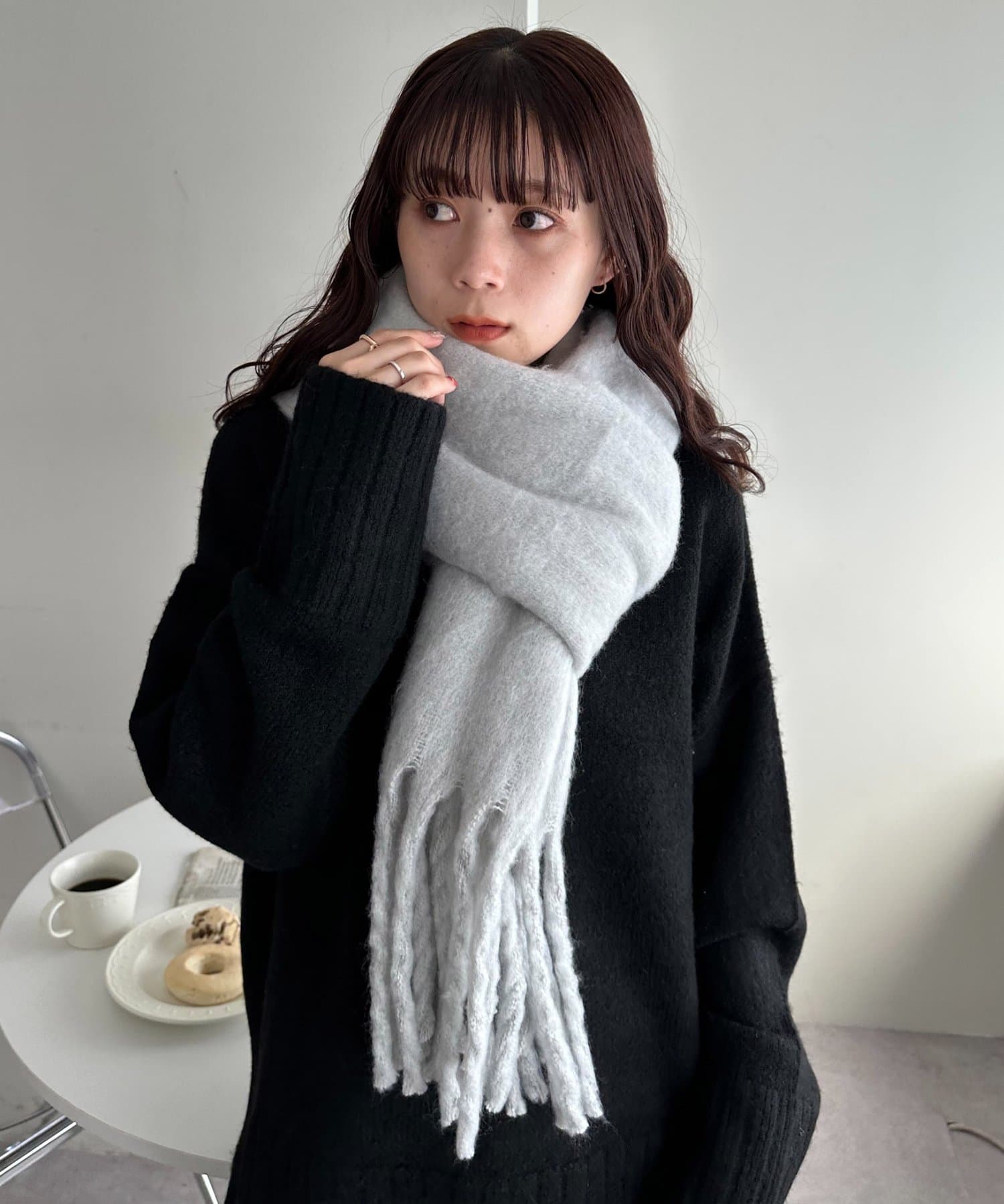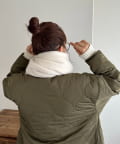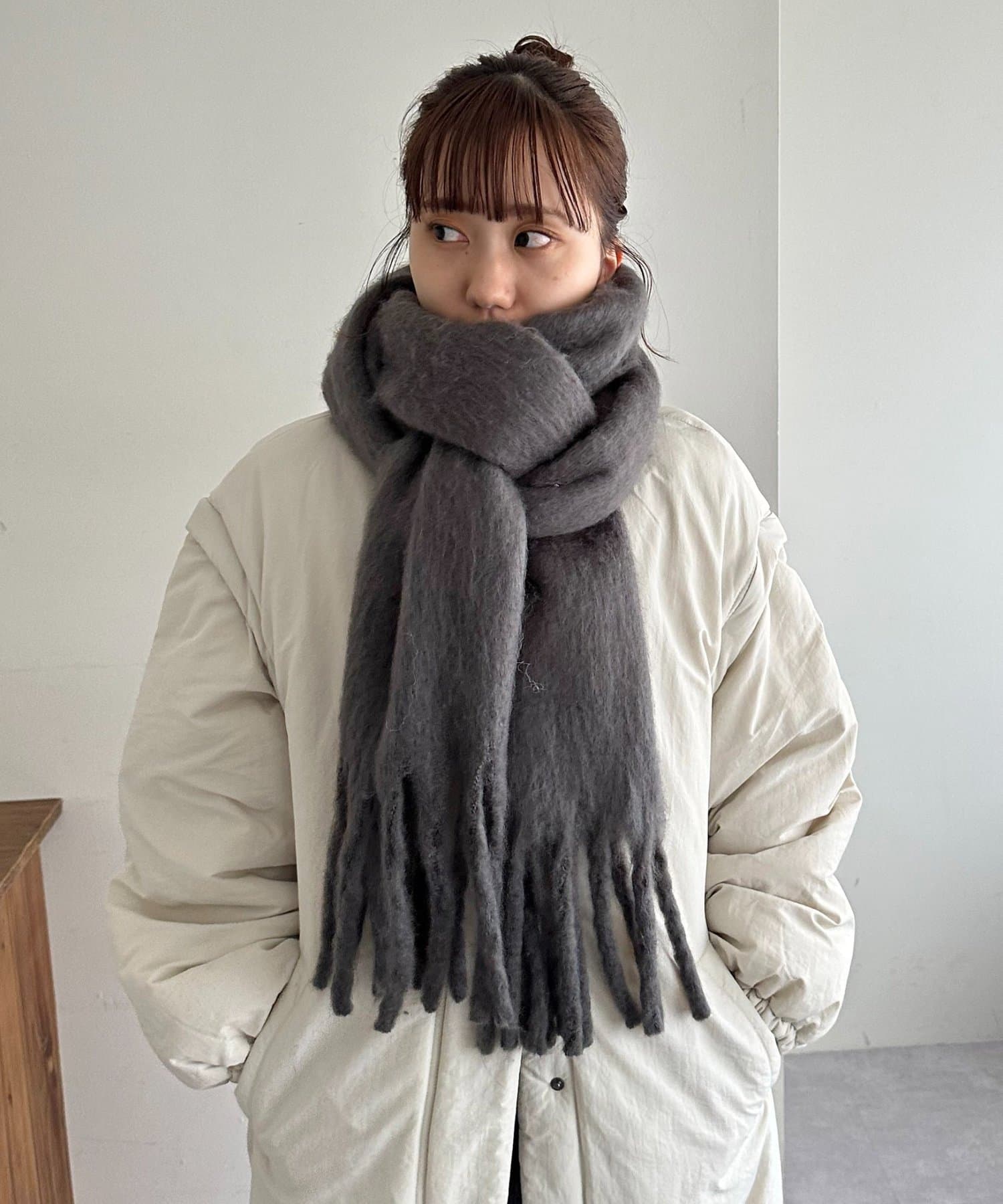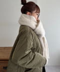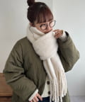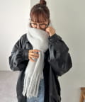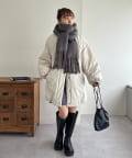 ボリュームたっぷりなマフラーで顔まわりを華やかに。