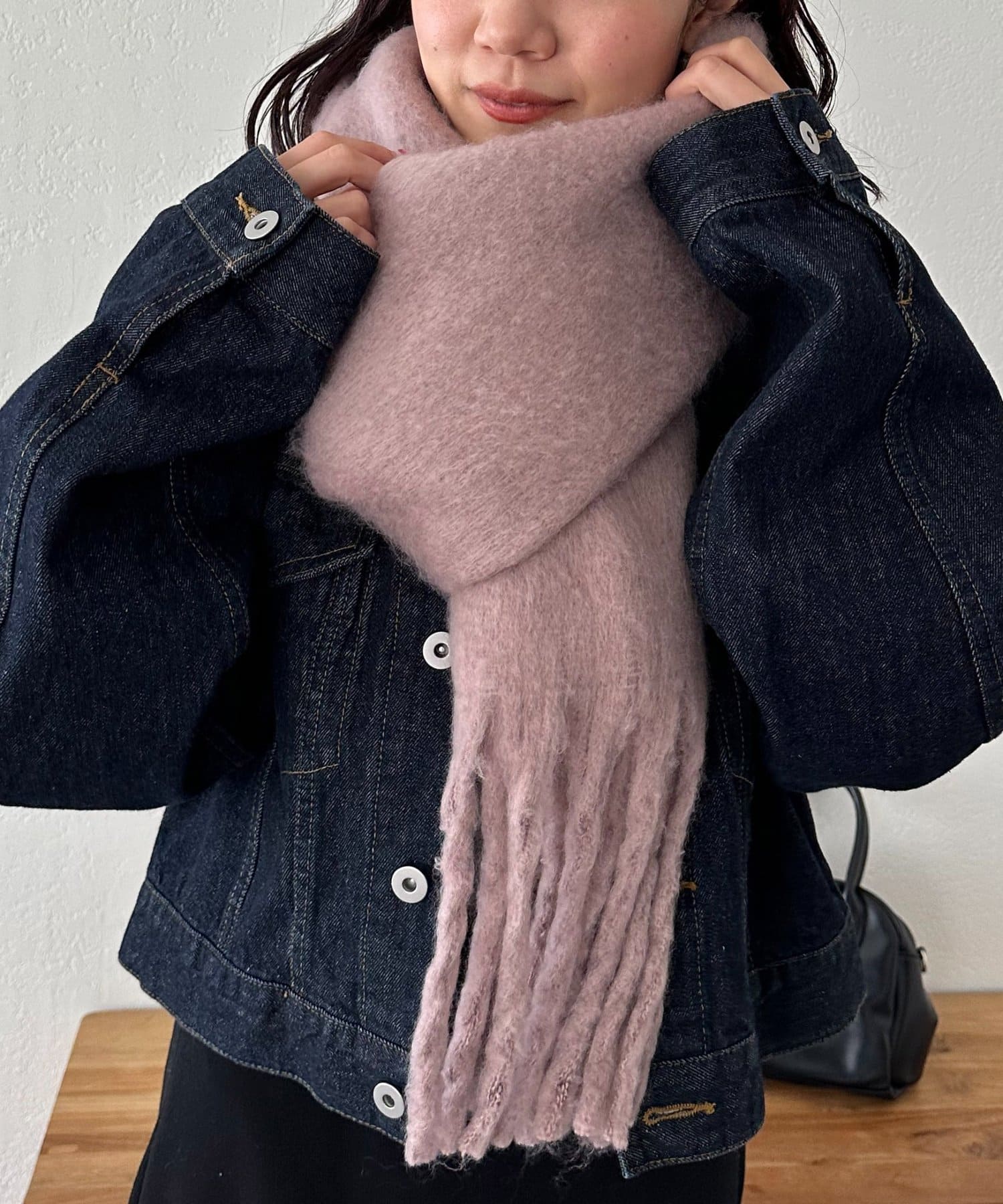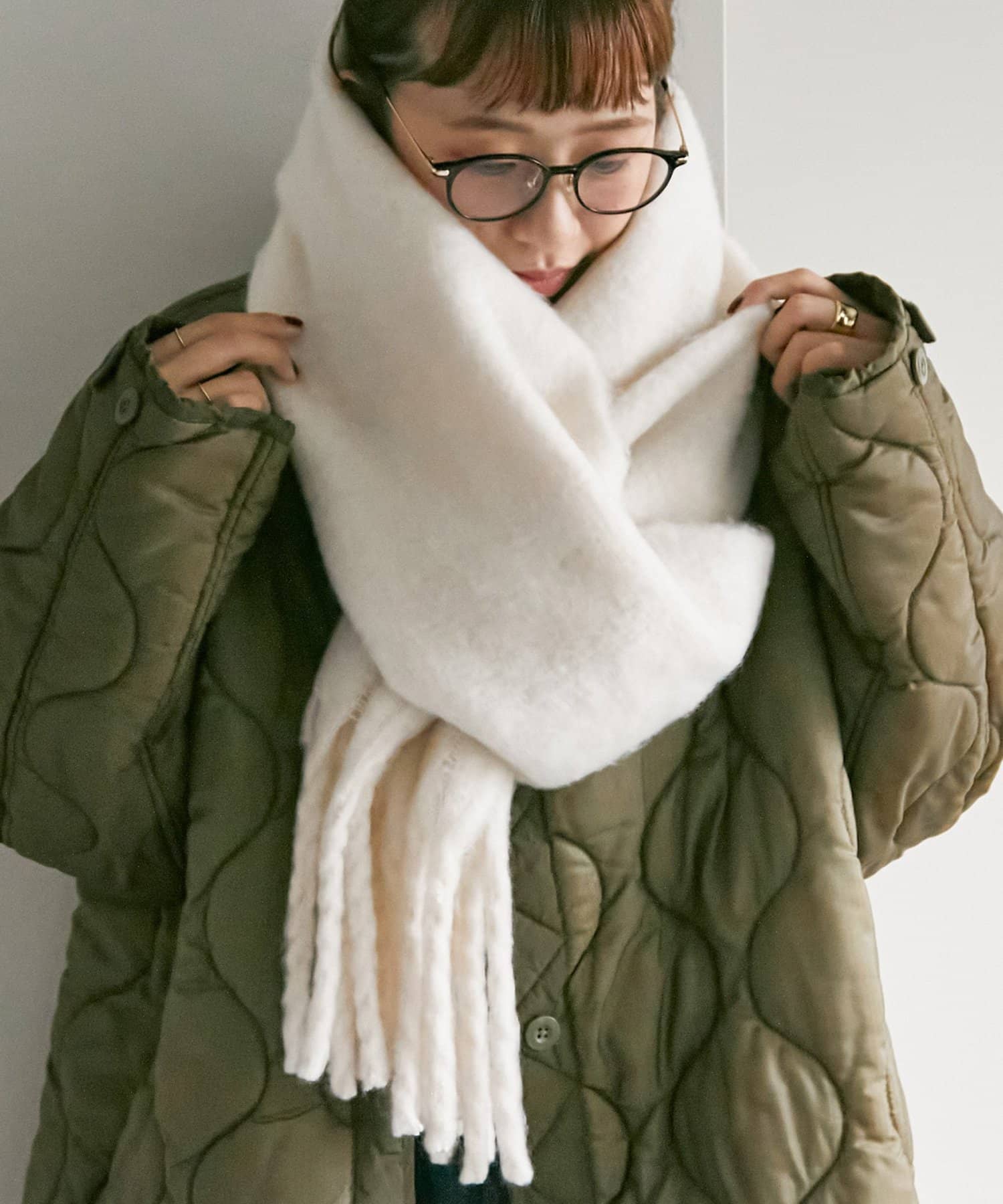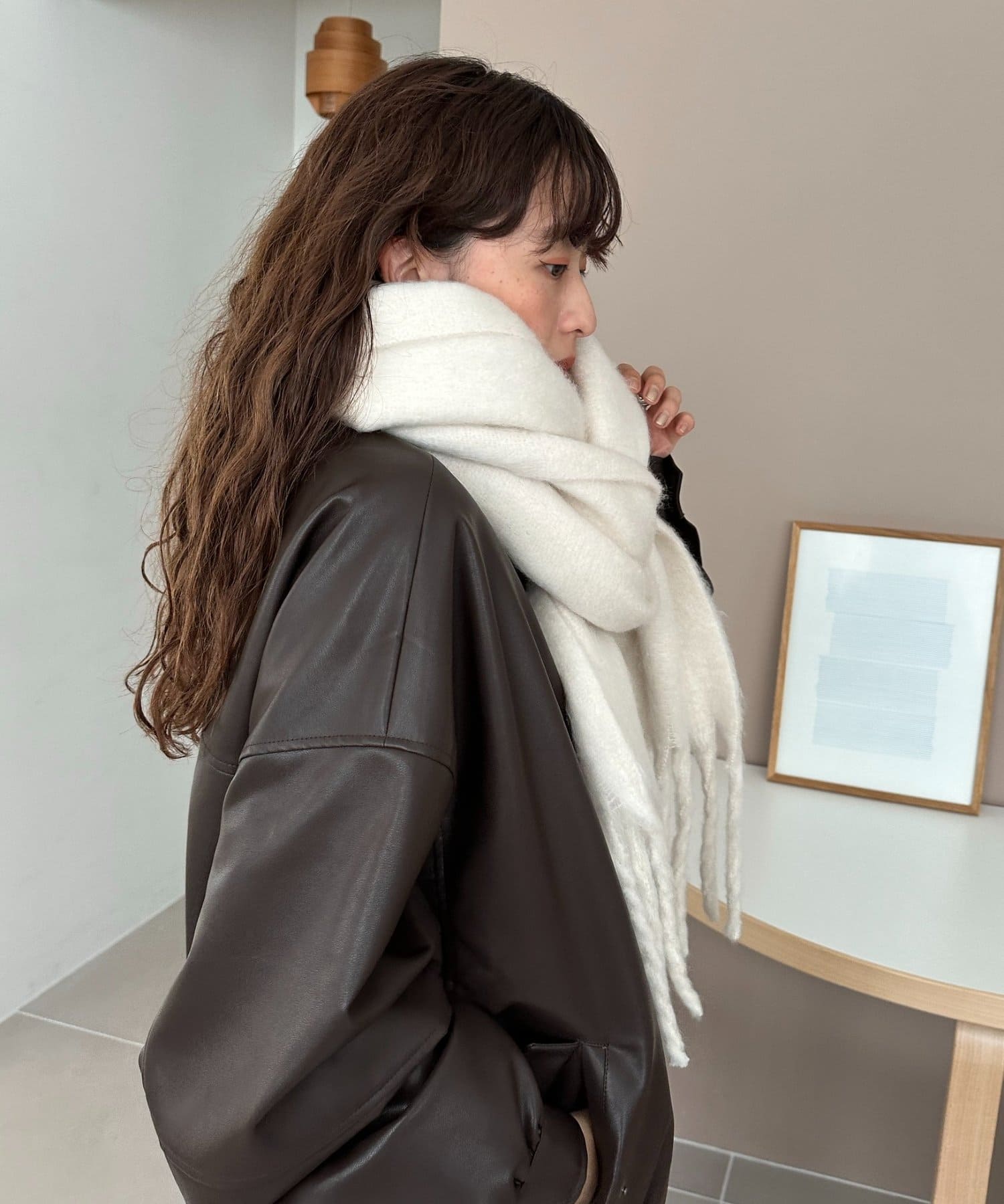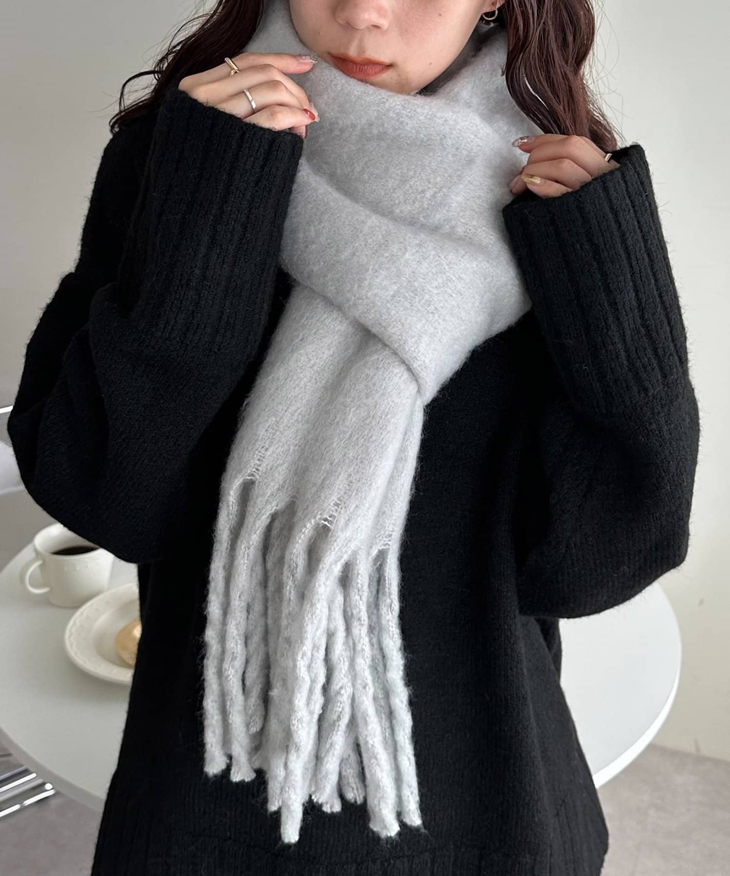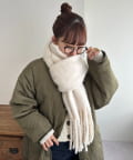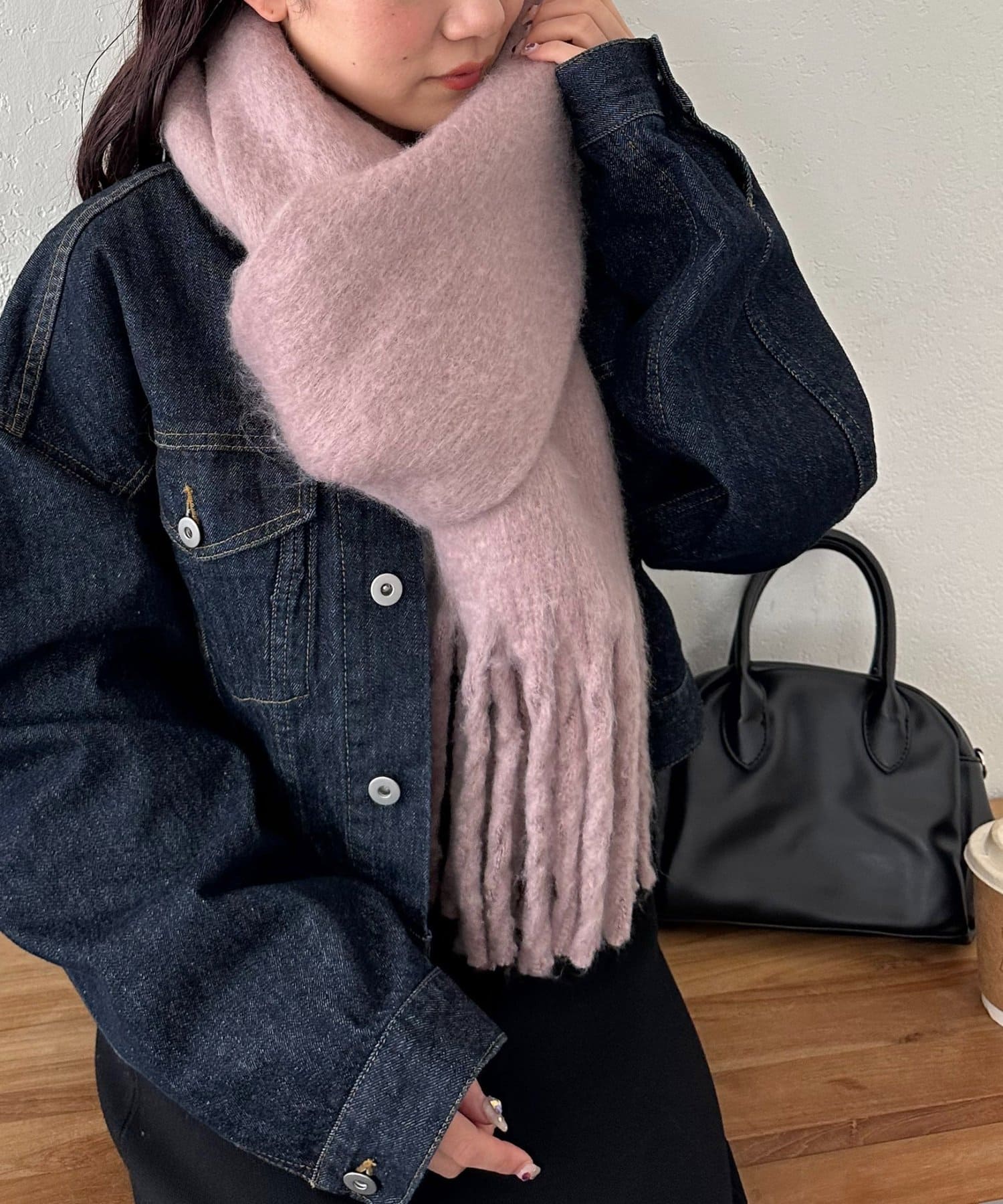 ボリュームたっぷりなマフラーで顔まわりを華やかに。