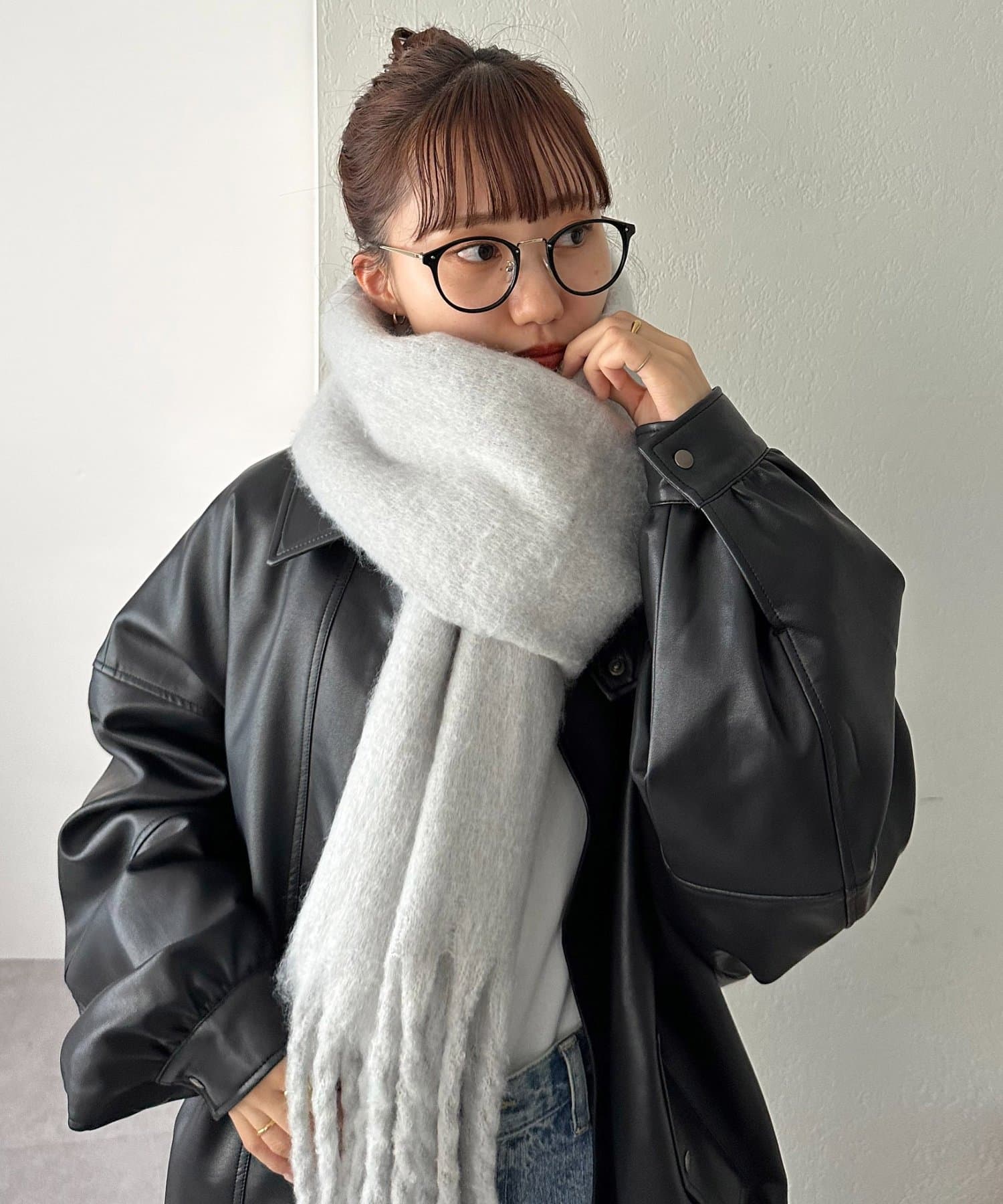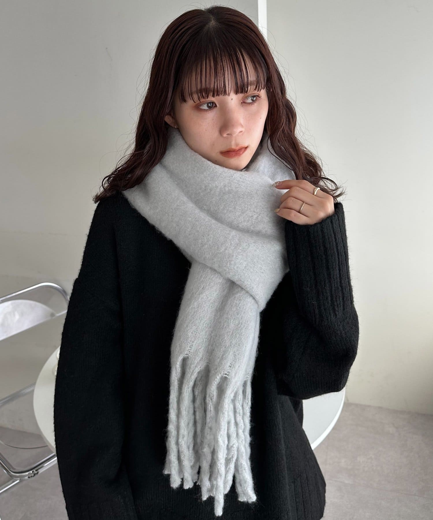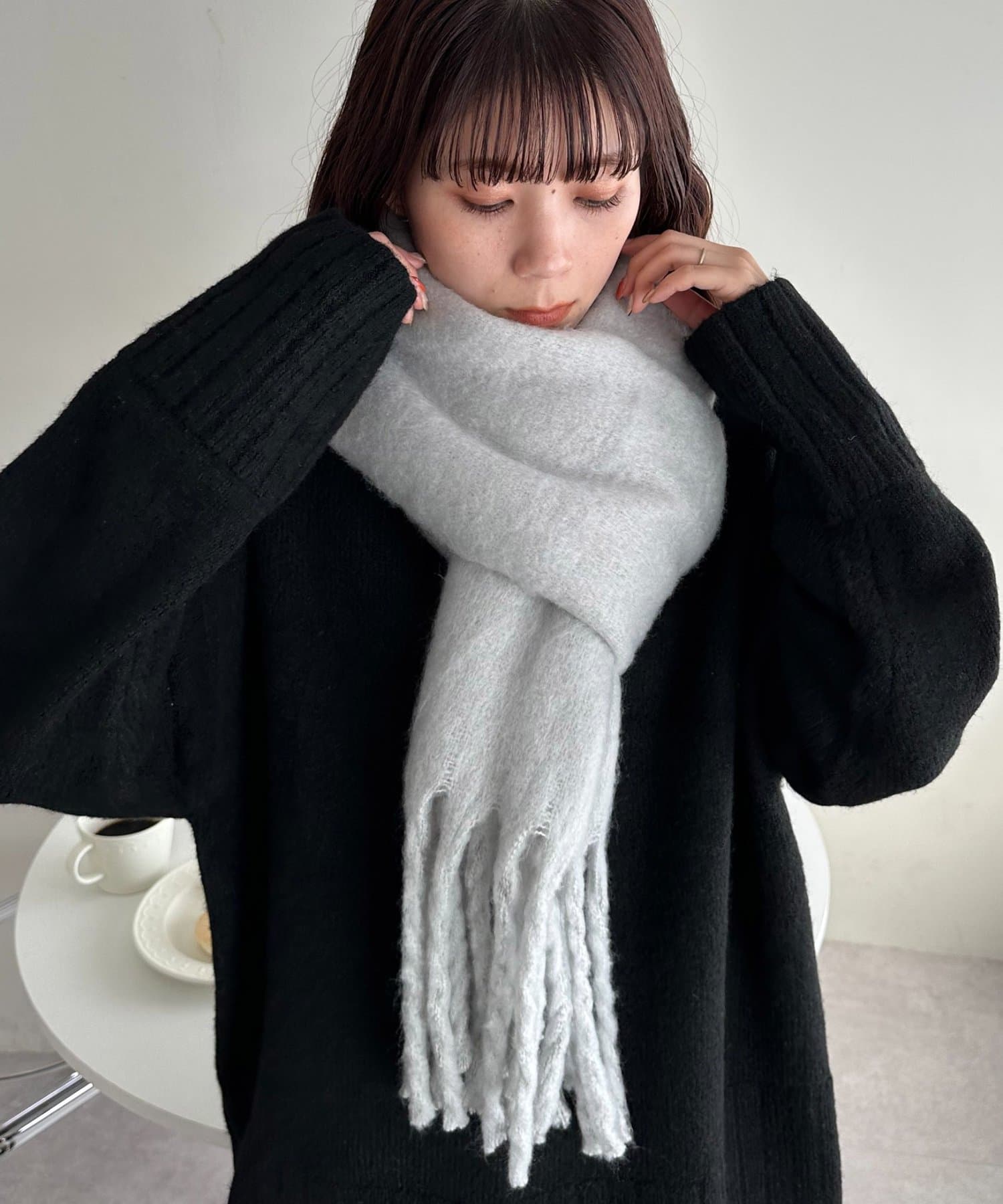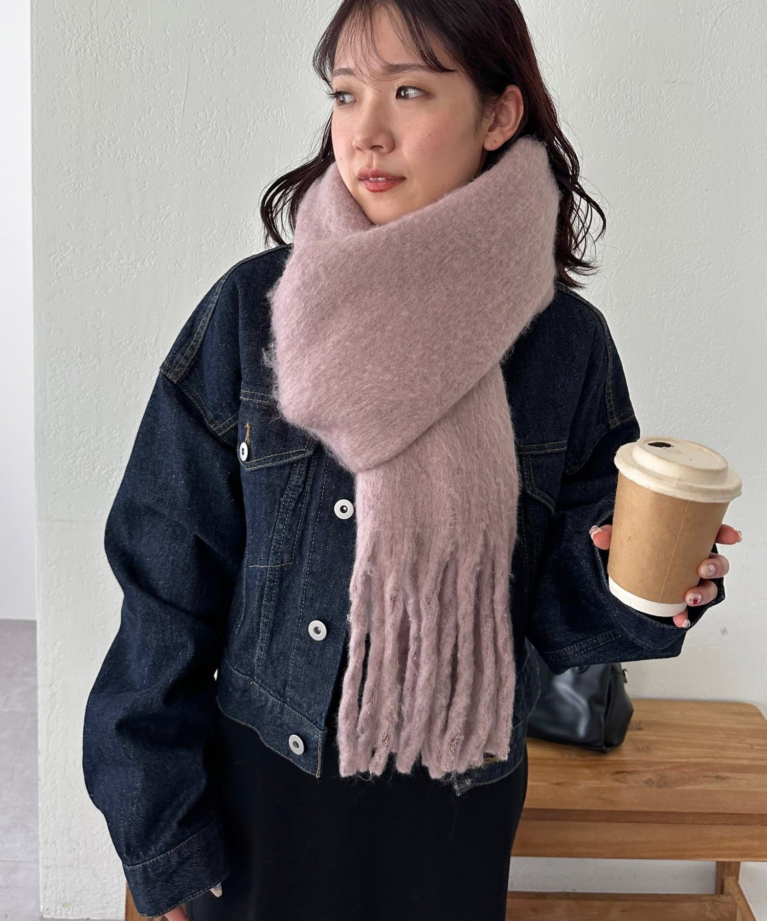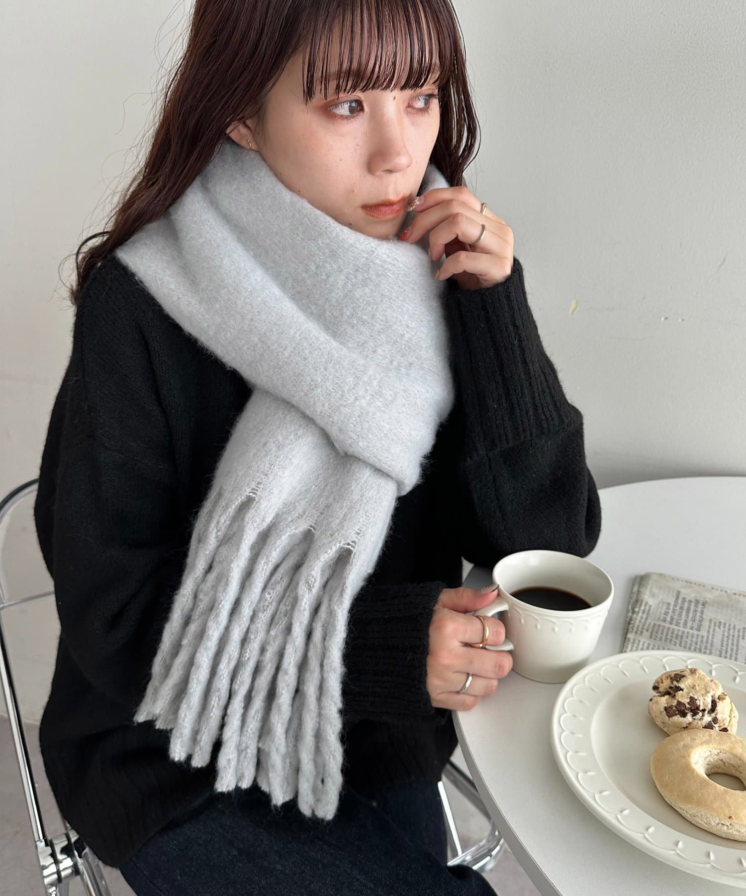 ボリュームたっぷりなマフラーで顔まわりを華やかに。