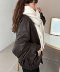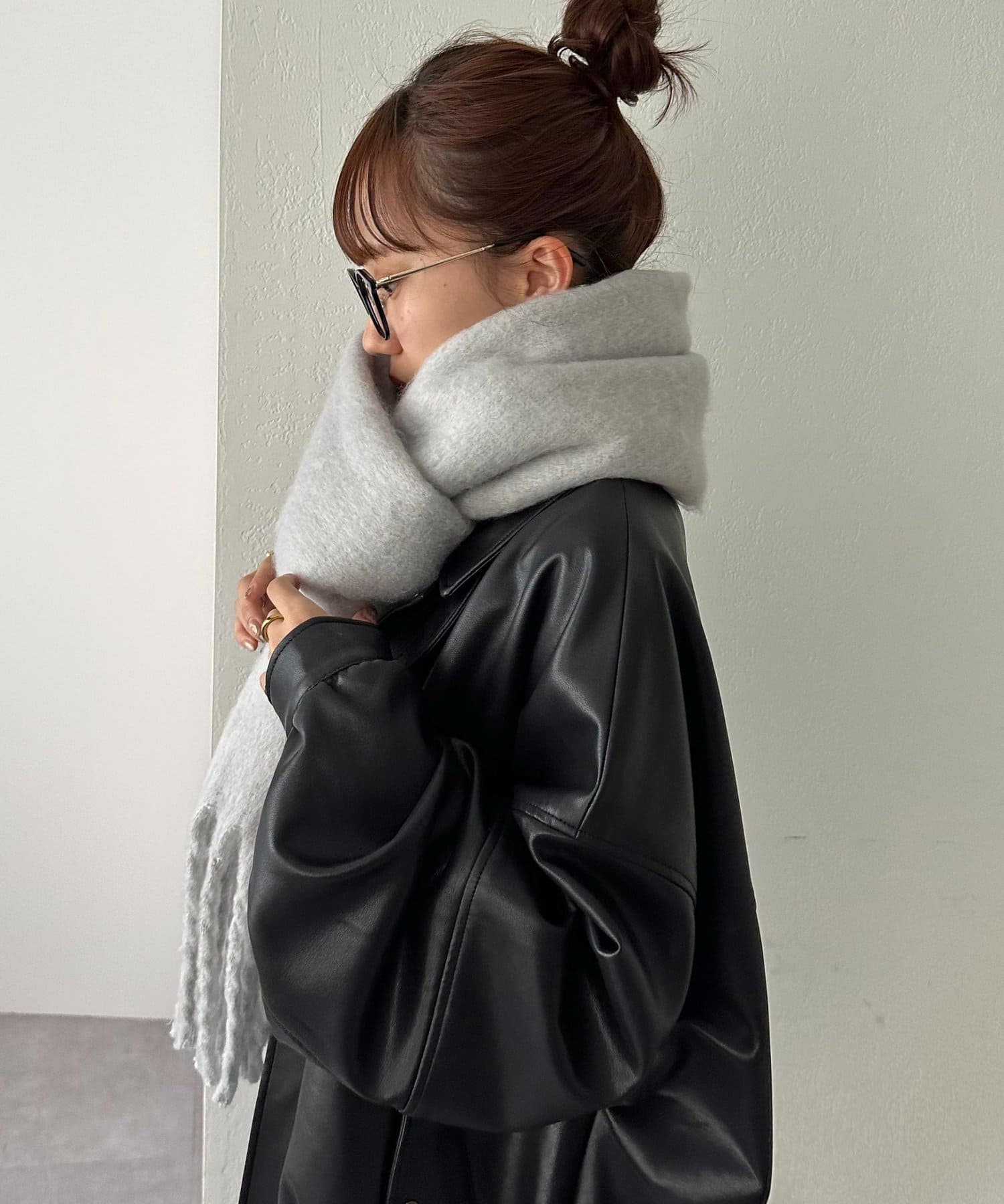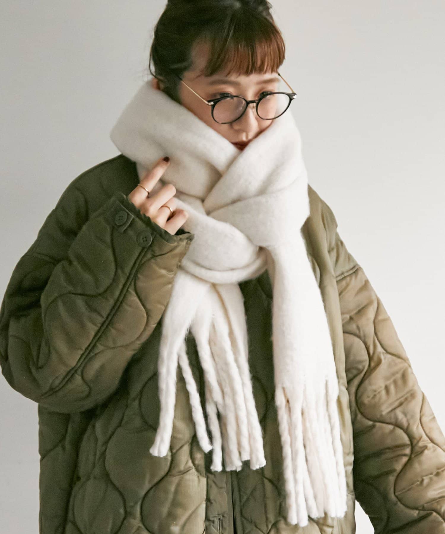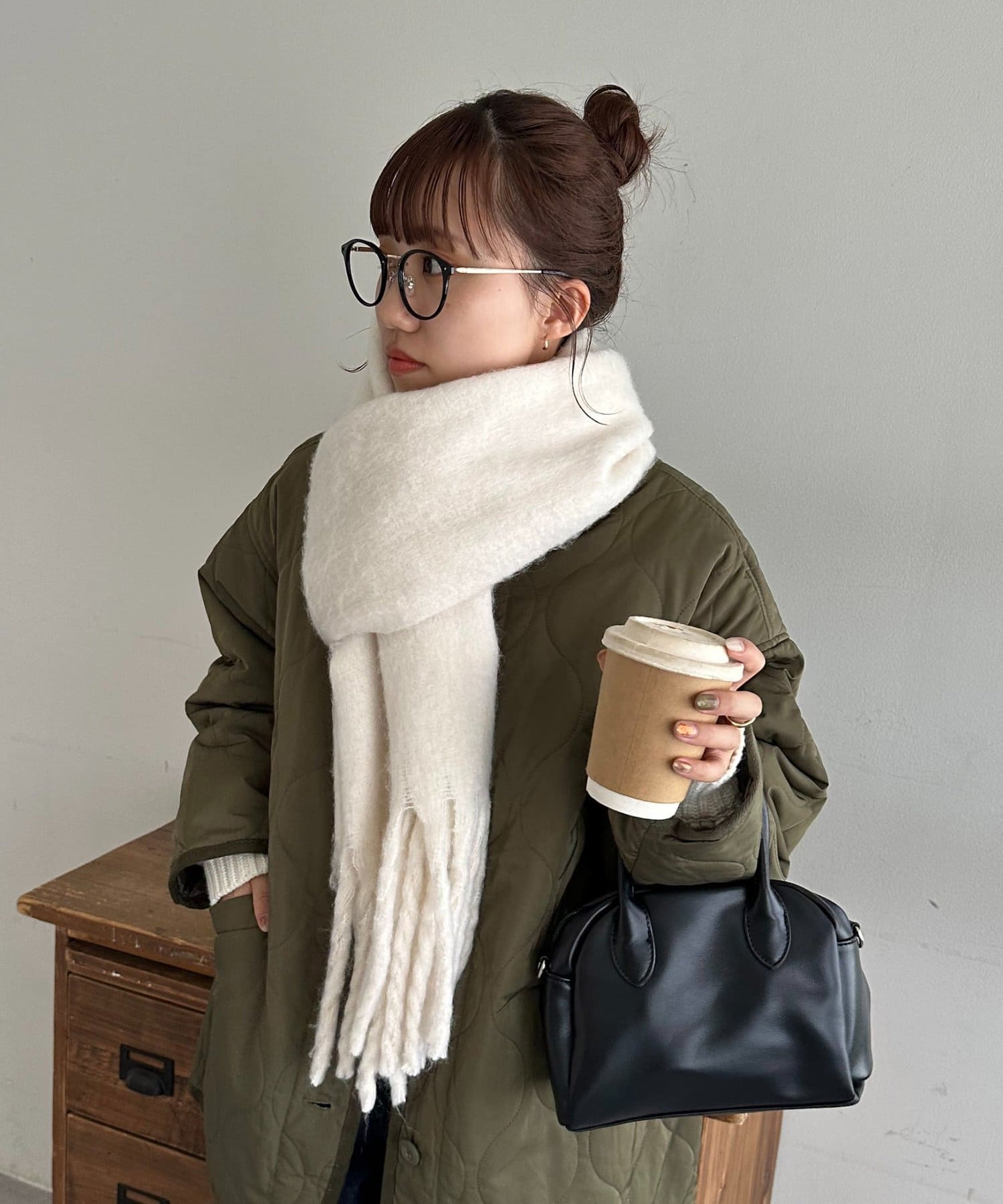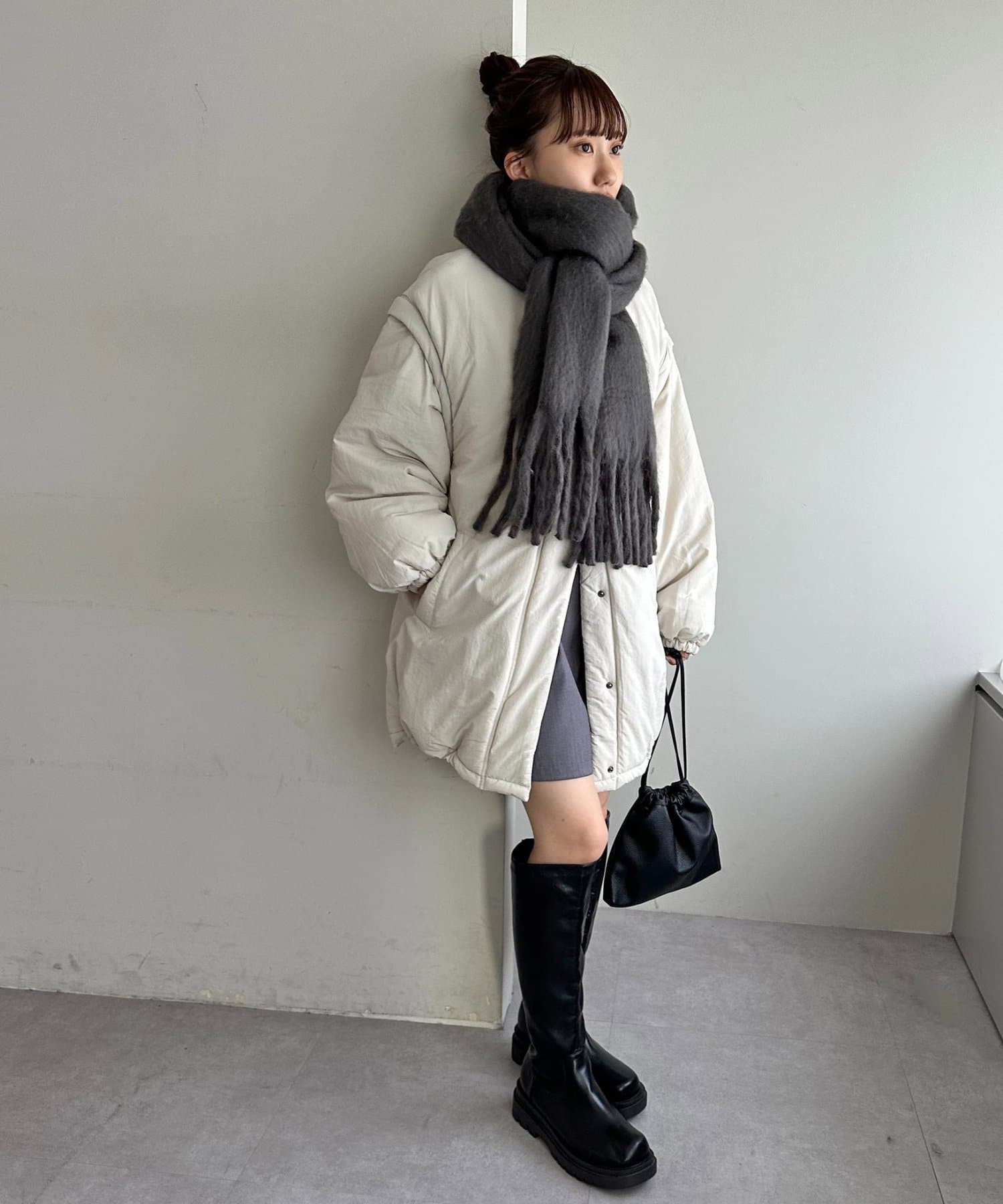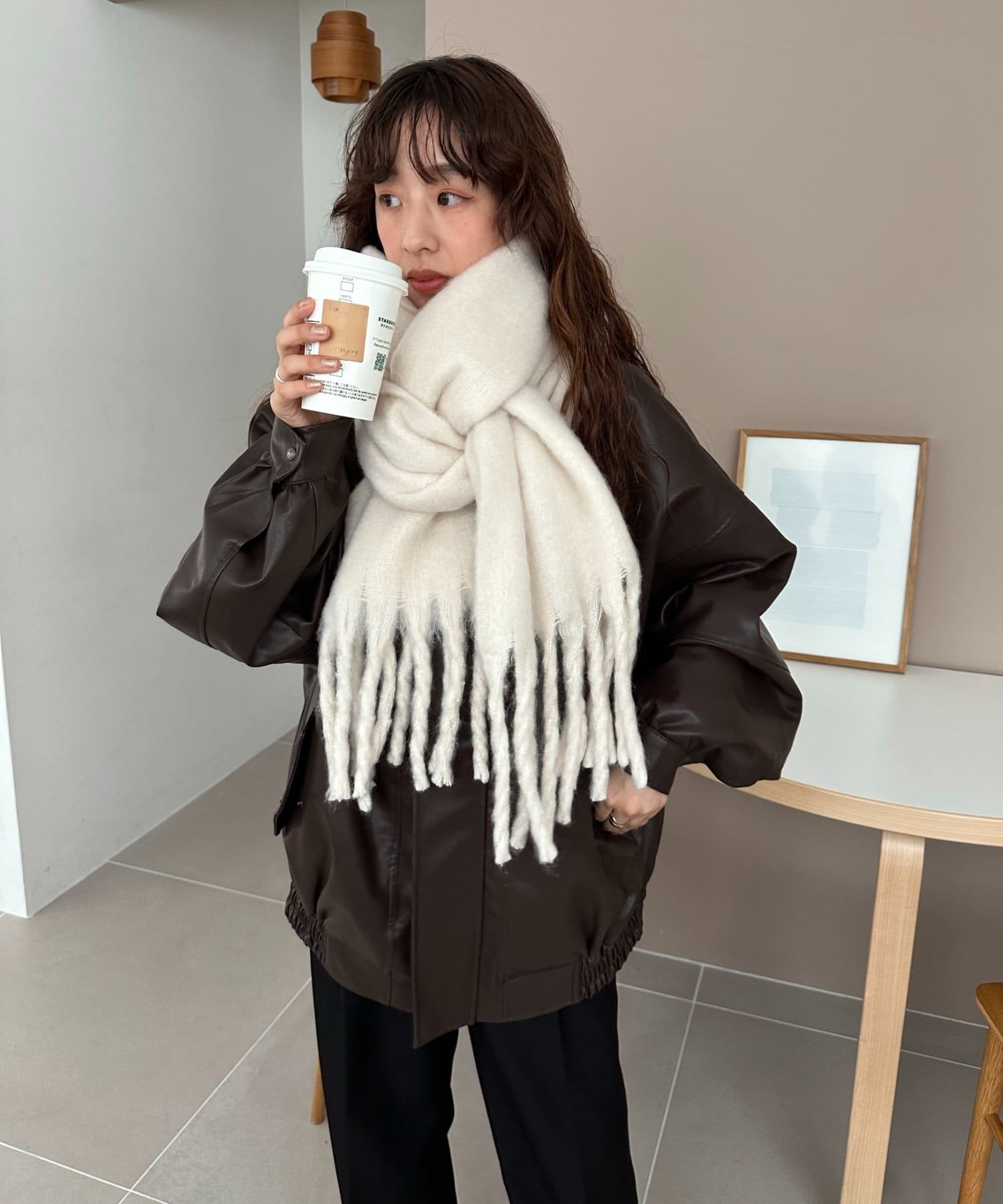 ボリュームたっぷりなマフラーで顔まわりを華やかに。