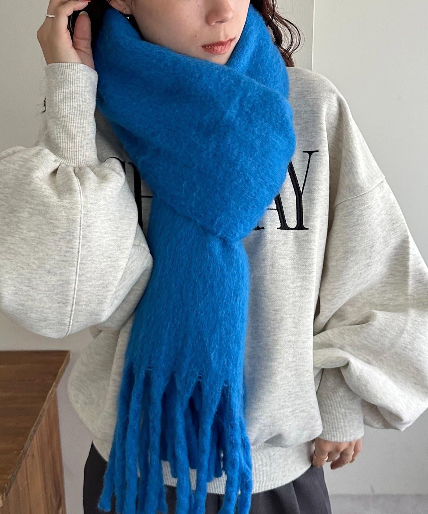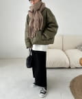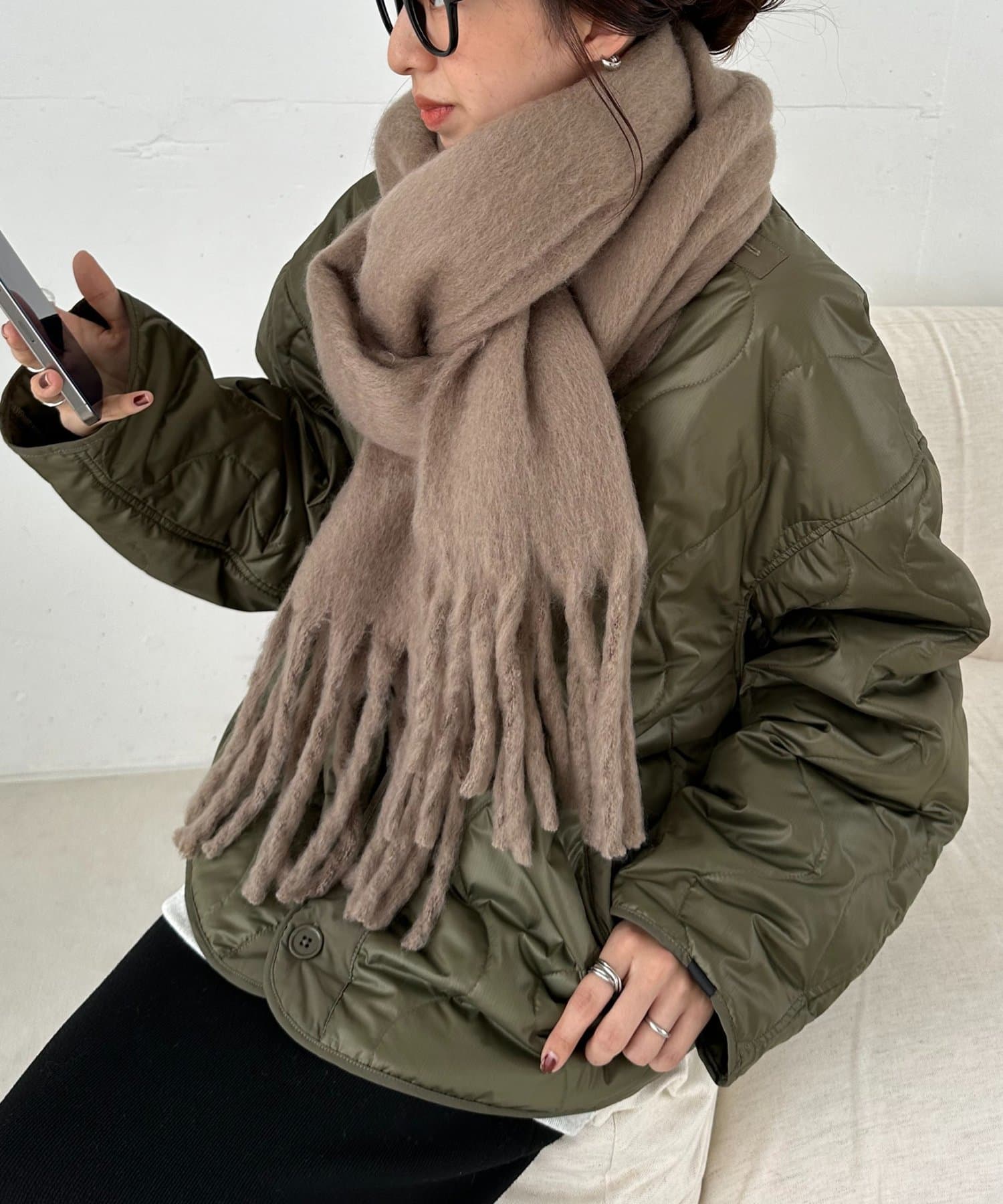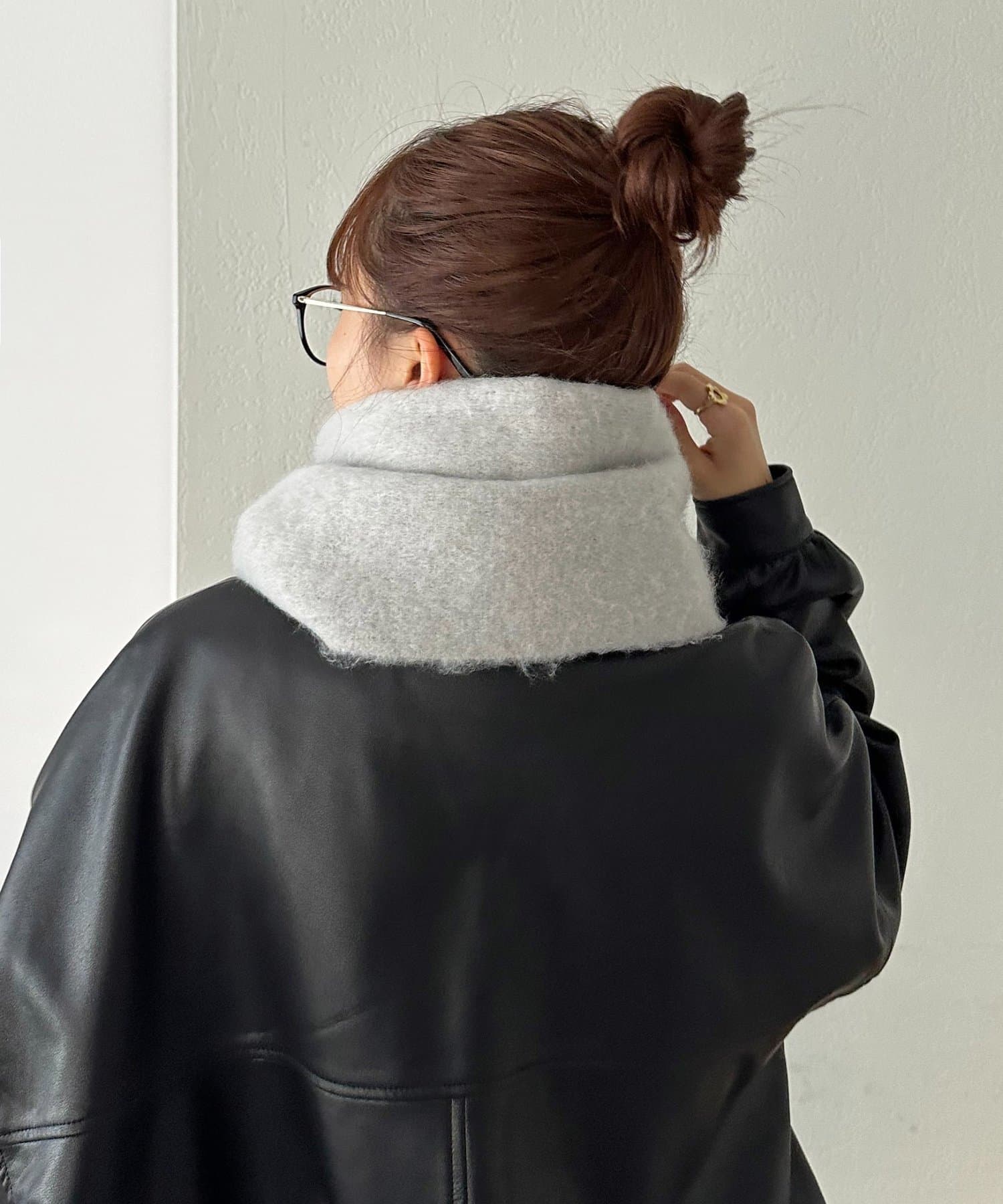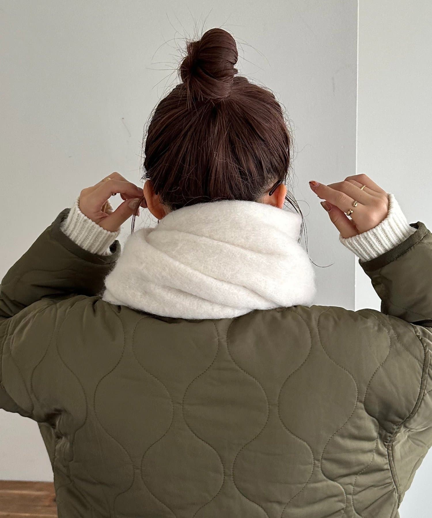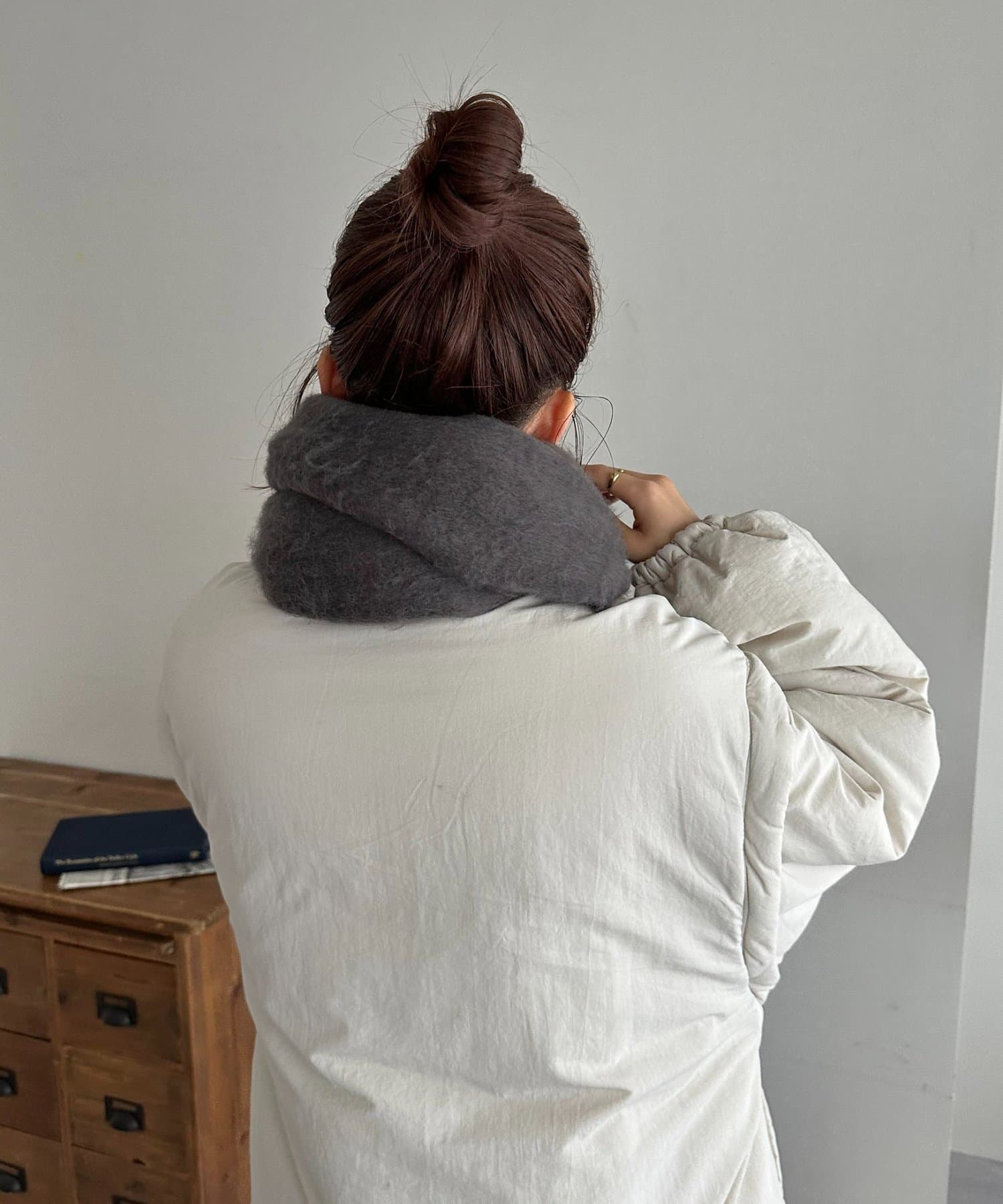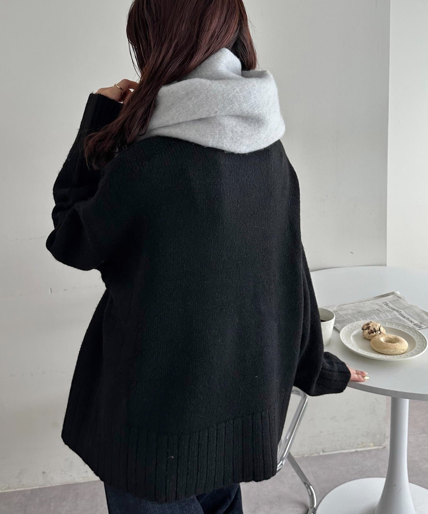 ボリュームたっぷりなマフラーで顔まわりを華やかに。