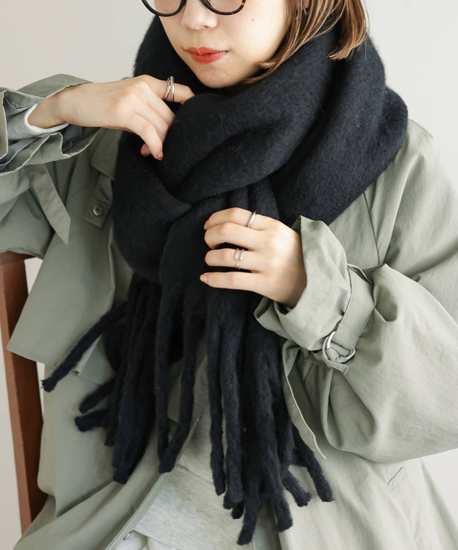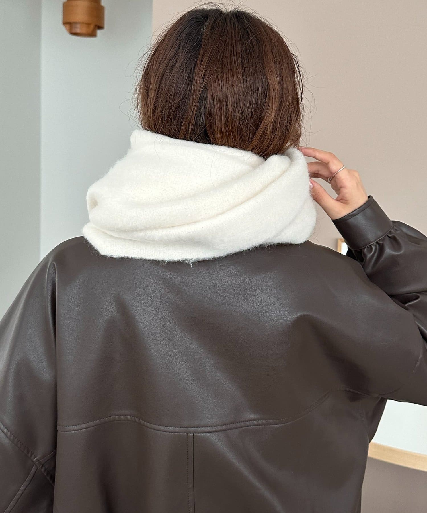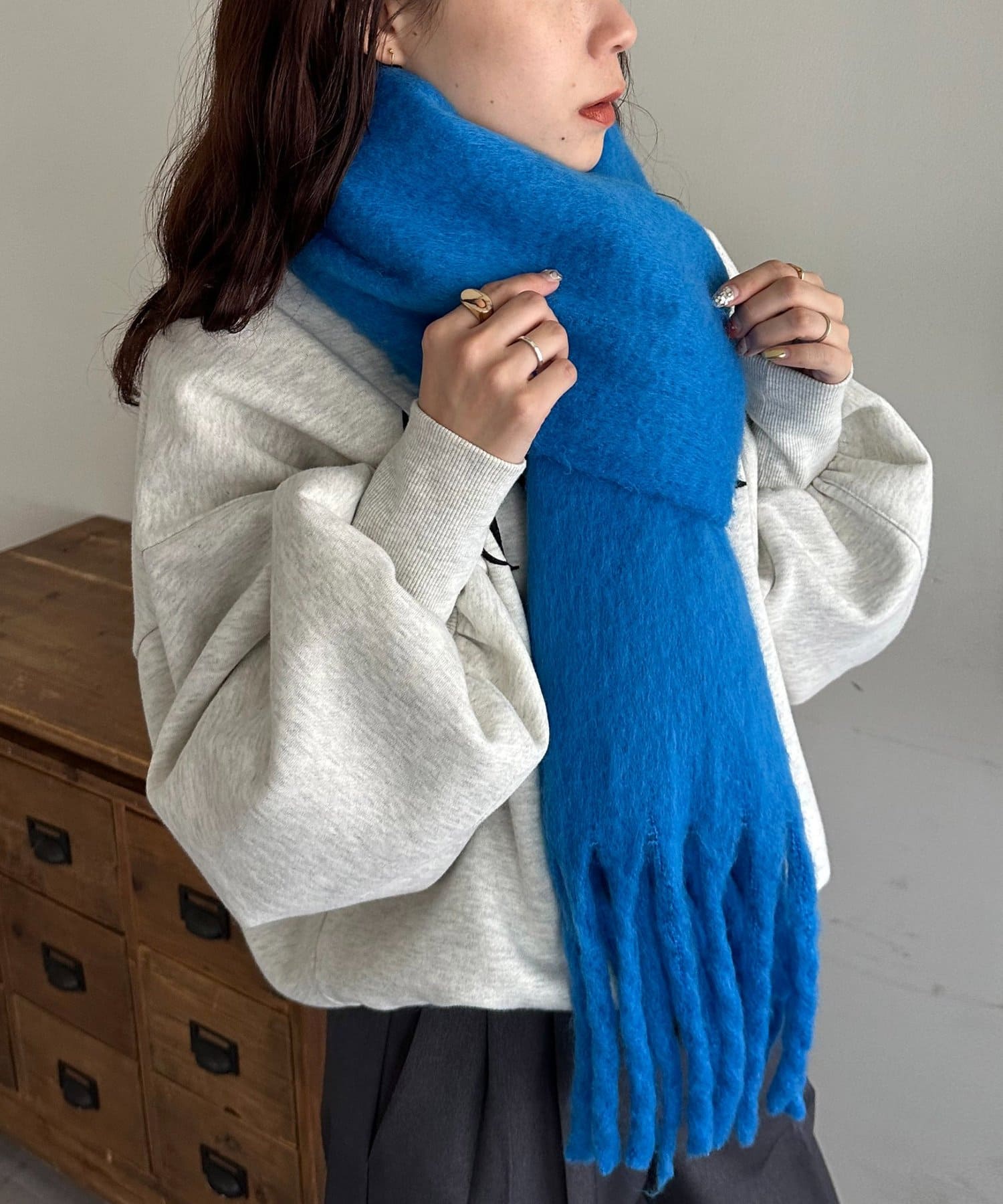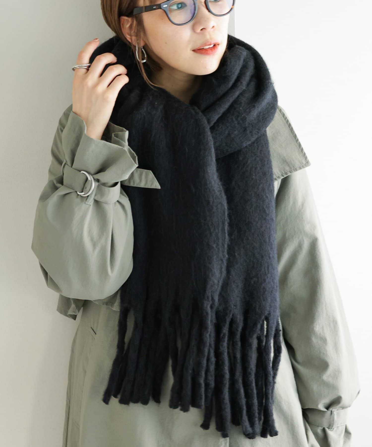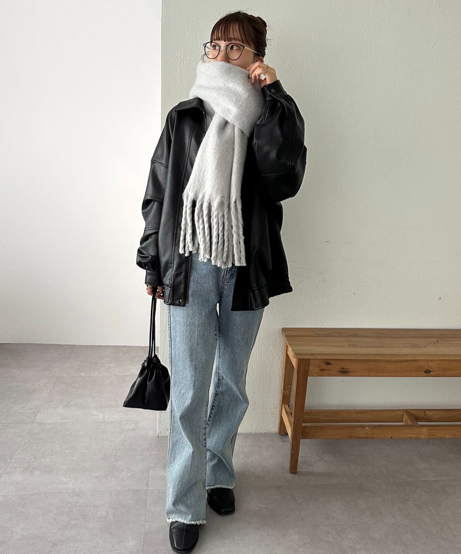 ボリュームたっぷりなマフラーで顔まわりを華やかに。
