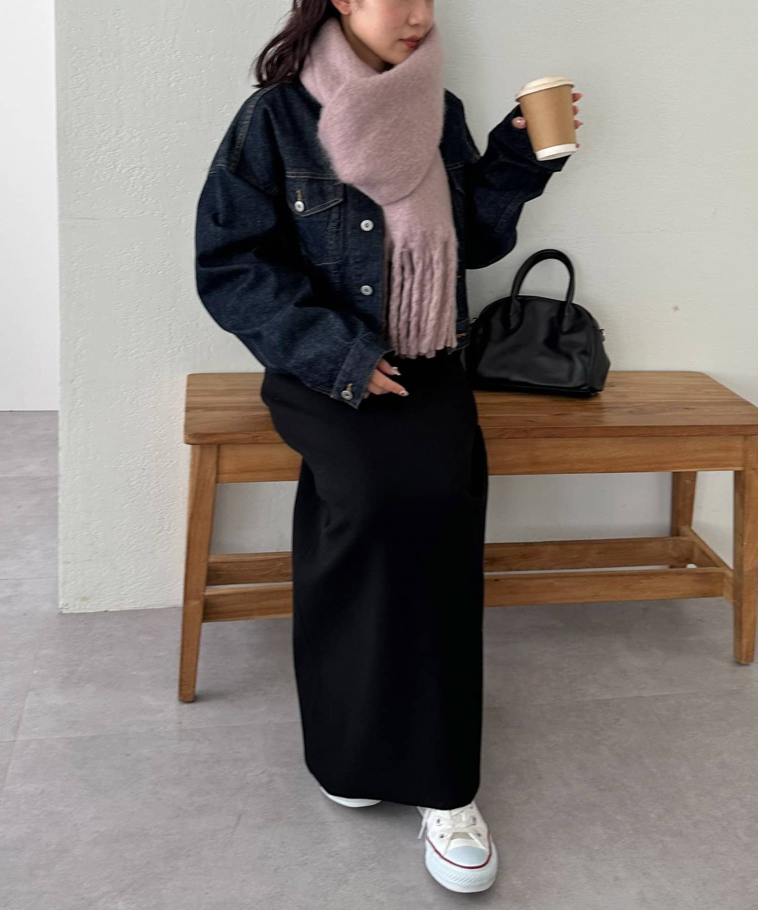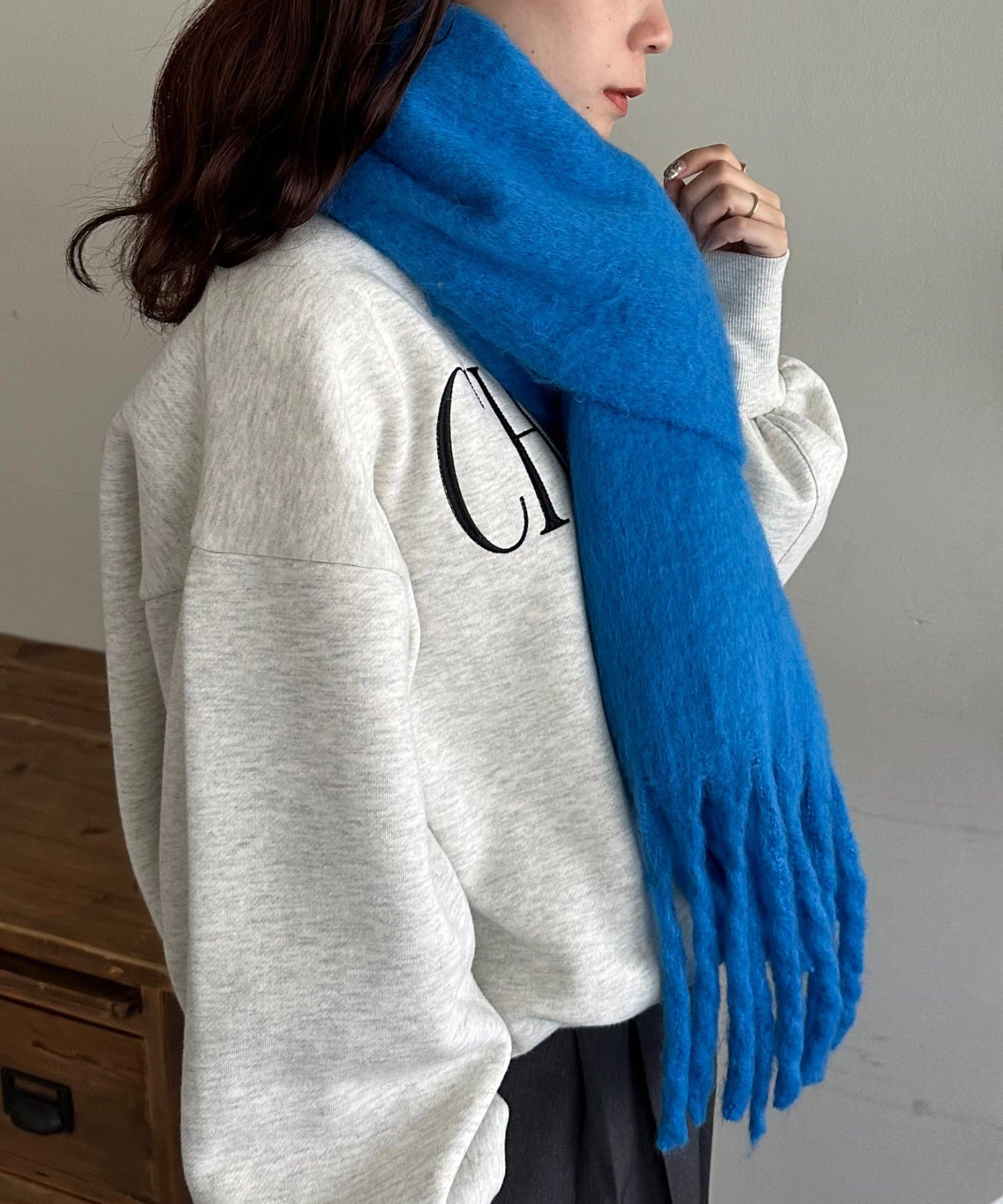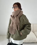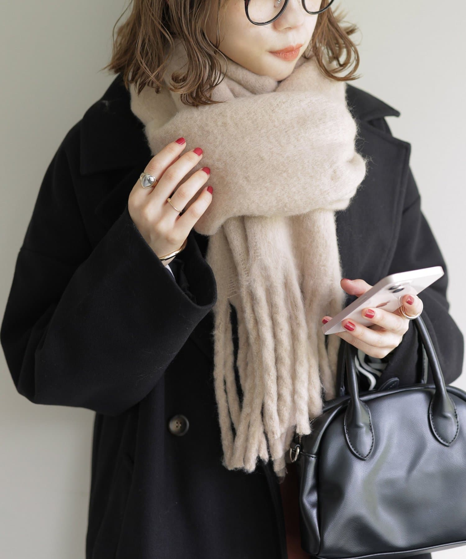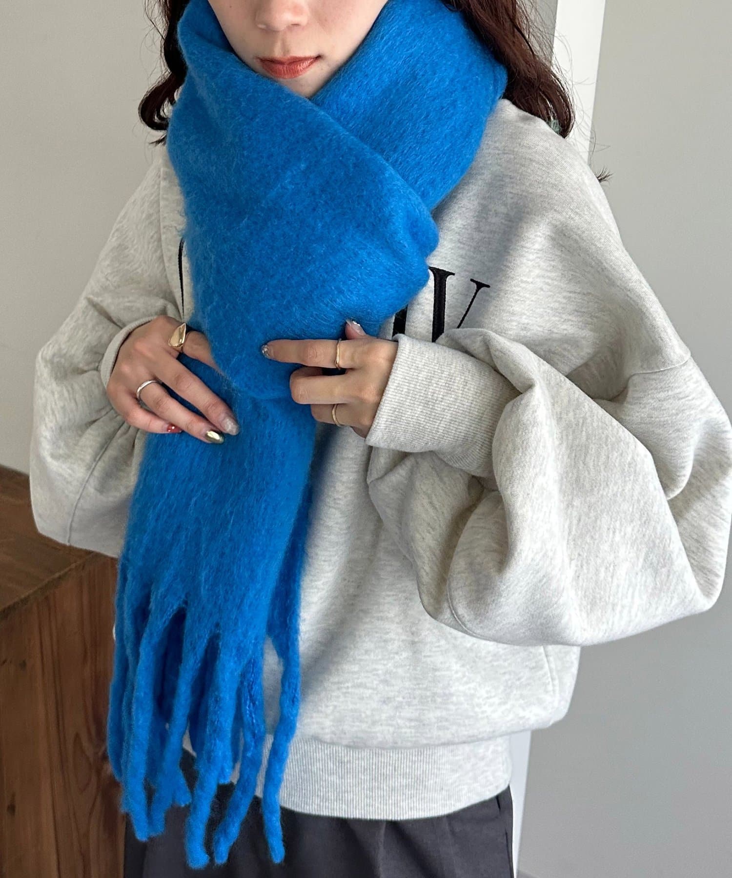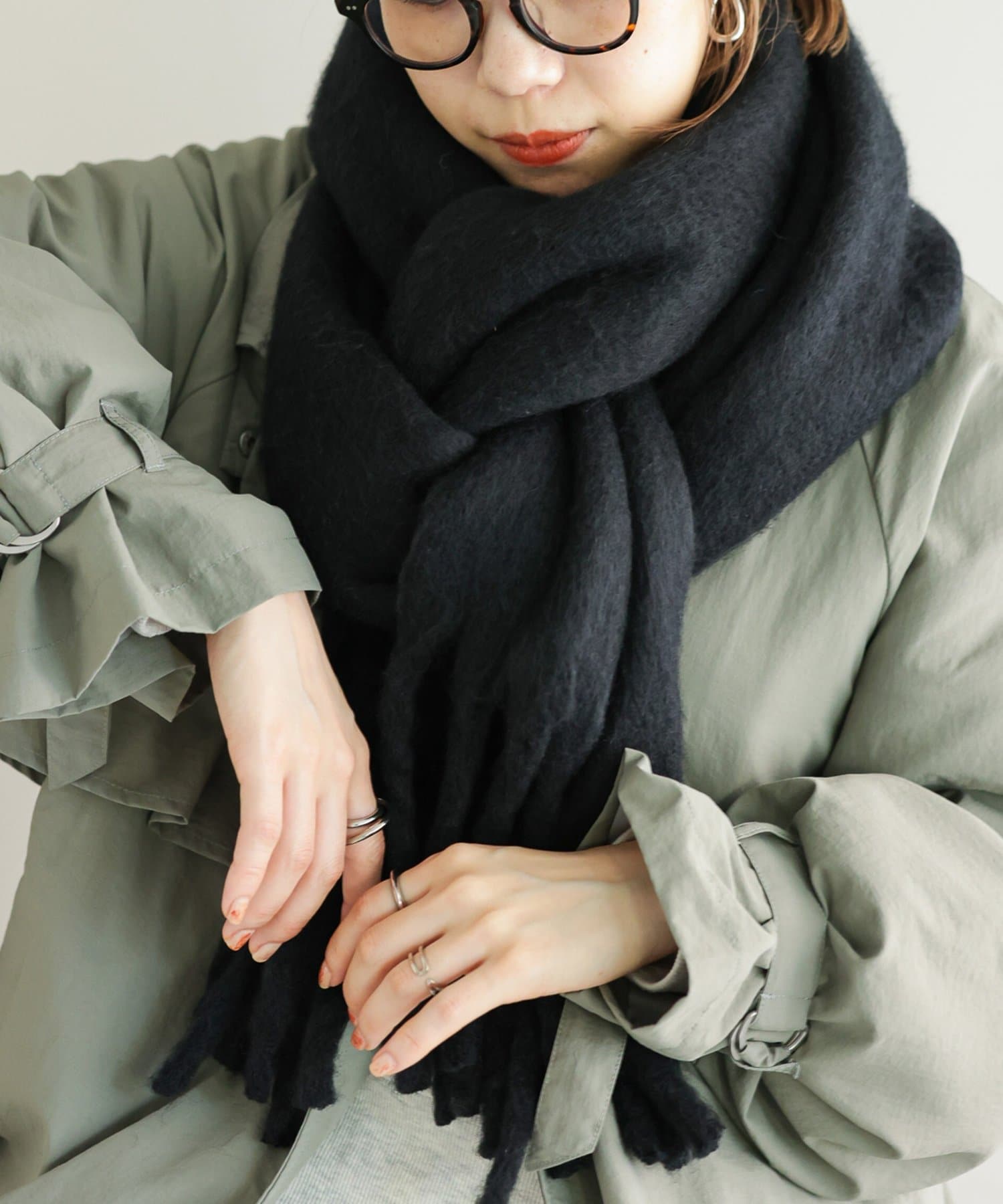 ボリュームたっぷりなマフラーで顔まわりを華やかに。