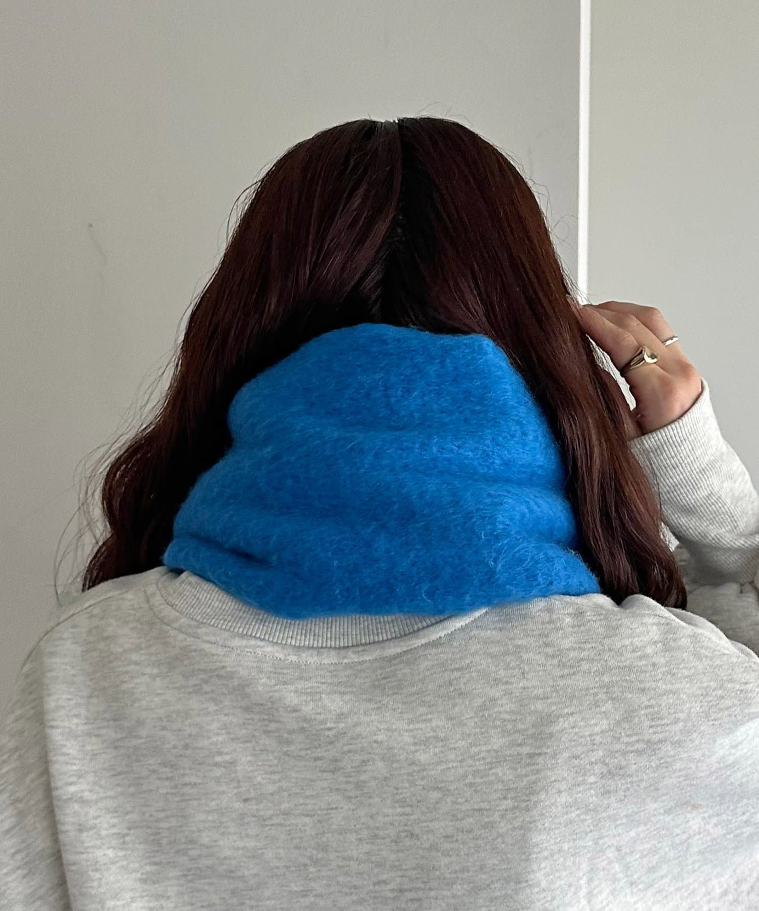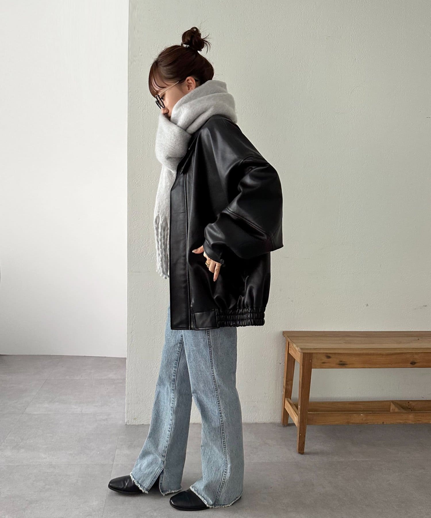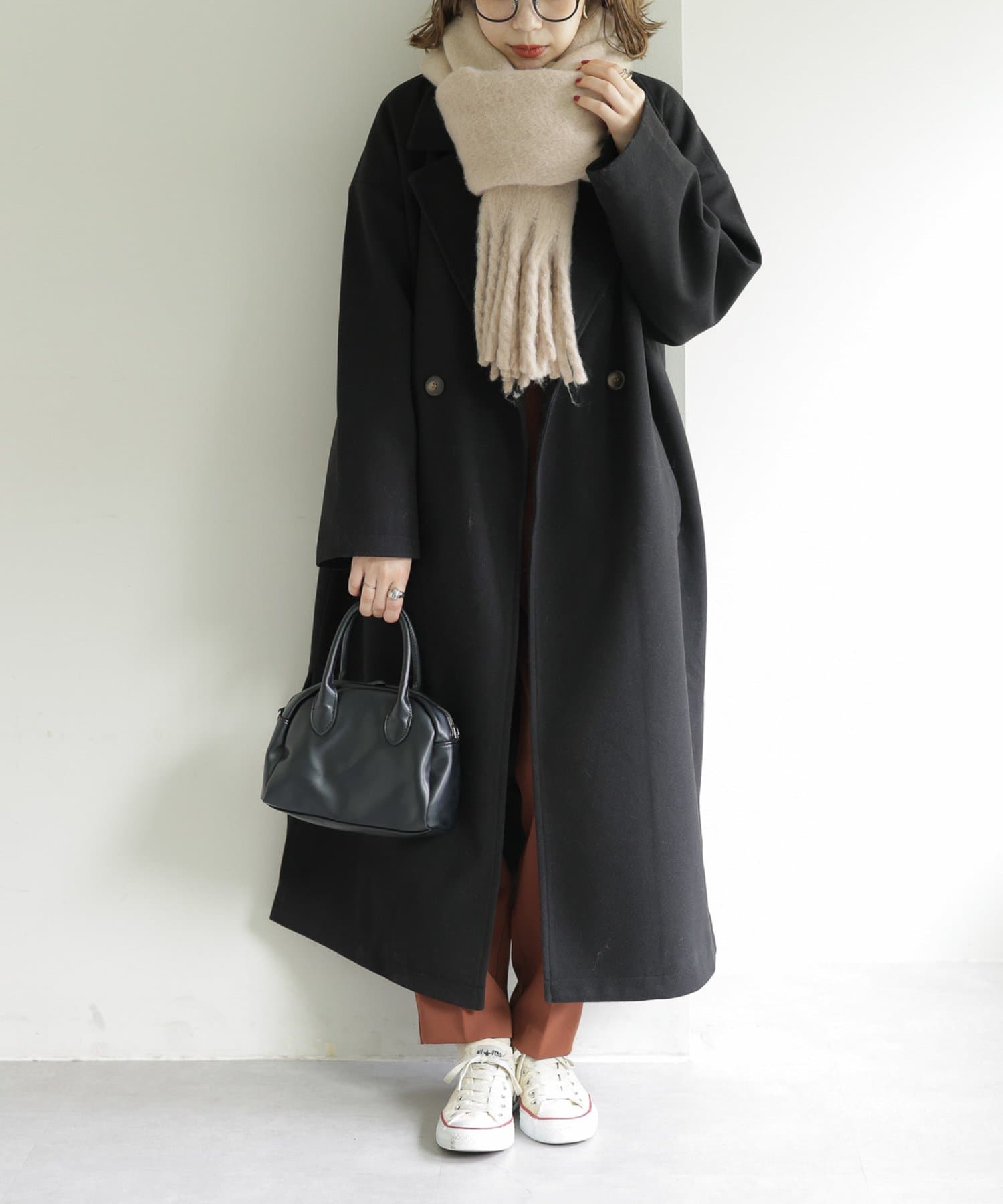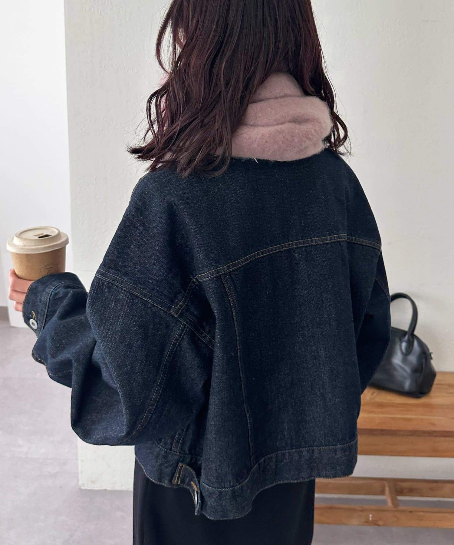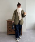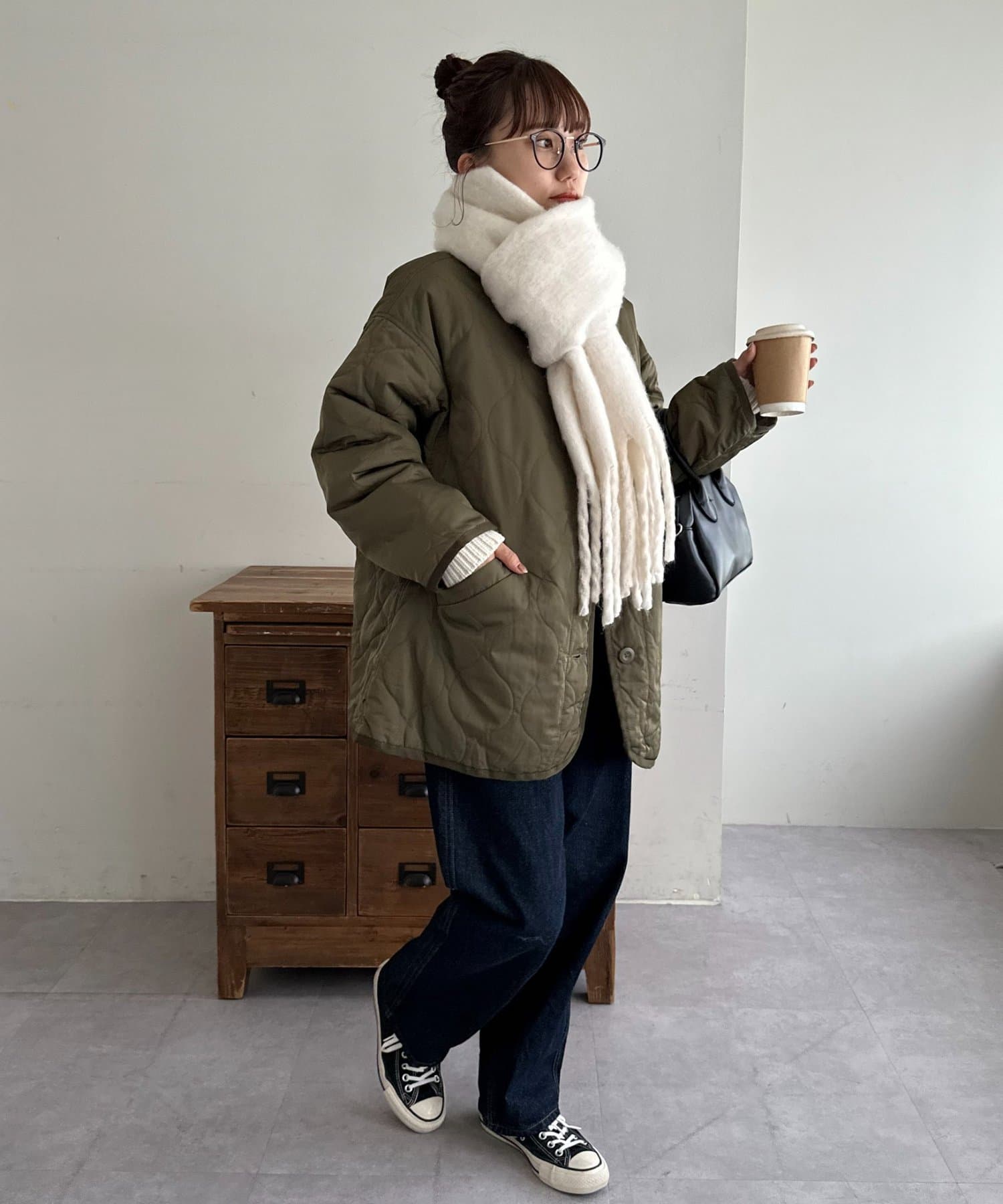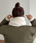 ボリュームたっぷりなマフラーで顔まわりを華やかに。