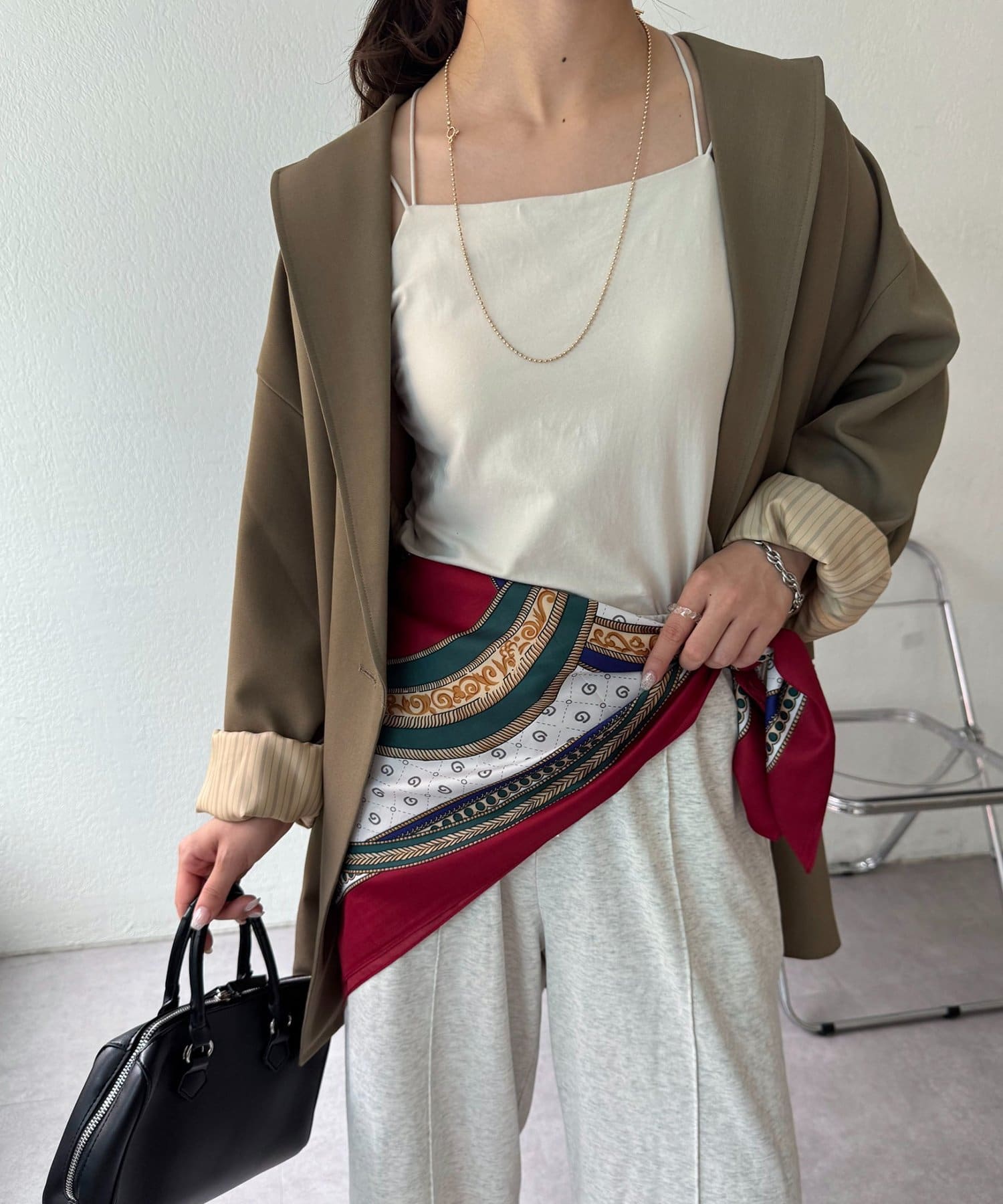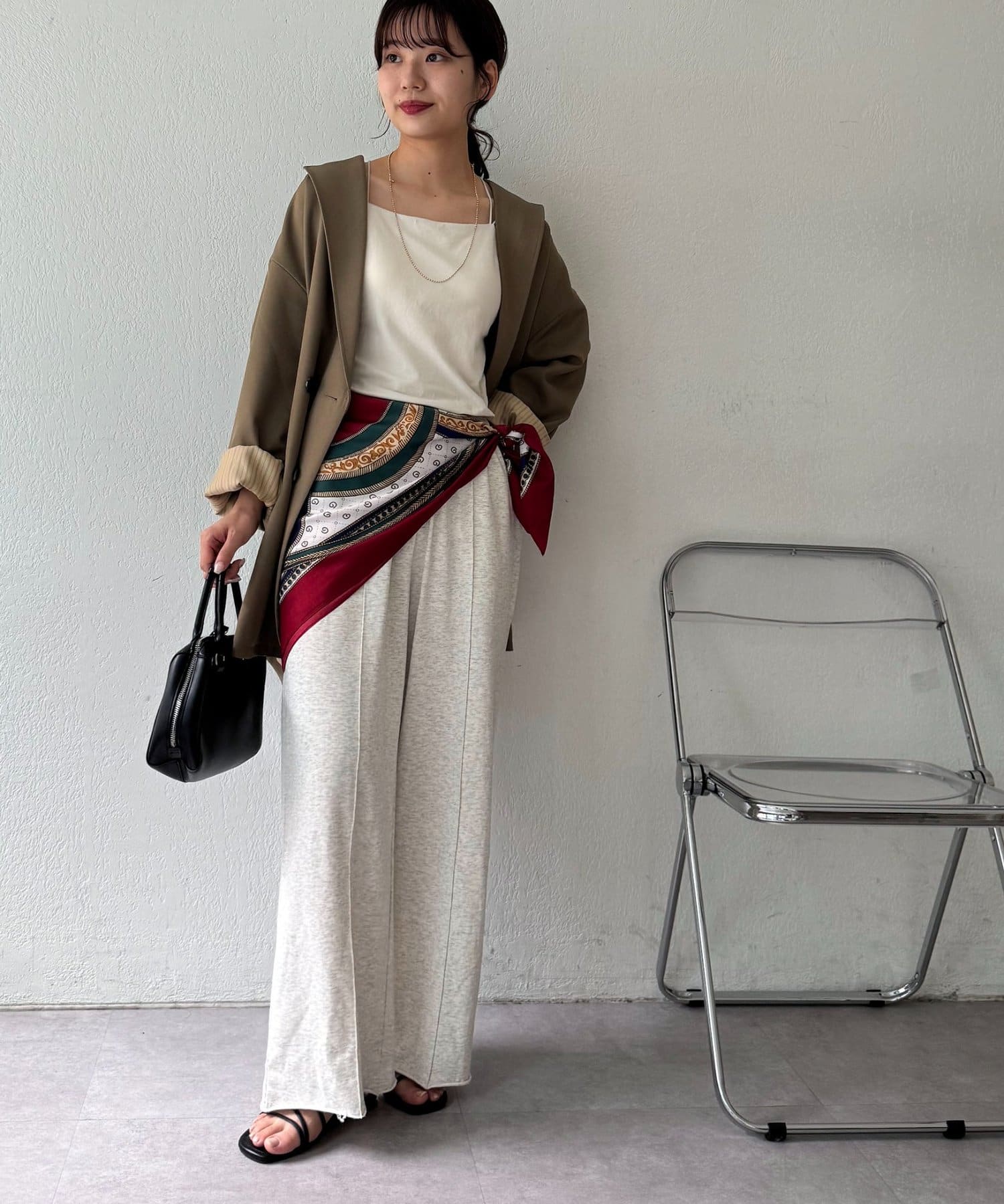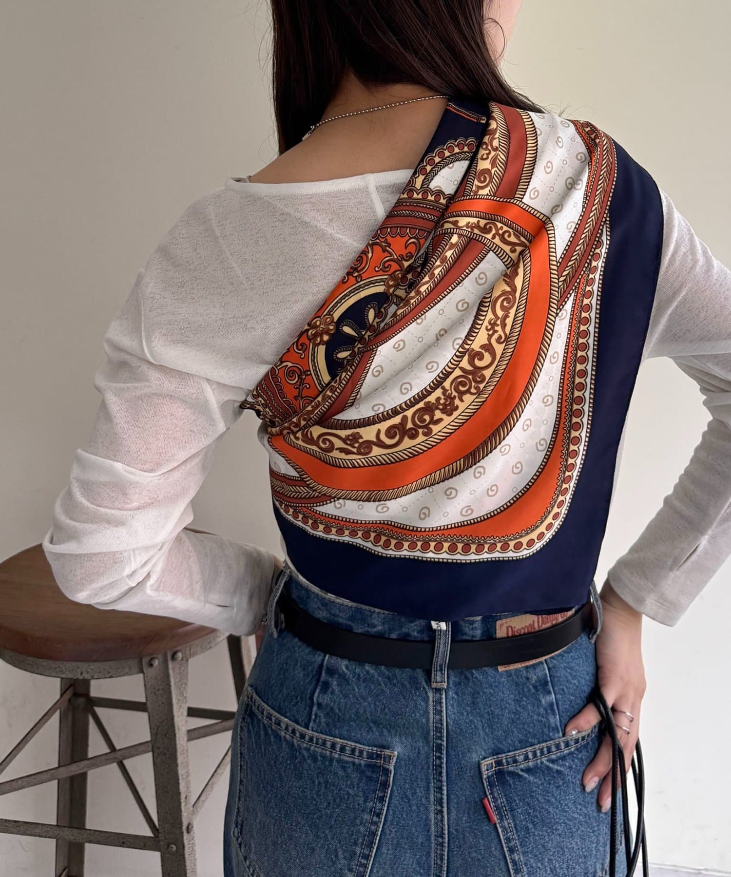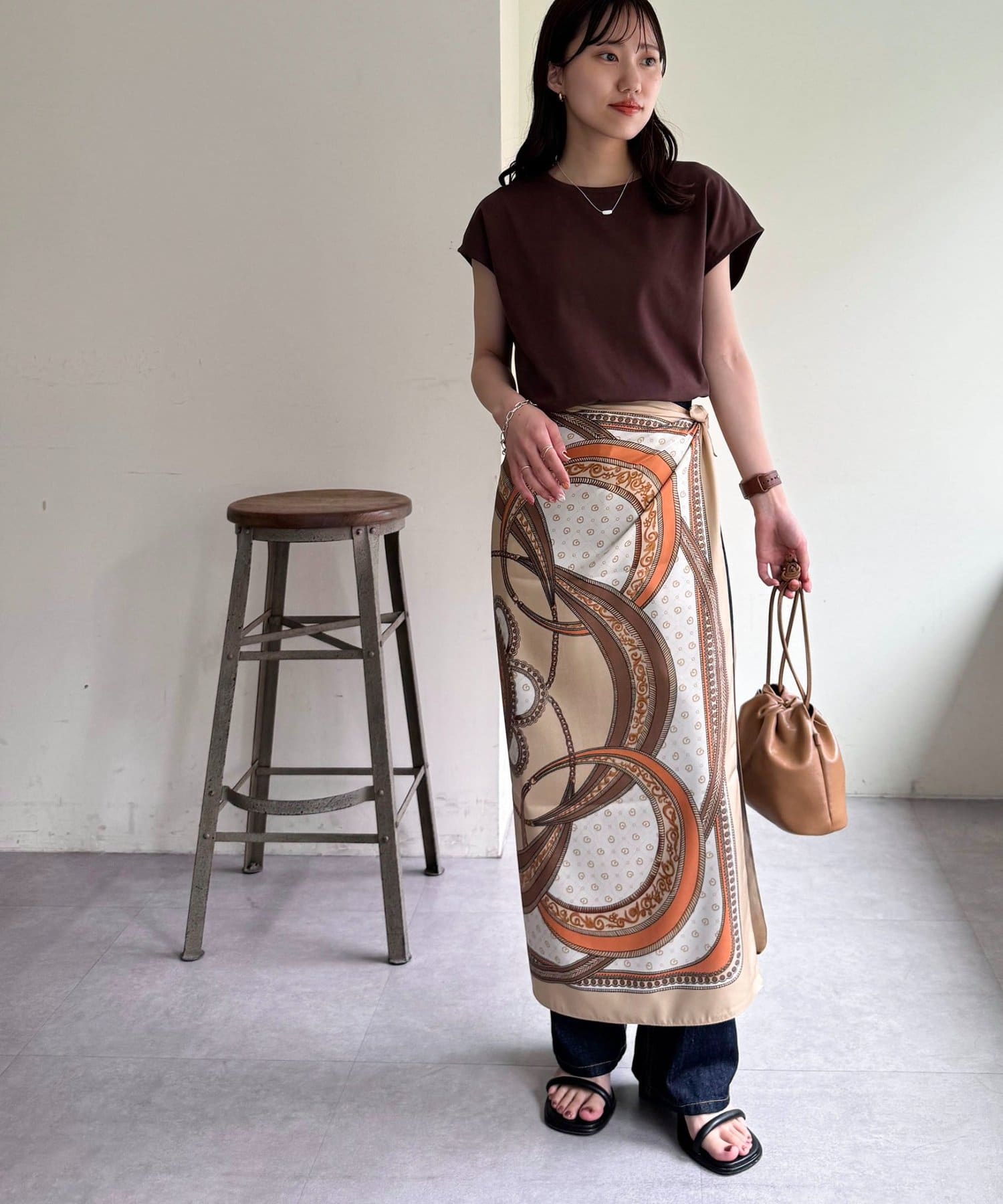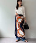 大判スカーフ風の柄が華やかで、合わせるだけでこなれ感が出ます