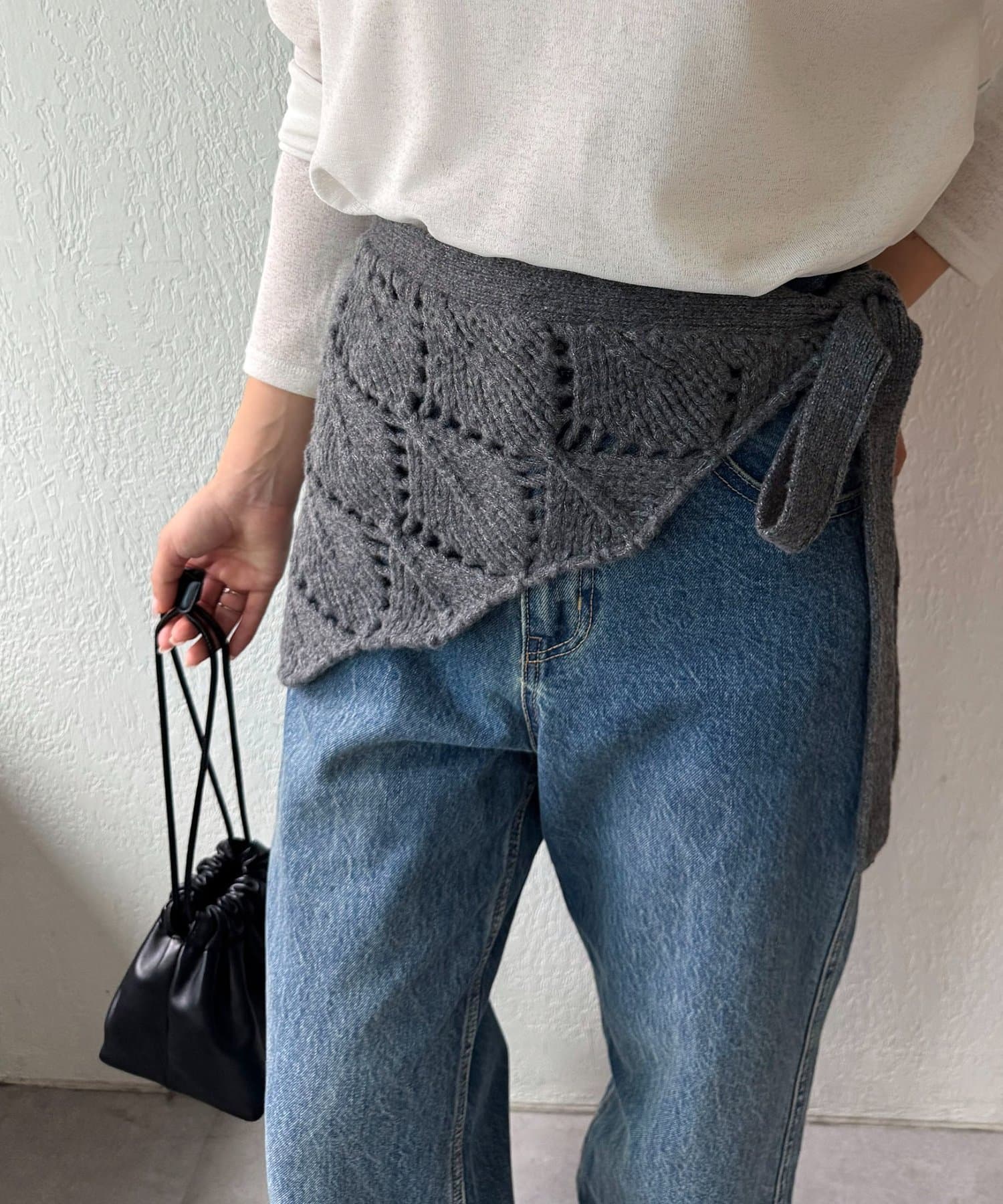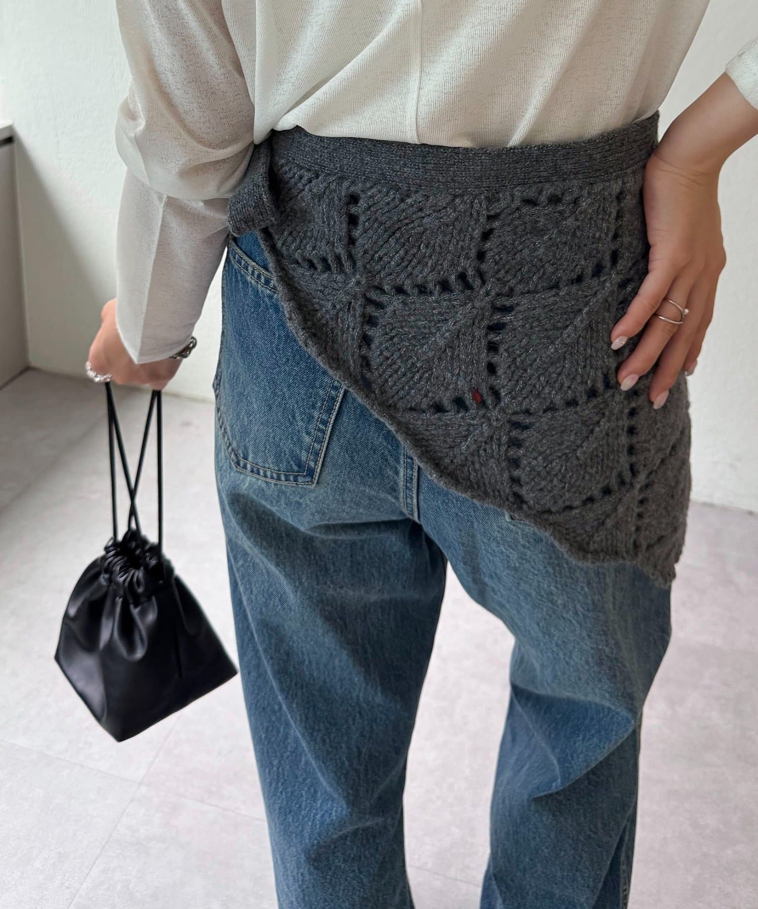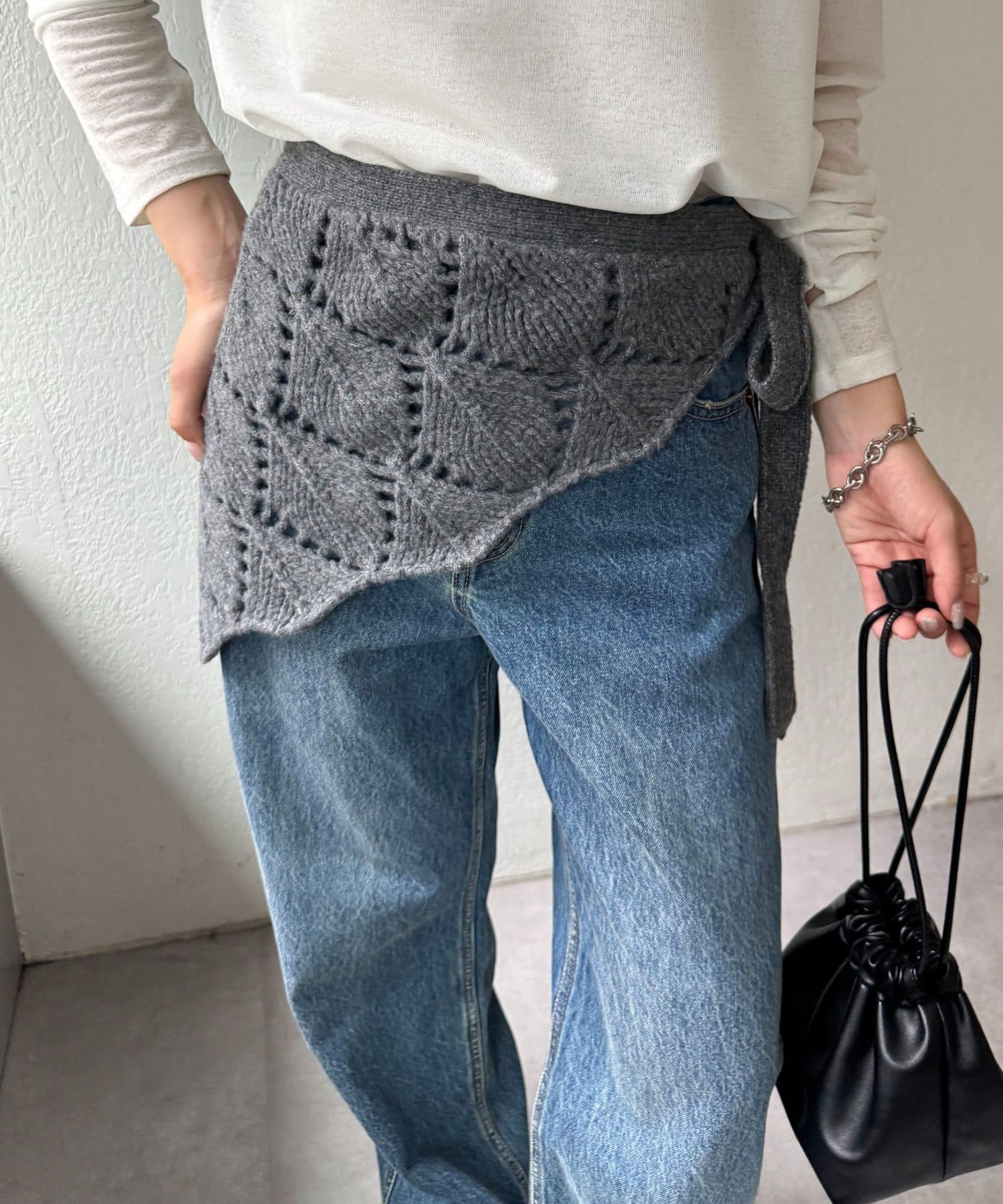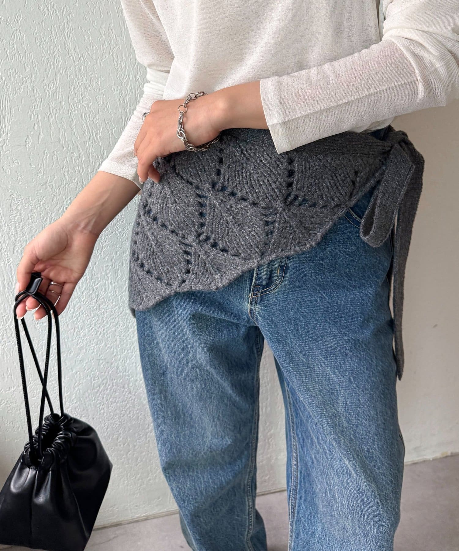 立体感のあるかぎ編みデザインがポイントで、シンプルなトップスやボトムに合わせるだけでこなれ感のあるスタイリングが完成します。