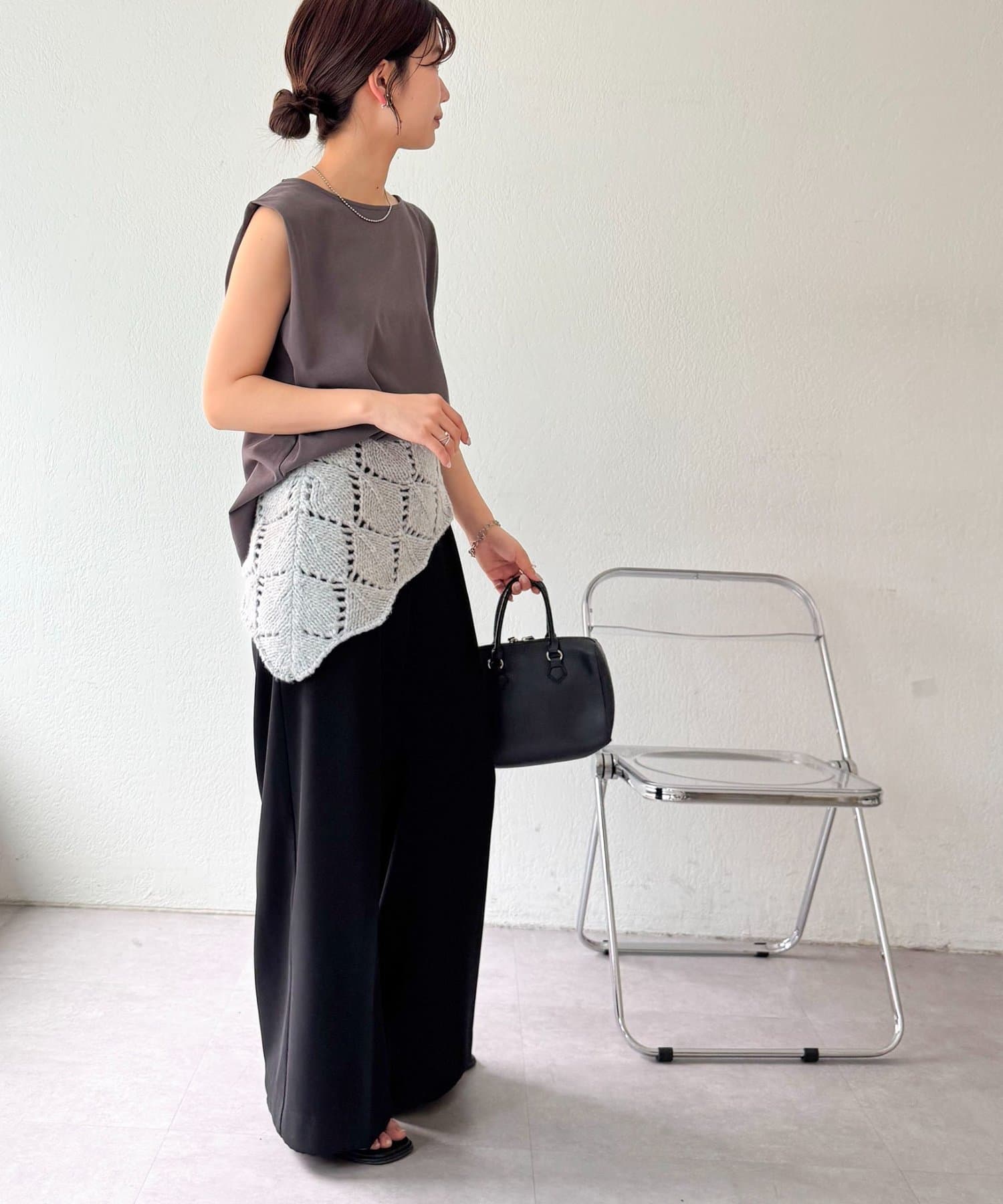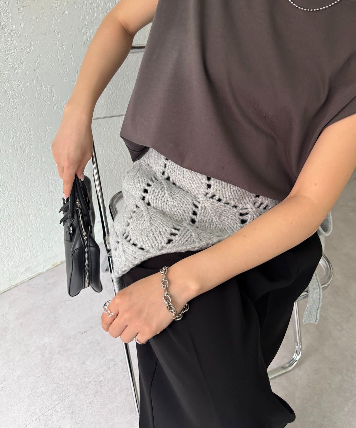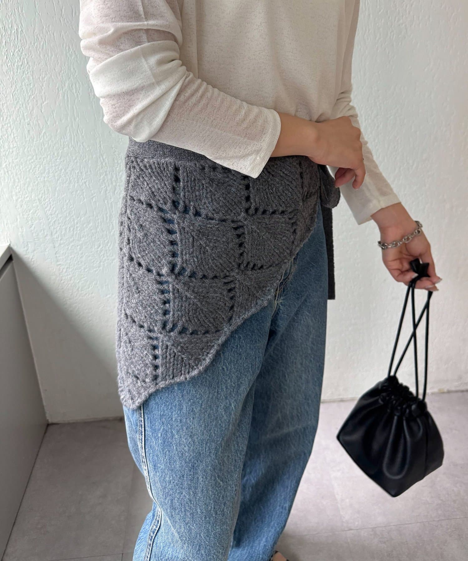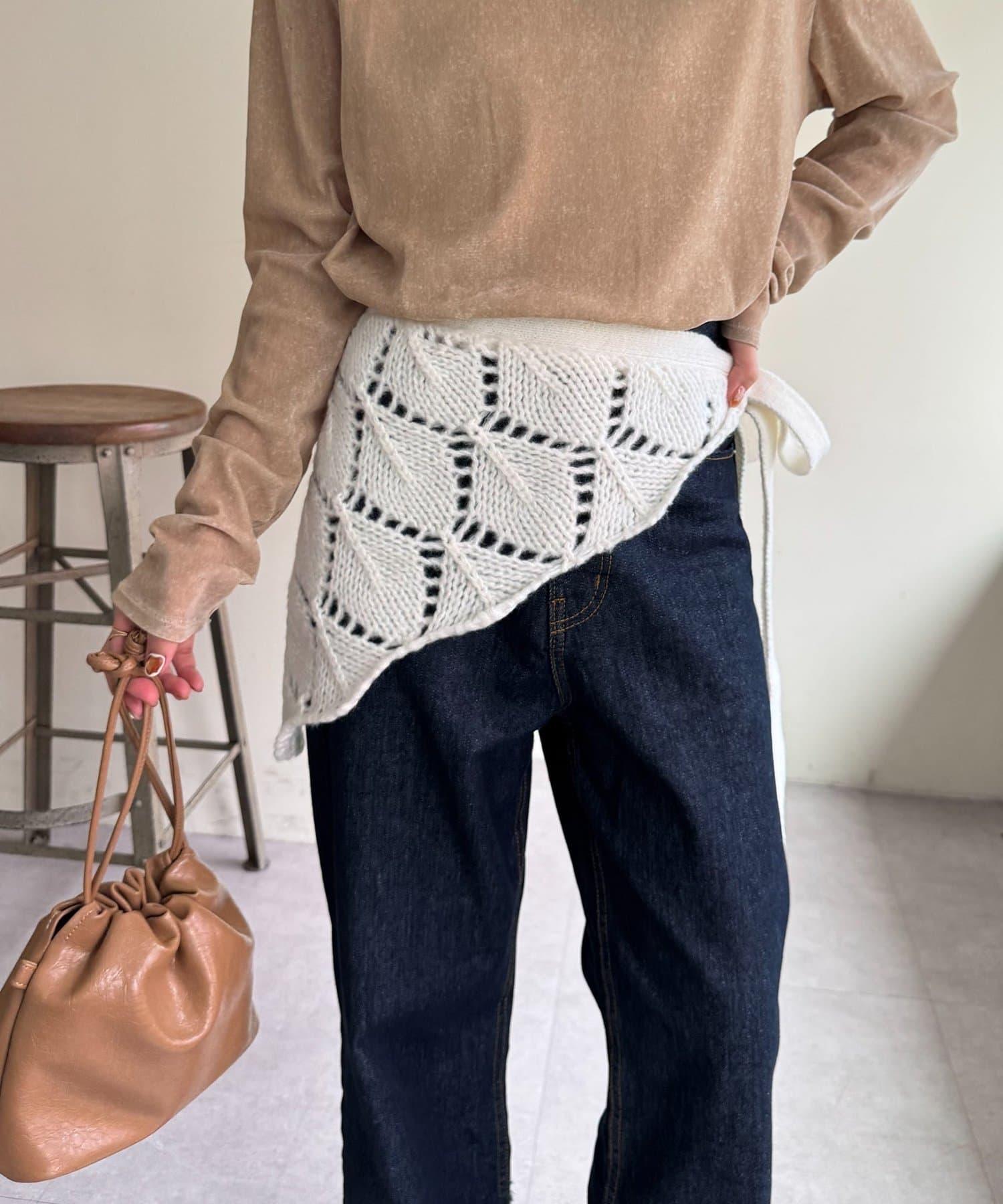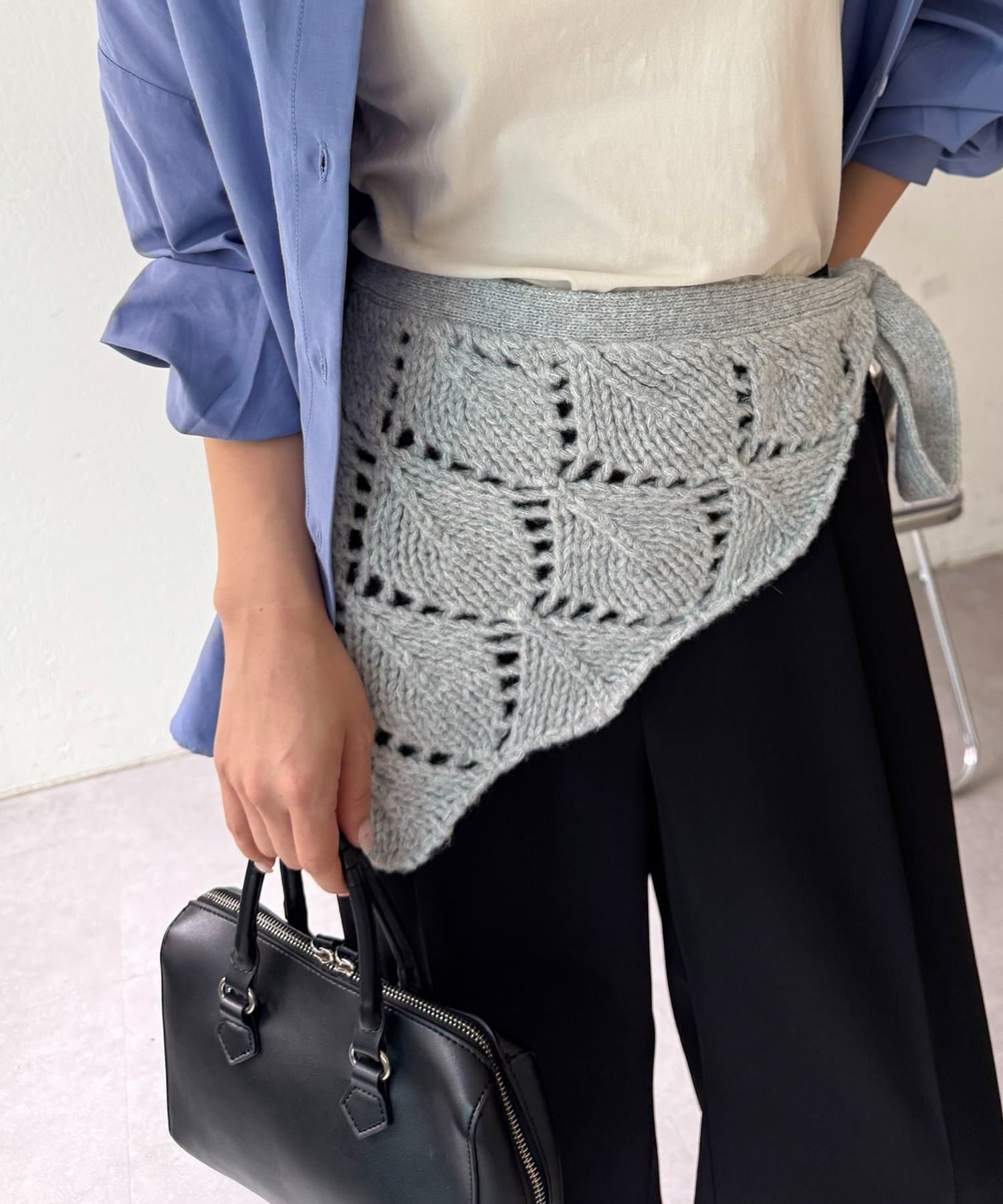 立体感のあるかぎ編みデザインがポイントで、シンプルなトップスやボトムに合わせるだけでこなれ感のあるスタイリングが完成します。