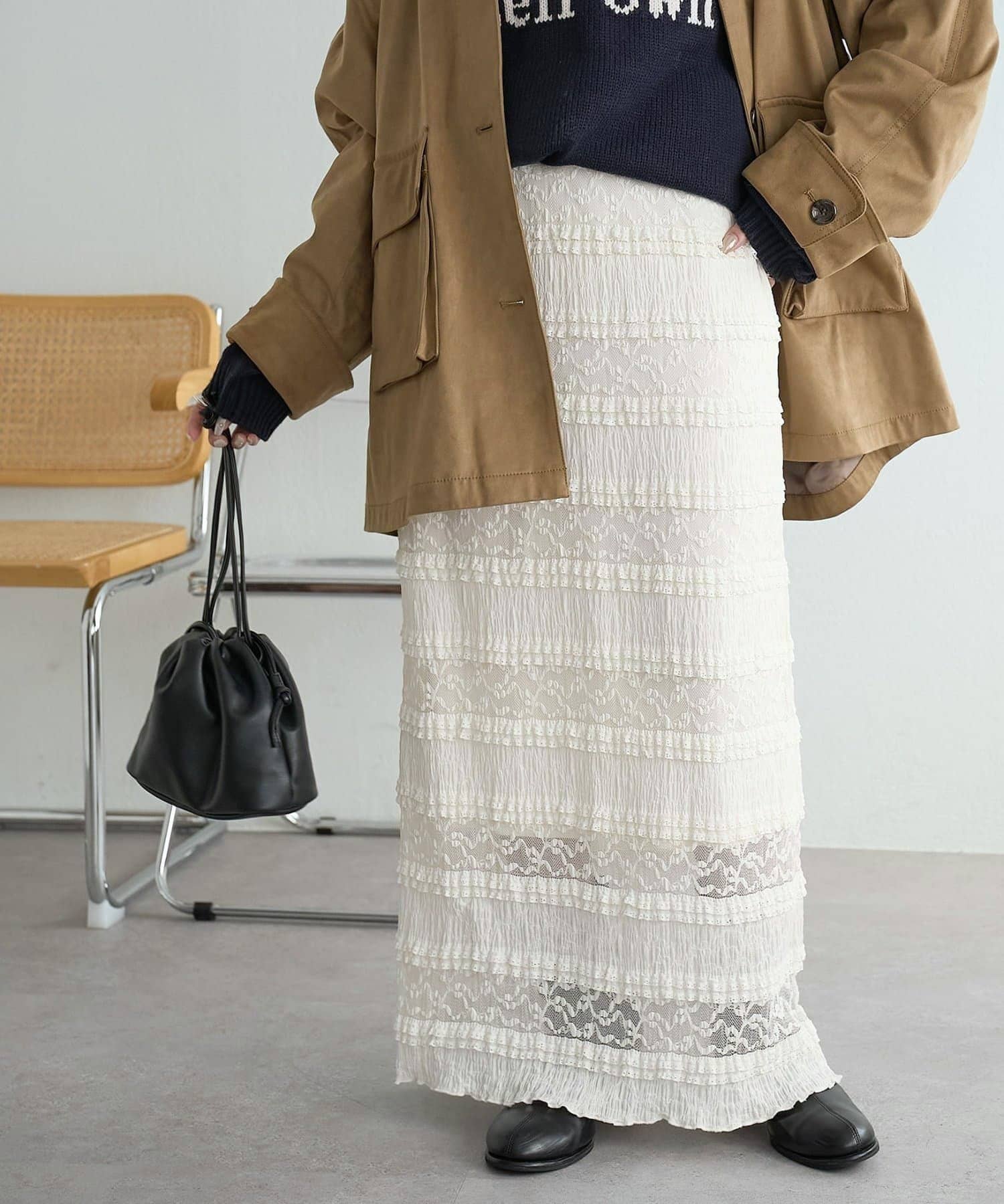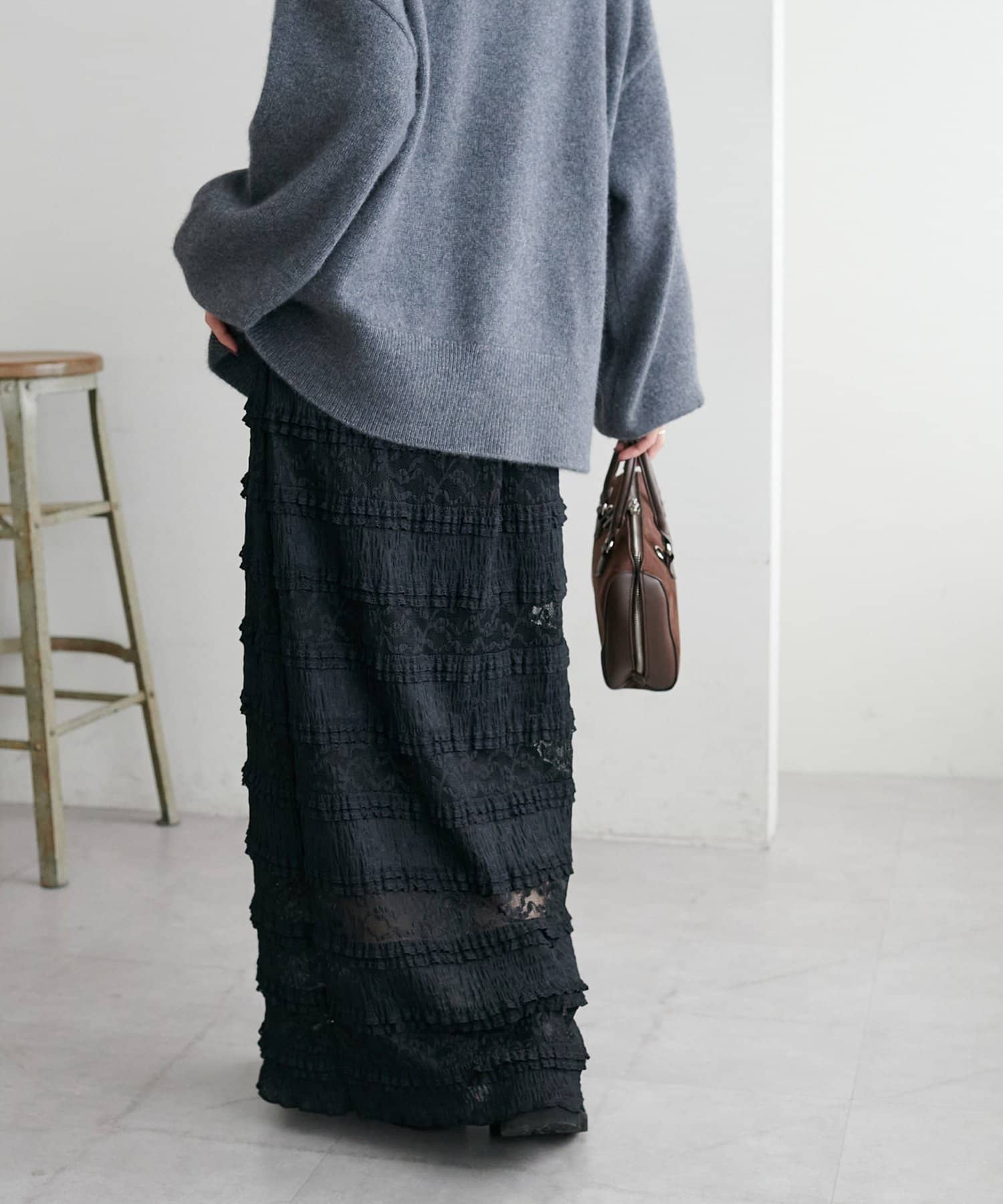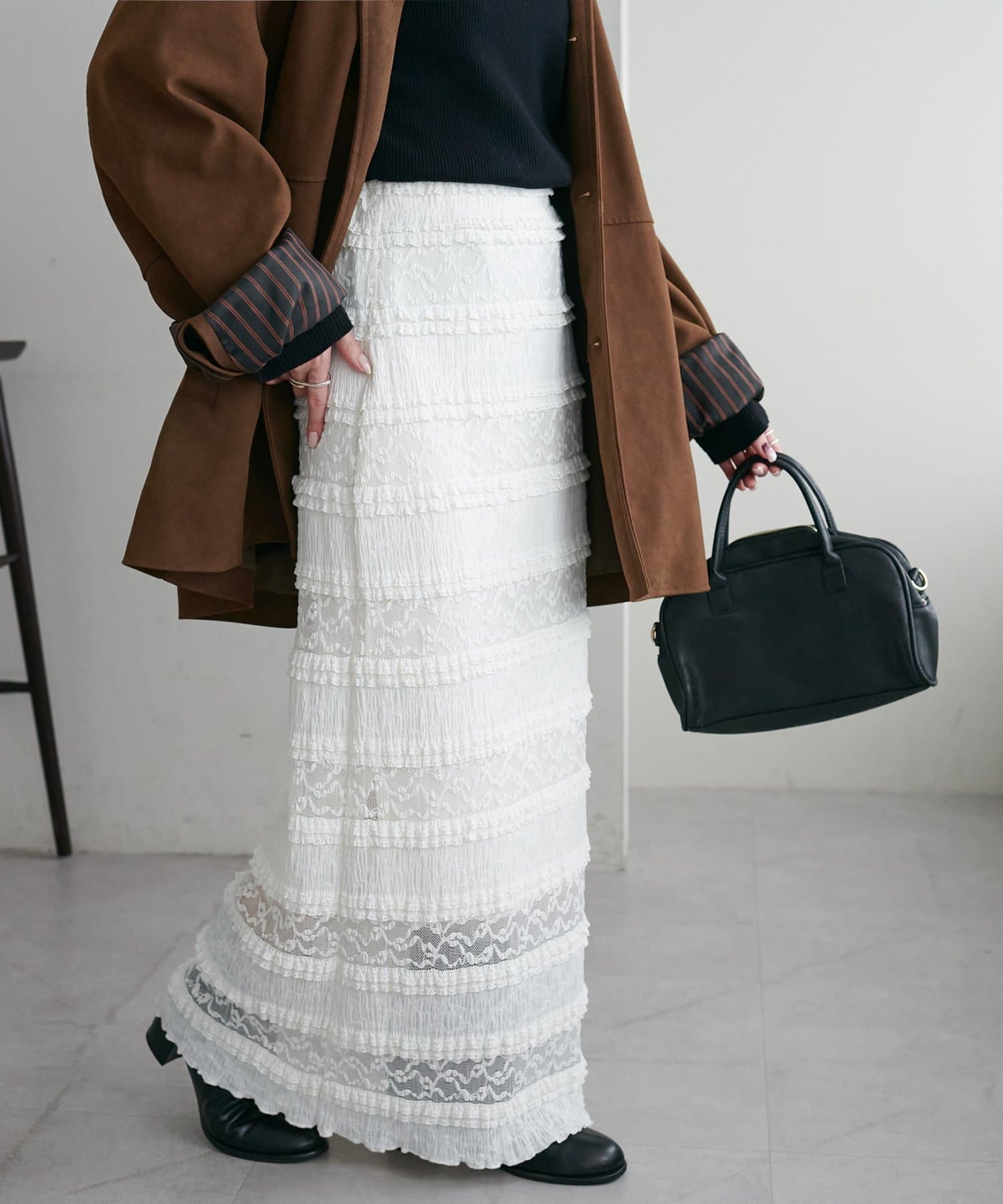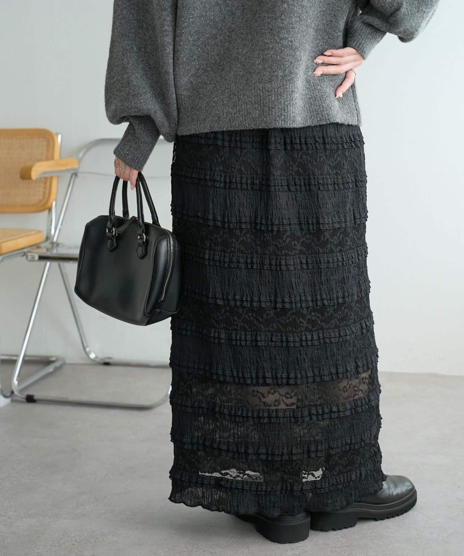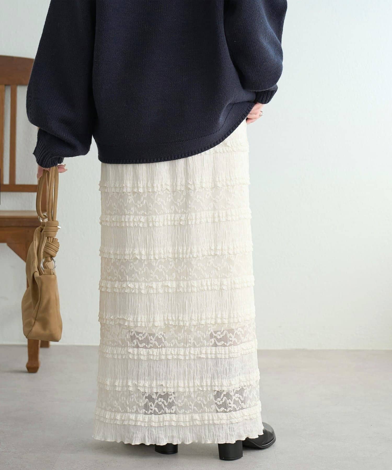 Iラインが綺麗に見えるナロースカートにレースとプリーツを切り替えたことで、腰回りやヒップ周りをさり気なくカバーしてくれます〇
