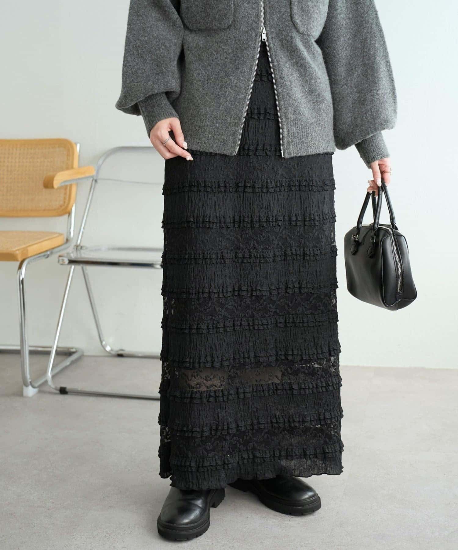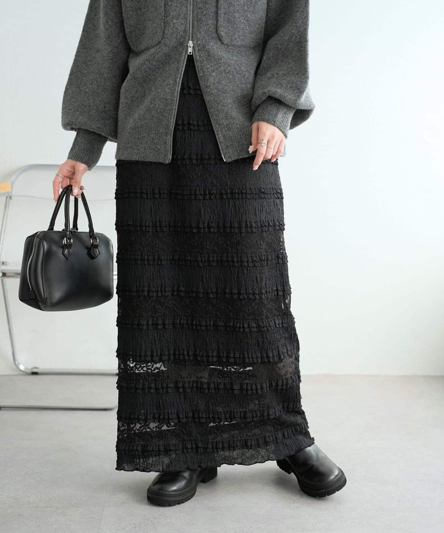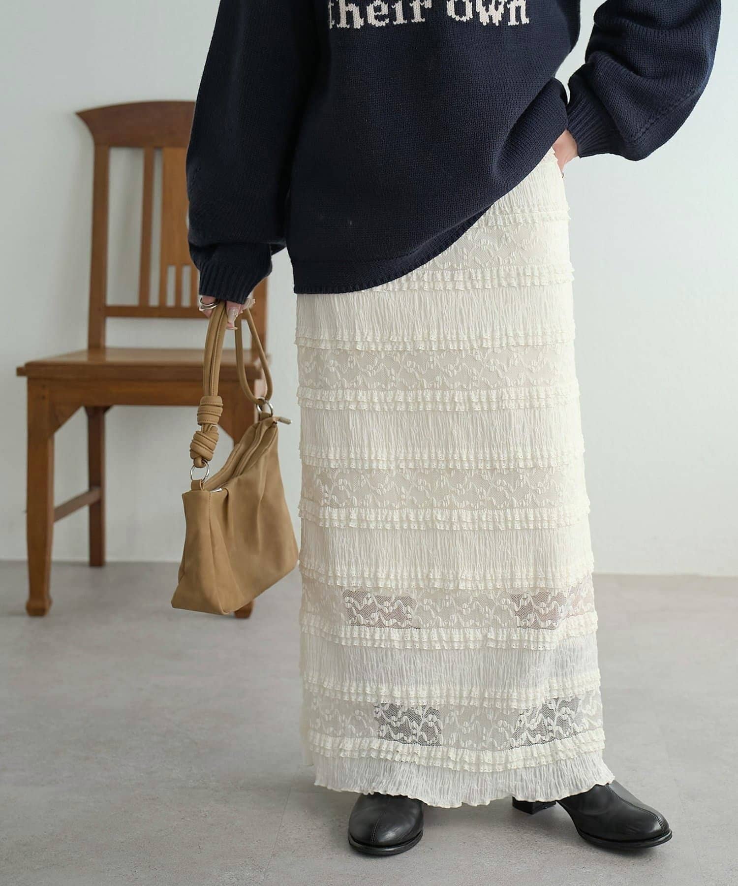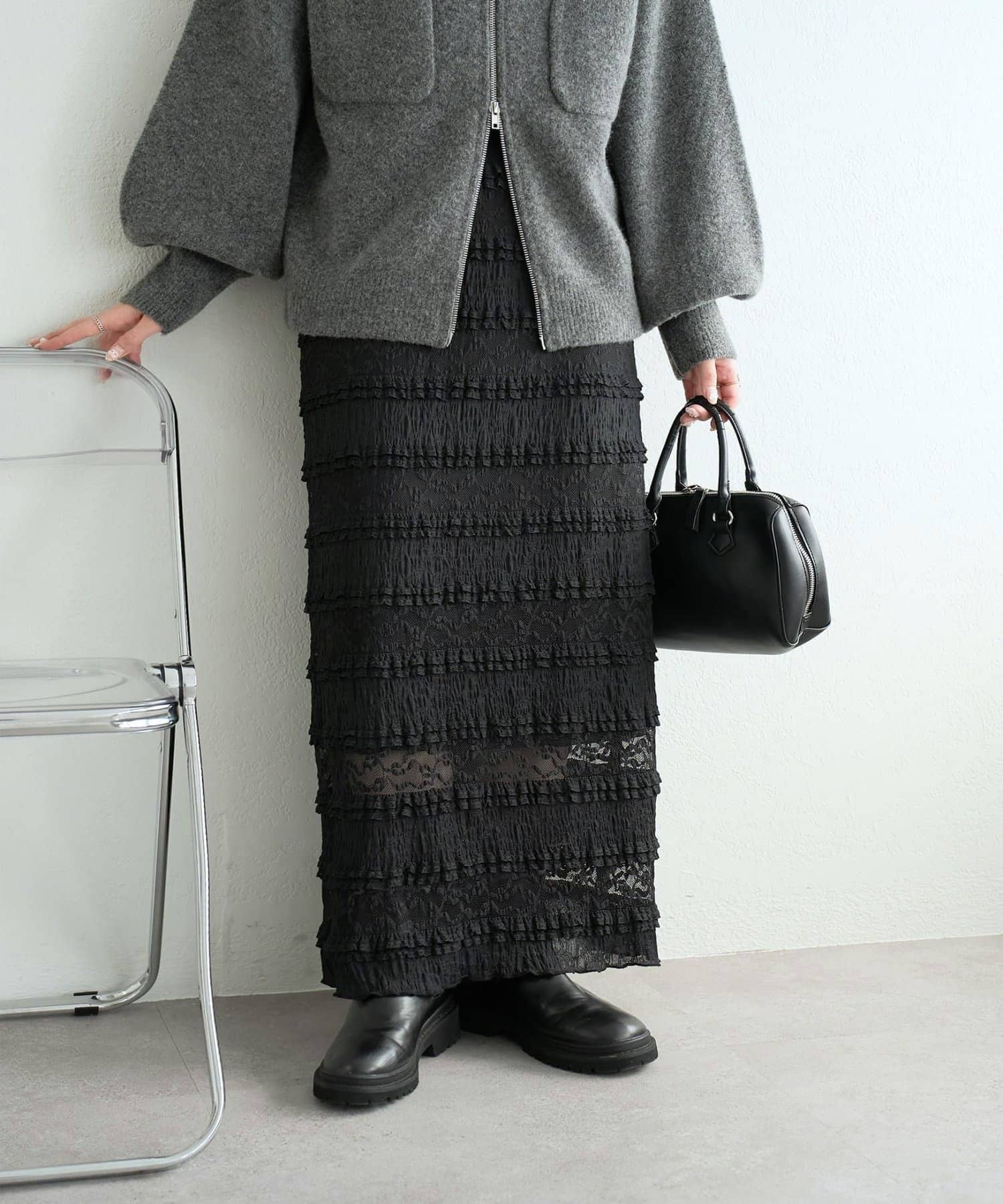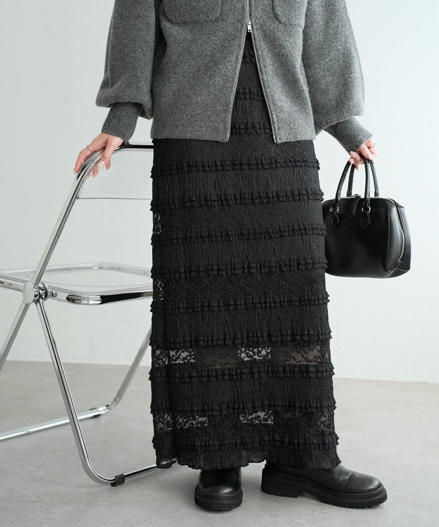 Iラインが綺麗に見えるナロースカートにレースとプリーツを切り替えたことで、腰回りやヒップ周りをさり気なくカバーしてくれます〇