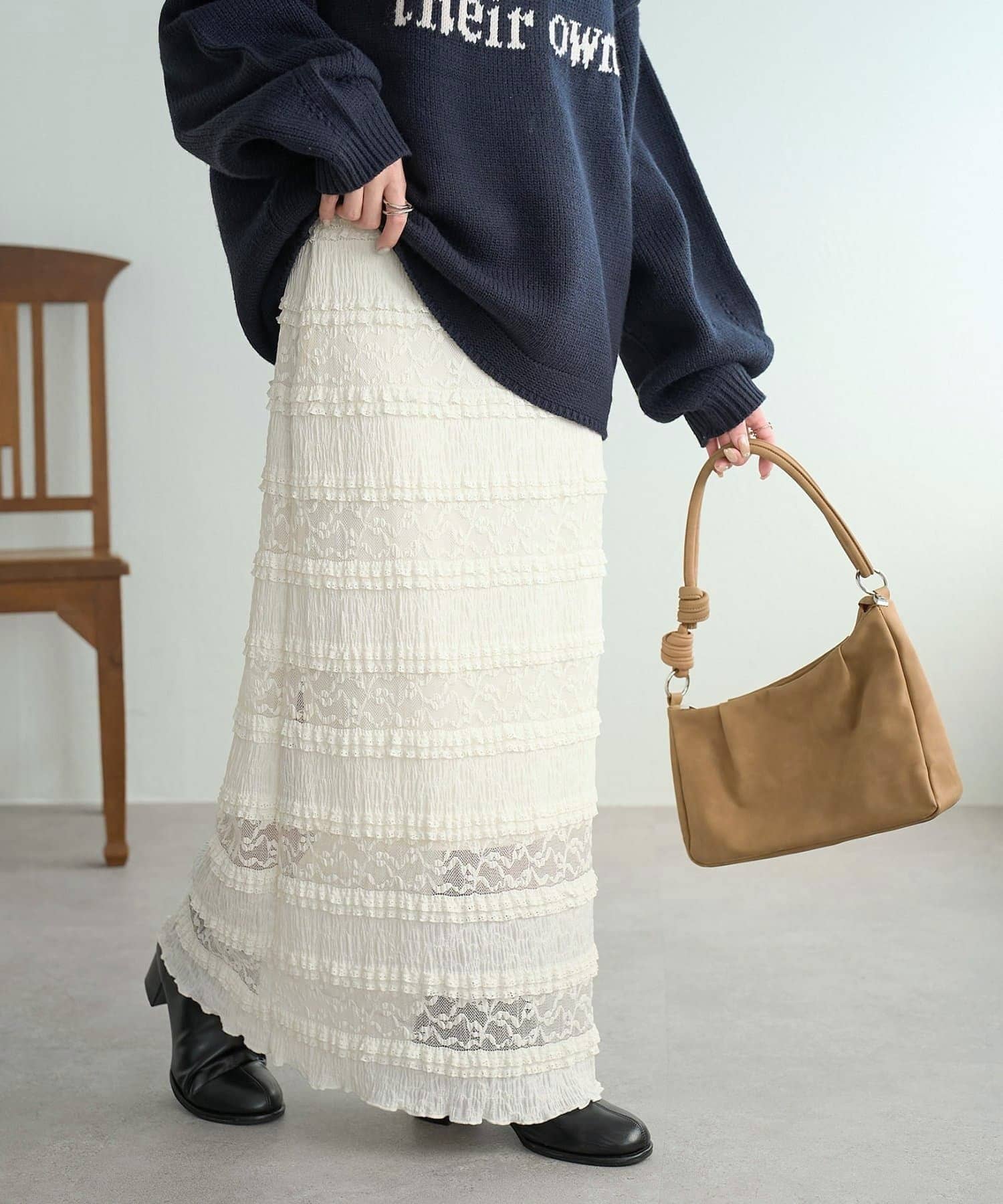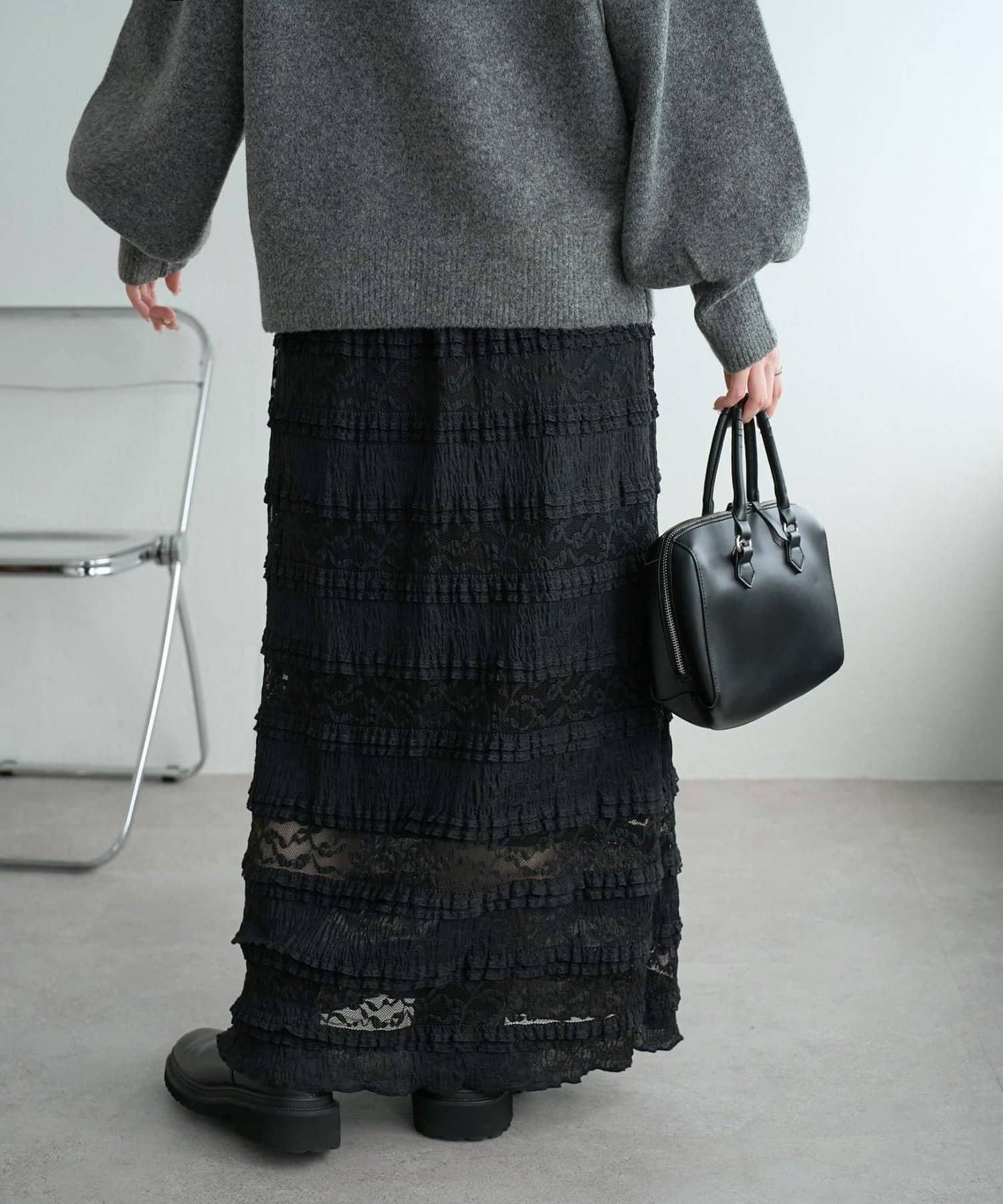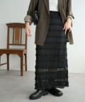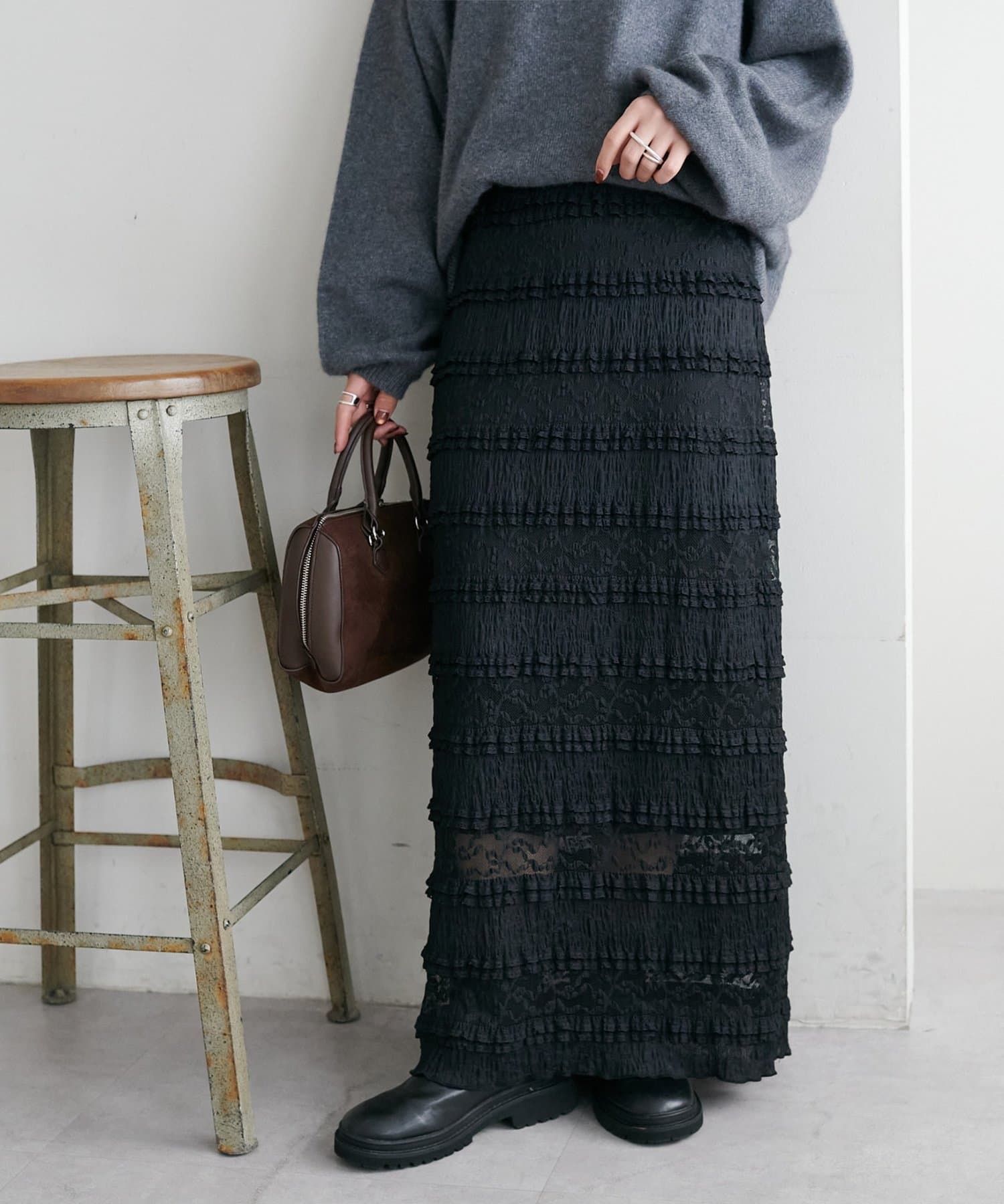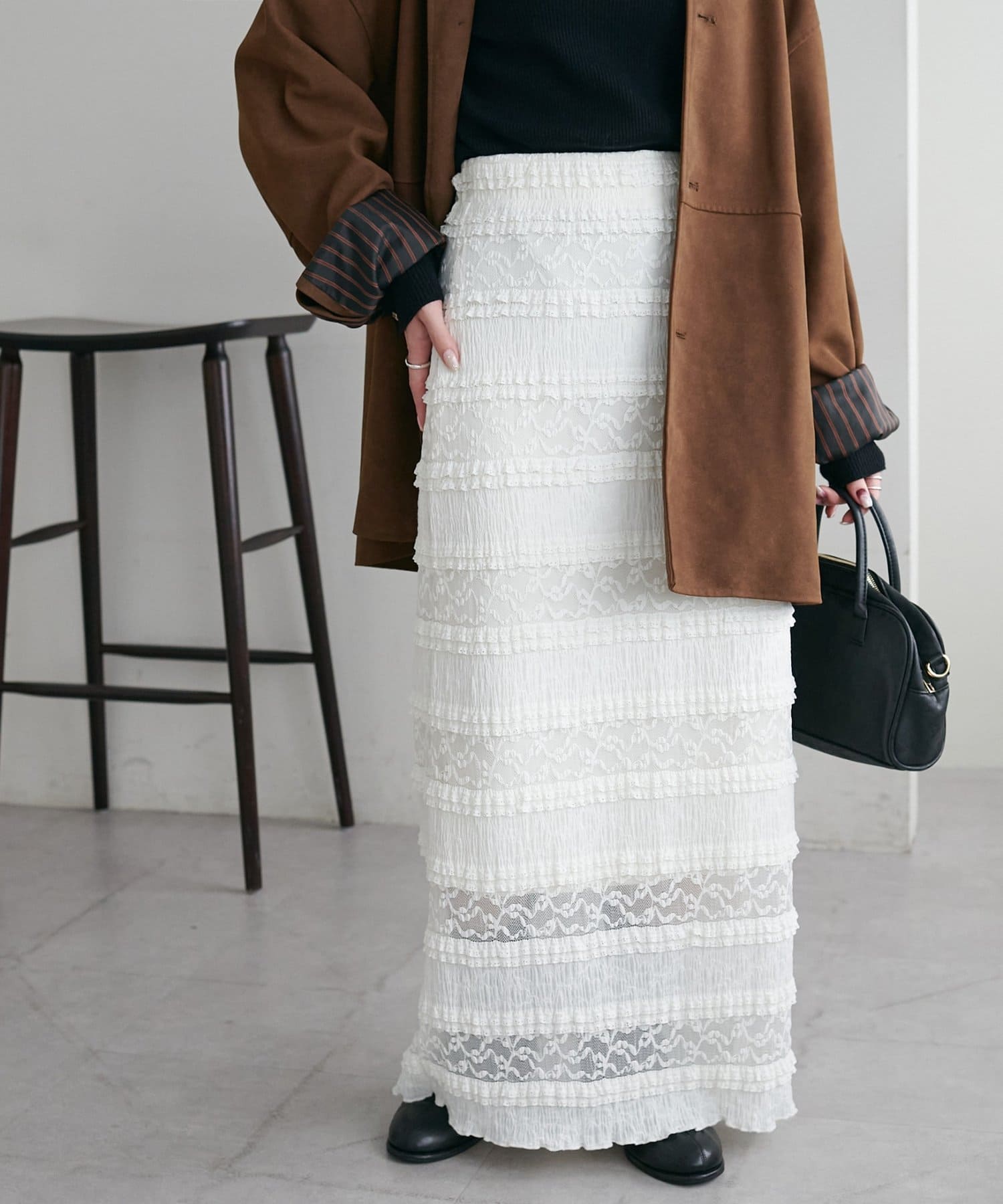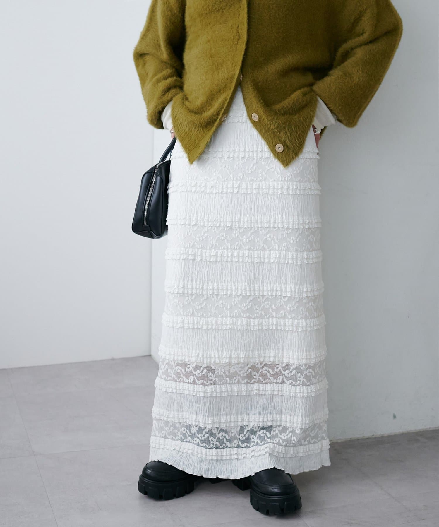 Iラインが綺麗に見えるナロースカートにレースとプリーツを切り替えたことで、腰回りやヒップ周りをさり気なくカバーしてくれます〇