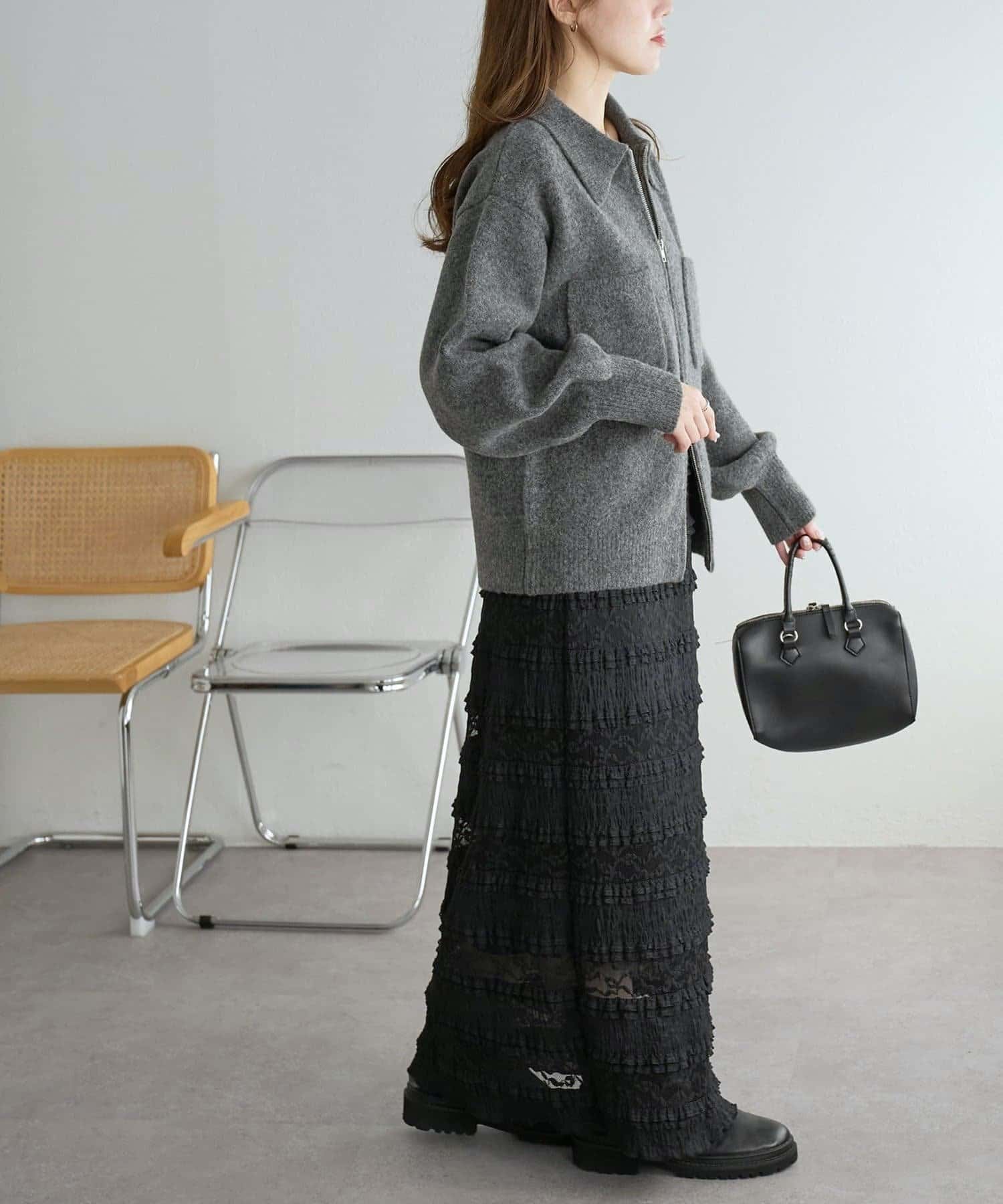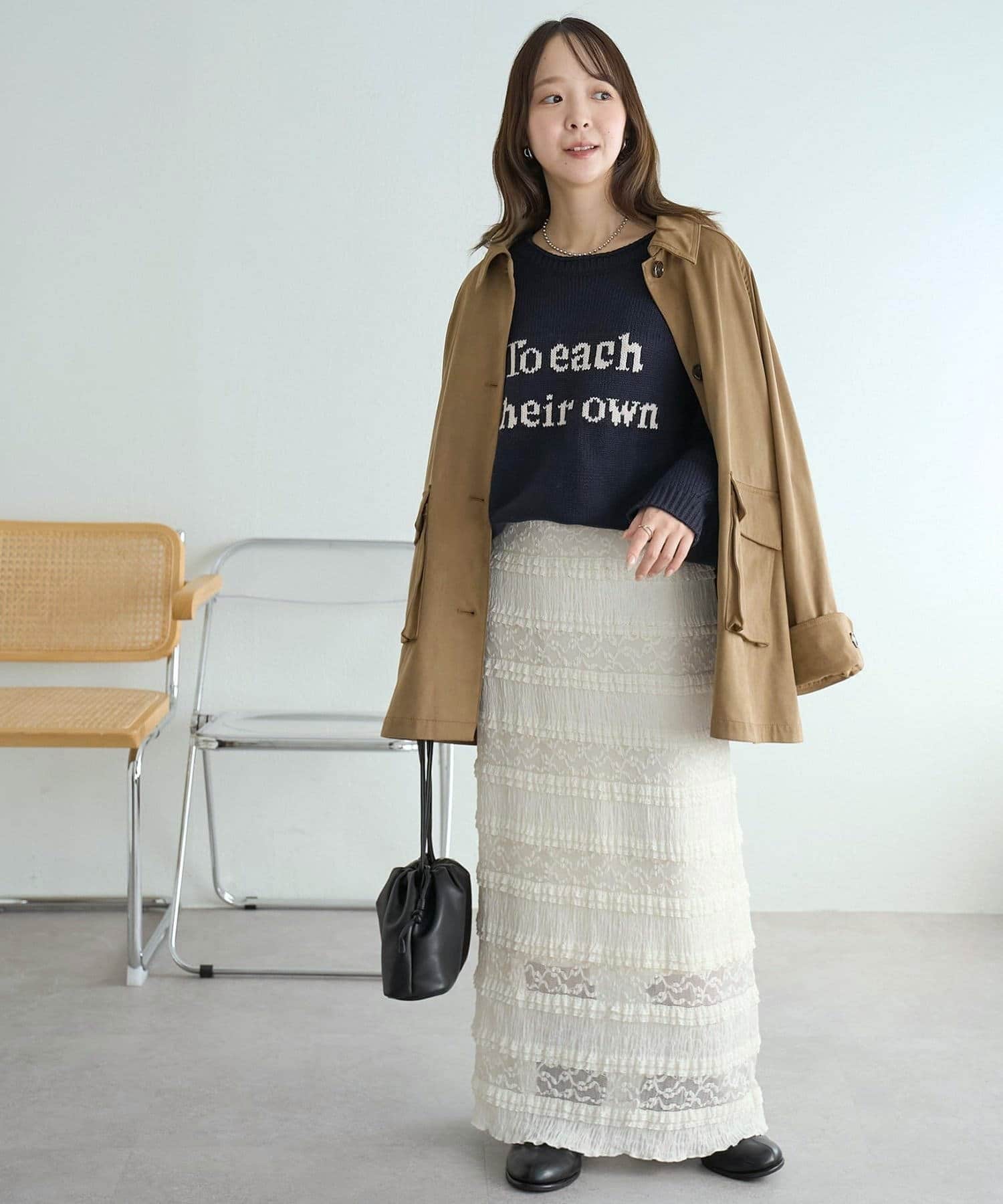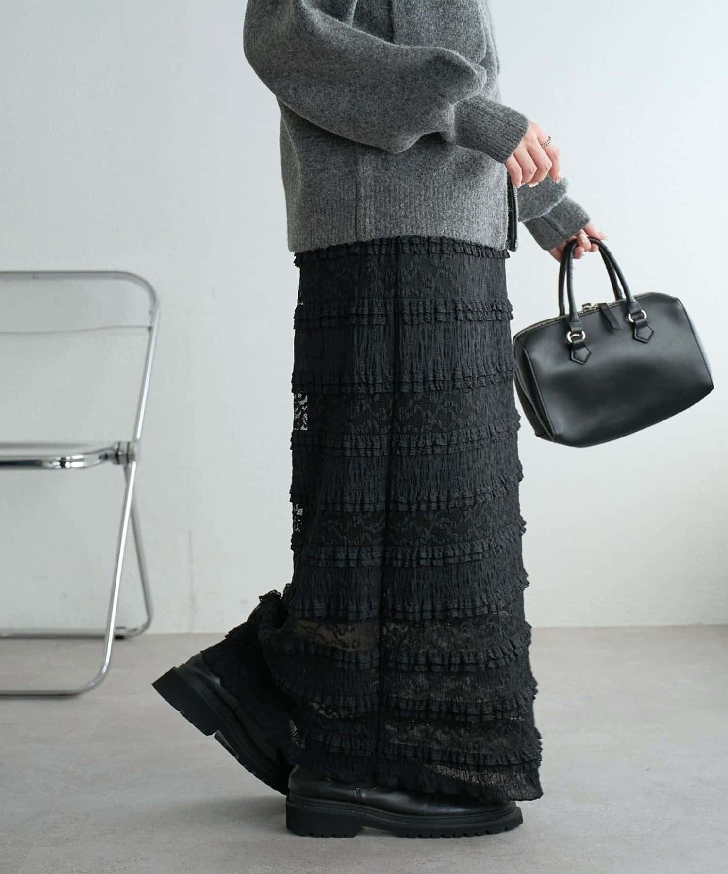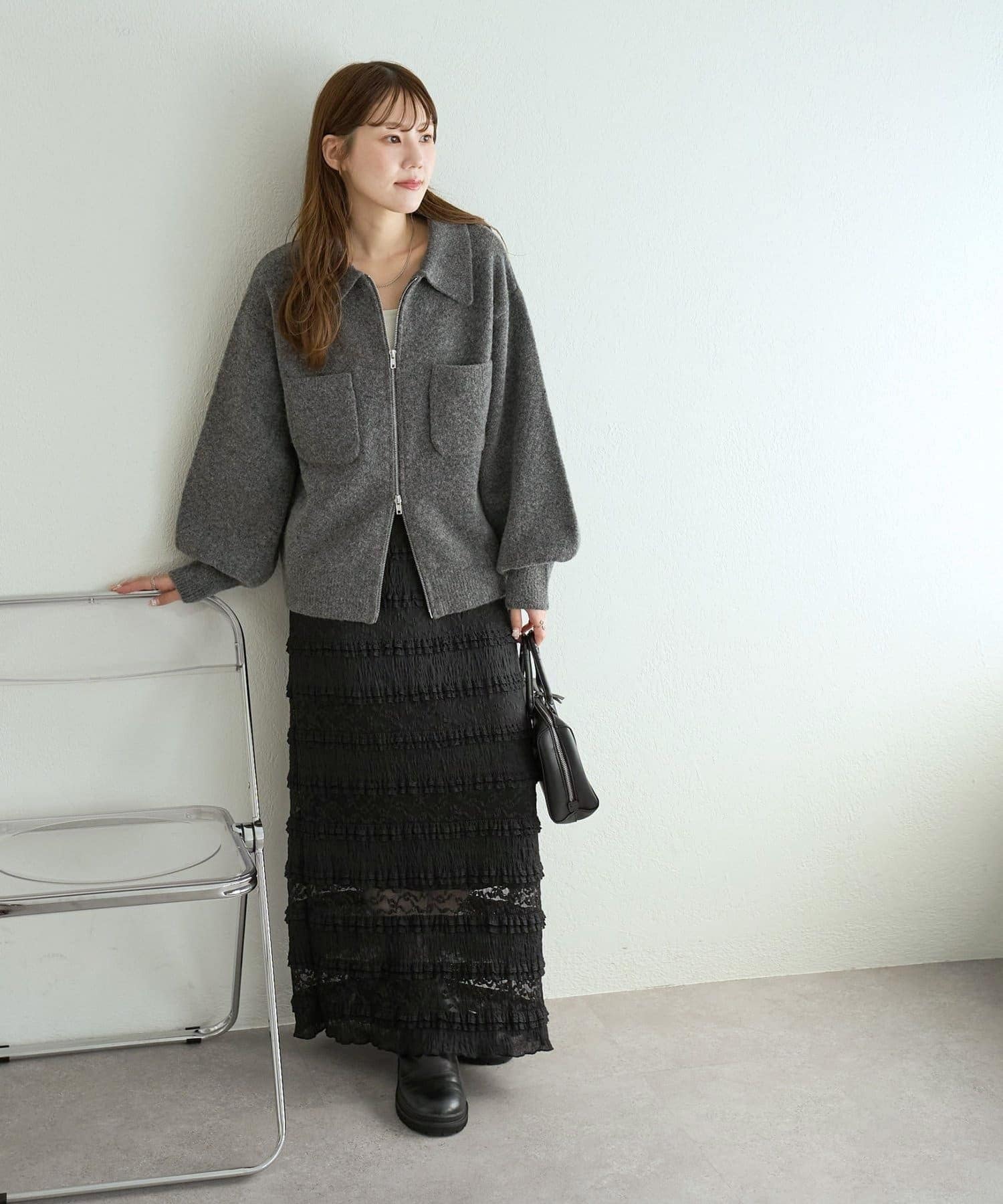 153cmスタッフ:Fサイズなので、ブーツや高さのある靴合わせがおすすめです。足元は透け感があるので、重たく見えにくく死産な抜け感が出ます!ウエスト部分までレースのデザインが入っているので、トップスをインしたもウエストラインが綺麗に見えます〇
