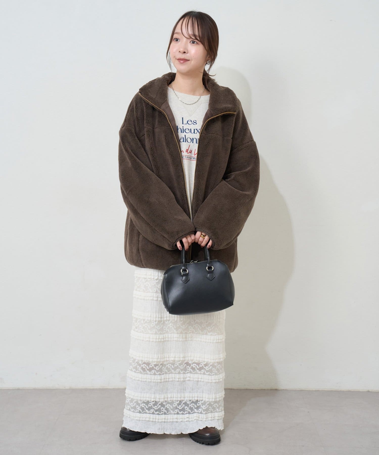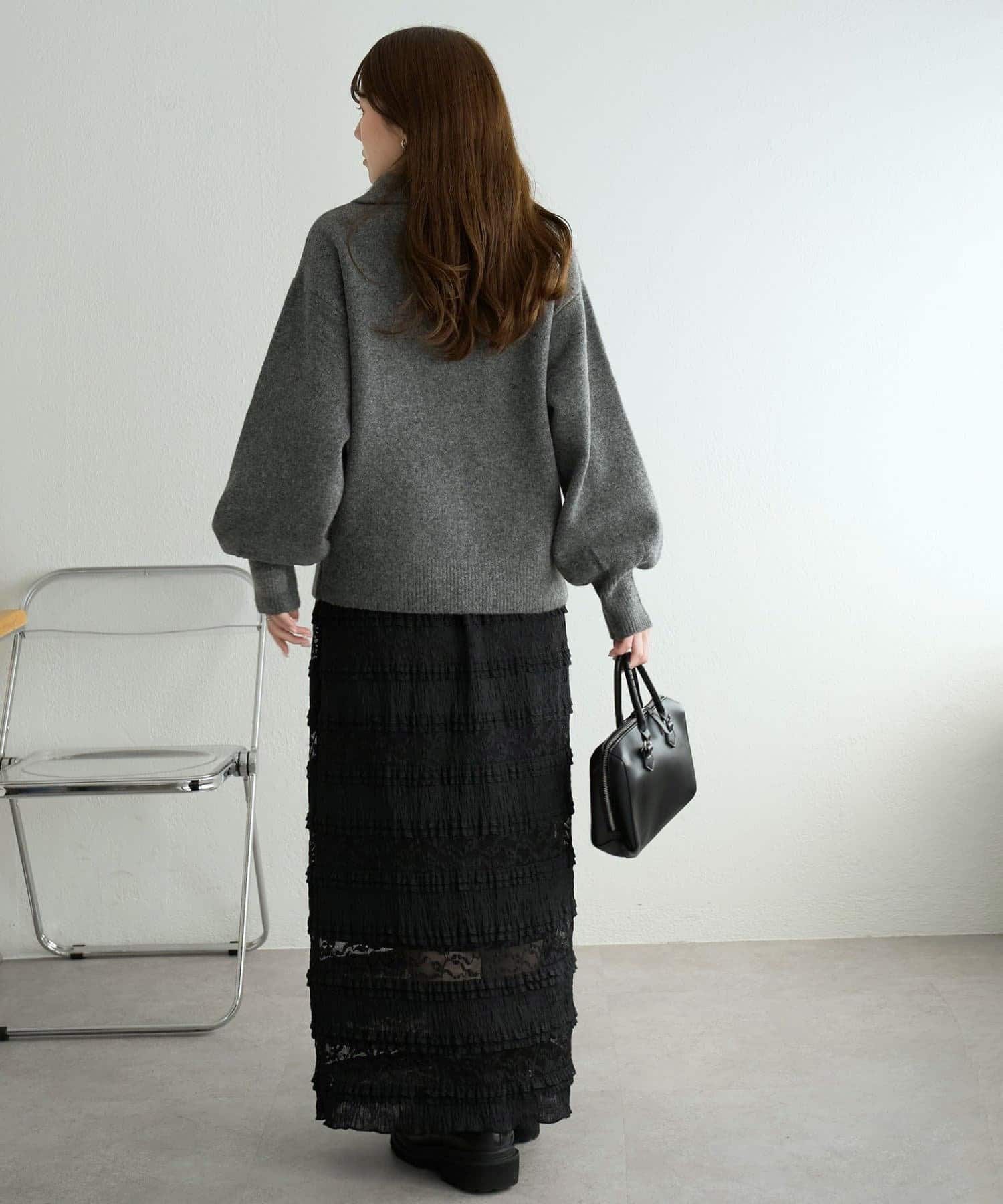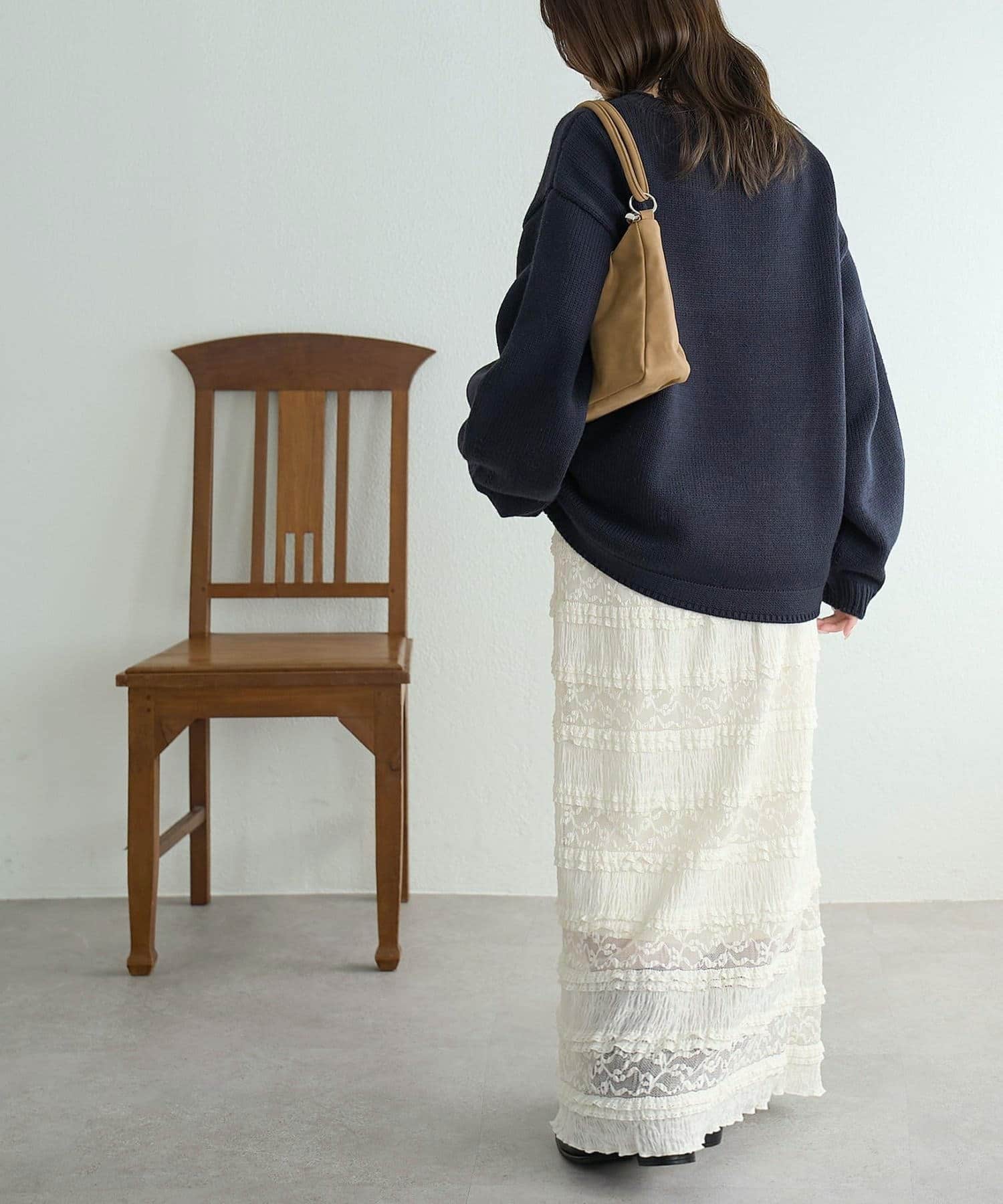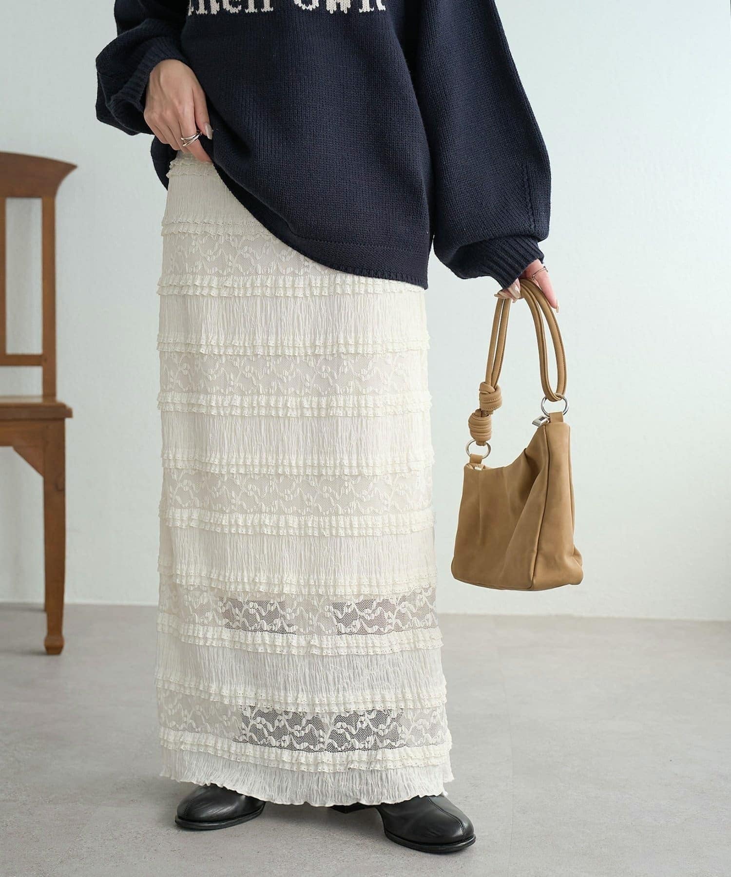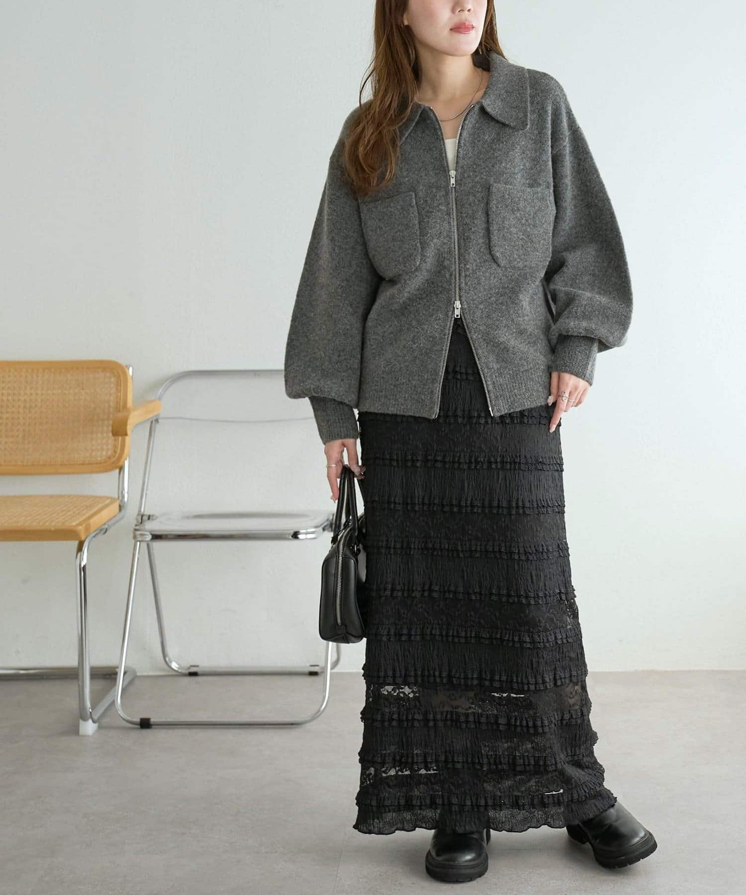 153cmスタッフ:Fサイズなので、ブーツや高さのある靴合わせがおすすめです。足元は透け感があるので、重たく見えにくく死産な抜け感が出ます!ウエスト部分までレースのデザインが入っているので、トップスをインしたもウエストラインが綺麗に見えます〇