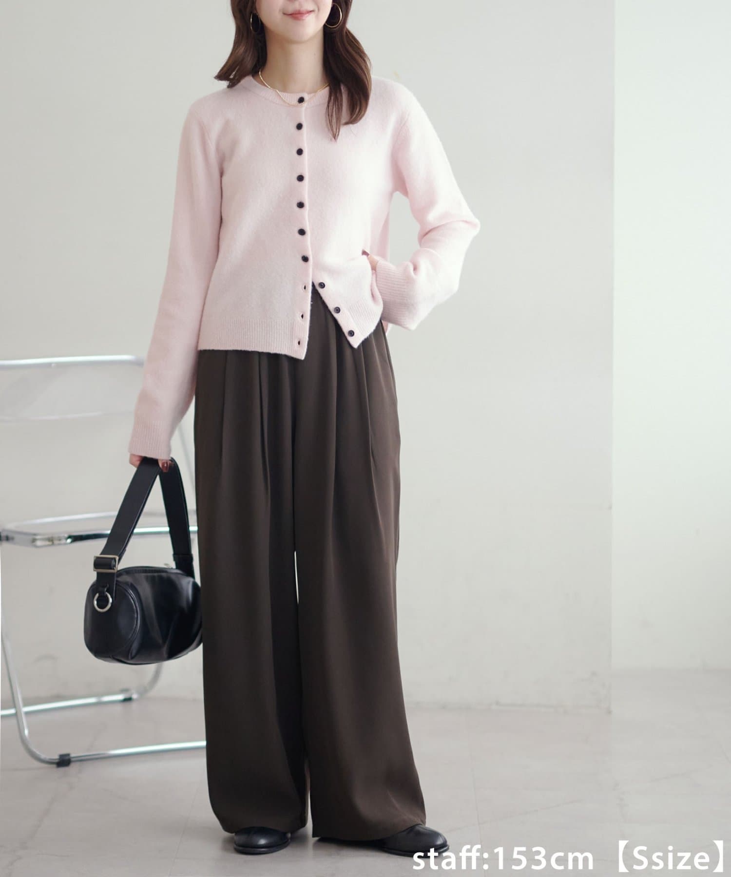 158cmスタッフ(Mサイズ着用):ペタンコで合わせても裾を引きずらず、綺麗に履くことができる丈感です。
