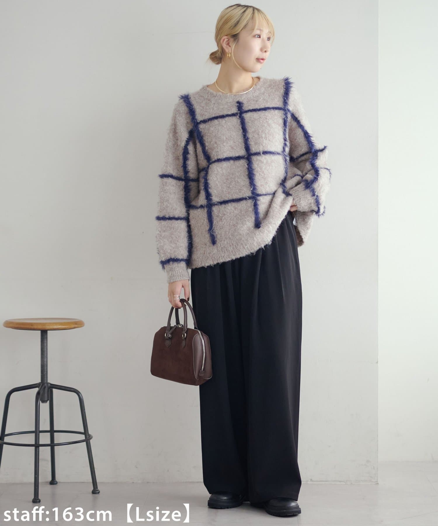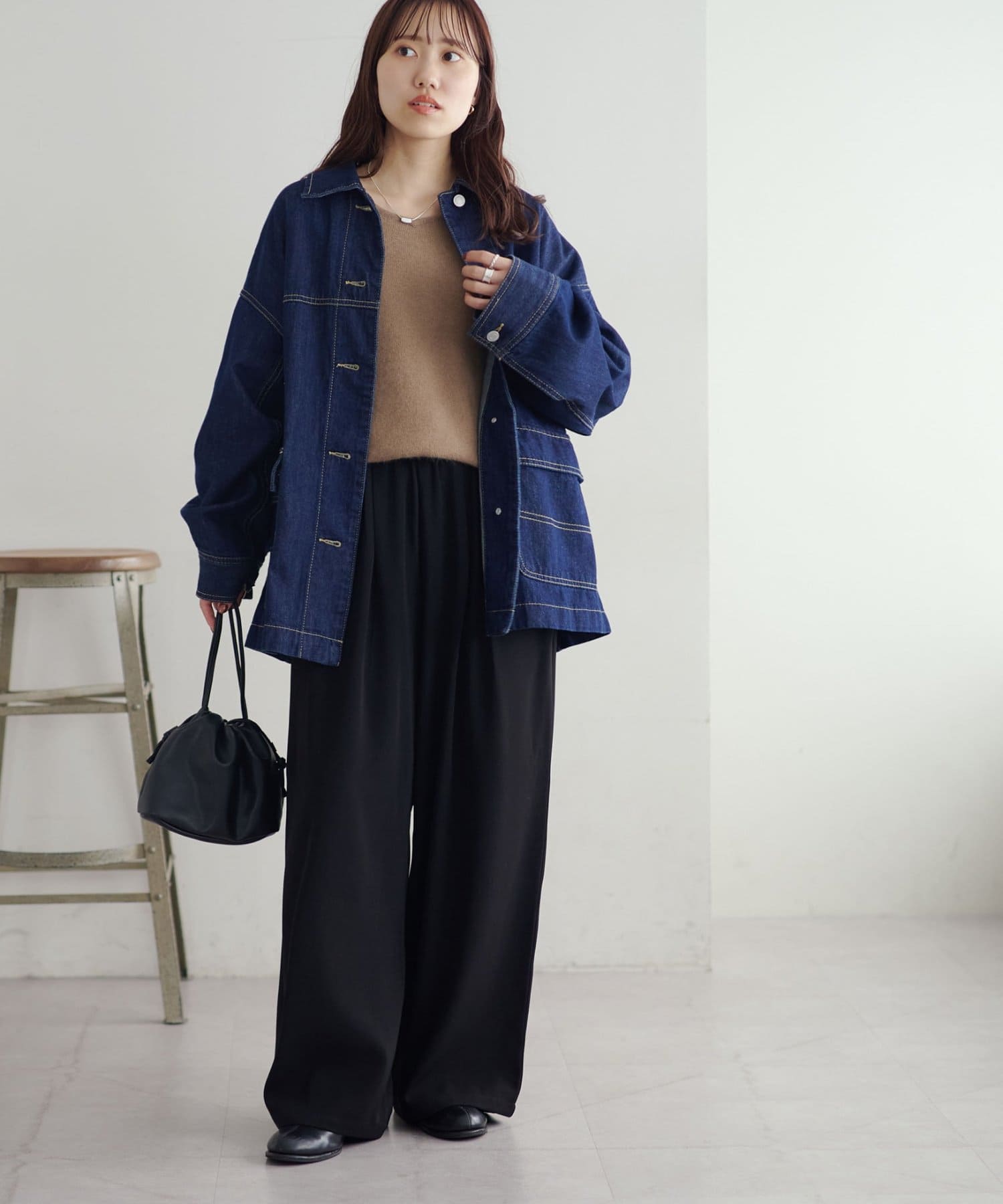 153cmスタッフ(Sサイズ着用):ストンと落ち感のあるシルエットです。ラフに着こなしたいときはスニーカー合わせで足元にたるみ感を出すのがおすすめ!ヒールを合わせると綺麗なシルエットになるので、テイストに合わせて足元も変えながら合わせるのがおすすめです。