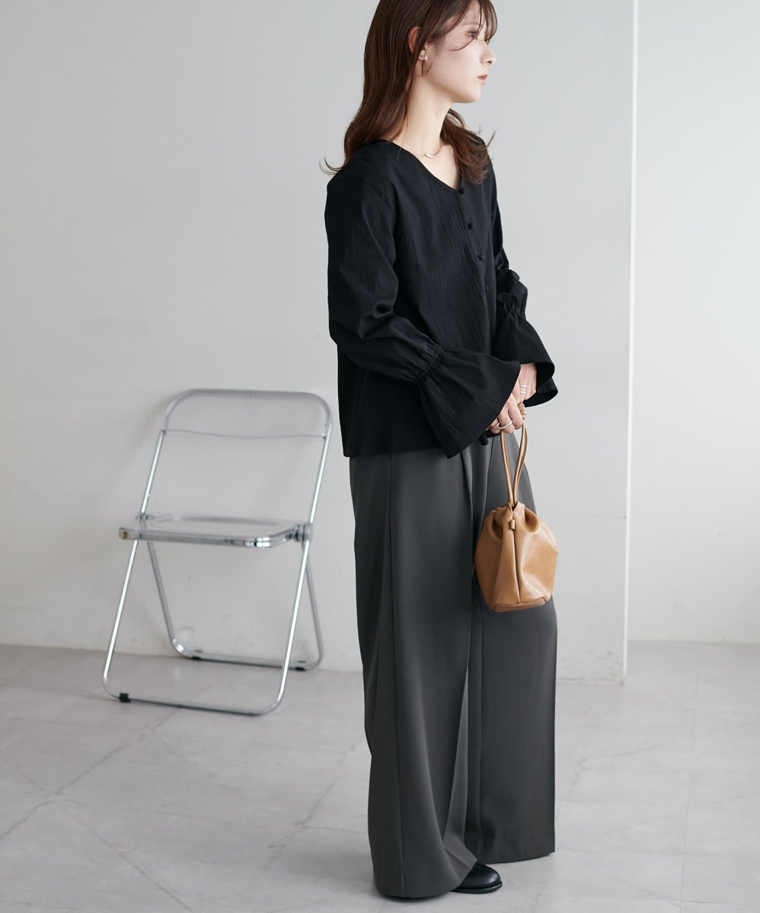 ボトムスはテーパードパンツやワイドパンツを合わせてきれいめに。デニムと合わせてカジュアルダウンしても◎