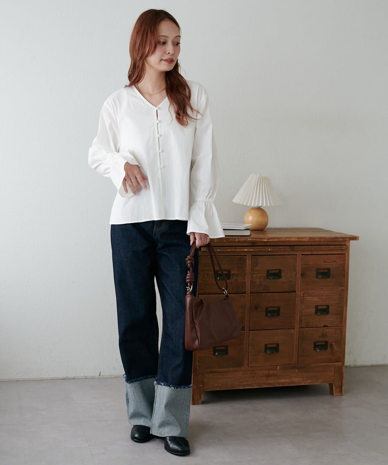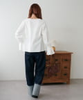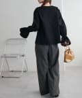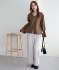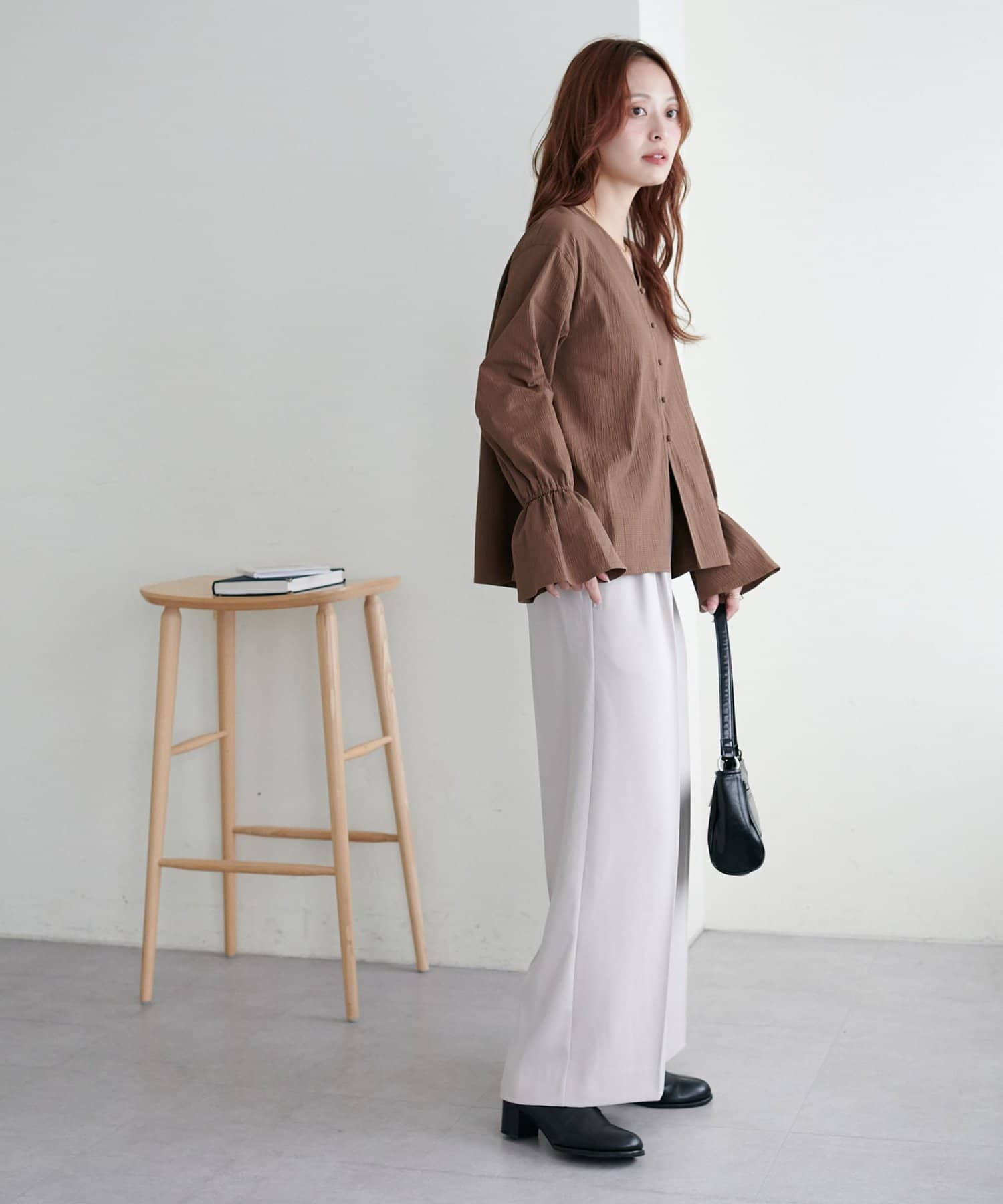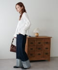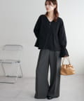 ボトムスはテーパードパンツやワイドパンツを合わせてきれいめに。デニムと合わせてカジュアルダウンしても◎