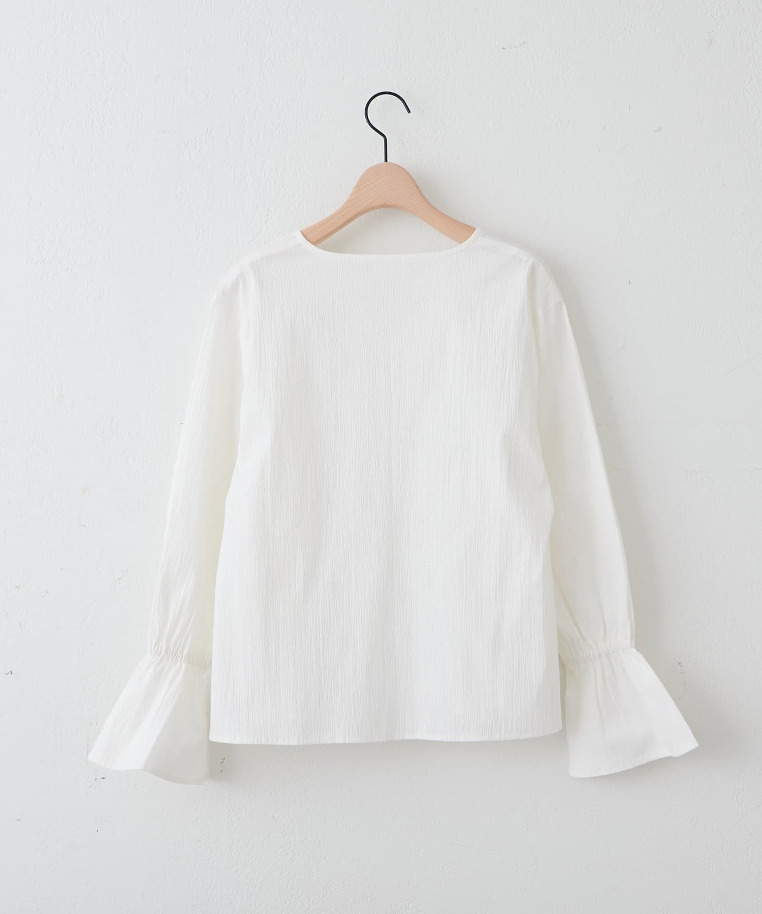 ややVネックの開きがデコルテをすっきり見せてくれ、女性らしさを引き立てます。