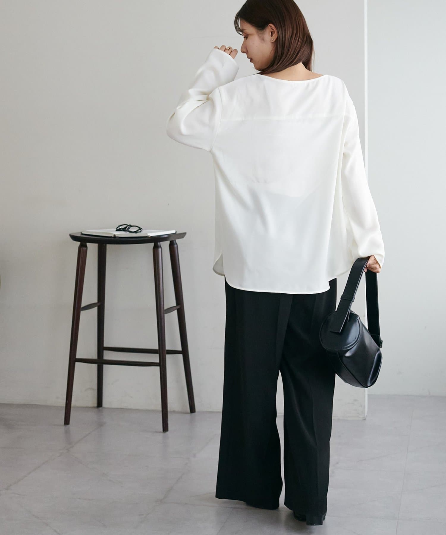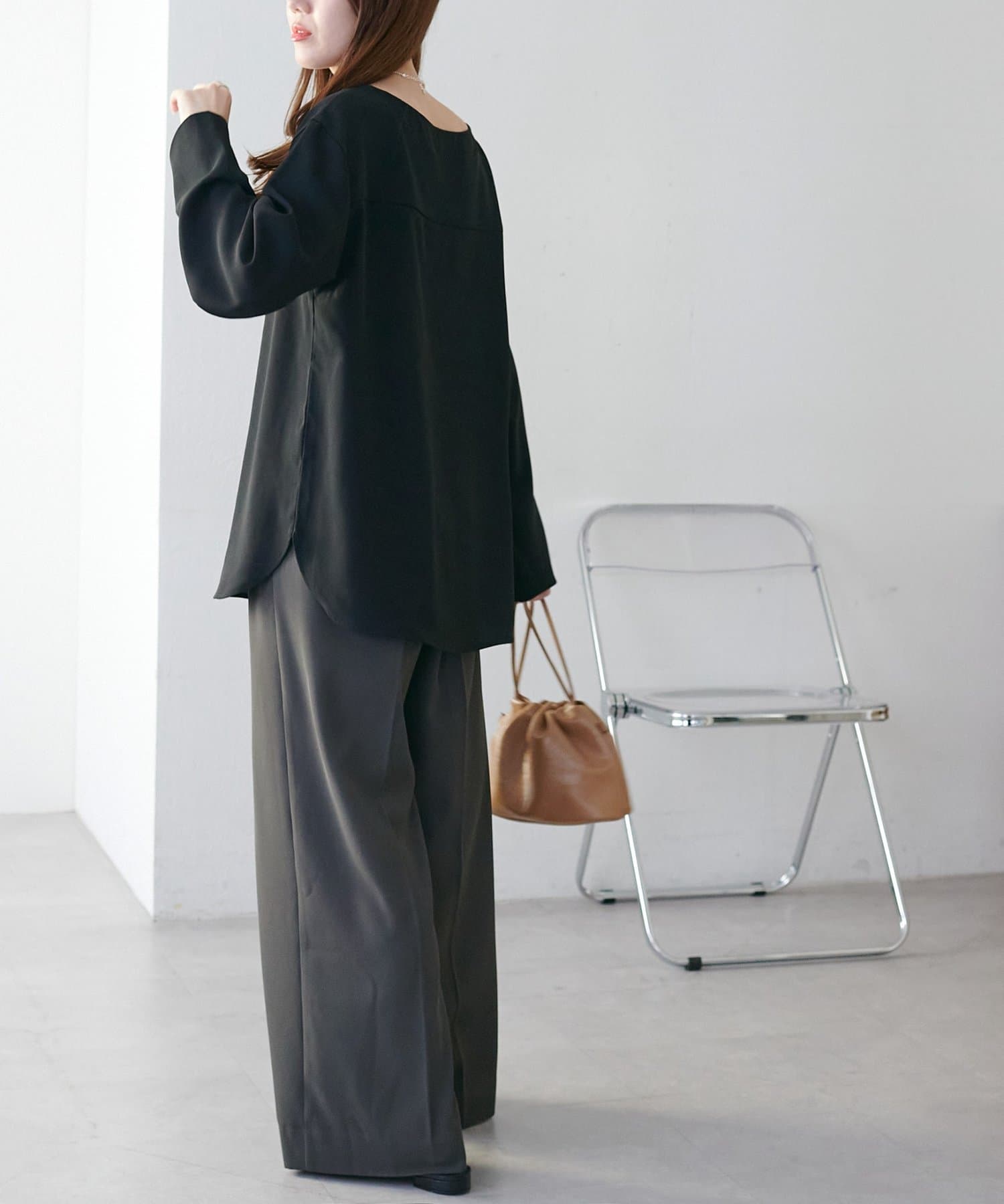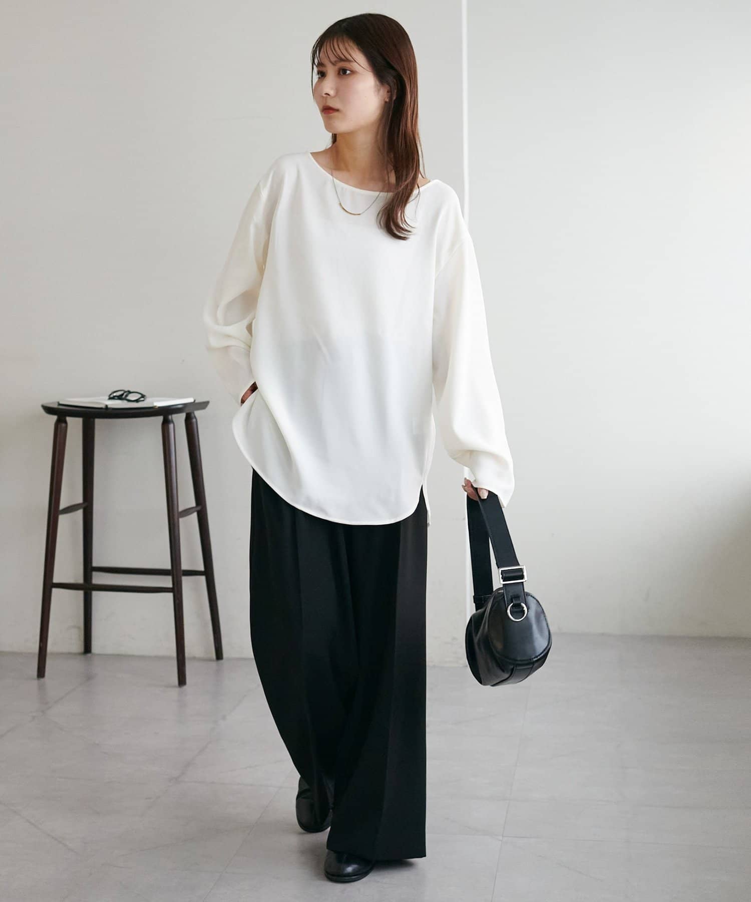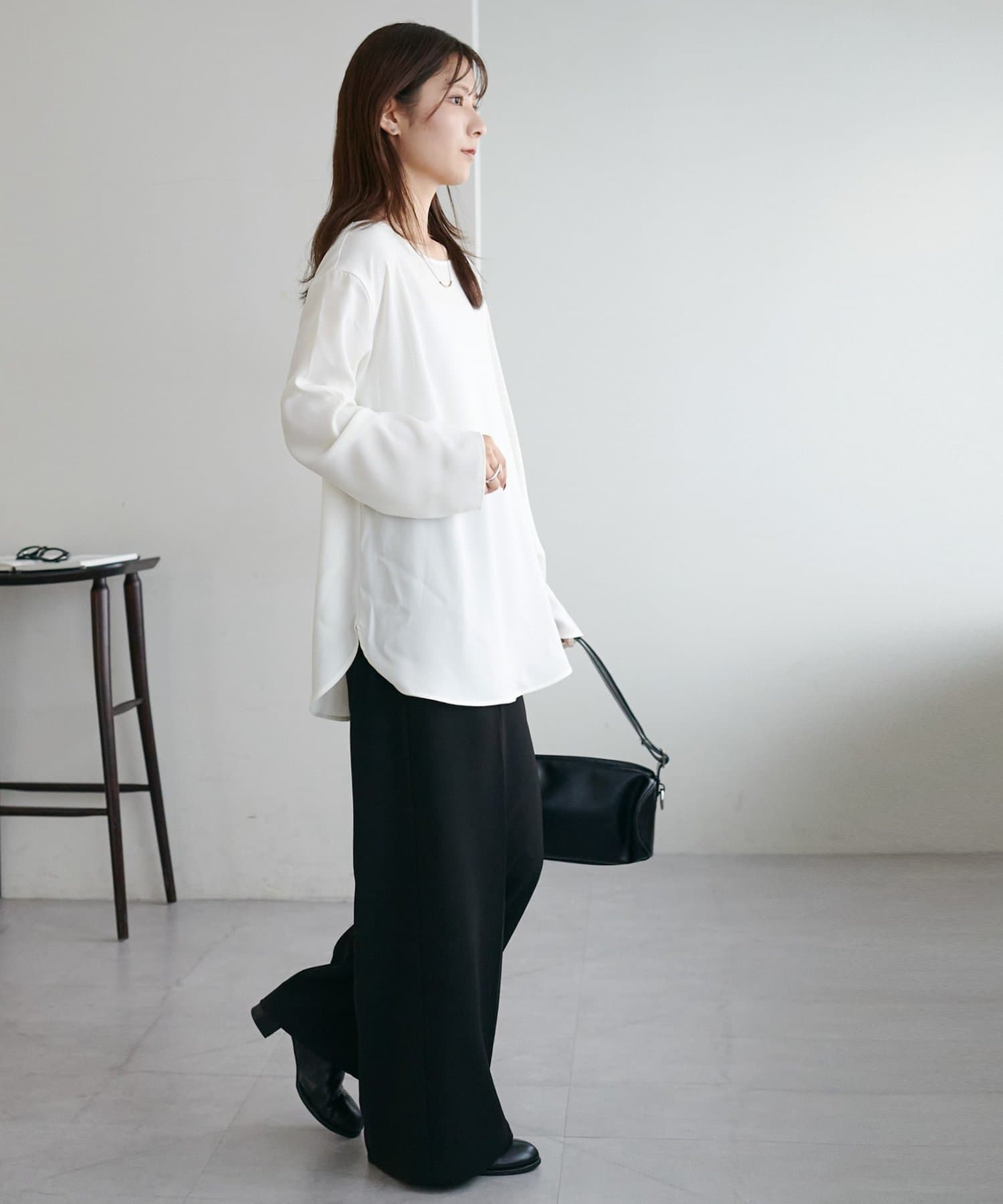 160cmスタッフ:シンプルなデザインですが、裾にスリットが入っていることで一枚でも様になります!着丈が長めなので、高身長の方にもおすすめ◎一枚持っていると、お仕事から学校行事、普段使いまで着回しできるブラウスです。