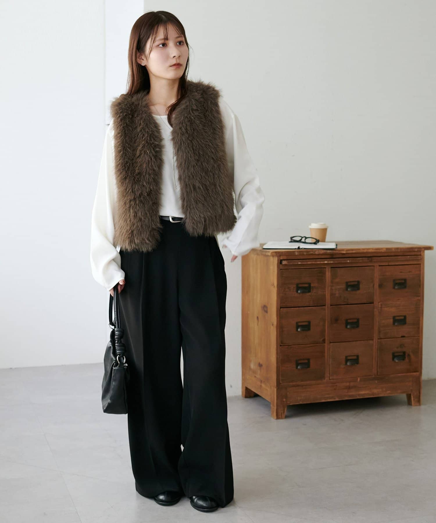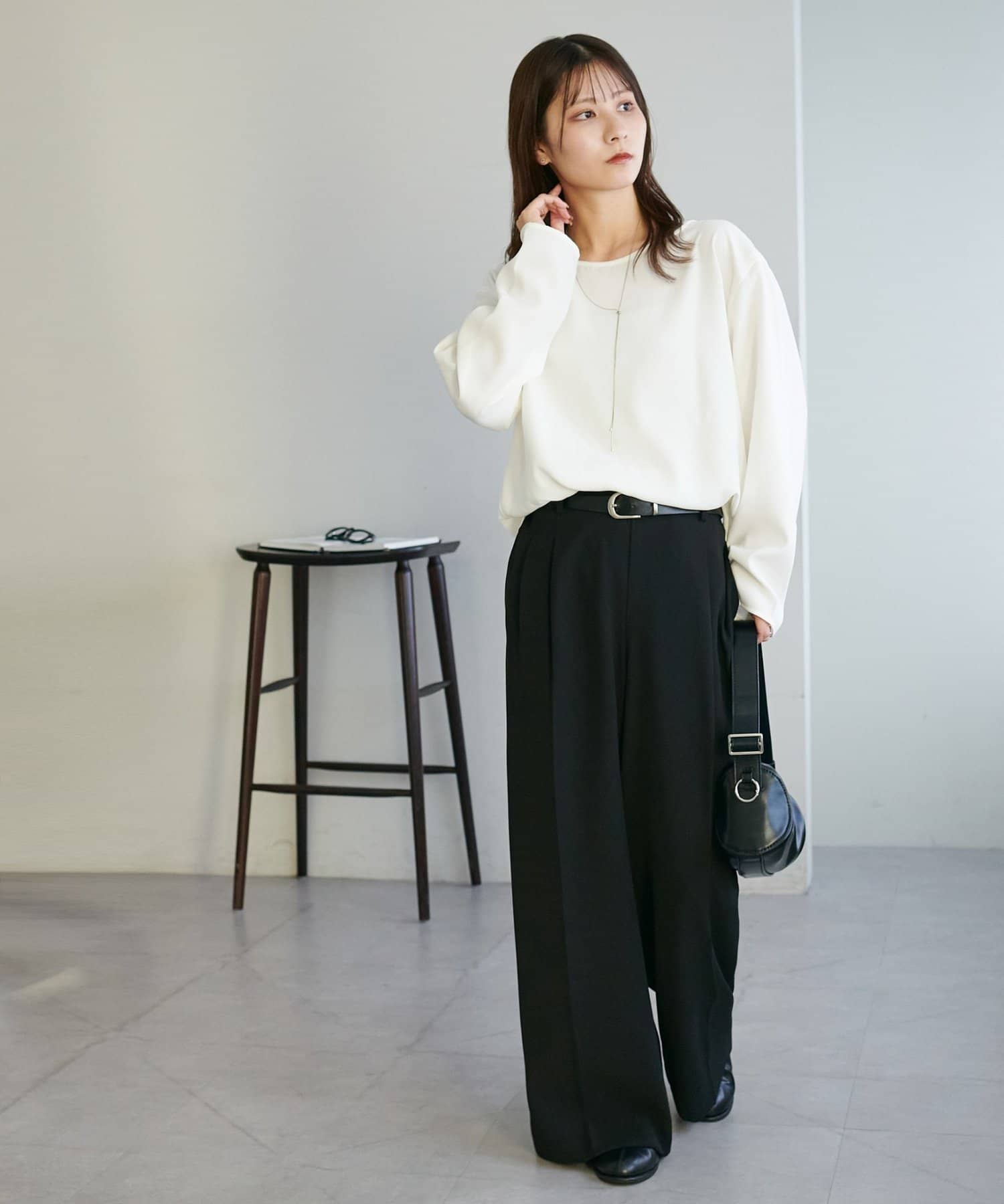 ・きれいめ生地感で、スラックスやテーパードパンツと合わせたオフィス・オケージョンスタイルに